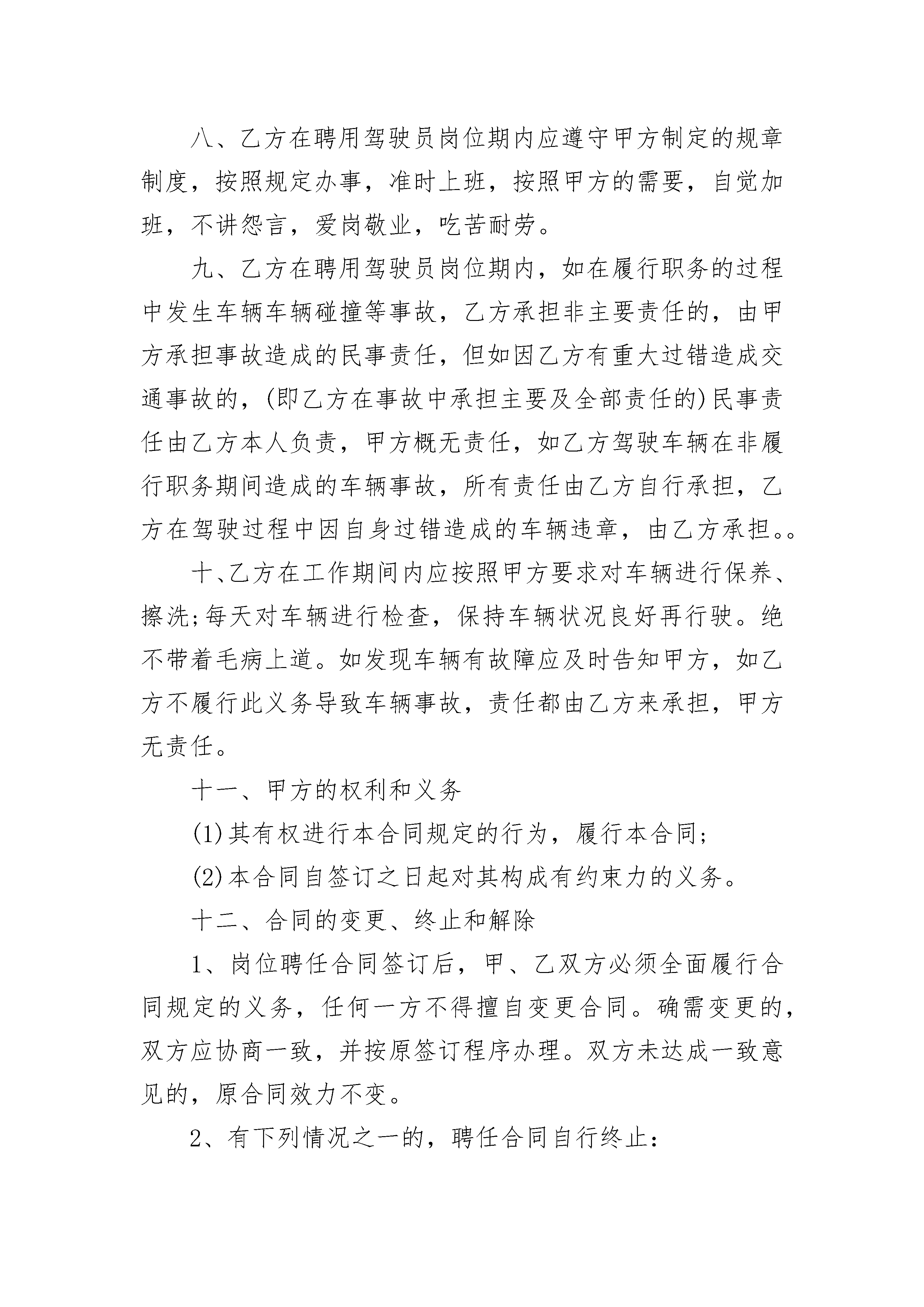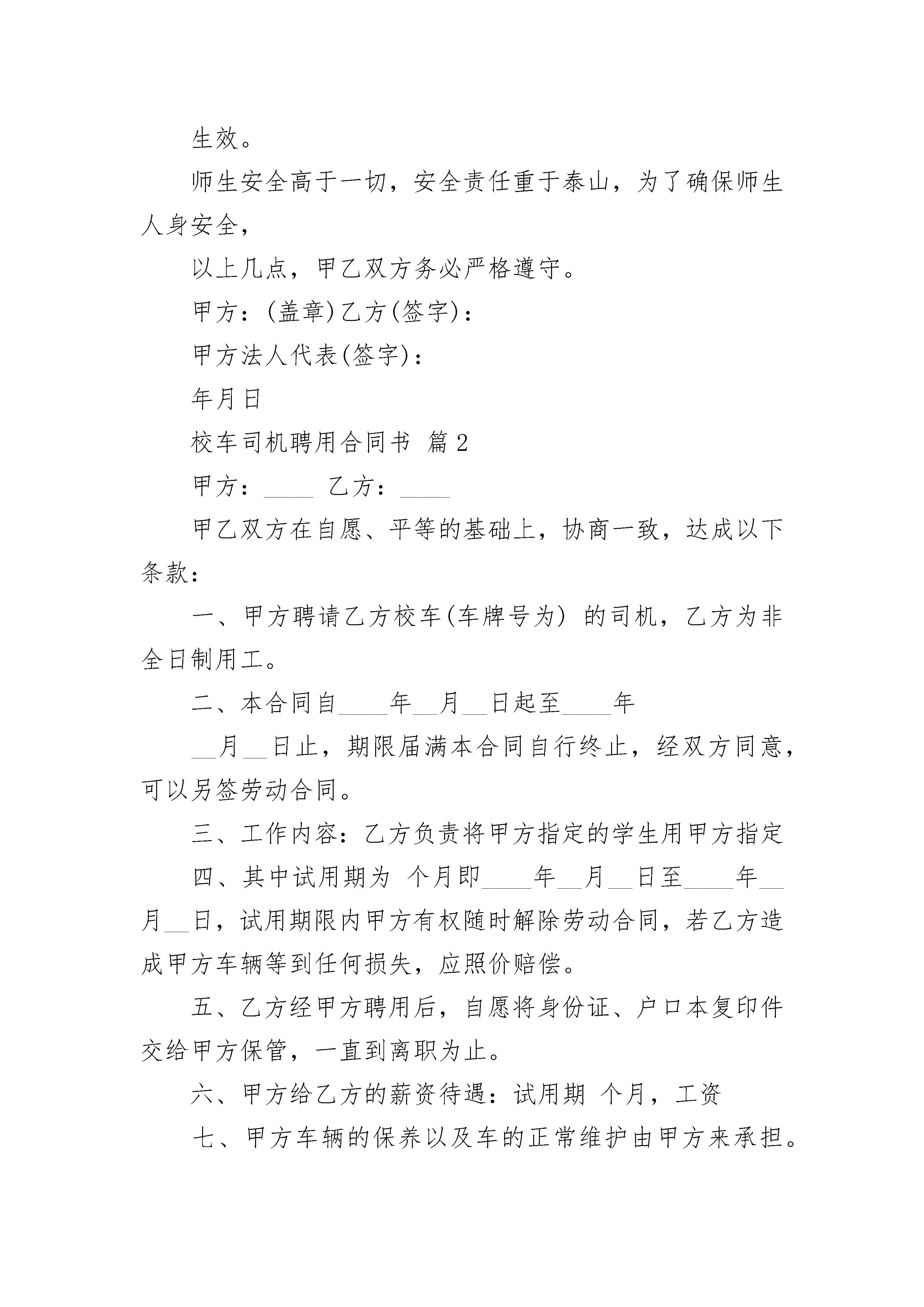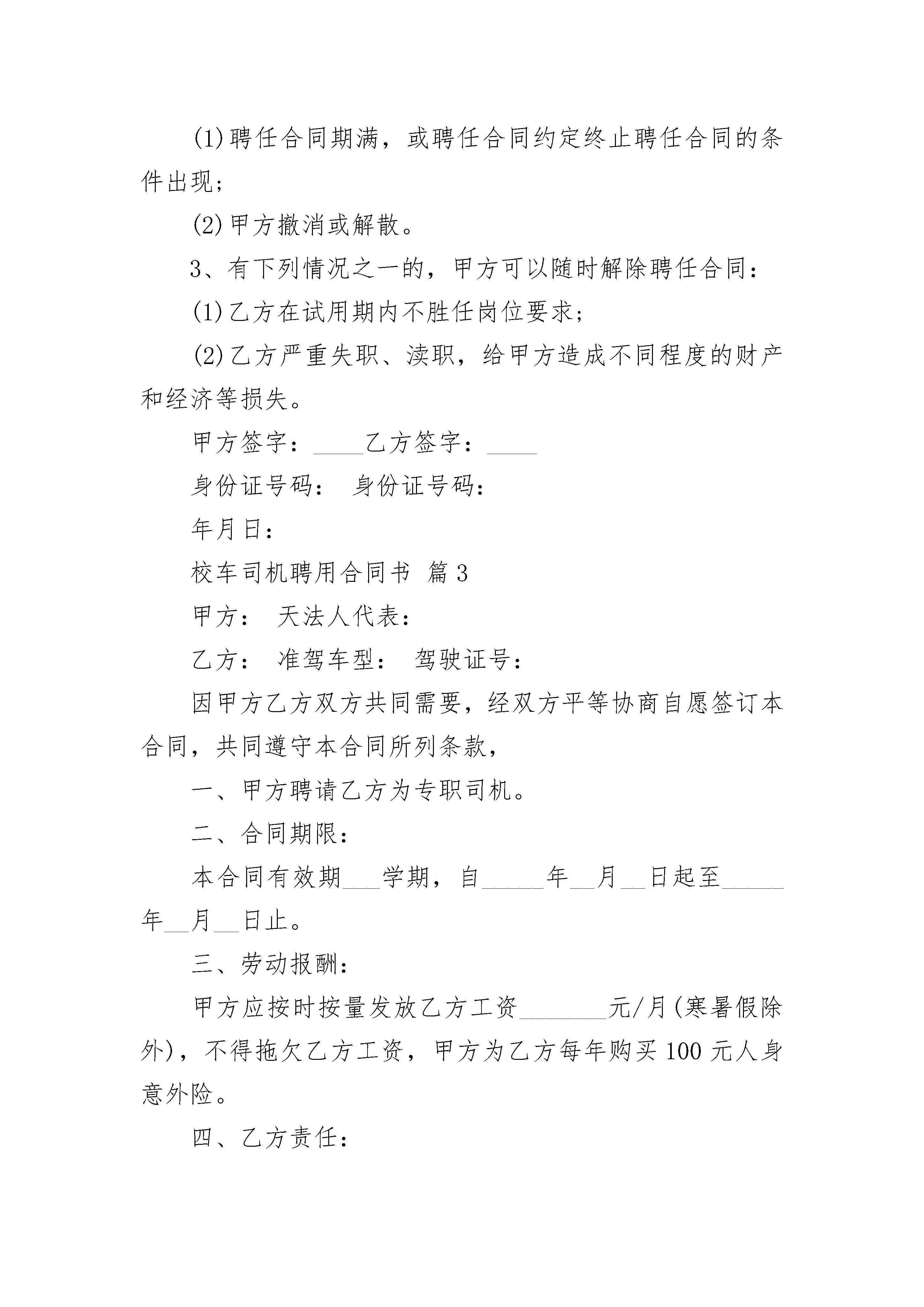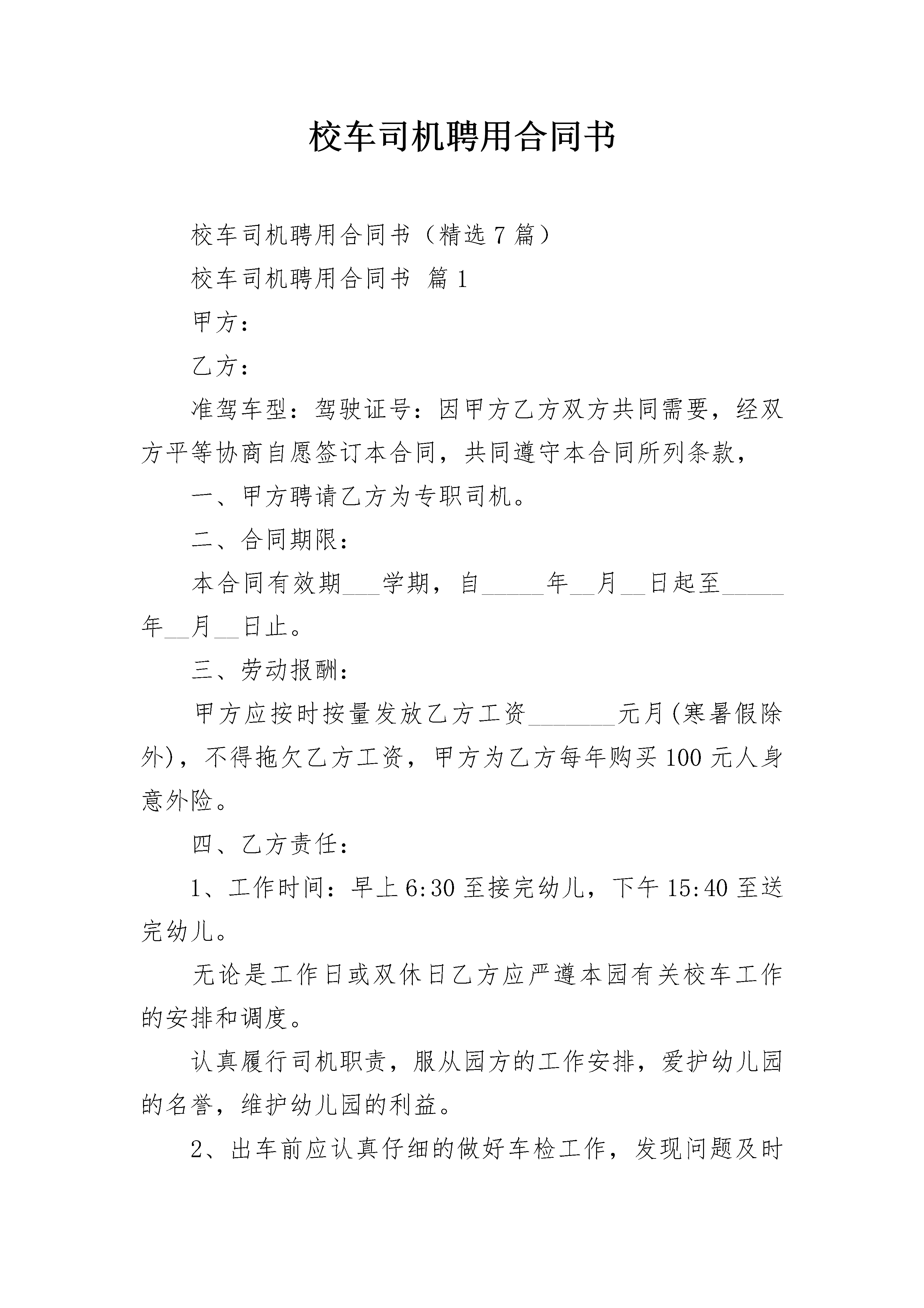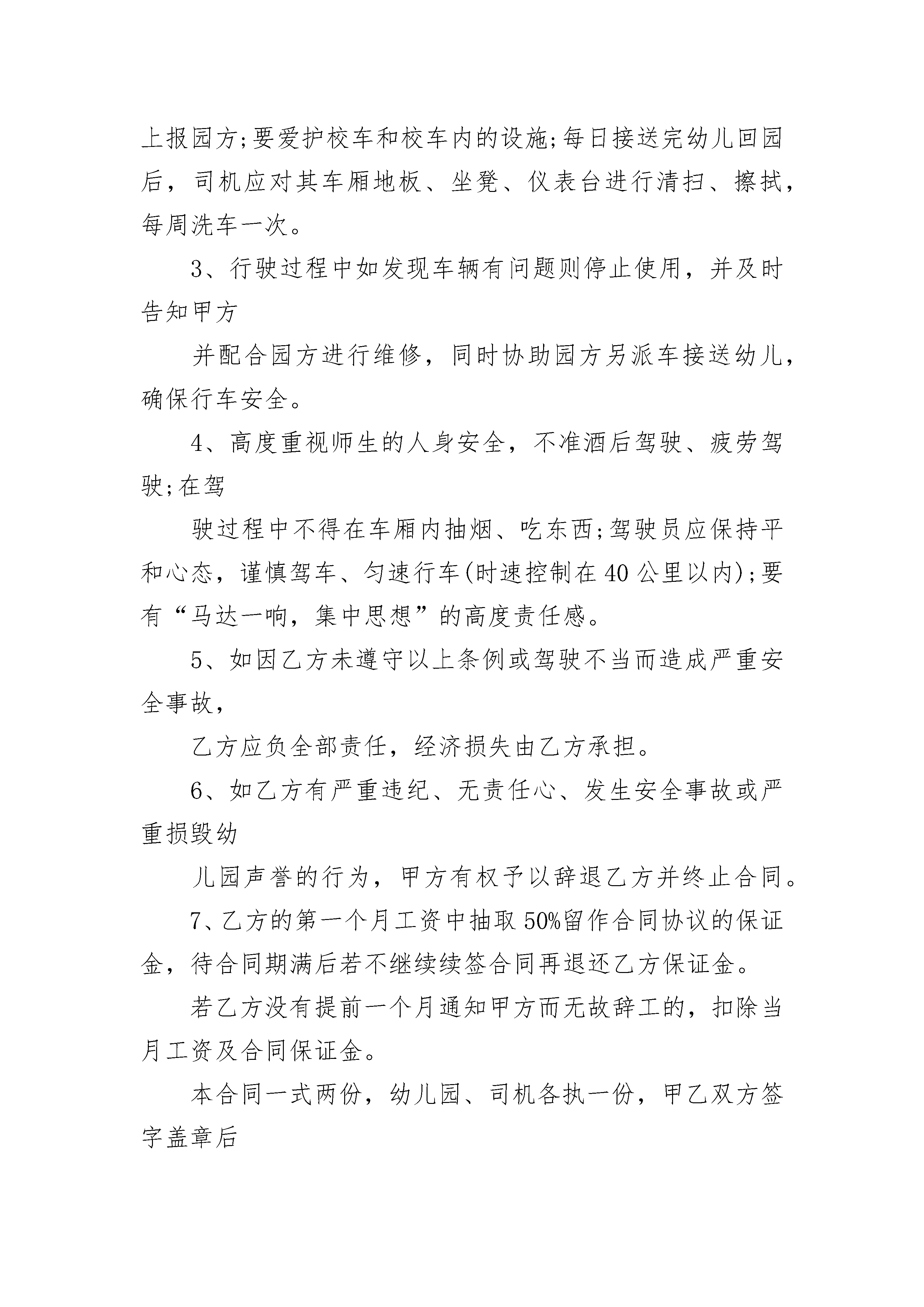 校车司机聘用合同书校车司机聘用合同书(精选7篇)校车司机聘用合同书篇1甲方:乙方:准驾车型:驾驶证号:因甲方乙方双方共同需要,经双方平等协商自愿签订本合同,共同遵守本合同所列条款,一、甲方聘请乙方为专职司机。二、合同期限:本合同有效期___学期,自_____年__月__日起至_____年__月__日止。三、劳动报酬:甲方应按时按量发放乙方工资_______元月(寒暑假除外),不得拖欠乙方工资,甲方为乙方每年购买100元人身意外险。四、乙方责任:1、工作时间:早上6:30至接完幼儿,下午15:40至送完幼儿。无论是工作日或双休日乙方应严遵本园有关校车工作的安排和调度。认真履行司机职责,服从园方的工作安排,爱护幼儿园的名誉,维护幼儿园的利益。2、出车前应认真仔细的做好车检工作,发现问题及时上报园方;要爱护校车和校车内的设施;每日接送完幼儿回园后,司机应对其车厢地板、坐凳、仪表台进行清扫、擦拭,每周洗车一次。3、行驶过程中如发现车辆有问题则停止使用,并及时告知甲方并配合园方进行维修,同时协助园方另派车接送幼儿,确保行车安全。4、高度重视师生的人身安全,不准酒后驾驶、疲劳驾驶;在驾驶过程中不得在车厢内抽烟、吃东西;驾驶员应保持平和心态,谨慎驾车、匀速行车(时速控制在40公里以内);要有“马达一响,集中思想”的高度责任感。5、如因乙方未遵守以上条例或驾驶不当而造成严重安全事故,乙方应负全部责任,经济损失由乙方承担。6、如乙方有严重违纪、无责任心、发生安全事故或严重损毁幼儿园声誉的行为,甲方有权予以辞退乙方并终止合同。7、乙方的第一个月工资中抽取50%留作合同协议的保证金,待合同期满后若不继续续签合同再退还乙方保证金。若乙方没有提前一个月通知甲方而无故辞工的,扣除当月工资及合同保证金。本合同一式两份,幼儿园、司机各执一份,甲乙双方签字盖章后生效。师生安全高于一切,安全责任重于泰山,为了确保师生人身安全,以上几点,甲乙双方务必严格遵守。甲方:(盖章)乙方(签字):甲方法人代表(签字):年月日校车司机聘用合同书篇2甲方:____乙方:____甲乙双方在自愿、平等的基础上,协商一致,达成以下条款:一、甲方聘请乙方校车(车牌号为)的司机,乙方为非全日制用工。二、本合同自____年__月__日起至____年__月__日止,期限届满本合同自行终止,经双方同意,可以另签劳动合同。三、工作内容:乙方负责将甲方指定的学生用甲方指定四、其中试用期为个月即____年__月__日至____年__月__日,试用期限内甲方有权随时解除劳动合同,若乙方造成甲方车辆等到任何损失,应照价赔偿。五、乙方经甲方聘用后,自愿将身份证、户口本复印件交给甲方保管,一直到离职为止。六、甲方给乙方的薪资待遇:试用期个月,工资七、甲方车辆的保养以及车的正常维护由甲方来承担。八、乙方在聘用驾驶员岗位期内应遵守甲方制定的规章制度,按照规定办事,准时上班,按照甲方的需要,自觉加班,不讲怨言,爱岗敬业,吃苦耐劳。九、乙方在聘用驾驶员岗位期内,如在履行职务的过程中发生车辆车辆碰撞等事故,乙方承担非主要责任的,由甲方承担事故造成的民事责任,但如因乙方有重大过错造成交通事故的,(即乙方在事故中承担主要及全部责任的)民事责任由乙方本人负责,甲方概无责任,如乙方驾驶车辆在非履行职务期间造成的车辆事故,所有责任由乙方自行承担,乙方在驾驶过程中因自身过错造成的车辆违章,由乙方承担。。十、乙方在工作期间内应按照甲方要求对车辆进行保养、擦洗;每天对车辆进行检查,保持车辆状况良好再行驶。绝不带着毛病上道。如发现车辆有故障应及时告知甲方,如乙方不履行此义务导致车辆事故,责任都由乙方来承担,甲方无责任。十一、甲方的权利和义务(1)其有权进行本合同规定的行为,履行本合同;(2)本合同自签订之日起对其构成有约束力的义务。十二、合同的变更、终止和解除1、岗位聘任合同签订后,甲、乙双方必须全面履行合同规定的义务,任何一方不得擅自变更合同。确需变更的,双方应协商一致,并按原签订程序办理。双方未达成一致意见的,原合同效力不变。2、有下列情况之一的,聘任合同自行终止:(1)聘任合同期满,或聘任合同约定终止聘任合同的条件出现;(2)甲方撤消或解散。3、有下列情况之一的,甲方可以随时解除聘任合同:(1)乙方在试用期内不胜任岗位要求;(2)乙方严重失职、渎职,给甲方造成不同程度的财产和经济等损失。甲方签字:____乙方签字:____身份证号码:身份证号码:年月日:校车司机聘用合同书篇3甲方:天法人代表:乙方:准驾车型:驾驶证号:因甲方乙方双方共同需要,经双方平等协商自愿签订本合同,共同遵守本合同所列条款,一、甲方聘请乙方为专职司机。二、合同期限:本合同有效期___学期,自_____年__月__日起至_____年__月__日止。三、劳动