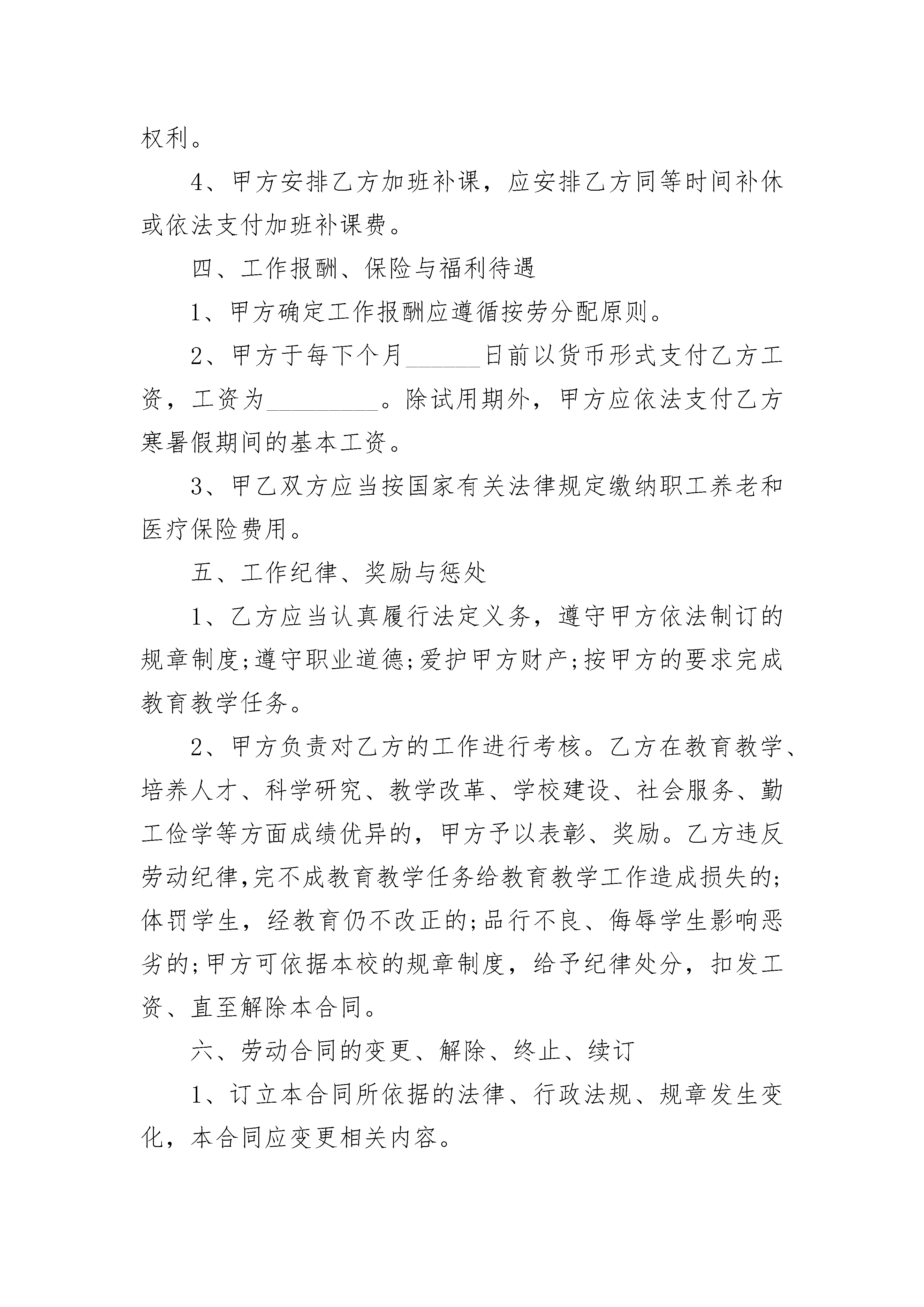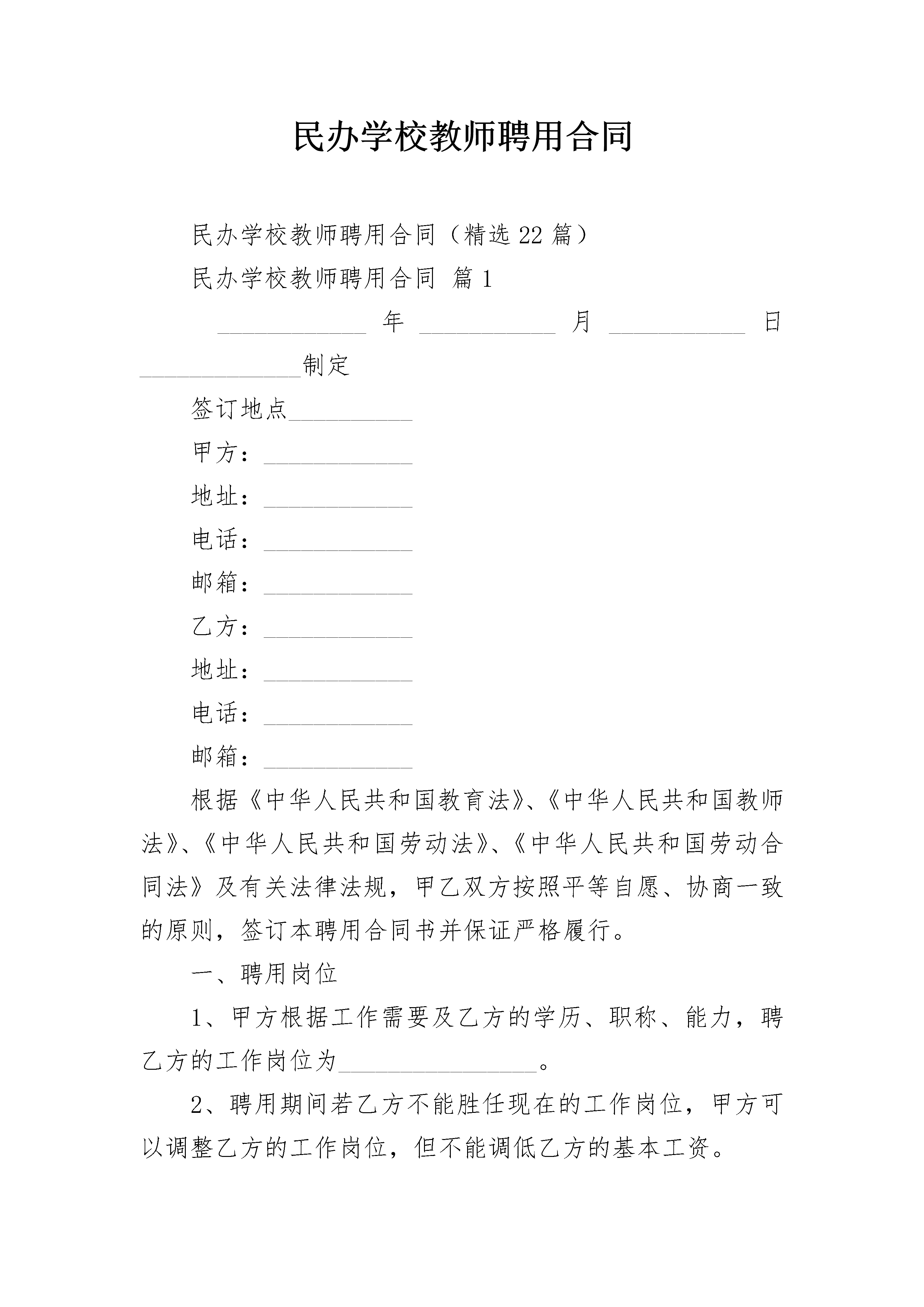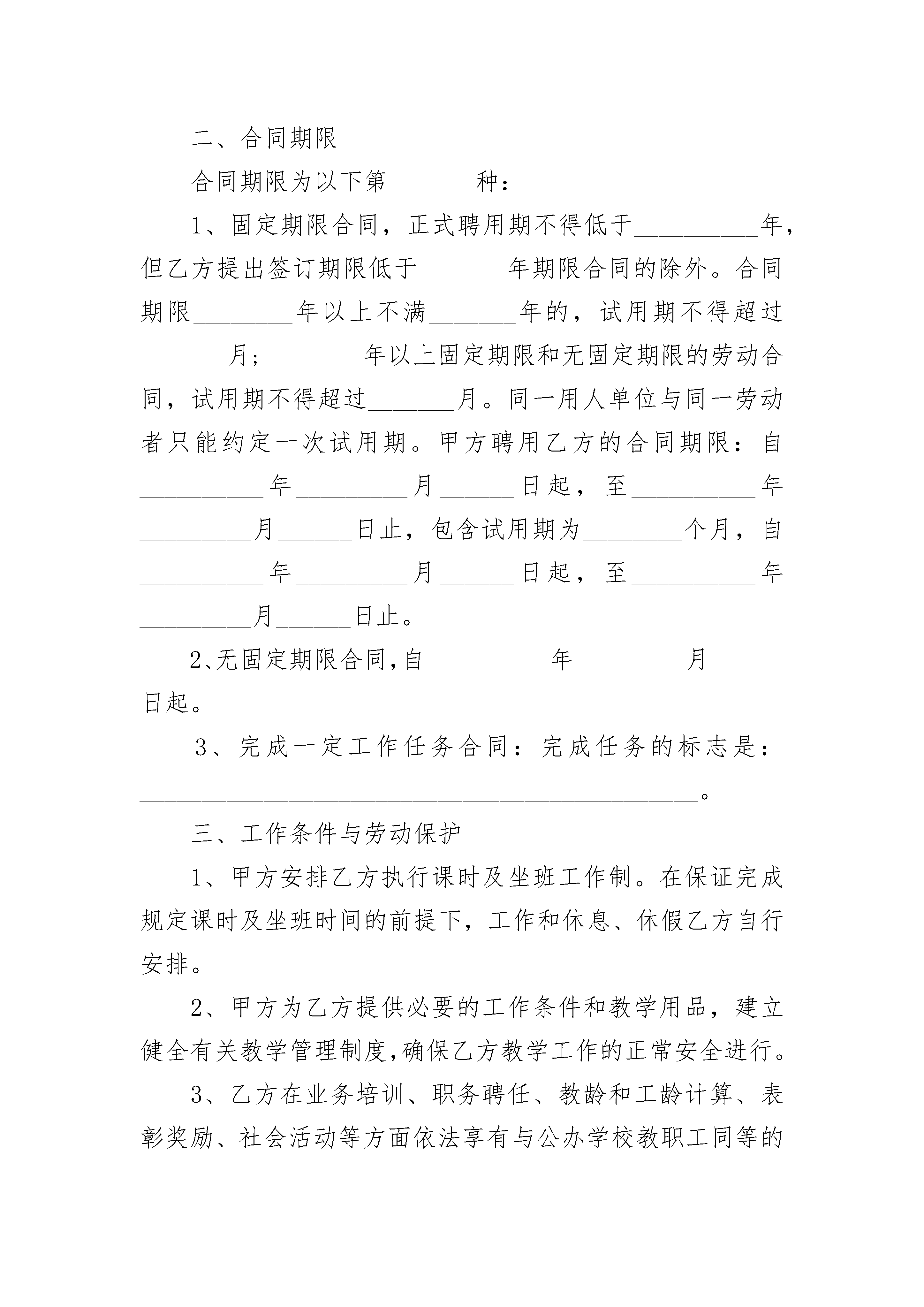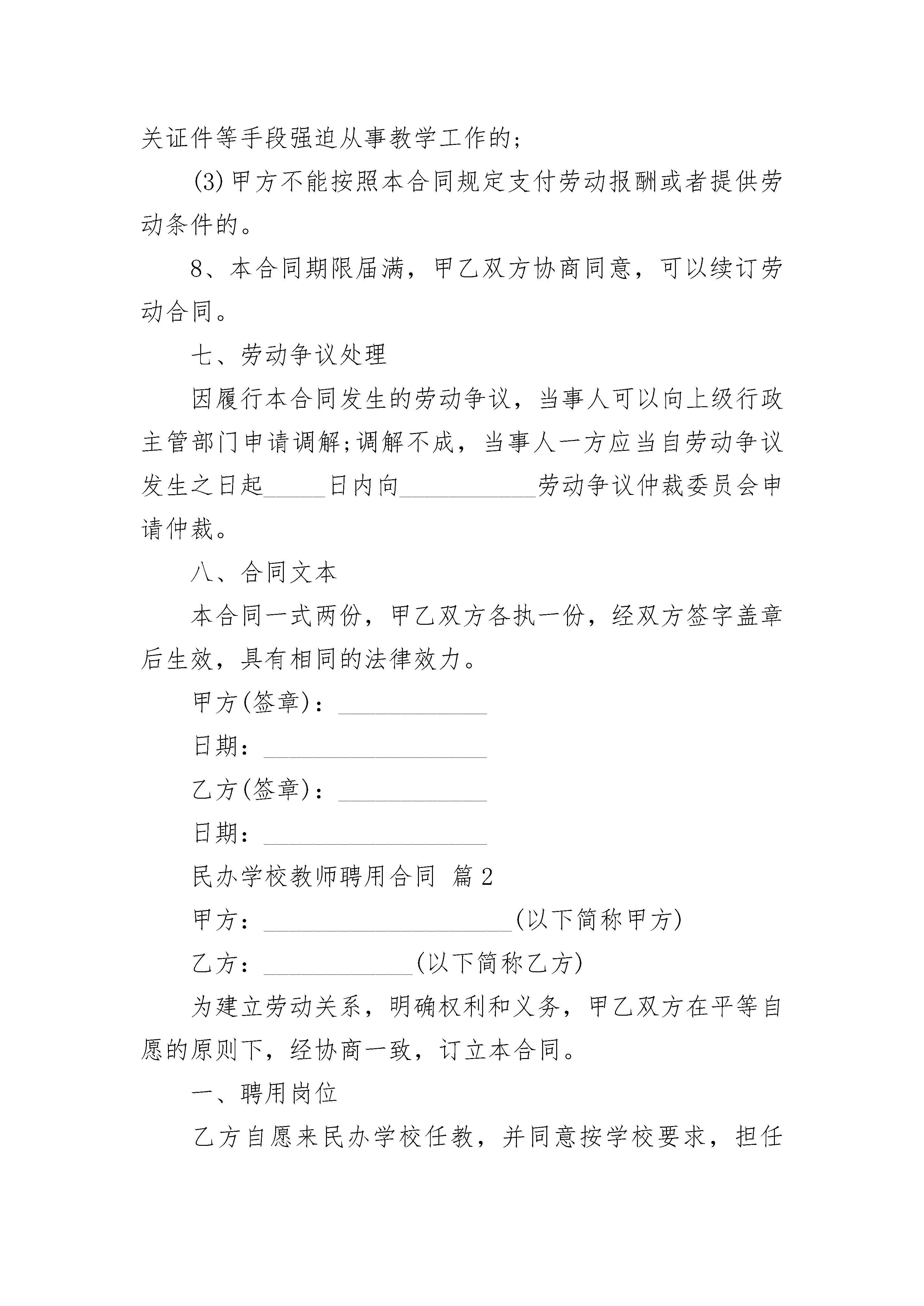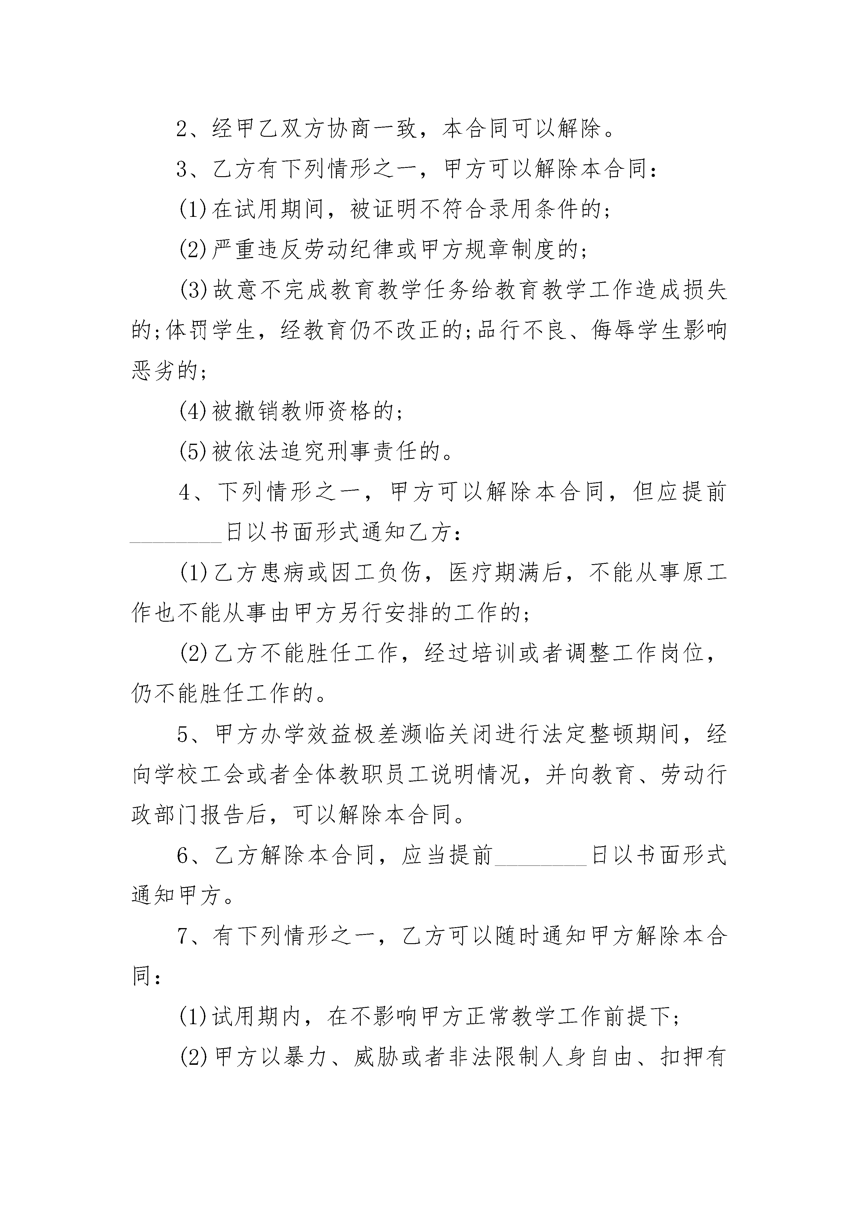 民办学校教师聘用合同民办学校教师聘用合同(精选22篇)民办学校教师聘用合同篇1____________年___________月___________日_____________制定签订地点__________甲方:____________地址:____________电话:____________邮箱:____________乙方:____________地址:____________电话:____________邮箱:____________根据《中华人民共和国教育法》、《中华人民共和国教师法》、《中华人民共和国劳动法》、《中华人民共和国劳动合同法》及有关法律法规,甲乙双方按照平等自愿、协商一致的原则,签订本聘用合同书并保证严格履行。一、聘用岗位1、甲方根据工作需要及乙方的学历、职称、能力,聘乙方的工作岗位为________________。2、聘用期间若乙方不能胜任现在的工作岗位,甲方可以调整乙方的工作岗位,但不能调低乙方的基本工资。二、合同期限合同期限为以下第_______种:1、固定期限合同,正式聘用期不得低于__________年,但乙方提出签订期限低于_______年期限合同的除外。合同期限________年以上不满_______年的,试用期不得超过_______月;________年以上固定期限和无固定期限的劳动合同,试用期不得超过_______月。同一用人单位与同一劳动者只能约定一次试用期。甲方聘用乙方的合同期限:自__________年_________月______日起,至__________年_________月______日止,包含试用期为________个月,自__________年_________月______日起,至__________年_________月______日止。2、无固定期限合同,自__________年_________月______日起。3、完成一定工作任务合同:完成任务的标志是:_____________________________________________。三、工作条件与劳动保护1、甲方安排乙方执行课时及坐班工作制。在保证完成规定课时及坐班时间的前提下,工作和休息、休假乙方自行安排。2、甲方为乙方提供必要的工作条件和教学用品,建立健全有关教学管理制度,确保乙方教学工作的正常安全进行。3、乙方在业务培训、职务聘任、教龄和工龄计算、表彰奖励、社会活动等方面依法享有与公办学校教职工同等的权利。4、甲方安排乙方加班补课,应安排乙方同等时间补休或依法支付加班补课费。四、工作报酬、保险与福利待遇1、甲方确定工作报酬应遵循按劳分配原则。2、甲方于每下个月______日前以货币形式支付乙方工资,工资为_________。除试用期外,甲方应依法支付乙方寒暑假期间的基本工资。3、甲乙双方应当按国家有关法律规定缴纳职工养老和医疗保险费用。五、工作纪律、奖励与惩处1、乙方应当认真履行法定义务,遵守甲方依法制订的规章制度;遵守职业道德;爱护甲方财产;按甲方的要求完成教育教学任务。2、甲方负责对乙方的工作进行考核。乙方在教育教学、培养人才、科学研究、教学改革、学校建设、社会服务、勤工俭学等方面成绩优异的,甲方予以表彰、奖励。乙方违反劳动纪律,完不成教育教学任务给教育教学工作造成损失的;体罚学生,经教育仍不改正的;品行不良、侮辱学生影响恶劣的;甲方可依据本校的规章制度,给予纪律处分,扣发工资、直至解除本合同。六、劳动合同的变更、解除、终止、续订1、订立本合同所依据的法律、行政法规、规章发生变化,本合同应变更相关内容。2、经甲乙双方协商一致,本合同可以解除。3、乙方有下列情形之一,甲方可以解除本合同:(1)在试用期间,被证明不符合录用条件的;(2)严重违反劳动纪律或甲方规章制度的;(3)故意不完成教育教学任务给教育教学工作造成损失的;体罚学生,经教育仍不改正的;品行不良、侮辱学生影响恶劣的;(4)被撤销教师资格的;(5)被依法追究刑事责任的。4、下列情形之一,甲方可以解除本合同,但应提前________日以书面形式通知乙方:(1)乙方患病或因工负伤,医疗期满后,不能从事原工作也不能从事由甲方另行安排的工作的;(2)乙方不能胜任工作,经过培训或者调整工作岗位,仍不能胜任工作的。5、甲方办学效益极差濒临关闭进行法定整顿期间,经向学校工会或者全体教职员工说明情况,并向教育、劳动行政部门报告后,可以解除本合同。6、乙方解除本合同,应当提前________日以书面形式通知甲方。7、有下列情形之一,乙方可以随时通知甲方解除本合同:(1)试用期内,在不影响甲方正常教学工作前提下;(2)甲方以暴力、威胁或者非法限制人身自由、扣押有关证件等手段强迫从事教学工作的;(3)甲方不能按照本合同规定支付劳动报酬或者