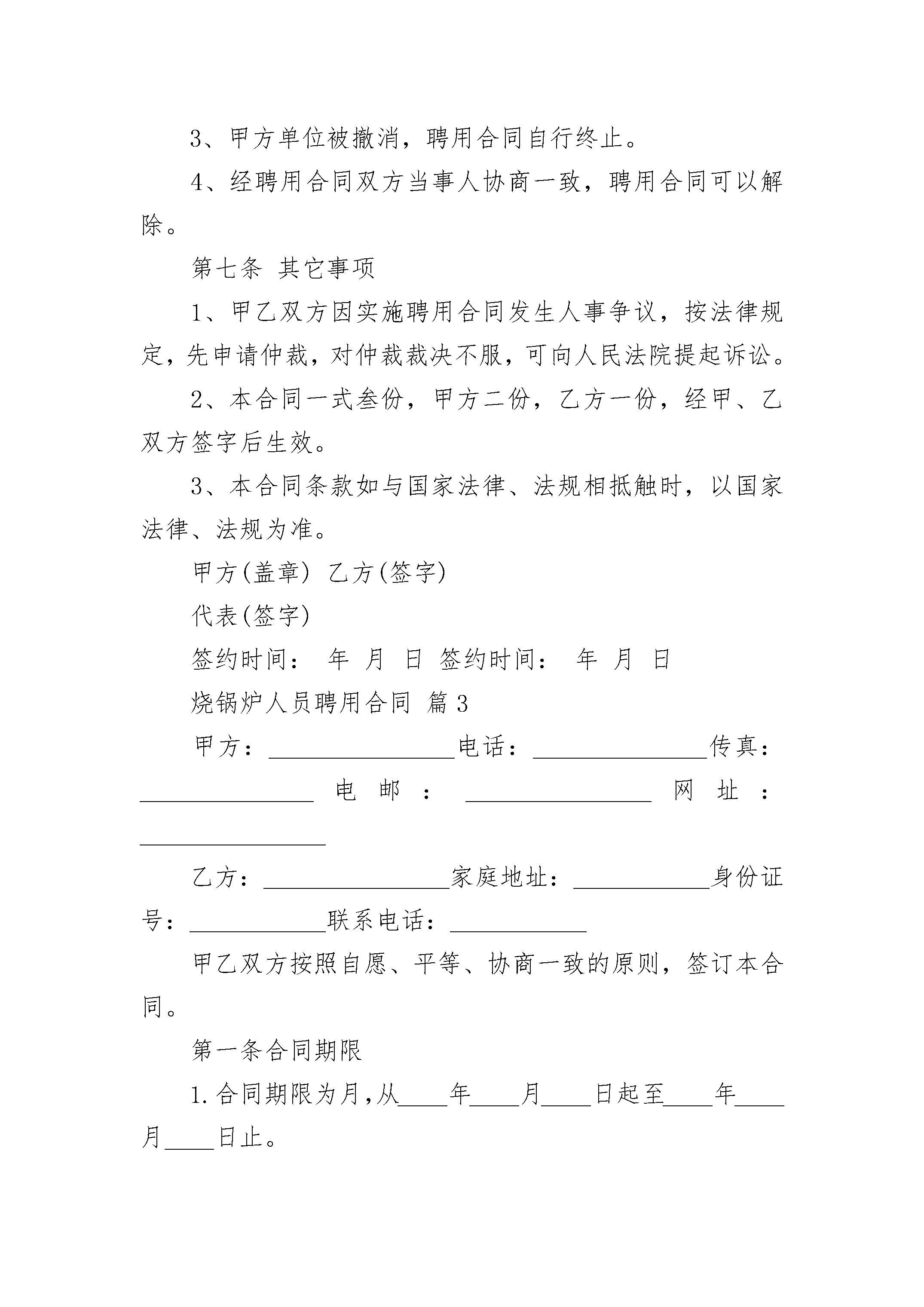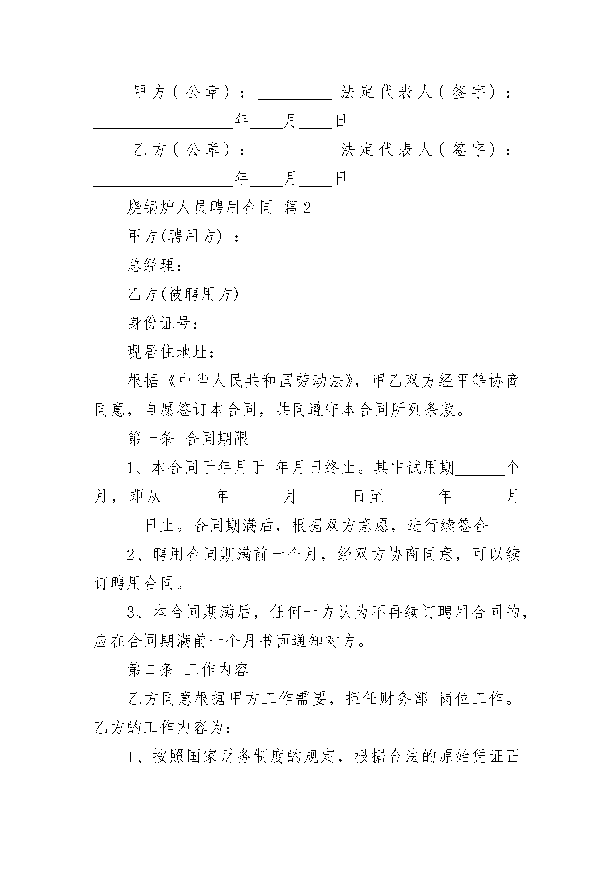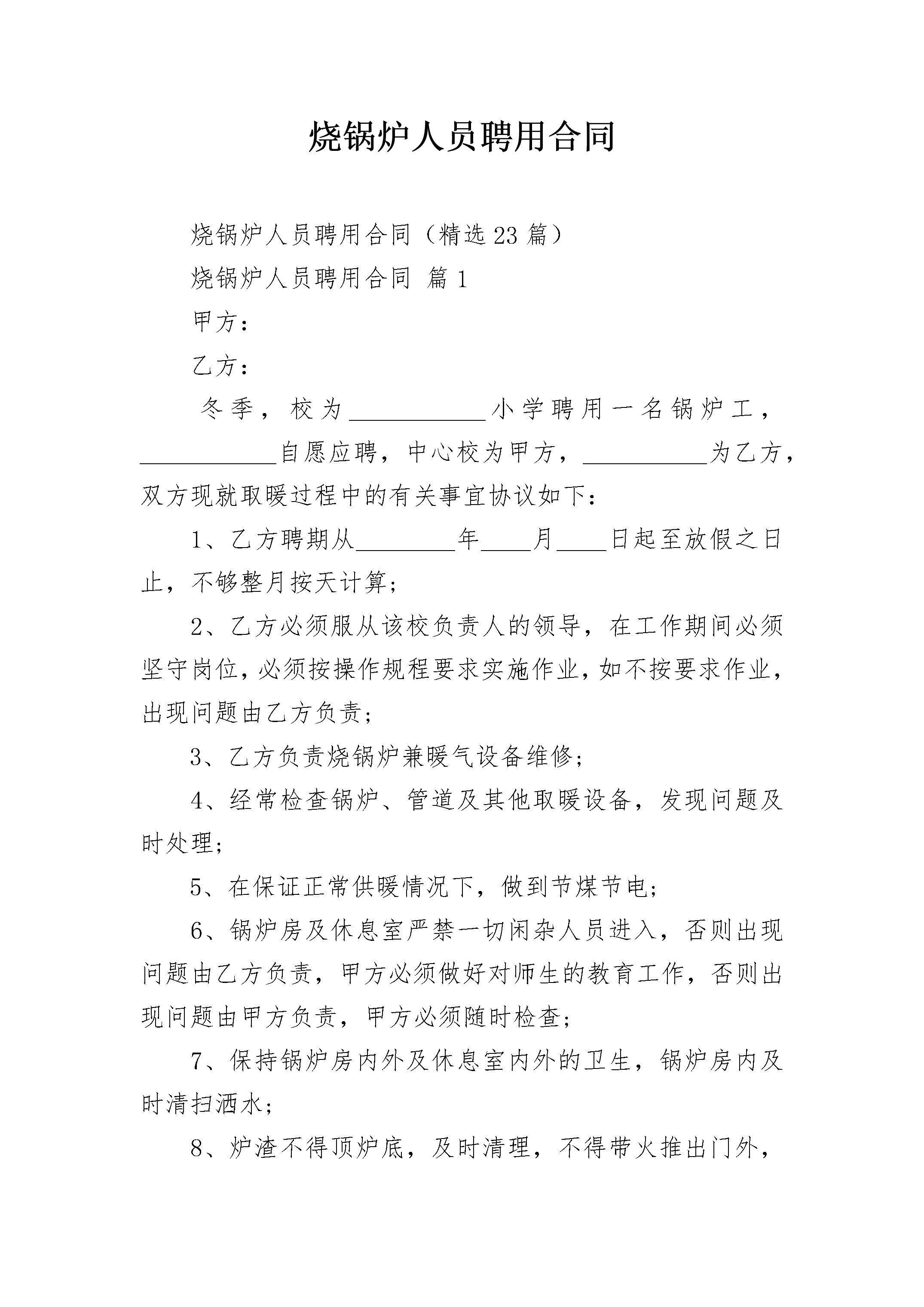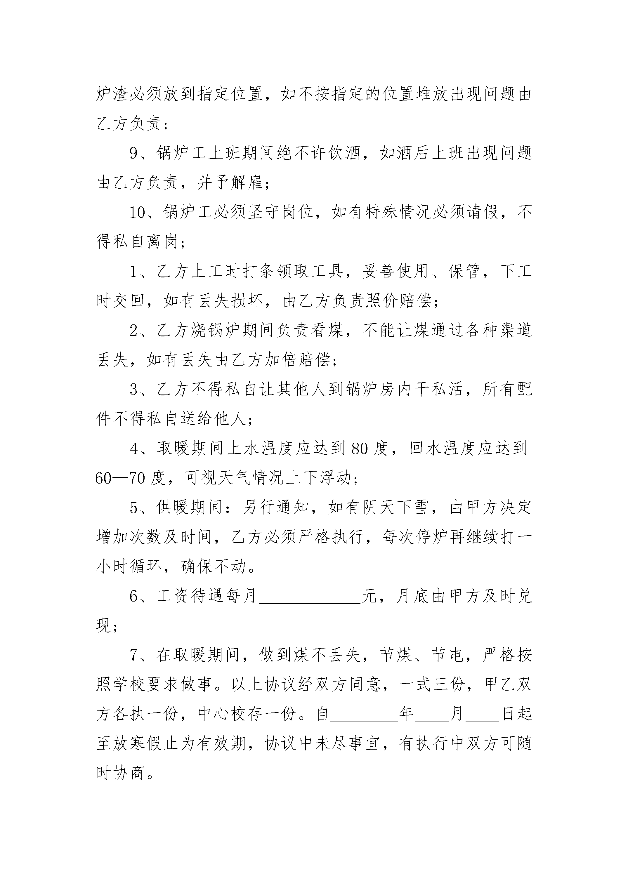 烧锅炉人员聘用合同烧锅炉人员聘用合同(精选23篇)烧锅炉人员聘用合同篇1甲方:乙方:冬季,校为___________小学聘用一名锅炉工,___________自愿应聘,中心校为甲方,__________为乙方,双方现就取暖过程中的有关事宜协议如下:1、乙方聘期从________年____月____日起至放假之日止,不够整月按天计算;2、乙方必须服从该校负责人的领导,在工作期间必须坚守岗位,必须按操作规程要求实施作业,如不按要求作业,出现问题由乙方负责;3、乙方负责烧锅炉兼暖气设备维修;4、经常检查锅炉、管道及其他取暖设备,发现问题及时处理;5、在保证正常供暖情况下,做到节煤节电;6、锅炉房及休息室严禁一切闲杂人员进入,否则出现问题由乙方负责,甲方必须做好对师生的教育工作,否则出现问题由甲方负责,甲方必须随时检查;7、保持锅炉房内外及休息室内外的卫生,锅炉房内及时清扫洒水;8、炉渣不得顶炉底,及时清理,不得带火推出门外,炉渣必须放到指定位置,如不按指定的位置堆放出现问题由乙方负责;9、锅炉工上班期间绝不许饮酒,如酒后上班出现问题由乙方负责,并予解雇;10、锅炉工必须坚守岗位,如有特殊情况必须请假,不得私自离岗;1、乙方上工时打条领取工具,妥善使用、保管,下工时交回,如有丢失损坏,由乙方负责照价赔偿;2、乙方烧锅炉期间负责看煤,不能让煤通过各种渠道丢失,如有丢失由乙方加倍赔偿;3、乙方不得私自让其他人到锅炉房内干私活,所有配件不得私自送给他人;4、取暖期间上水温度应达到80度,回水温度应达到60—70度,可视天气情况上下浮动;5、供暖期间:另行通知,如有阴天下雪,由甲方决定增加次数及时间,乙方必须严格执行,每次停炉再继续打一小时循环,确保不动。6、工资待遇每月____________元,月底由甲方及时兑现;7、在取暖期间,做到煤不丢失,节煤、节电,严格按照学校要求做事。以上协议经双方同意,一式三份,甲乙双方各执一份,中心校存一份。自________年____月____日起至放寒假止为有效期,协议中未尽事宜,有执行中双方可随时协商。甲方(公章):_________法定代表人(签字):_________________年____月____日乙方(公章):_________法定代表人(签字):_________________年____月____日烧锅炉人员聘用合同篇2甲方(聘用方):总经理:乙方(被聘用方)身份证号:现居住地址:根据《中华人民共和国劳动法》,甲乙双方经平等协商同意,自愿签订本合同,共同遵守本合同所列条款。第一条合同期限1、本合同于年月于年月日终止。其中试用期______个月,即从______年______月______日至______年______月______日止。合同期满后,根据双方意愿,进行续签合2、聘用合同期满前一个月,经双方协商同意,可以续订聘用合同。3、本合同期满后,任何一方认为不再续订聘用合同的,应在合同期满前一个月书面通知对方。第二条工作内容乙方同意根据甲方工作需要,担任财务部岗位工作。乙方的工作内容为:1、按照国家财务制度的规定,根据合法的原始凭证正确、及时、完整地填制财务凭证,做到帐目清楚,凭证齐全。2、编制有关财务报表,做到准确无误。3、与税务机关进行报税,协调与税务机关的关系。第三条工作条件和劳动保护1、甲方为乙方提供符合国家规定的安全卫生的工作环境,保证乙方的人身安全及人体不受危害的环境条件下工作。2、甲方可根据工作需要组织乙方参加必要的业务知识培训。第四条工作报酬1、试用期为三个月,试用期间月工资为:2、转正后月工资为:3、各项福利、奖金以公司当期制定的奖励方案为准。第五条工作纪律1、乙方应遵守国家的法律、法规。2、乙方应遵守甲方规定的各项规章制度和劳动纪律,自觉服从甲方的管理、教育。第六条聘用合同的变更、终止和解除1、聘用合同依法签订后,合同双方必须全面履行合同规定的义务,任何一方不得擅自变更合同。确需变更时,双方应协商一致,并按原签订程序变更合同。双方未达成一致意见的,原合同继续有效。2、聘用合同期满或者双方约定的合同终止条件出现时,聘用合同即自行终止。在聘用合同期满一个月前,经双方协商同意,可以续订聘用合同。3、甲方单位被撤消,聘用合同自行终止。4、经聘用合同双方当事人协商一致,聘用合同可以解除。第七条其它事项1、甲乙双方因实施聘用合同发生人事争议,按法律规定,先申请仲裁,对仲裁裁决不服,可向人民法院提起诉讼。2、本合同一式叁份,甲方二份,乙方一份,经甲、乙双方签字后生效。3、本合同条款如与国家法律、法规相抵触时,以国家法律、法规为准。甲方(盖章)乙方(签字)代表(签字)签约时间:年月日签约时间:年月日烧锅炉人员聘用合同篇3甲方:_______________电话:__________