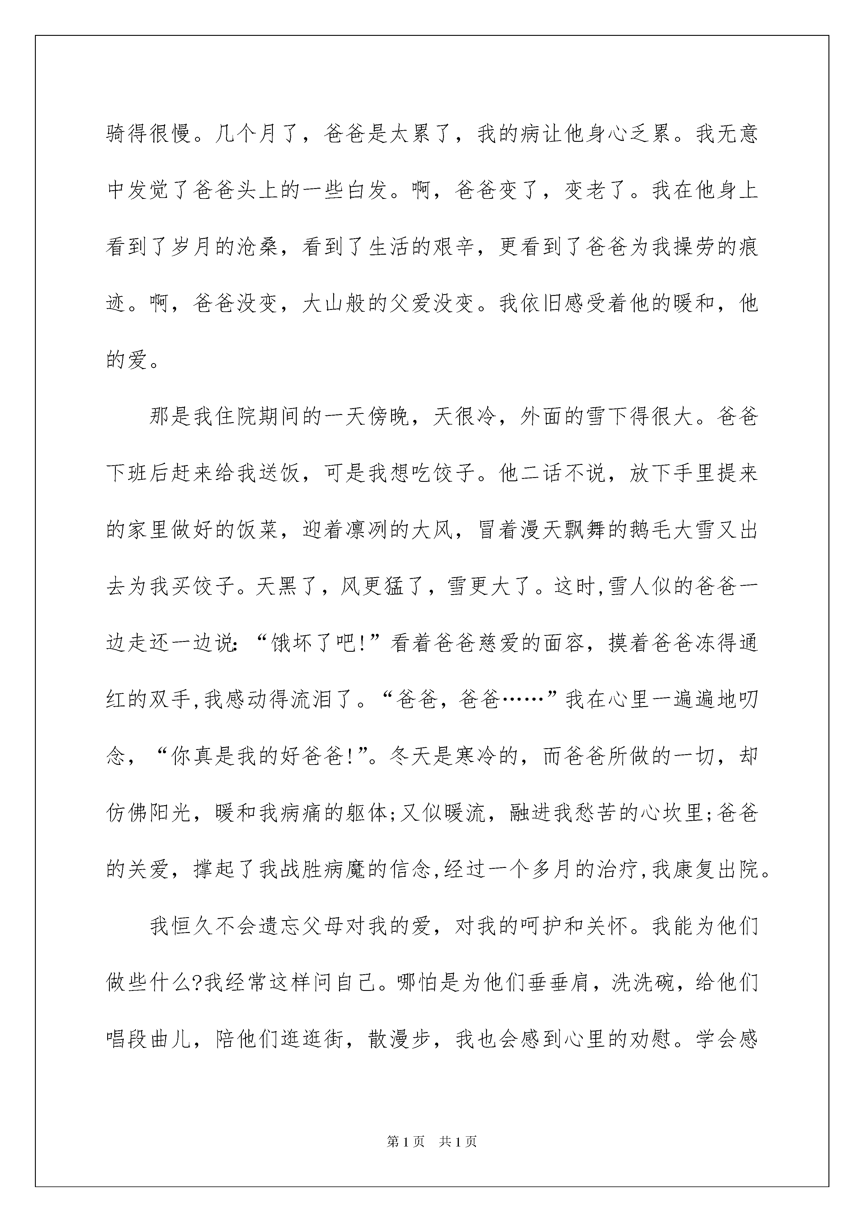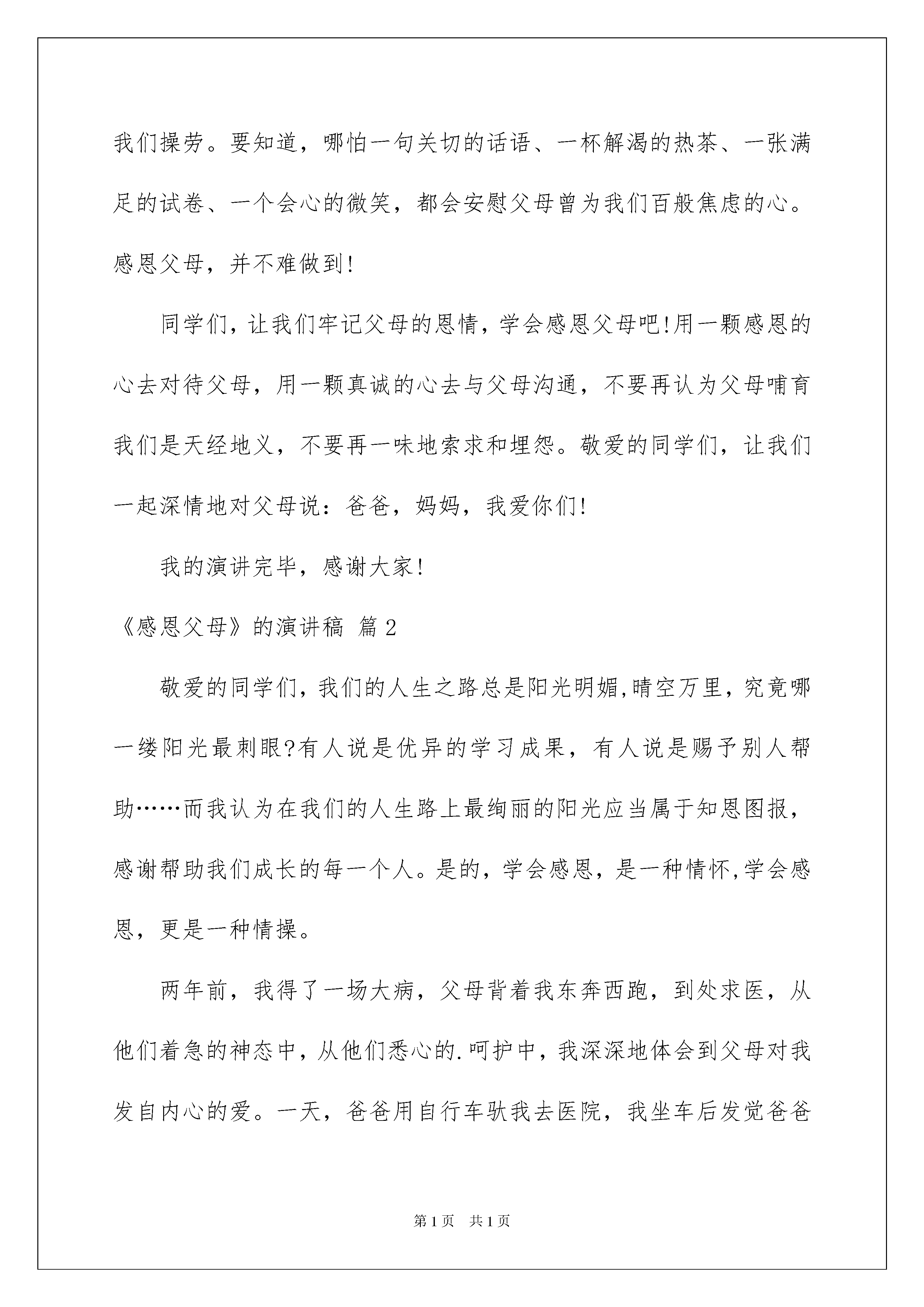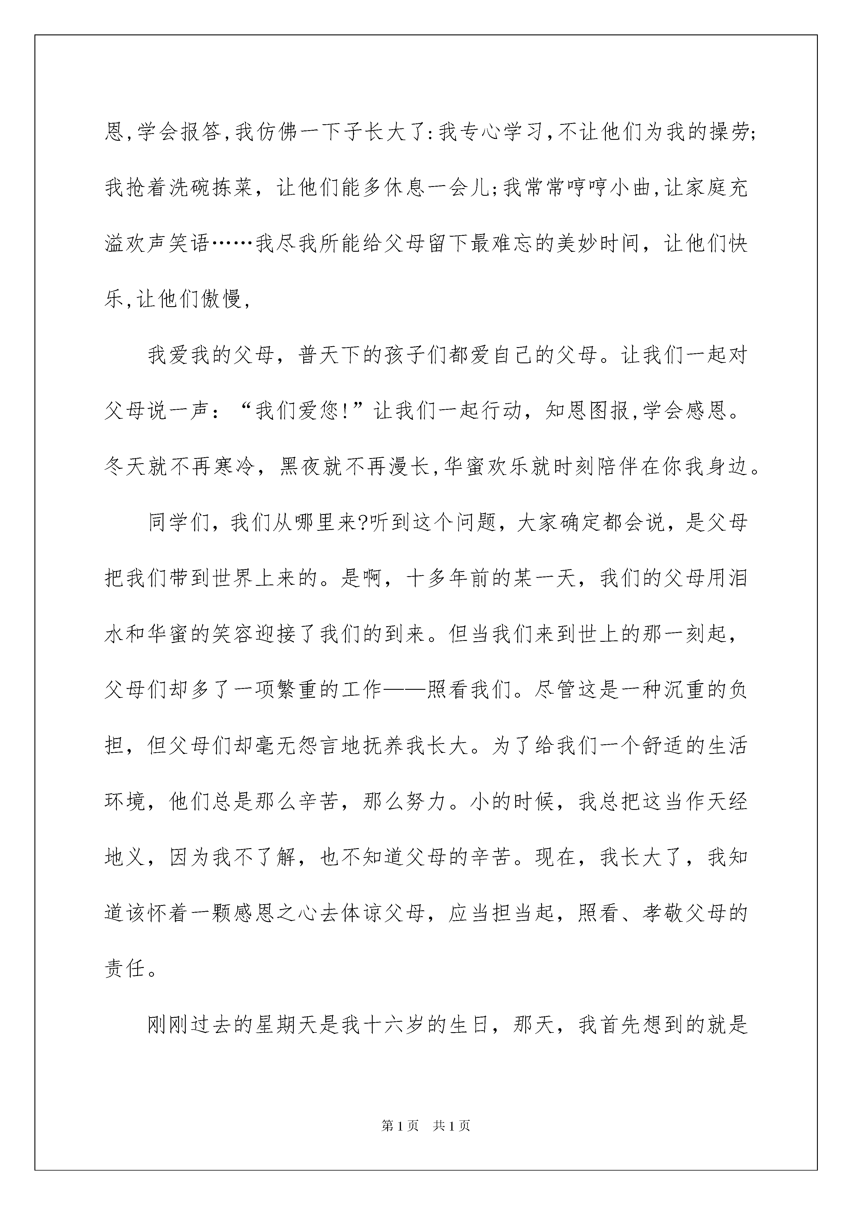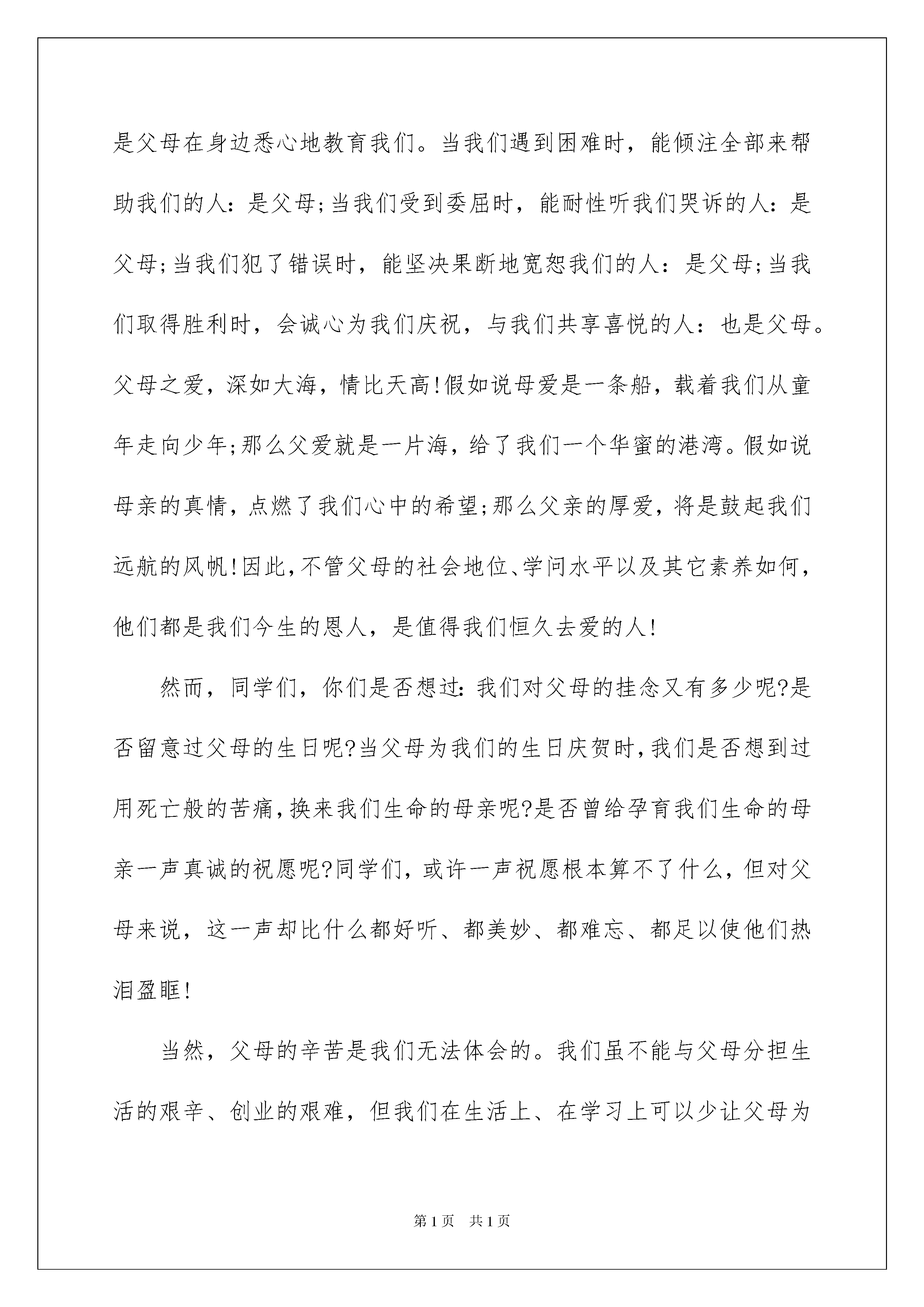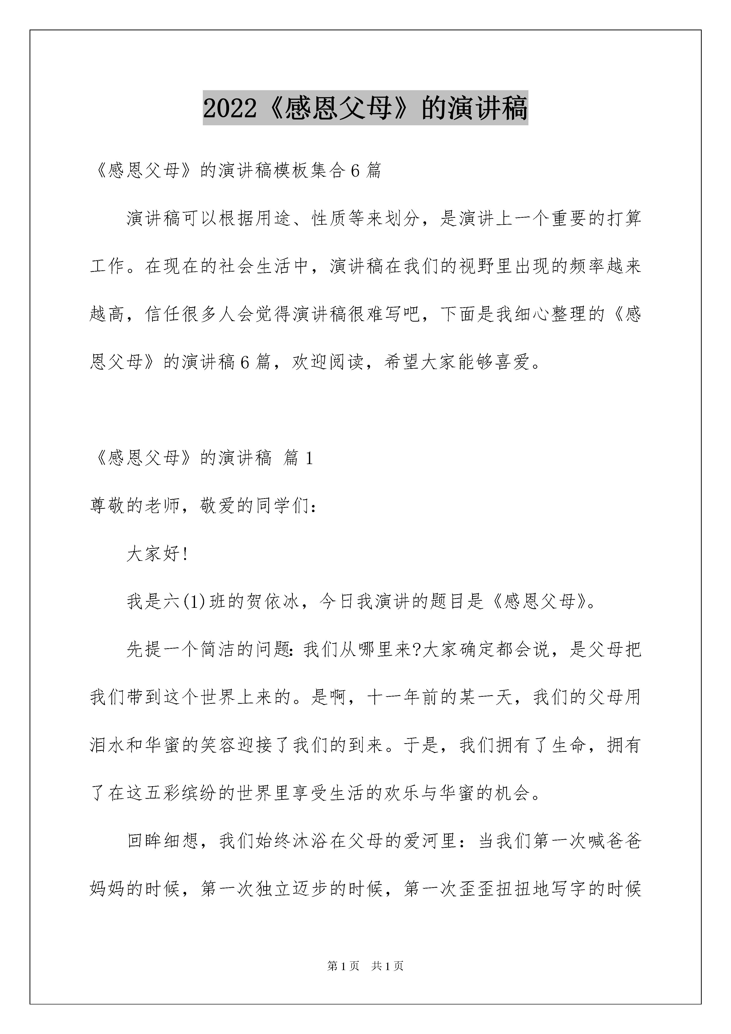 2022《感恩父母》的演讲稿《感恩父母》的演讲稿模板集合6篇演讲稿可以根据用途、性质等来划分,是演讲上一个重要的打算工作。在现在的社会生活中,演讲稿在我们的视野里出现的频率越来越高,信任很多人会觉得演讲稿很难写吧,下面是我细心整理的《感恩父母》的演讲稿6篇,欢迎阅读,希望大家能够喜爱。《感恩父母》的演讲稿篇1尊敬的老师,敬爱的同学们:大家好!我是六(1)班的贺依冰,今日我演讲的题目是《感恩父母》。先提一个简洁的问题:我们从哪里来?大家确定都会说,是父母把我们带到这个世界上来的。是啊,十一年前的某一天,我们的父母用泪水和华蜜的笑容迎接了我们的到来。于是,我们拥有了生命,拥有了在这五彩缤纷的世界里享受生活的欢乐与华蜜的机会。回眸细想,我们始终沐浴在父母的爱河里:当我们第一次喊爸爸妈妈的时候,第一次独立迈步的时候,第一次歪歪扭扭地写字的时候是父母在身边悉心地教育我们。当我们遇到困难时,能倾注全部来帮助我们的人:是父母;当我们受到委屈时,能耐性听我们哭诉的人:是父母;当我们犯了错误时,能坚决果断地宽恕我们的人:是父母;当我们取得胜利时,会诚心为我们庆祝,与我们共享喜悦的人:也是父母。父母之爱,深如大海,情比天高!假如说母爱是一条船,载着我们从童年走向少年;那么父爱就是一片海,给了我们一个华蜜的港湾。假如说母亲的真情,点燃了我们心中的希望;那么父亲的厚爱,将是鼓起我们远航的风帆!因此,不管父母的社会地位、学问水平以及其它素养如何,他们都是我们今生的恩人,是值得我们恒久去爱的人!然而,同学们,你们是否想过:我们对父母的挂念又有多少呢?是否留意过父母的生日呢?当父母为我们的生日庆贺时,我们是否想到过用死亡般的苦痛,换来我们生命的母亲呢?是否曾给孕育我们生命的母亲一声真诚的祝愿呢?同学们,或许一声祝愿根本算不了什么,但对父母来说,这一声却比什么都好听、都美妙、都难忘、都足以使他们热泪盈眶!当然,父母的辛苦是我们无法体会的。我们虽不能与父母分担生活的艰辛、创业的艰难,但我们在生活上、在学习上可以少让父母为我们操劳。要知道,哪怕一句关切的话语、一杯解渴的热茶、一张满足的试卷、一个会心的微笑,都会安慰父母曾为我们百般焦虑的心。感恩父母,并不难做到!同学们,让我们牢记父母的恩情,学会感恩父母吧!用一颗感恩的心去对待父母,用一颗真诚的心去与父母沟通,不要再认为父母哺育我们是天经地义,不要再一味地索求和埋怨。敬爱的同学们,让我们一起深情地对父母说:爸爸,妈妈,我爱你们!我的演讲完毕,感谢大家!《感恩父母》的演讲稿篇2敬爱的同学们,我们的人生之路总是阳光明媚,晴空万里,究竟哪一缕阳光最刺眼?有人说是优异的学习成果,有人说是赐予别人帮助……而我认为在我们的人生路上最绚丽的阳光应当属于知恩图报,感谢帮助我们成长的每一个人。是的,学会感恩,是一种情怀,学会感恩,更是一种情操。两年前,我得了一场大病,父母背着我东奔西跑,到处求医,从他们着急的神态中,从他们悉心的.呵护中,我深深地体会到父母对我发自内心的爱。一天,爸爸用自行车驮我去医院,我坐车后发觉爸爸骑得很慢。几个月了,爸爸是太累了,我的病让他身心乏累。我无意中发觉了爸爸头上的一些白发。啊,爸爸变了,变老了。我在他身上看到了岁月的沧桑,看到了生活的艰辛,更看到了爸爸为我操劳的痕迹。啊,爸爸没变,大山般的父爱没变。我依旧感受着他的暖和,他的爱。那是我住院期间的一天傍晚,天很冷,外面的雪下得很大。爸爸下班后赶来给我送饭,可是我想吃饺子。他二话不说,放下手里提来的家里做好的饭菜,迎着凛冽的大风,冒着漫天飘舞的鹅毛大雪又出去为我买饺子。天黑了,风更猛了,雪更大了。这时,雪人似的爸爸一边走还一边说:“饿坏了吧!”看着爸爸慈爱的面容,摸着爸爸冻得通红的双手,我感动得流泪了。“爸爸,爸爸……”我在心里一遍遍地叨念,“你真是我的好爸爸!”。冬天是寒冷的,而爸爸所做的一切,却仿佛阳光,暖和我病痛的躯体;又似暖流,融进我愁苦的心坎里;爸爸的关爱,撑起了我战胜病魔的信念,经过一个多月的治疗,我康复出院。我恒久不会遗忘父母对我的爱,对我的呵护和关怀。我能为他们做些什么?我经常这样问自己。哪怕是为他们垂垂肩,洗洗碗,给他们唱段曲儿,陪他们逛逛街,散漫步,我也会感到心里的劝慰。学会感恩,学会报答,我仿佛一下子长大了:我专心学习,不让他们为我的操劳;我抢着洗碗拣菜,让他们能多休息一会儿;我常常哼哼小曲,让家庭充溢欢声笑语……我尽我所能给父母留下最难忘的美妙时间,让他们快乐,让他们傲慢,我爱我的父母,普天下的孩子们都爱自己的父母。让我们一起对父母说一声:“我们爱您!”让我们一起行动,知恩图