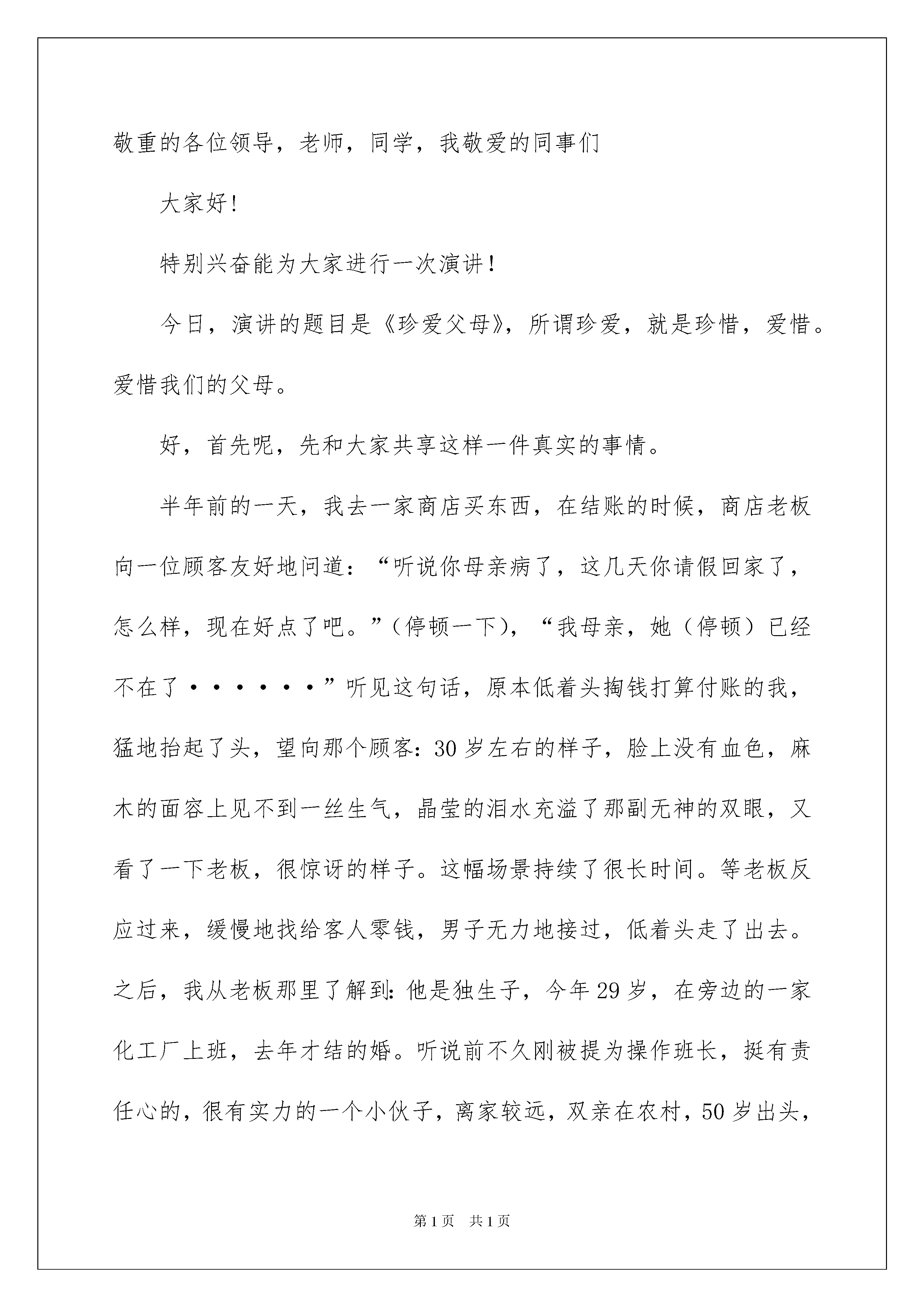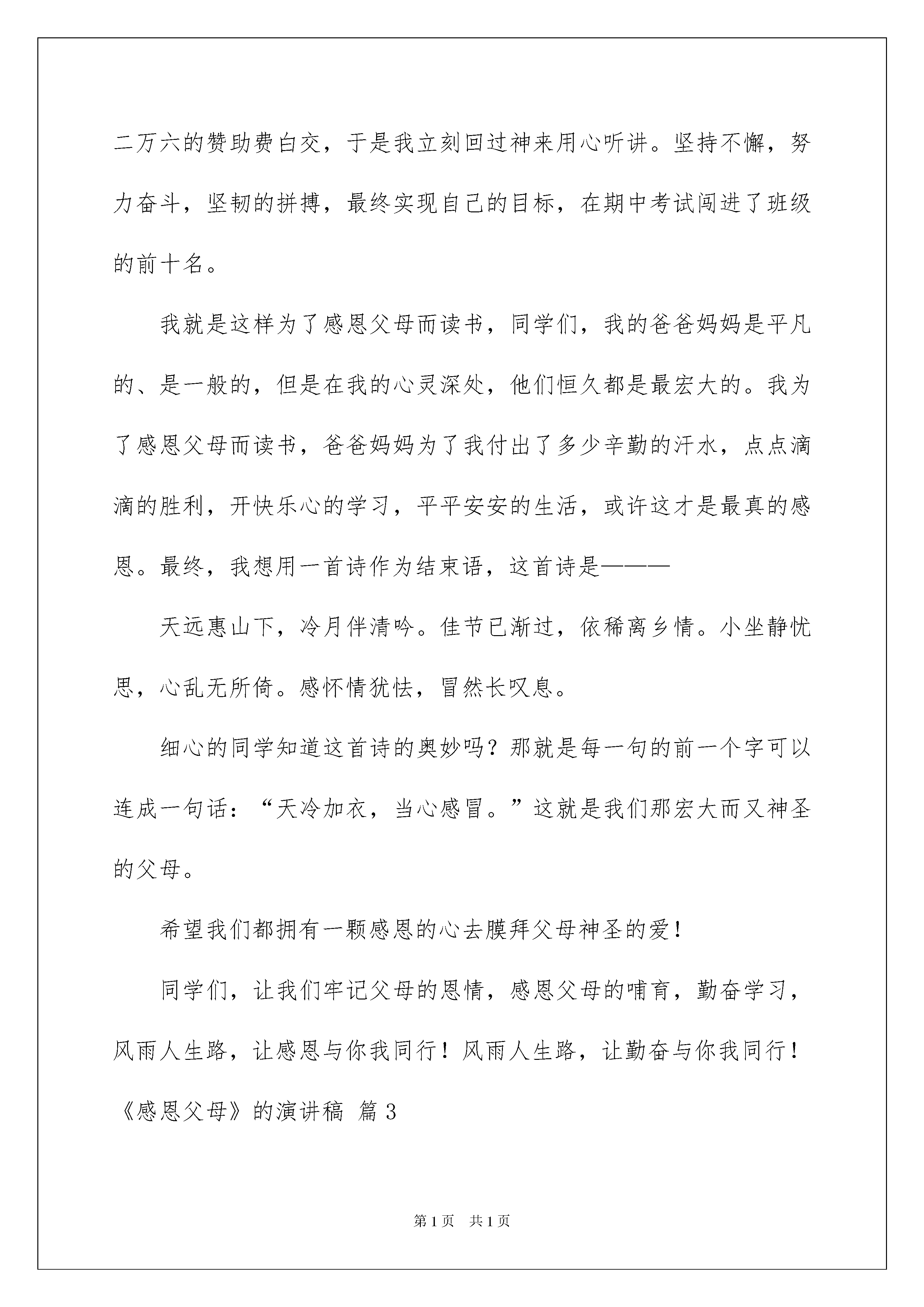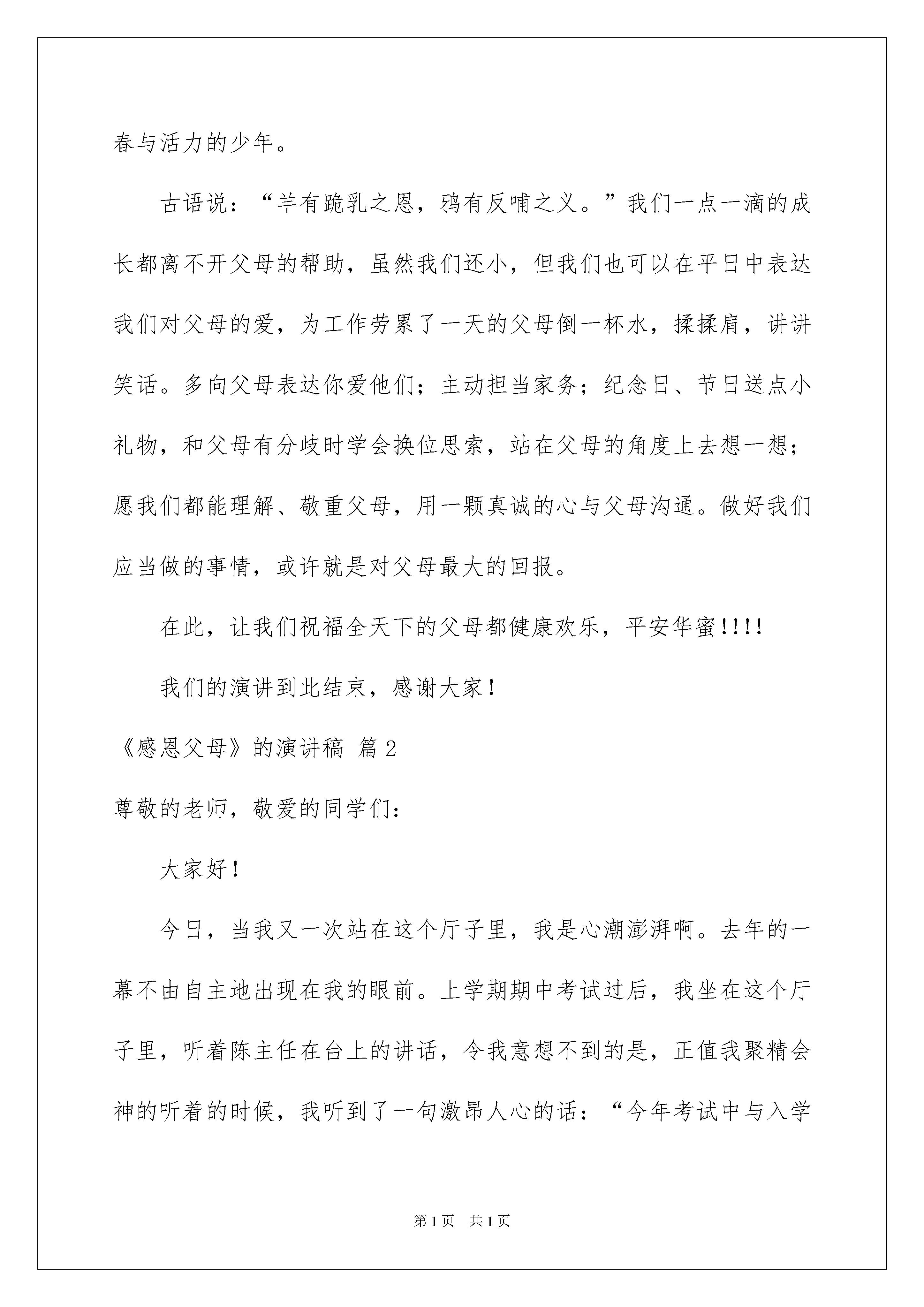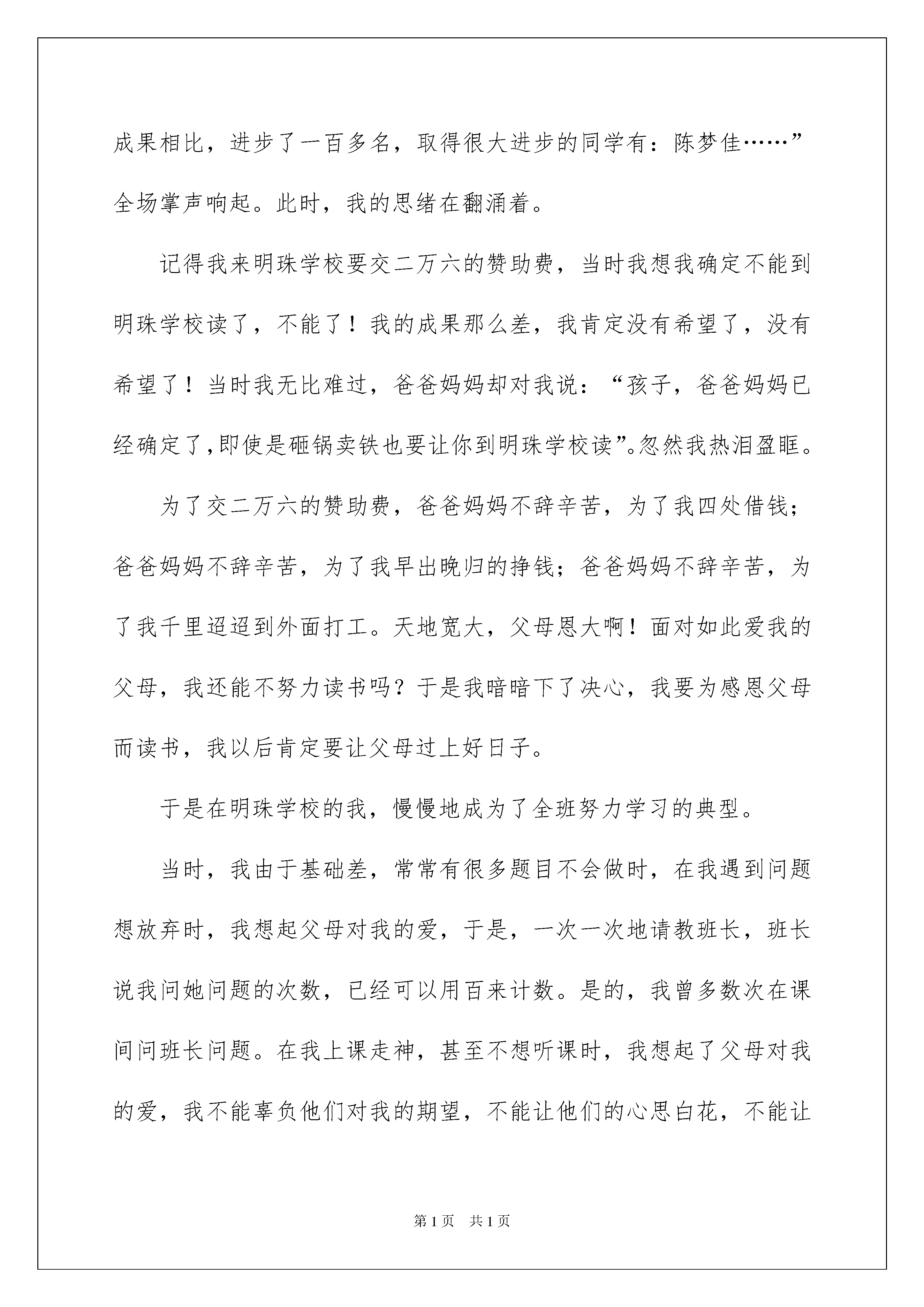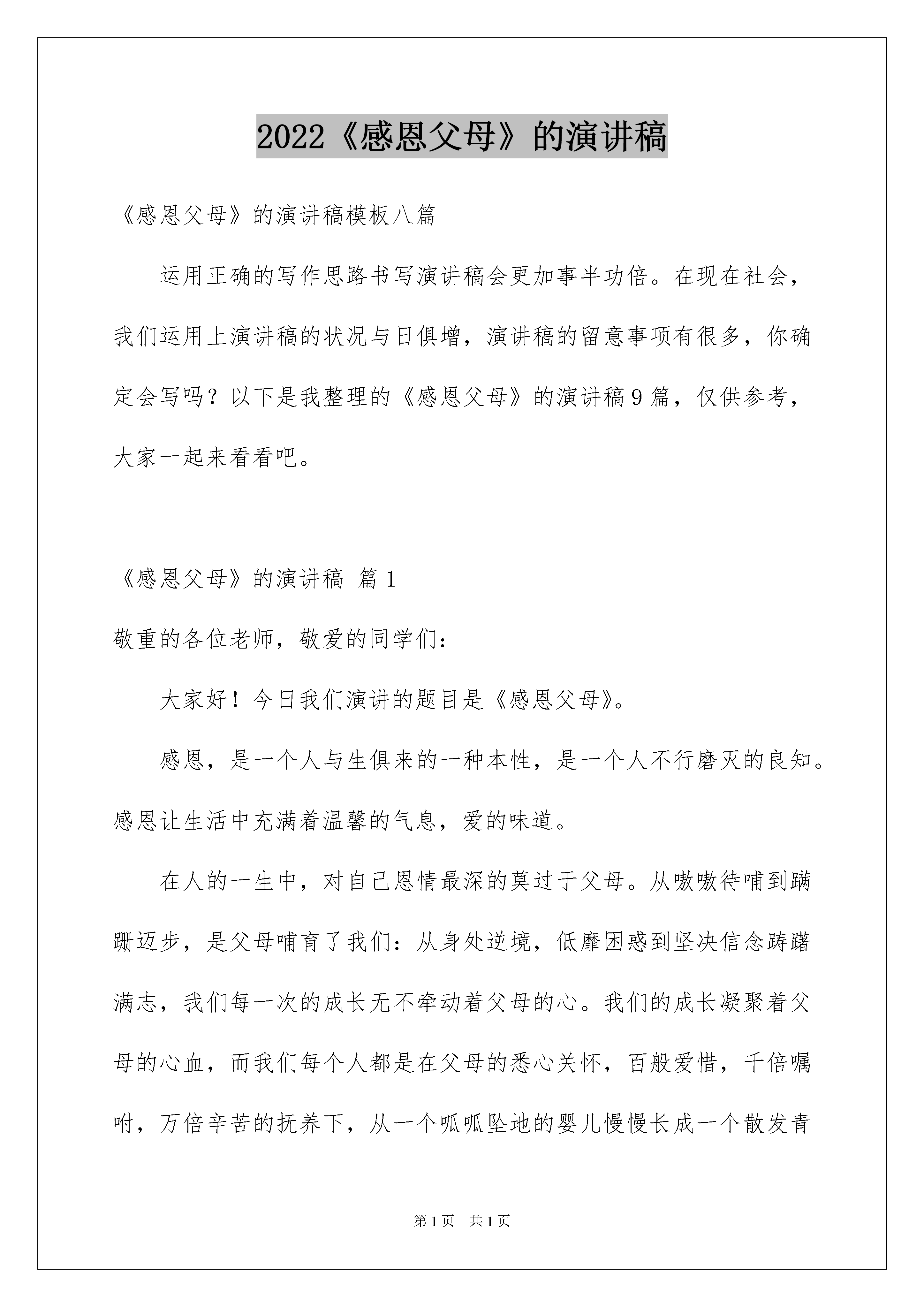 2022《感恩父母》的演讲稿《感恩父母》的演讲稿模板八篇运用正确的写作思路书写演讲稿会更加事半功倍。在现在社会,我们运用上演讲稿的状况与日俱增,演讲稿的留意事项有很多,你确定会写吗?以下是我整理的《感恩父母》的演讲稿9篇,仅供参考,大家一起来看看吧。《感恩父母》的演讲稿篇1敬重的各位老师,敬爱的同学们:大家好!今日我们演讲的题目是《感恩父母》。感恩,是一个人与生俱来的一种本性,是一个人不行磨灭的良知。感恩让生活中充满着温馨的气息,爱的味道。在人的一生中,对自己恩情最深的莫过于父母。从嗷嗷待哺到蹒跚迈步,是父母哺育了我们:从身处逆境,低靡困惑到坚决信念踌躇满志,我们每一次的成长无不牵动着父母的心。我们的成长凝聚着父母的心血,而我们每个人都是在父母的悉心关怀,百般爱惜,千倍嘱咐,万倍辛苦的抚养下,从一个呱呱坠地的婴儿慢慢长成一个散发青春与活力的少年。古语说:“羊有跪乳之恩,鸦有反哺之义。”我们一点一滴的成长都离不开父母的帮助,虽然我们还小,但我们也可以在平日中表达我们对父母的爱,为工作劳累了一天的父母倒一杯水,揉揉肩,讲讲笑话。多向父母表达你爱他们;主动担当家务;纪念日、节日送点小礼物,和父母有分歧时学会换位思索,站在父母的角度上去想一想;愿我们都能理解、敬重父母,用一颗真诚的心与父母沟通。做好我们应当做的事情,或许就是对父母最大的回报。在此,让我们祝福全天下的父母都健康欢乐,平安华蜜!!!!我们的演讲到此结束,感谢大家!《感恩父母》的演讲稿篇2尊敬的老师,敬爱的同学们:大家好!今日,当我又一次站在这个厅子里,我是心潮澎湃啊。去年的一幕不由自主地出现在我的眼前。上学期期中考试过后,我坐在这个厅子里,听着陈主任在台上的讲话,令我意想不到的是,正值我聚精会神的听着的时候,我听到了一句激昂人心的话:“今年考试中与入学成果相比,进步了一百多名,取得很大进步的同学有:陈梦佳……”全场掌声响起。此时,我的思绪在翻涌着。记得我来明珠学校要交二万六的赞助费,当时我想我确定不能到明珠学校读了,不能了!我的成果那么差,我肯定没有希望了,没有希望了!当时我无比难过,爸爸妈妈却对我说:“孩子,爸爸妈妈已经确定了,即使是砸锅卖铁也要让你到明珠学校读”。忽然我热泪盈眶。为了交二万六的赞助费,爸爸妈妈不辞辛苦,为了我四处借钱;爸爸妈妈不辞辛苦,为了我早出晚归的挣钱;爸爸妈妈不辞辛苦,为了我千里迢迢到外面打工。天地宽大,父母恩大啊!面对如此爱我的父母,我还能不努力读书吗?于是我暗暗下了决心,我要为感恩父母而读书,我以后肯定要让父母过上好日子。于是在明珠学校的我,慢慢地成为了全班努力学习的典型。当时,我由于基础差,常常有很多题目不会做时,在我遇到问题想放弃时,我想起父母对我的爱,于是,一次一次地请教班长,班长说我问她问题的次数,已经可以用百来计数。是的,我曾多数次在课间问班长问题。在我上课走神,甚至不想听课时,我想起了父母对我的爱,我不能辜负他们对我的期望,不能让他们的心思白花,不能让二万六的赞助费白交,于是我立刻回过神来用心听讲。坚持不懈,努力奋斗,坚韧的拼搏,最终实现自己的目标,在期中考试闯进了班级的前十名。我就是这样为了感恩父母而读书,同学们,我的爸爸妈妈是平凡的、是一般的,但是在我的心灵深处,他们恒久都是最宏大的。我为了感恩父母而读书,爸爸妈妈为了我付出了多少辛勤的汗水,点点滴滴的胜利,开快乐心的学习,平平安安的生活,或许这才是最真的感恩。最终,我想用一首诗作为结束语,这首诗是———天远惠山下,冷月伴清吟。佳节已渐过,依稀离乡情。小坐静忧思,心乱无所倚。感怀情犹怯,冒然长叹息。细心的同学知道这首诗的奥妙吗?那就是每一句的前一个字可以连成一句话:“天冷加衣,当心感冒。”这就是我们那宏大而又神圣的父母。希望我们都拥有一颗感恩的心去膜拜父母神圣的爱!同学们,让我们牢记父母的恩情,感恩父母的哺育,勤奋学习,风雨人生路,让感恩与你我同行!风雨人生路,让勤奋与你我同行!《感恩父母》的演讲稿篇3敬重的各位领导,老师,同学,我敬爱的同事们大家好!特别兴奋能为大家进行一次演讲!今日,演讲的题目是《珍爱父母》,所谓珍爱,就是珍惜,爱惜。爱惜我们的父母。好,首先呢,先和大家共享这样一件真实的事情。半年前的一天,我去一家商店买东西,在结账的时候,商店老板向一位顾客友好地问道:“听说你母亲病了,这几天你请假回家了,怎么样,现在好点了吧。”(停顿一下),“我母亲,她(停顿)已经不在了······”听见这句话,原本低着头掏钱打算付账的我,猛地抬起了头,望向那个顾客:30岁左右的样子,脸上没有血色,麻木的面容上见不到一丝生气,晶莹的