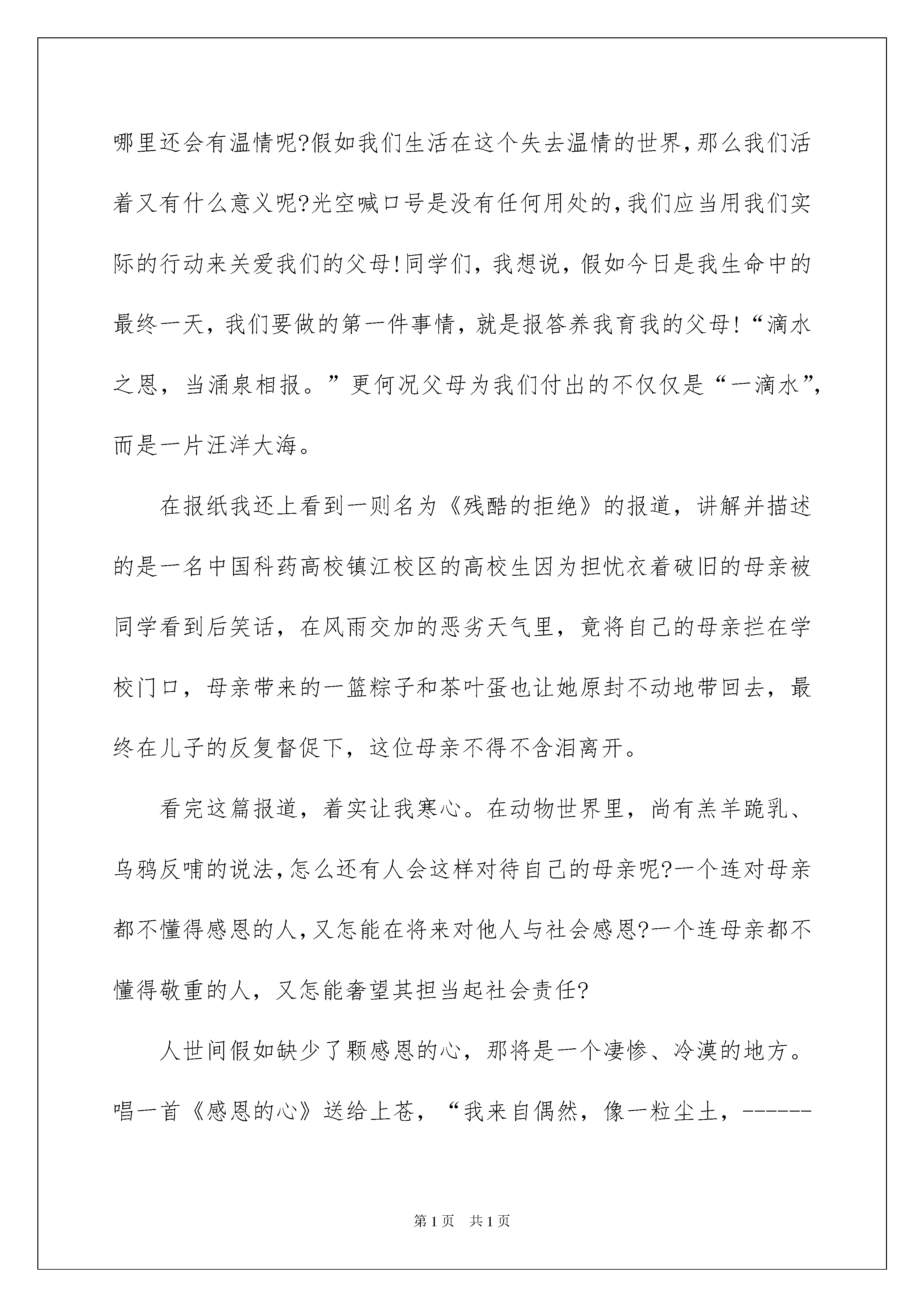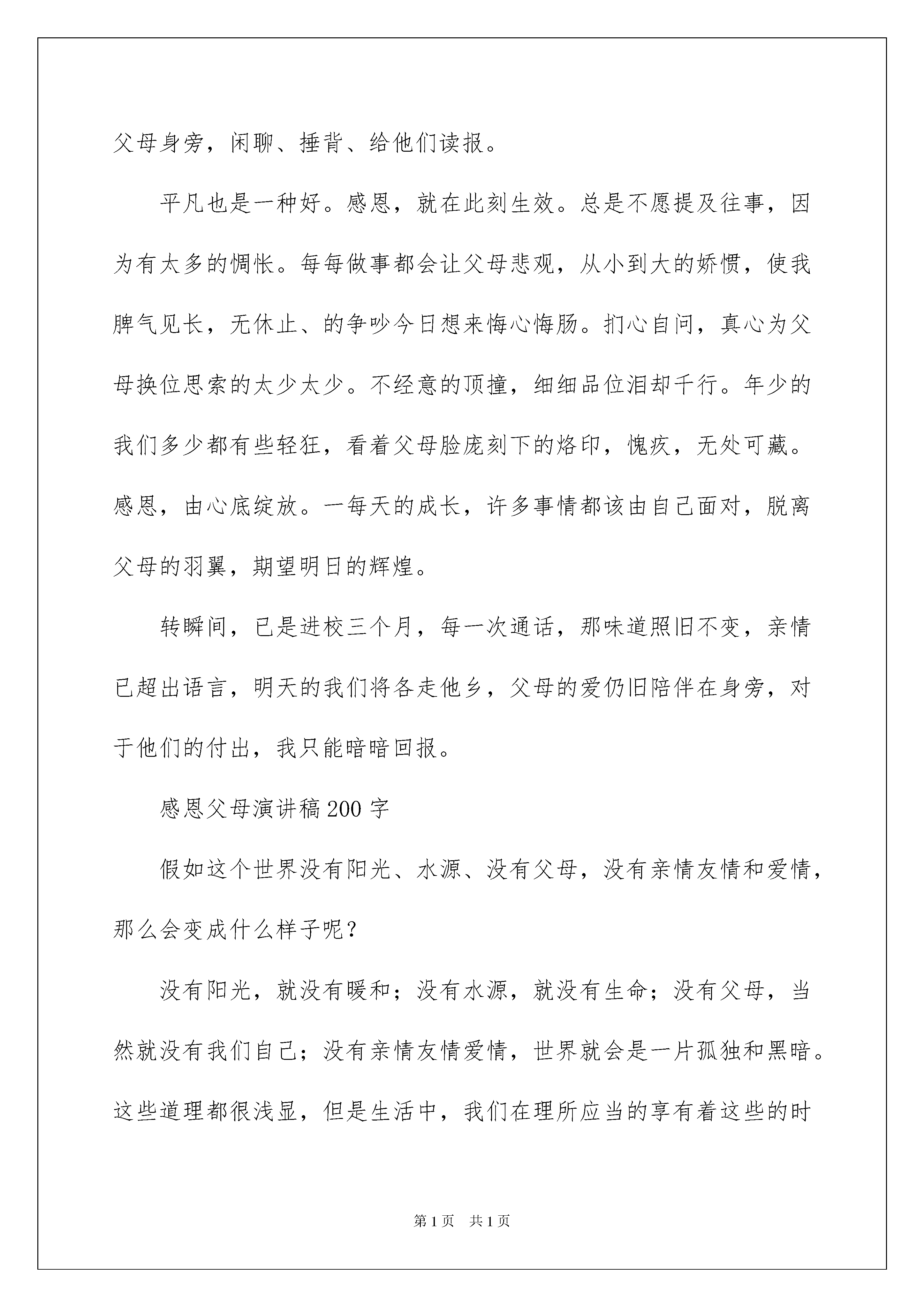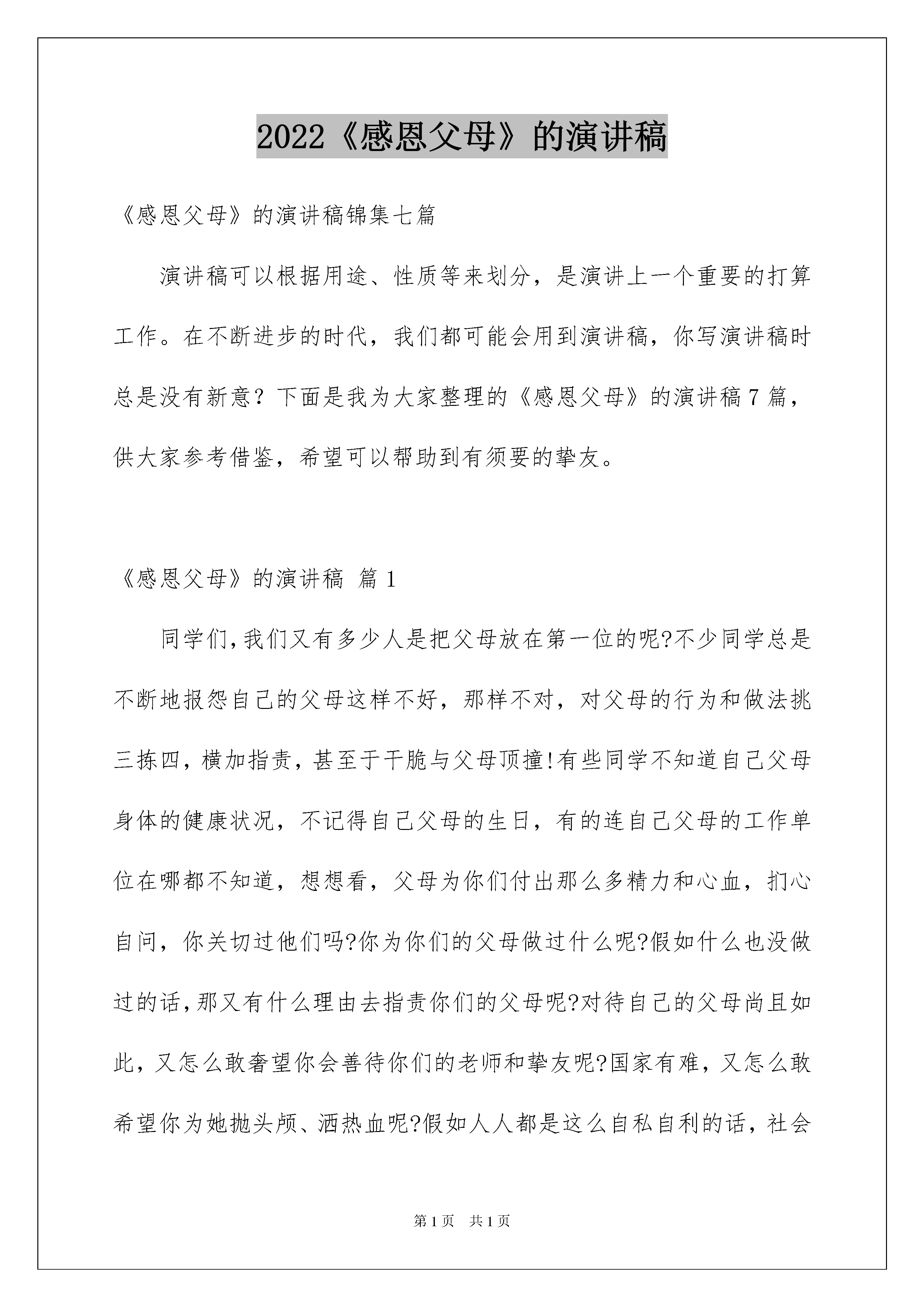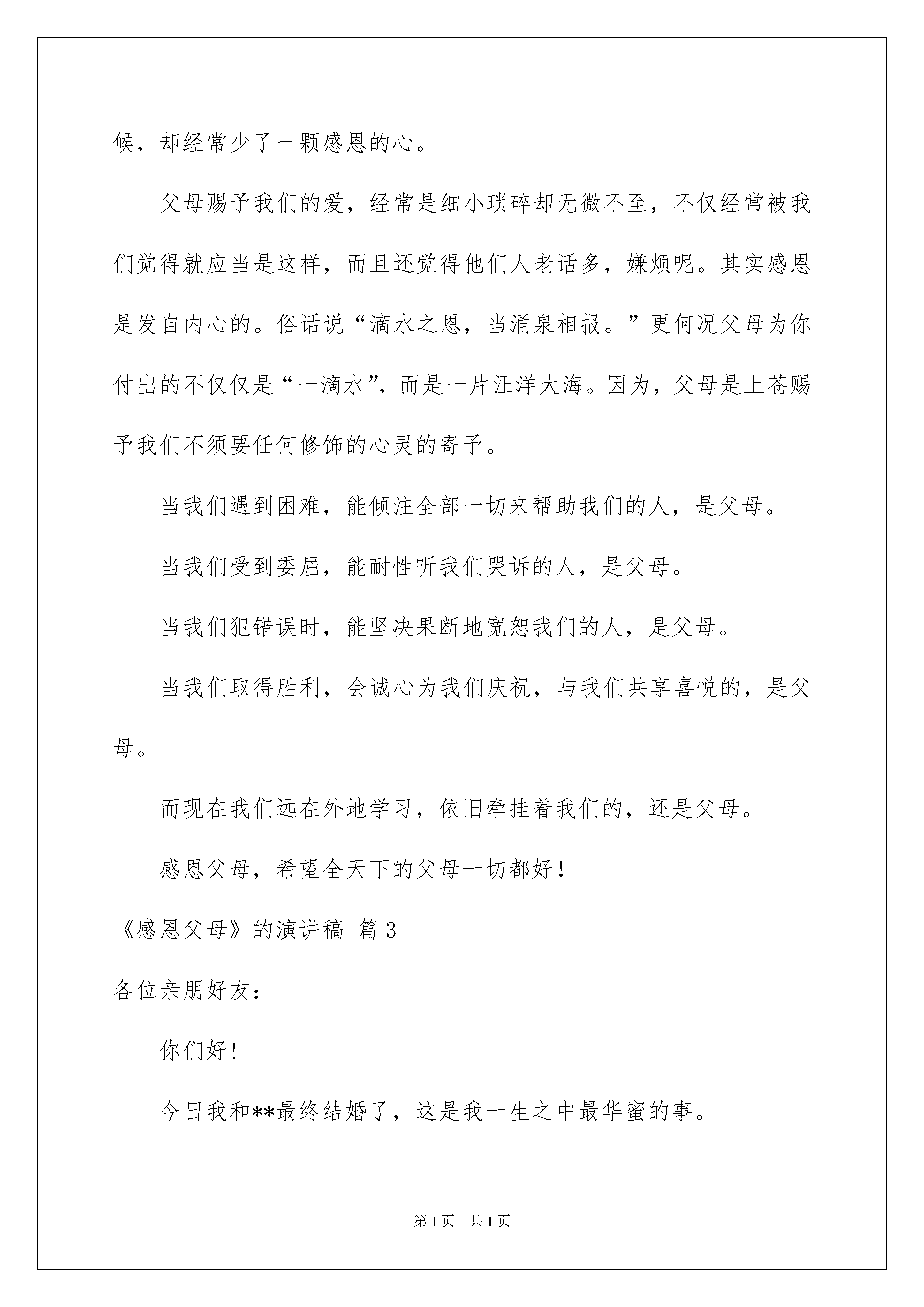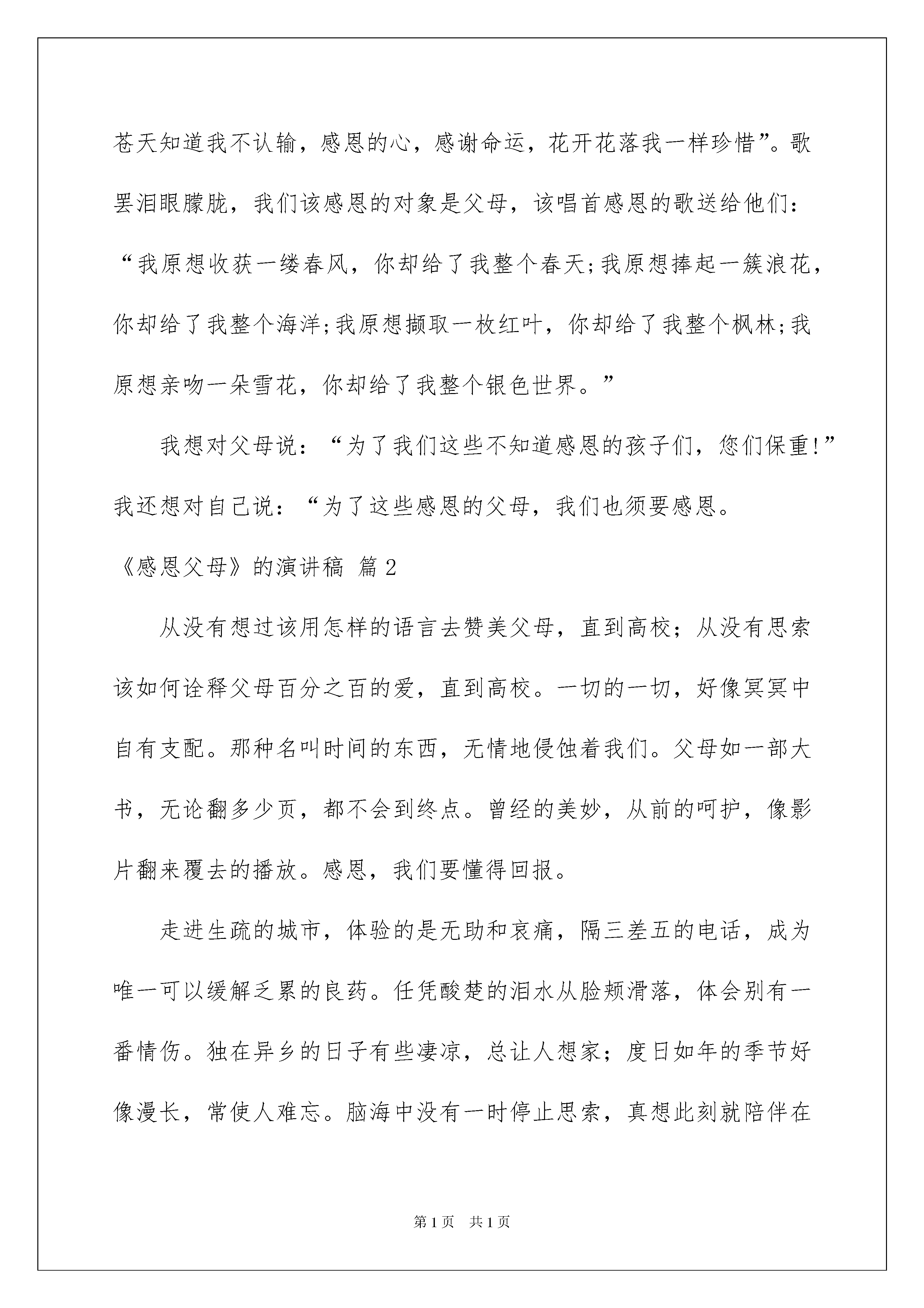 2022《感恩父母》的演讲稿《感恩父母》的演讲稿锦集七篇演讲稿可以根据用途、性质等来划分,是演讲上一个重要的打算工作。在不断进步的时代,我们都可能会用到演讲稿,你写演讲稿时总是没有新意?下面是我为大家整理的《感恩父母》的演讲稿7篇,供大家参考借鉴,希望可以帮助到有须要的挚友。《感恩父母》的演讲稿篇1同学们,我们又有多少人是把父母放在第一位的呢?不少同学总是不断地报怨自己的父母这样不好,那样不对,对父母的行为和做法挑三拣四,横加指责,甚至于干脆与父母顶撞!有些同学不知道自己父母身体的健康状况,不记得自己父母的生日,有的连自己父母的工作单位在哪都不知道,想想看,父母为你们付出那么多精力和心血,扪心自问,你关切过他们吗?你为你们的父母做过什么呢?假如什么也没做过的话,那又有什么理由去指责你们的父母呢?对待自己的父母尚且如此,又怎么敢奢望你会善待你们的老师和挚友呢?国家有难,又怎么敢希望你为她抛头颅、洒热血呢?假如人人都是这么自私自利的话,社会哪里还会有温情呢?假如我们生活在这个失去温情的世界,那么我们活着又有什么意义呢?光空喊口号是没有任何用处的,我们应当用我们实际的行动来关爱我们的父母!同学们,我想说,假如今日是我生命中的最终一天,我们要做的第一件事情,就是报答养我育我的父母!“滴水之恩,当涌泉相报。”更何况父母为我们付出的不仅仅是“一滴水”,而是一片汪洋大海。在报纸我还上看到一则名为《残酷的拒绝》的报道,讲解并描述的是一名中国科药高校镇江校区的高校生因为担忧衣着破旧的母亲被同学看到后笑话,在风雨交加的恶劣天气里,竟将自己的母亲拦在学校门口,母亲带来的一篮粽子和茶叶蛋也让她原封不动地带回去,最终在儿子的反复督促下,这位母亲不得不含泪离开。看完这篇报道,着实让我寒心。在动物世界里,尚有羔羊跪乳、乌鸦反哺的说法,怎么还有人会这样对待自己的母亲呢?一个连对母亲都不懂得感恩的人,又怎能在将来对他人与社会感恩?一个连母亲都不懂得敬重的人,又怎能奢望其担当起社会责任?人世间假如缺少了颗感恩的心,那将是一个凄惨、冷漠的地方。唱一首《感恩的心》送给上苍,“我来自偶然,像一粒尘土,------苍天知道我不认输,感恩的心,感谢命运,花开花落我一样珍惜”。歌罢泪眼朦胧,我们该感恩的对象是父母,该唱首感恩的歌送给他们:“我原想收获一缕春风,你却给了我整个春天;我原想捧起一簇浪花,你却给了我整个海洋;我原想撷取一枚红叶,你却给了我整个枫林;我原想亲吻一朵雪花,你却给了我整个银色世界。”我想对父母说:“为了我们这些不知道感恩的孩子们,您们保重!”我还想对自己说:“为了这些感恩的父母,我们也须要感恩。《感恩父母》的演讲稿篇2从没有想过该用怎样的语言去赞美父母,直到高校;从没有思索该如何诠释父母百分之百的爱,直到高校。一切的一切,好像冥冥中自有支配。那种名叫时间的东西,无情地侵蚀着我们。父母如一部大书,无论翻多少页,都不会到终点。曾经的美妙,从前的呵护,像影片翻来覆去的播放。感恩,我们要懂得回报。走进生疏的城市,体验的是无助和哀痛,隔三差五的电话,成为唯一可以缓解乏累的良药。任凭酸楚的泪水从脸颊滑落,体会别有一番情伤。独在异乡的日子有些凄凉,总让人想家;度日如年的季节好像漫长,常使人难忘。脑海中没有一时停止思索,真想此刻就陪伴在父母身旁,闲聊、捶背、给他们读报。平凡也是一种好。感恩,就在此刻生效。总是不愿提及往事,因为有太多的惆怅。每每做事都会让父母悲观,从小到大的娇惯,使我脾气见长,无休止、的争吵今日想来悔心悔肠。扪心自问,真心为父母换位思索的太少太少。不经意的顶撞,细细品位泪却千行。年少的我们多少都有些轻狂,看着父母脸庞刻下的烙印,愧疚,无处可藏。感恩,由心底绽放。一每天的成长,许多事情都该由自己面对,脱离父母的羽翼,期望明日的辉煌。转瞬间,已是进校三个月,每一次通话,那味道照旧不变,亲情已超出语言,明天的我们将各走他乡,父母的爱仍旧陪伴在身旁,对于他们的付出,我只能暗暗回报。感恩父母演讲稿200字假如这个世界没有阳光、水源、没有父母,没有亲情友情和爱情,那么会变成什么样子呢?没有阳光,就没有暖和;没有水源,就没有生命;没有父母,当然就没有我们自己;没有亲情友情爱情,世界就会是一片孤独和黑暗。这些道理都很浅显,但是生活中,我们在理所应当的享有着这些的时候,却经常少了一颗感恩的心。父母赐予我们的爱,经常是细小琐碎却无微不至,不仅经常被我们觉得就应当是这样,而且还觉得他们人老话多,嫌烦呢。其实感恩是发自内心的。俗话说“滴水之恩,当涌泉相报。”更何况父母为你付出的不仅仅是“一滴水”,而是一片汪洋大海。因为,父