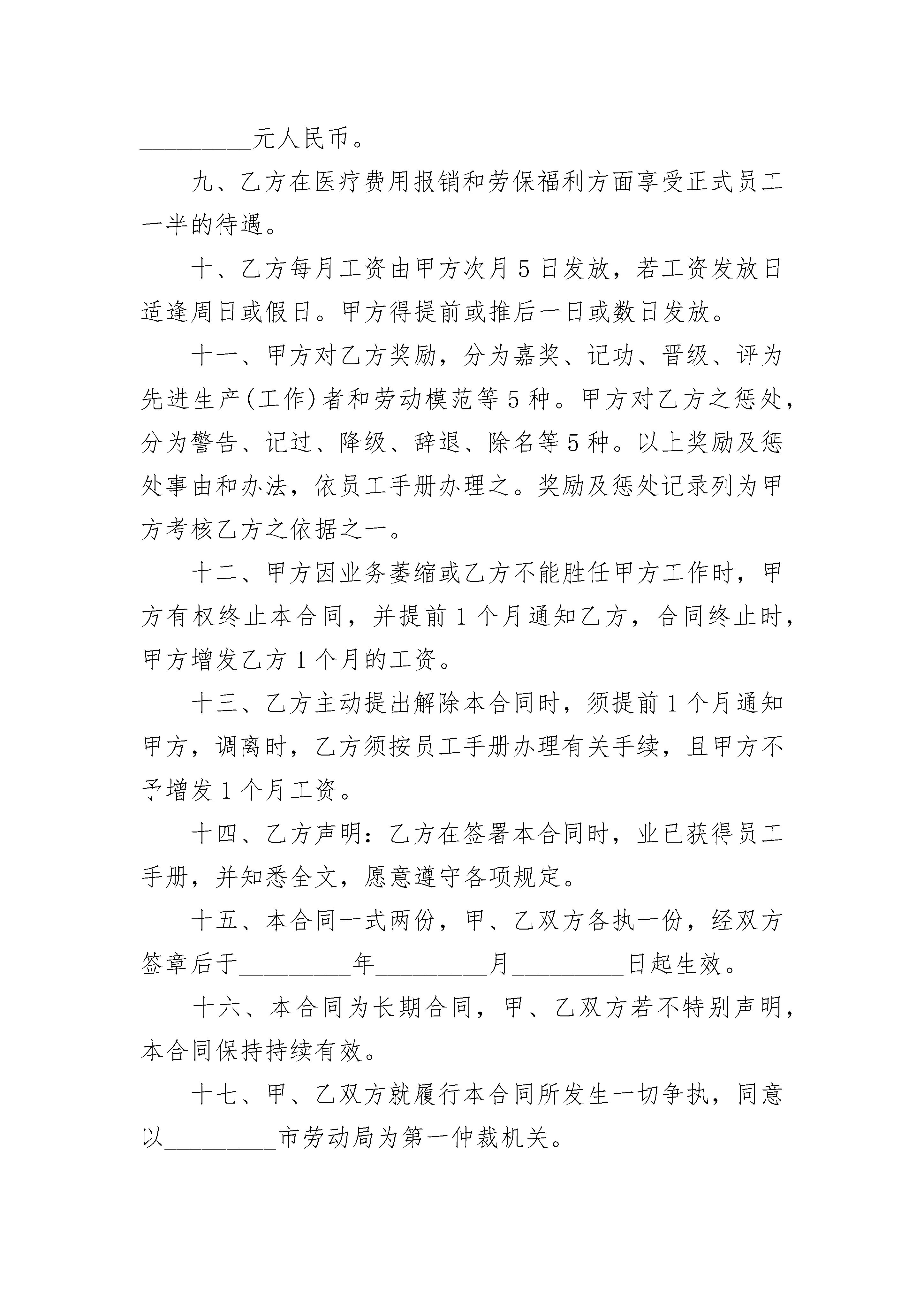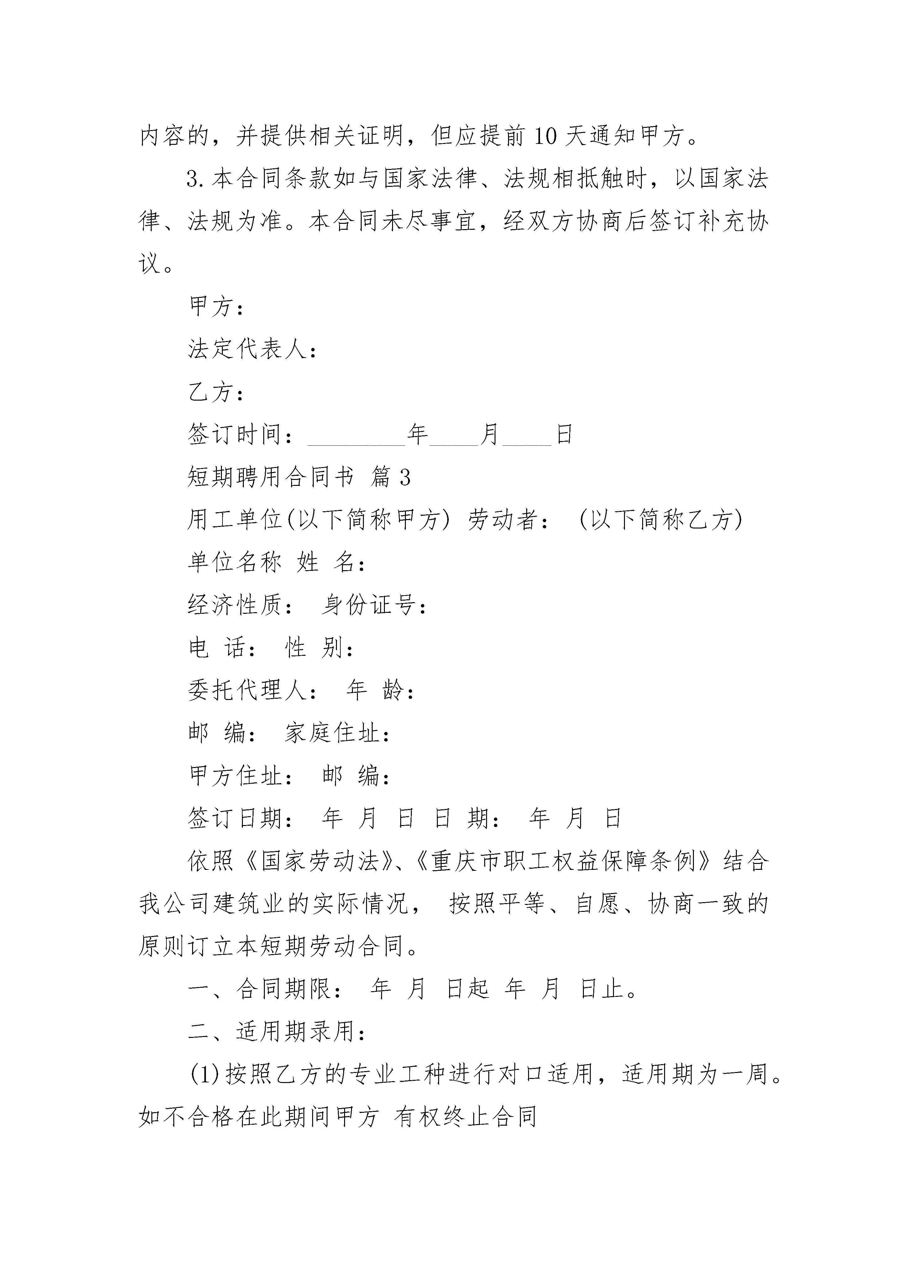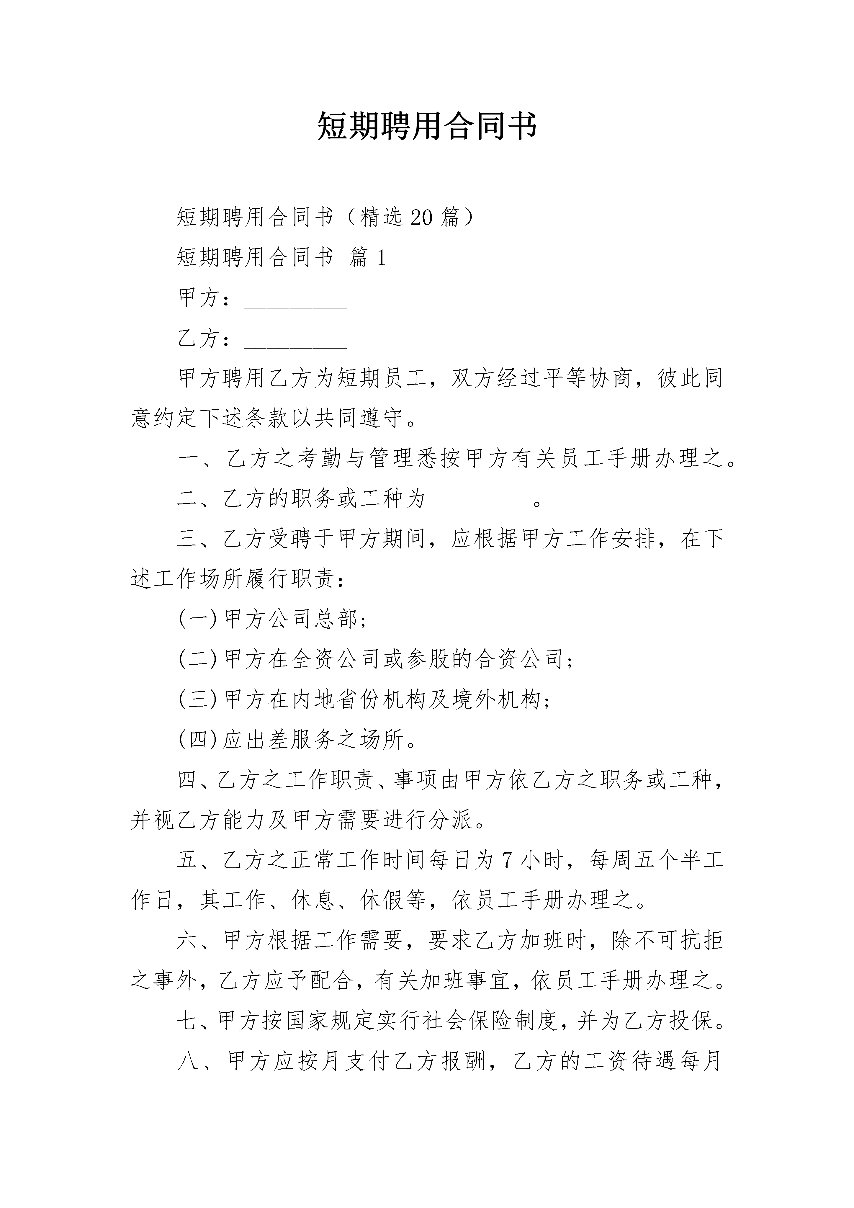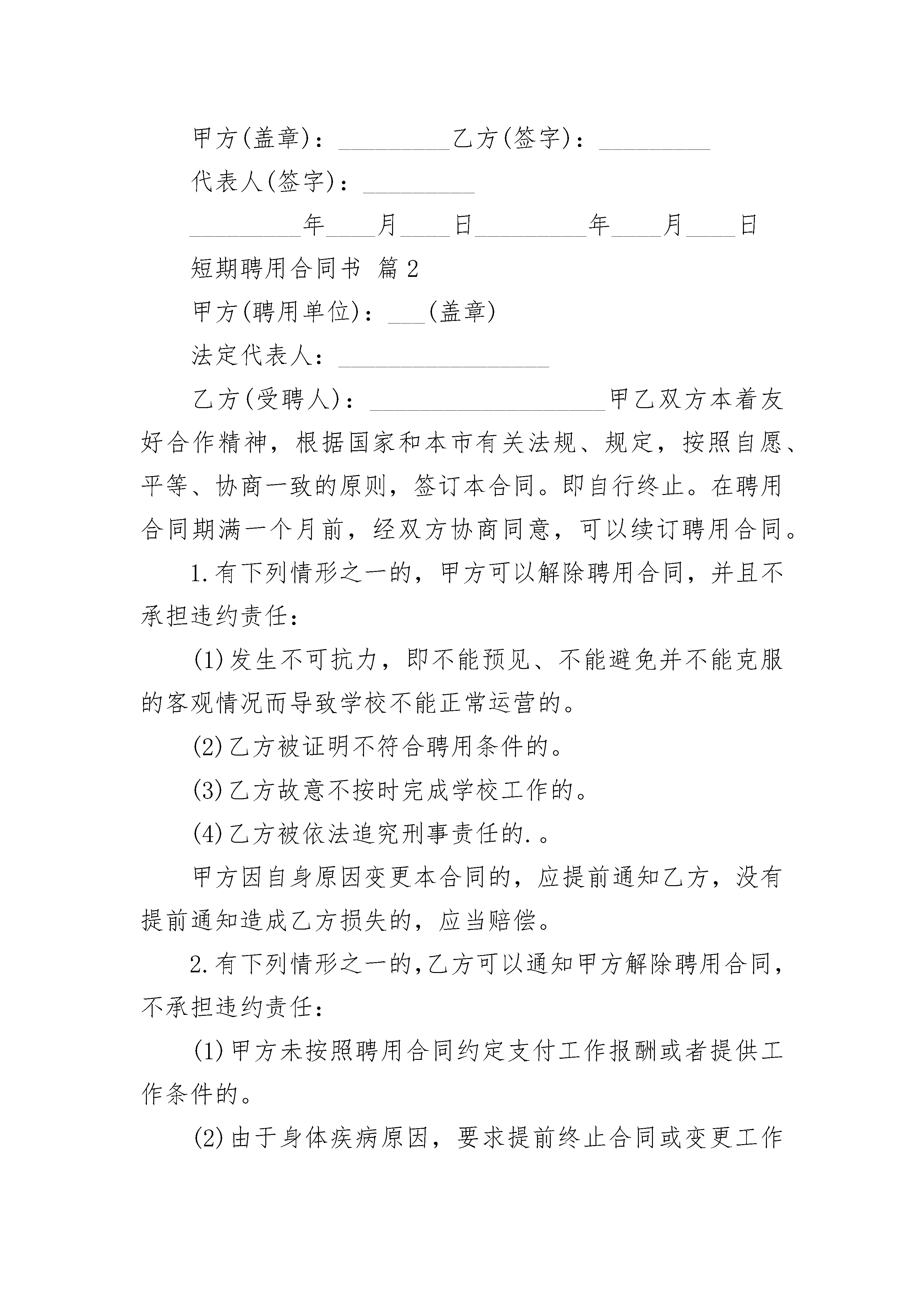 短期聘用合同书短期聘用合同书(精选20篇)短期聘用合同书篇1甲方:_________乙方:_________甲方聘用乙方为短期员工,双方经过平等协商,彼此同意约定下述条款以共同遵守。一、乙方之考勤与管理悉按甲方有关员工手册办理之。二、乙方的职务或工种为_________。三、乙方受聘于甲方期间,应根据甲方工作安排,在下述工作场所履行职责:(一)甲方公司总部;(二)甲方在全资公司或参股的合资公司;(三)甲方在内地省份机构及境外机构;(四)应出差服务之场所。四、乙方之工作职责、事项由甲方依乙方之职务或工种,并视乙方能力及甲方需要进行分派。五、乙方之正常工作时间每日为7小时,每周五个半工作日,其工作、休息、休假等,依员工手册办理之。六、甲方根据工作需要,要求乙方加班时,除不可抗拒之事外,乙方应予配合,有关加班事宜,依员工手册办理之。七、甲方按国家规定实行社会保险制度,并为乙方投保。八、甲方应按月支付乙方报酬,乙方的工资待遇每月_________元人民币。九、乙方在医疗费用报销和劳保福利方面享受正式员工一半的待遇。十、乙方每月工资由甲方次月5日发放,若工资发放日适逢周日或假日。甲方得提前或推后一日或数日发放。十一、甲方对乙方奖励,分为嘉奖、记功、晋级、评为先进生产(工作)者和劳动模范等5种。甲方对乙方之惩处,分为警告、记过、降级、辞退、除名等5种。以上奖励及惩处事由和办法,依员工手册办理之。奖励及惩处记录列为甲方考核乙方之依据之一。十二、甲方因业务萎缩或乙方不能胜任甲方工作时,甲方有权终止本合同,并提前1个月通知乙方,合同终止时,甲方增发乙方1个月的工资。十三、乙方主动提出解除本合同时,须提前1个月通知甲方,调离时,乙方须按员工手册办理有关手续,且甲方不予增发1个月工资。十四、乙方声明:乙方在签署本合同时,业已获得员工手册,并知悉全文,愿意遵守各项规定。十五、本合同一式两份,甲、乙双方各执一份,经双方签章后于_________年_________月_________日起生效。十六、本合同为长期合同,甲、乙双方若不特别声明,本合同保持持续有效。十七、甲、乙双方就履行本合同所发生一切争执,同意以_________市劳动局为第一仲裁机关。甲方(盖章):_________乙方(签字):_________代表人(签字):__________________年____月____日_________年____月____日短期聘用合同书篇2甲方(聘用单位):___(盖章)法定代表人:_________________乙方(受聘人):___________________甲乙双方本着友好合作精神,根据国家和本市有关法规、规定,按照自愿、平等、协商一致的原则,签订本合同。即自行终止。在聘用合同期满一个月前,经双方协商同意,可以续订聘用合同。1.有下列情形之一的,甲方可以解除聘用合同,并且不承担违约责任:(1)发生不可抗力,即不能预见、不能避免并不能克服的客观情况而导致学校不能正常运营的。(2)乙方被证明不符合聘用条件的。(3)乙方故意不按时完成学校工作的。(4)乙方被依法追究刑事责任的.。甲方因自身原因变更本合同的,应提前通知乙方,没有提前通知造成乙方损失的,应当赔偿。2.有下列情形之一的,乙方可以通知甲方解除聘用合同,不承担违约责任:(1)甲方未按照聘用合同约定支付工作报酬或者提供工作条件的。(2)由于身体疾病原因,要求提前终止合同或变更工作内容的,并提供相关证明,但应提前10天通知甲方。3.本合同条款如与国家法律、法规相抵触时,以国家法律、法规为准。本合同未尽事宜,经双方协商后签订补充协议。甲方:法定代表人:乙方:签订时间:________年____月____日短期聘用合同书篇3用工单位(以下简称甲方)劳动者:(以下简称乙方)单位名称姓名:经济性质:身份证号:电话:性别:委托代理人:年龄:邮编:家庭住址:甲方住址:邮编:签订日期:年月日日期:年月日依照《国家劳动法》、《重庆市职工权益保障条例》结合我公司建筑业的实际情况,按照平等、自愿、协商一致的原则订立本短期劳动合同。一、合同期限:年月日起年月日止。二、适用期录用:(1)按照乙方的专业工种进行对口适用,适用期为一周。如不合格在此期间甲方有权终止合同(2)适用期满双方无异议,该合同正式生效。三、工作内容:(1)施工现场零星用工。(2)各技术工种所涉及范围。(3)项目部安排的其他工作内容。四、工资计算标准:(1)计时工:每个工日元,以捌小时为一工作日(2)计件工:按照项目部与各班组商定的劳动定额以完成的合格产品的数量乘以计件劳动定额,分配给乙方的工资定额为乙方工资。五、工作时间:由于建筑行业的特殊性,为保证质量必须连续工作,有时会超出法定劳动时间,超出法定劳动时间的可允许休假,休假时间由项目部安排,