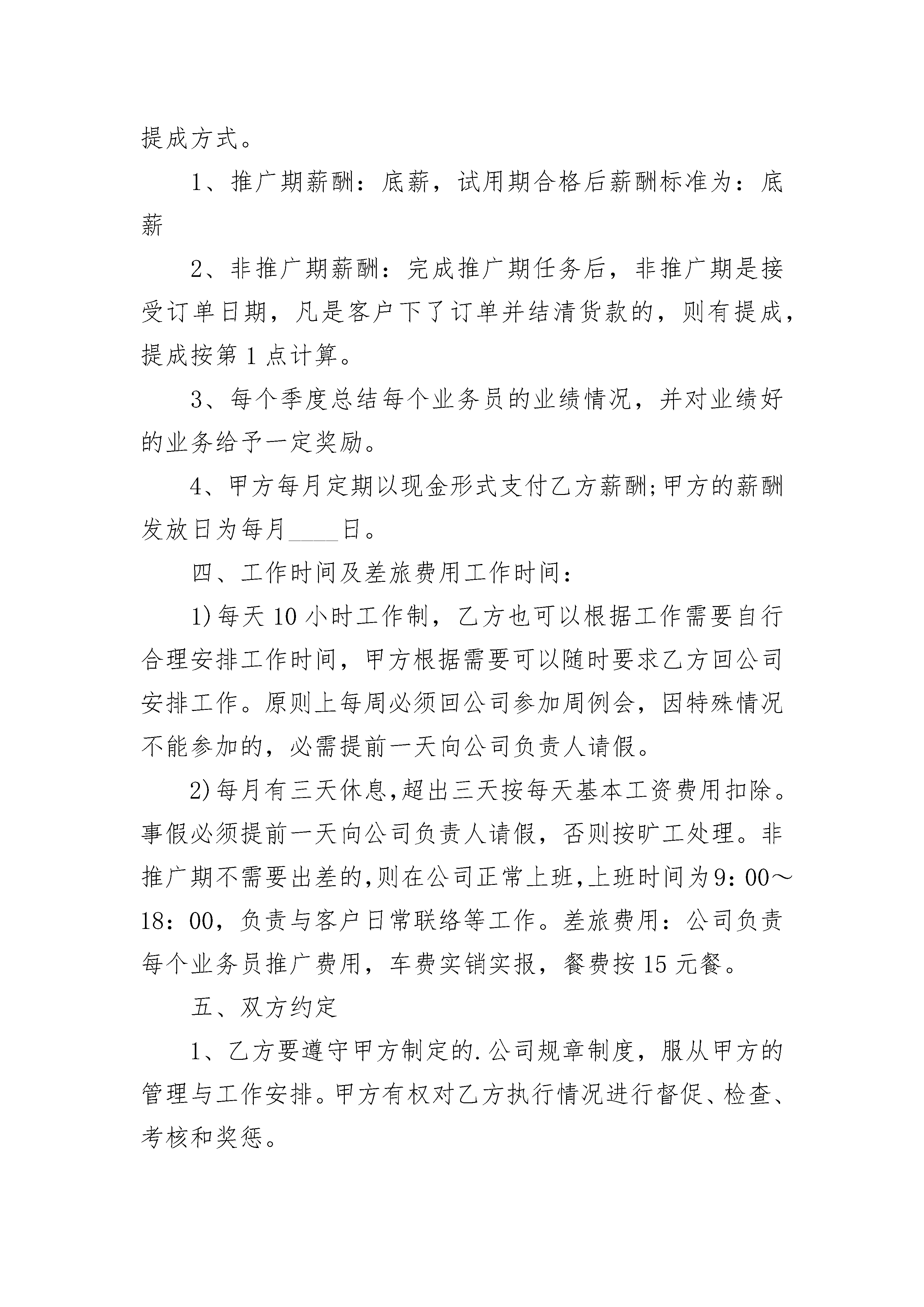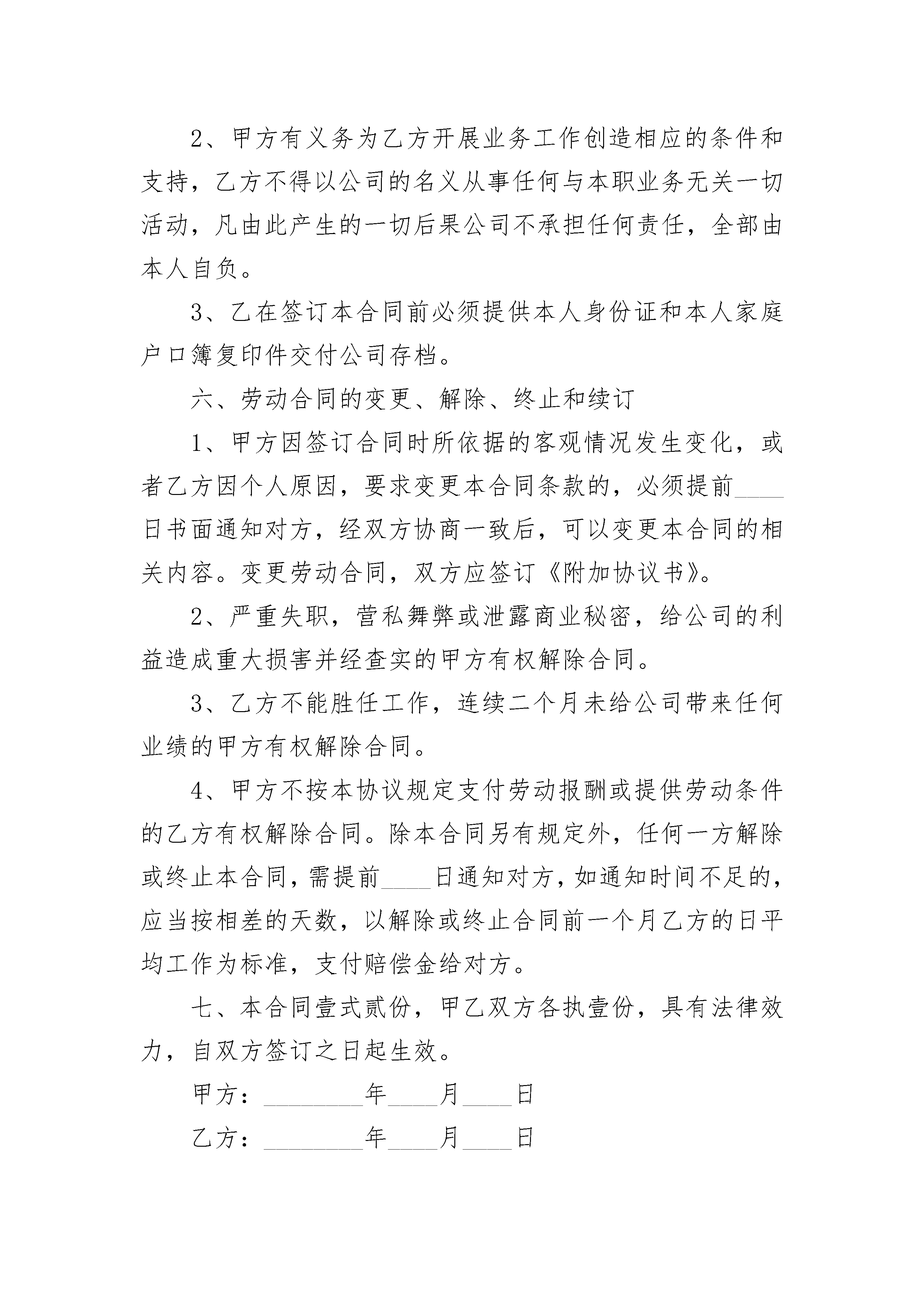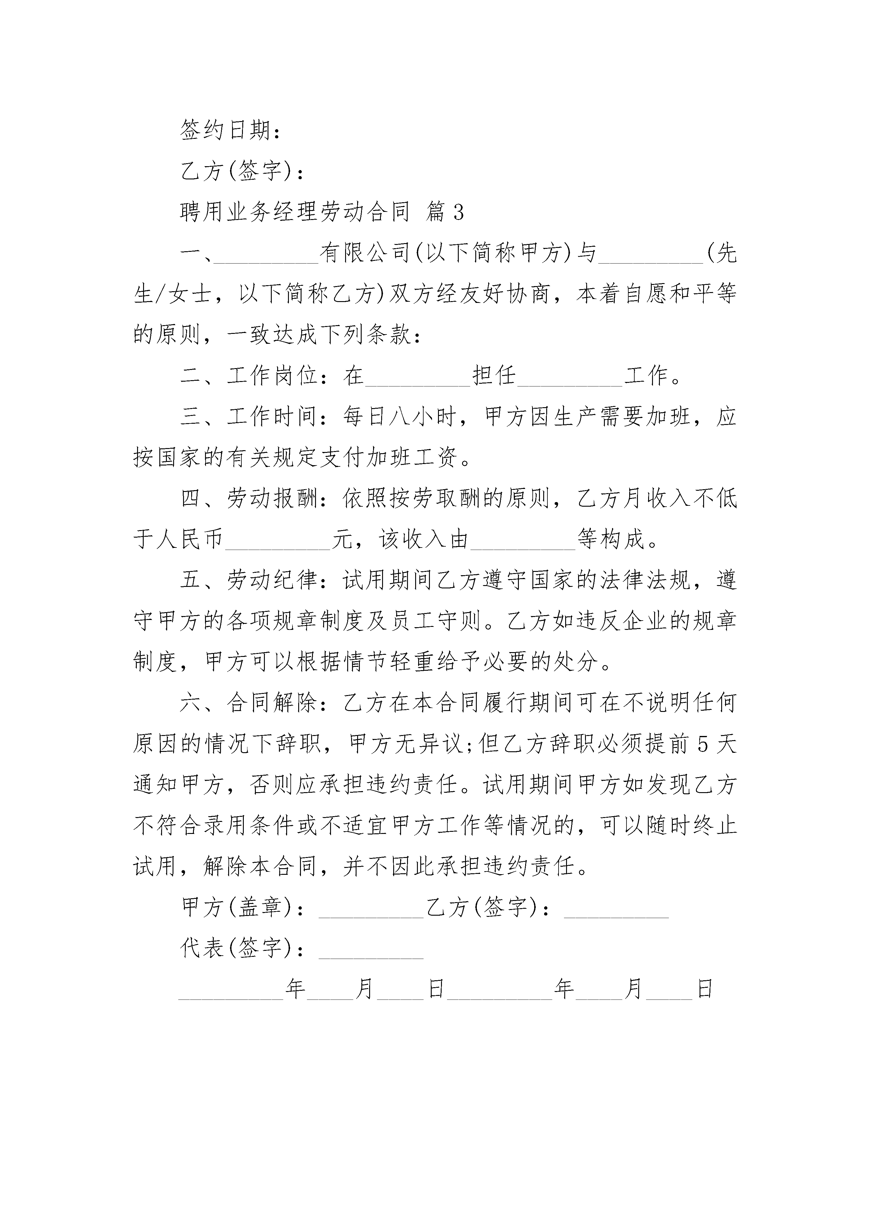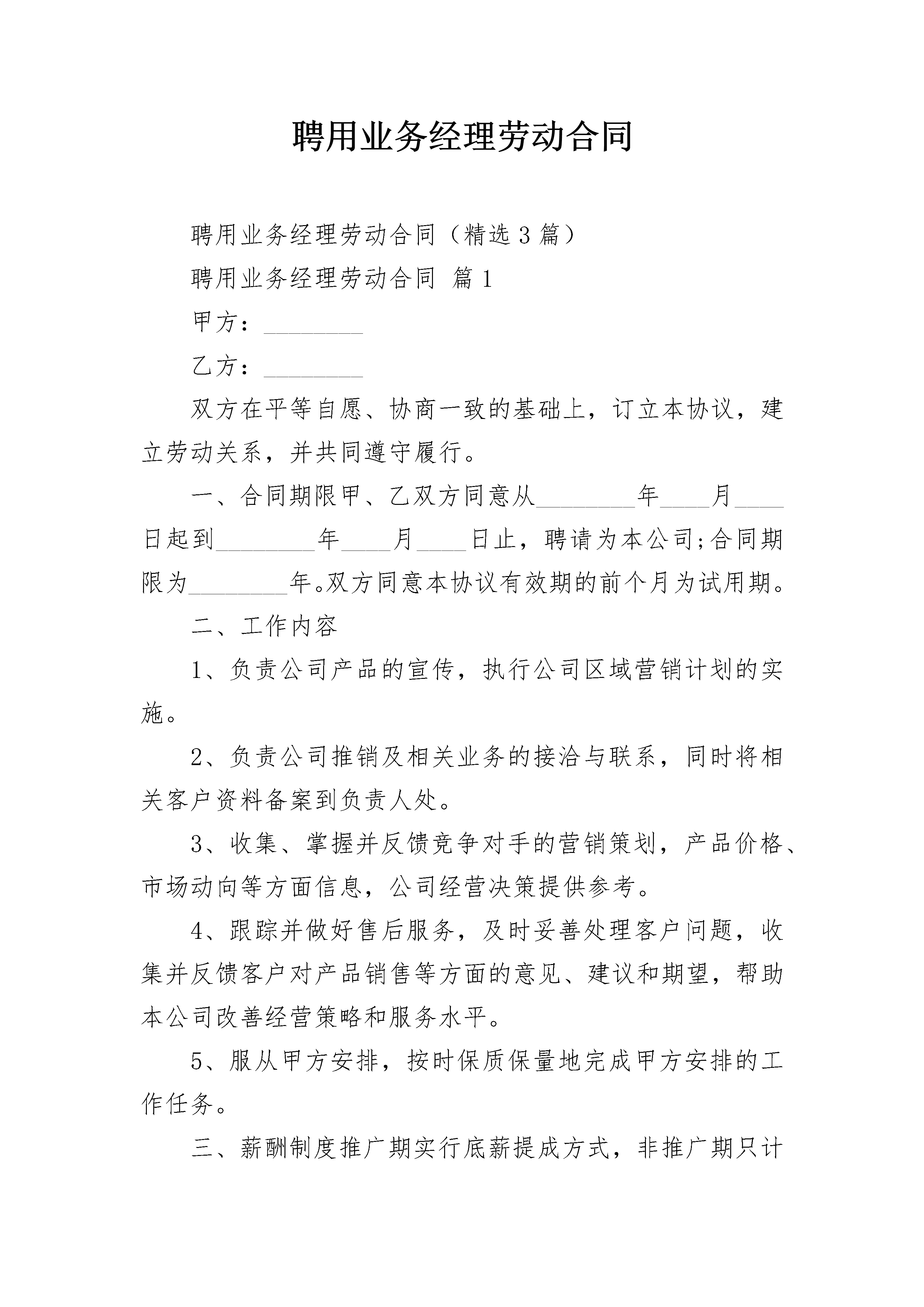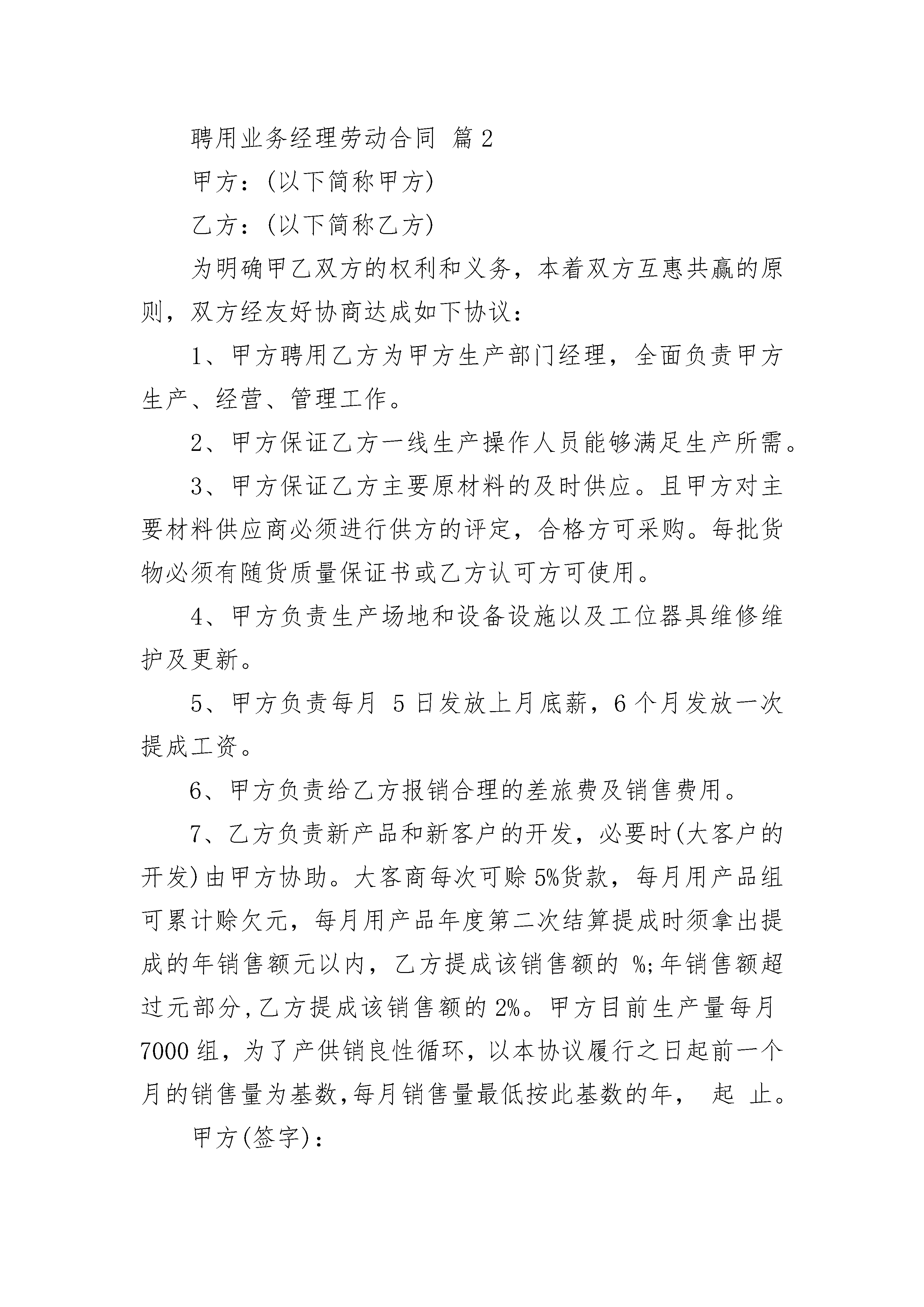 聘用业务经理劳动合同聘用业务经理劳动合同(精选3篇)聘用业务经理劳动合同篇1甲方:________乙方:________双方在平等自愿、协商一致的基础上,订立本协议,建立劳动关系,并共同遵守履行。一、合同期限甲、乙双方同意从________年____月____日起到________年____月____日止,聘请为本公司;合同期限为________年。双方同意本协议有效期的前个月为试用期。二、工作内容1、负责公司产品的宣传,执行公司区域营销计划的实施。2、负责公司推销及相关业务的接洽与联系,同时将相关客户资料备案到负责人处。3、收集、掌握并反馈竞争对手的营销策划,产品价格、市场动向等方面信息,公司经营决策提供参考。4、跟踪并做好售后服务,及时妥善处理客户问题,收集并反馈客户对产品销售等方面的意见、建议和期望,帮助本公司改善经营策略和服务水平。5、服从甲方安排,按时保质保量地完成甲方安排的工作任务。三、薪酬制度推广期实行底薪提成方式,非推广期只计提成方式。1、推广期薪酬:底薪,试用期合格后薪酬标准为:底薪2、非推广期薪酬:完成推广期任务后,非推广期是接受订单日期,凡是客户下了订单并结清货款的,则有提成,提成按第1点计算。3、每个季度总结每个业务员的业绩情况,并对业绩好的业务给予一定奖励。4、甲方每月定期以现金形式支付乙方薪酬;甲方的薪酬发放日为每月____日。四、工作时间及差旅费用工作时间:1)每天10小时工作制,乙方也可以根据工作需要自行合理安排工作时间,甲方根据需要可以随时要求乙方回公司安排工作。原则上每周必须回公司参加周例会,因特殊情况不能参加的,必需提前一天向公司负责人请假。2)每月有三天休息,超出三天按每天基本工资费用扣除。事假必须提前一天向公司负责人请假,否则按旷工处理。非推广期不需要出差的,则在公司正常上班,上班时间为9:00~18:00,负责与客户日常联络等工作。差旅费用:公司负责每个业务员推广费用,车费实销实报,餐费按15元餐。五、双方约定1、乙方要遵守甲方制定的.公司规章制度,服从甲方的管理与工作安排。甲方有权对乙方执行情况进行督促、检查、考核和奖惩。2、甲方有义务为乙方开展业务工作创造相应的条件和支持,乙方不得以公司的名义从事任何与本职业务无关一切活动,凡由此产生的一切后果公司不承担任何责任,全部由本人自负。3、乙在签订本合同前必须提供本人身份证和本人家庭户口簿复印件交付公司存档。六、劳动合同的变更、解除、终止和续订1、甲方因签订合同时所依据的客观情况发生变化,或者乙方因个人原因,要求变更本合同条款的,必须提前____日书面通知对方,经双方协商一致后,可以变更本合同的相关内容。变更劳动合同,双方应签订《附加协议书》。2、严重失职,营私舞弊或泄露商业秘密,给公司的利益造成重大损害并经查实的甲方有权解除合同。3、乙方不能胜任工作,连续二个月未给公司带来任何业绩的甲方有权解除合同。4、甲方不按本协议规定支付劳动报酬或提供劳动条件的乙方有权解除合同。除本合同另有规定外,任何一方解除或终止本合同,需提前____日通知对方,如通知时间不足的,应当按相差的天数,以解除或终止合同前一个月乙方的日平均工作为标准,支付赔偿金给对方。七、本合同壹式贰份,甲乙双方各执壹份,具有法律效力,自双方签订之日起生效。甲方:________年____月____日乙方:________年____月____日聘用业务经理劳动合同篇2甲方:(以下简称甲方)乙方:(以下简称乙方)为明确甲乙双方的权利和义务,本着双方互惠共赢的原则,双方经友好协商达成如下协议:1、甲方聘用乙方为甲方生产部门经理,全面负责甲方生产、经营、管理工作。2、甲方保证乙方一线生产操作人员能够满足生产所需。3、甲方保证乙方主要原材料的及时供应。且甲方对主要材料供应商必须进行供方的评定,合格方可采购。每批货物必须有随货质量保证书或乙方认可方可使用。4、甲方负责生产场地和设备设施以及工位器具维修维护及更新。5、甲方负责每月5日发放上月底薪,6个月发放一次提成工资。6、甲方负责给乙方报销合理的差旅费及销售费用。7、乙方负责新产品和新客户的开发,必要时(大客户的开发)由甲方协助。大客商每次可赊5%货款,每月用产品组可累计赊欠元,每月用产品年度第二次结算提成时须拿出提成的年销售额元以内,乙方提成该销售额的%;年销售额超过元部分,乙方提成该销售额的2%。甲方目前生产量每月7000组,为了产供销良性循环,以本协议履行之日起前一个月的销售量为基数,每月销售量最低按此基数的年,起止。甲方(签字):签约日期:乙方(签字):聘用业务经理劳动合同篇3一、_________有限公司(以下简称甲方)与_________(先生/女士,以下简称乙方)双方经友好协商,本着自愿和平等的原则,一致达成下列条款:二、