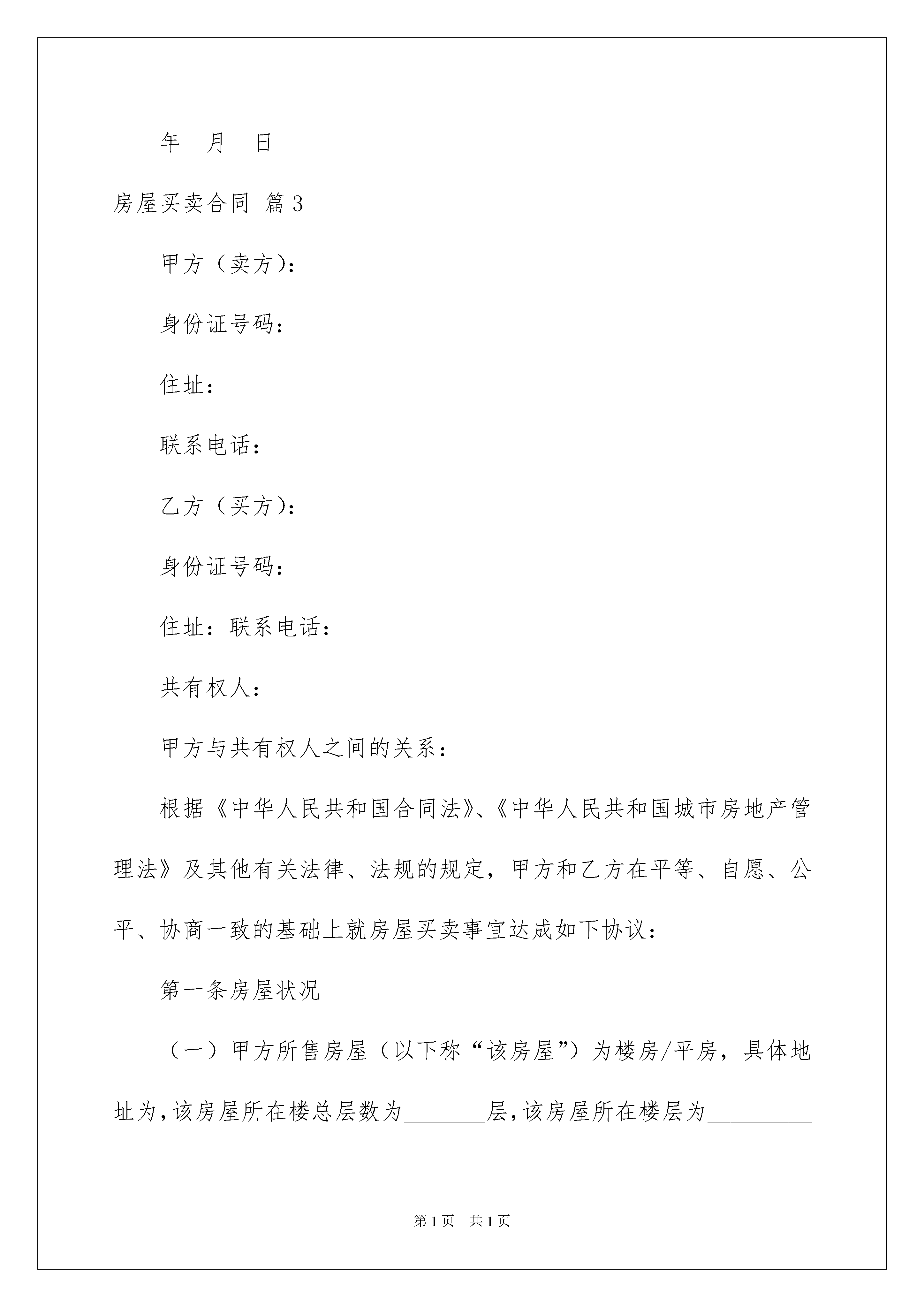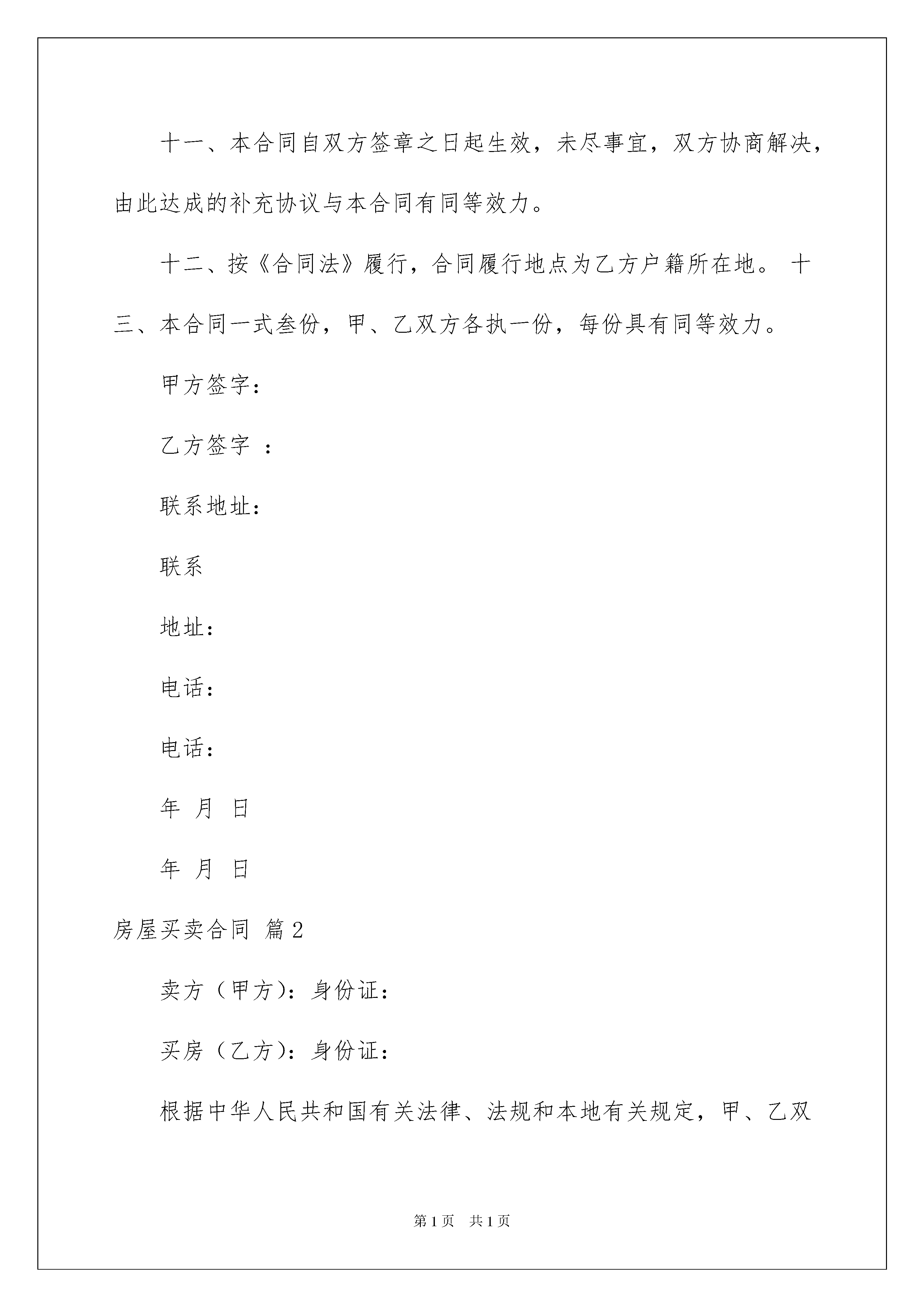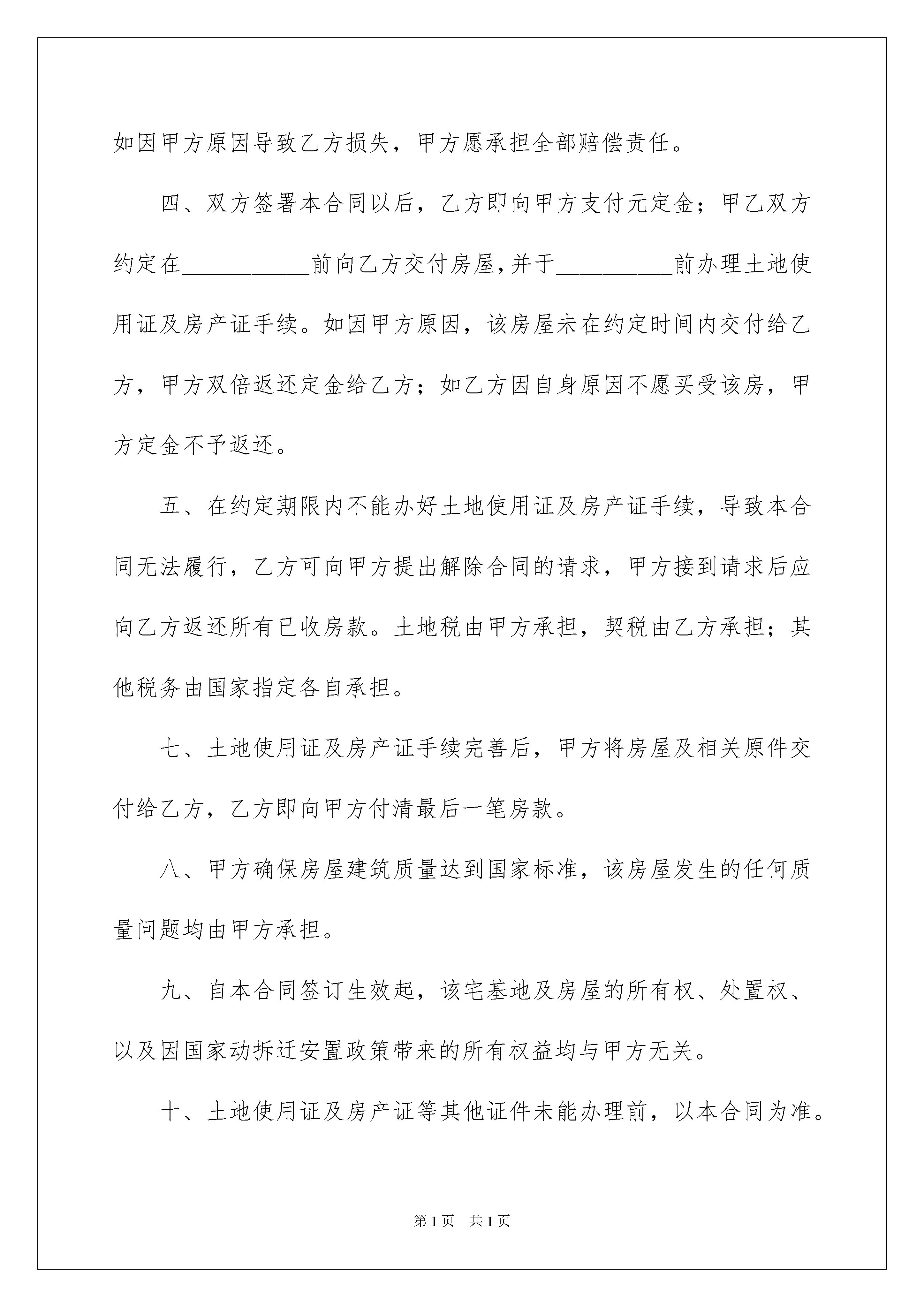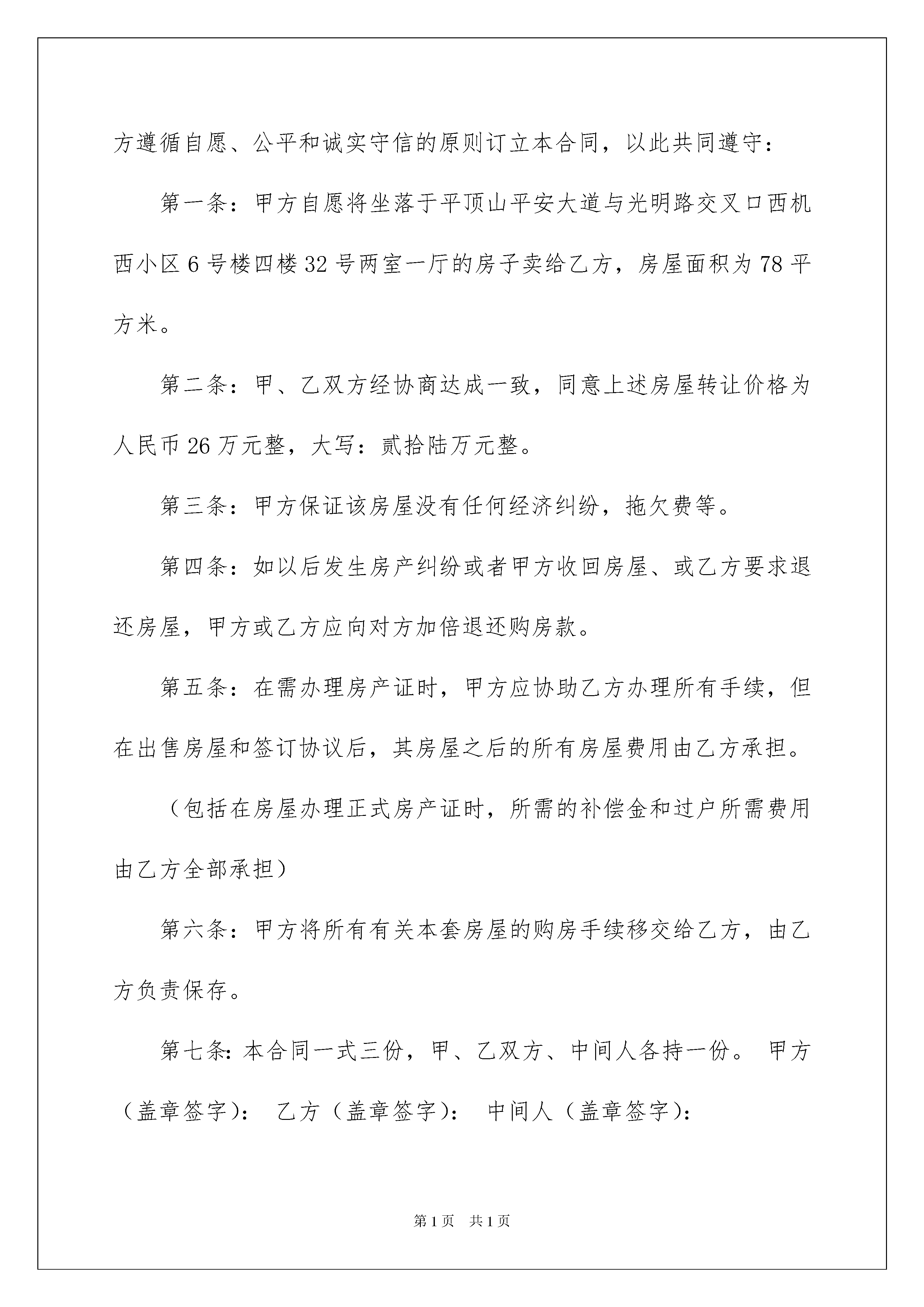2022关于房屋买卖合同集合7篇关于房屋买卖合同集合7篇随着广大人民群众法律意识的普遍提高,合同对我们的帮助越来越大,签订合同能平衡双方当事人的平等地位。那么大家知道合同的格式吗?下面是我为大家收集的房屋买卖合同7篇,欢迎大家借鉴与参考,希望对大家有所帮助。房屋买卖合同篇1甲方(卖方):身份证号码:乙方(买方):身份证号码:甲、乙双方就宅基地及房屋买卖事宜,经协商自愿达成如下协议:一、甲方自愿将坐落在的宅基地及房屋出售给乙方。二、双方议定的上述宅基地及房屋成交总为人民币元。三、甲方陈述:该宅基地及房屋的所有权完全归甲方个人,该宅基地及房屋没有任何的债权债务纠纷,其转让符合法律规定的条件,如因甲方原因导致乙方损失,甲方愿承担全部赔偿责任。四、双方签署本合同以后,乙方即向甲方支付元定金;甲乙双方约定在___________前向乙方交付房屋,并于__________前办理土地使用证及房产证手续。如因甲方原因,该房屋未在约定时间内交付给乙方,甲方双倍返还定金给乙方;如乙方因自身原因不愿买受该房,甲方定金不予返还。五、在约定期限内不能办好土地使用证及房产证手续,导致本合同无法履行,乙方可向甲方提出解除合同的请求,甲方接到请求后应向乙方返还所有已收房款。土地税由甲方承担,契税由乙方承担;其他税务由国家指定各自承担。七、土地使用证及房产证手续完善后,甲方将房屋及相关原件交付给乙方,乙方即向甲方付清最后一笔房款。八、甲方确保房屋建筑质量达到国家标准,该房屋发生的任何质量问题均由甲方承担。九、自本合同签订生效起,该宅基地及房屋的所有权、处置权、以及因国家动拆迁安置政策带来的所有权益均与甲方无关。十、土地使用证及房产证等其他证件未能办理前,以本合同为准。十一、本合同自双方签章之日起生效,未尽事宜,双方协商解决,由此达成的补充协议与本合同有同等效力。十二、按《合同法》履行,合同履行地点为乙方户籍所在地。十三、本合同一式叁份,甲、乙双方各执一份,每份具有同等效力。甲方签字:乙方签字:联系地址:联系地址:电话:电话:年月日年月日房屋买卖合同篇2卖方(甲方):身份证:买房(乙方):身份证:根据中华人民共和国有关法律、法规和本地有关规定,甲、乙双方遵循自愿、公平和诚实守信的原则订立本合同,以此共同遵守:第一条:甲方自愿将坐落于平顶山平安大道与光明路交叉口西机西小区6号楼四楼32号两室一厅的房子卖给乙方,房屋面积为78平方米。第二条:甲、乙双方经协商达成一致,同意上述房屋转让价格为人民币26万元整,大写:贰拾陆万元整。第三条:甲方保证该房屋没有任何经济纠纷,拖欠费等。第四条:如以后发生房产纠纷或者甲方收回房屋、或乙方要求退还房屋,甲方或乙方应向对方加倍退还购房款。第五条:在需办理房产证时,甲方应协助乙方办理所有手续,但在出售房屋和签订协议后,其房屋之后的所有房屋费用由乙方承担。(包括在房屋办理正式房产证时,所需的补偿金和过户所需费用由乙方全部承担)第六条:甲方将所有有关本套房屋的购房手续移交给乙方,由乙方负责保存。第七条:本合同一式三份,甲、乙双方、中间人各持一份。甲方(盖章签字):乙方(盖章签字):中间人(盖章签字):年月日房屋买卖合同篇3甲方(卖方):身份证号码:住址:联系电话:乙方(买方):身份证号码:住址:联系电话:共有权人:甲方与共有权人之间的关系:根据《中华人民共和国合同法》、《中华人民共和国城市房地产管理法》及其他有关法律、法规的规定,甲方和乙方在平等、自愿、公平、协商一致的基础上就房屋买卖事宜达成如下协议:第一条房屋状况(一)甲方所售房屋(以下称“该房屋”)为楼房/平房,具体地址为,该房屋所在楼总层数为_______层,该房屋所在楼层为_________层,建筑面积共___________平方米,以房屋所有权证登记为准。(二)该房屋规划设计用途为___________。该房屋附属设施设备、装饰装修、相关物品清单等具体情况见附件一。第二条房屋权属情况(一)该房屋性质为下列选项中第_______种情形:1、商品房;2、已购公有住房;3、向社会公开销售的经济适用住房;4、按经济适用住房管理的房屋(危改回迁房、安居房、康居房、绿化隔离地区农民回迁房等房屋);5、其他房屋。(二)该房屋产权证号为:。(三)该房屋的抵押情况为第____种:1、该房屋未设定抵押;2、该房屋已经设定抵押,抵押权人为:_______________,抵押登记日期为:年月日,他项权利证证号为:___________________。卖方应于________年______月______日前办理抵押注销手续。(四)该房屋的出租情