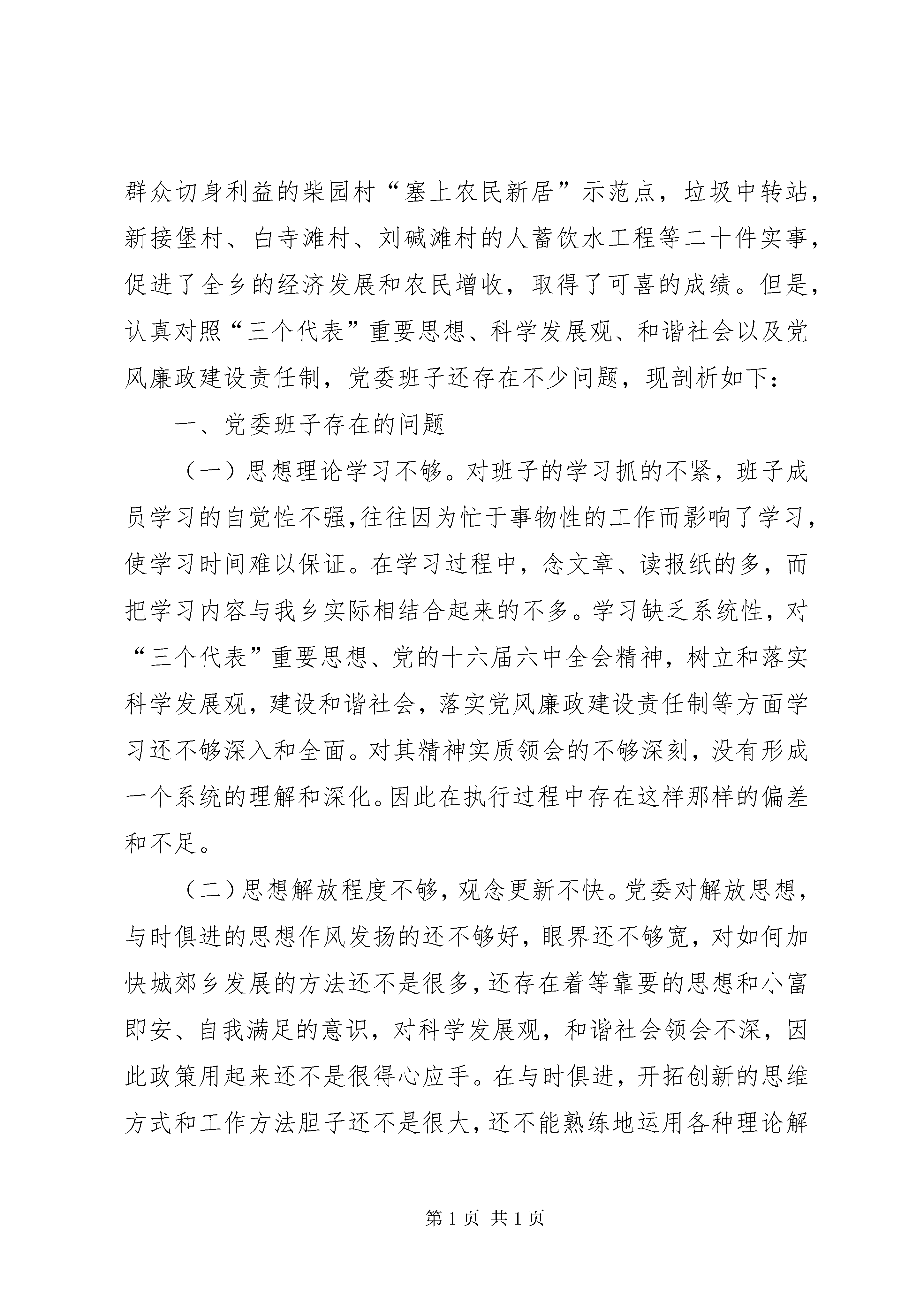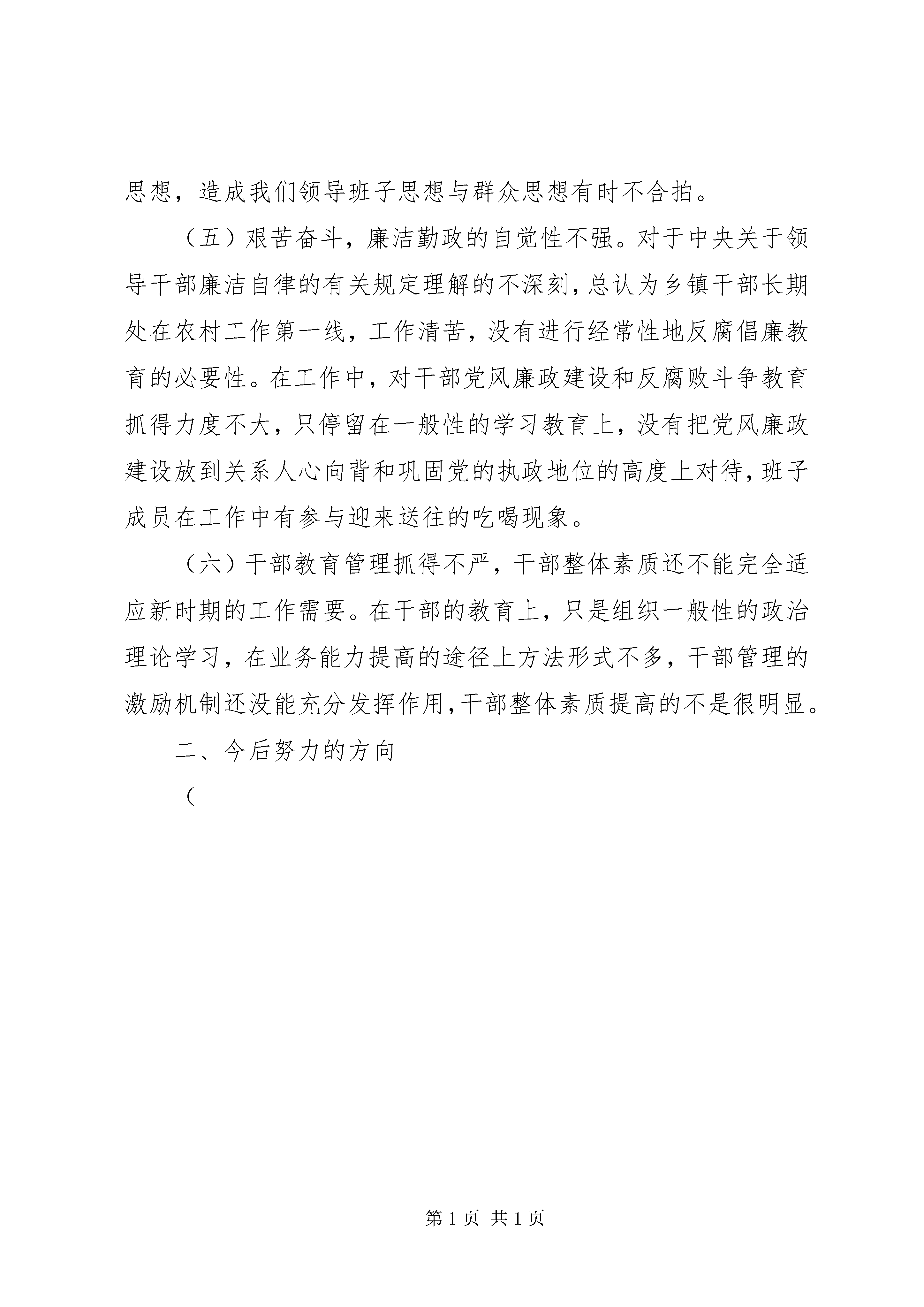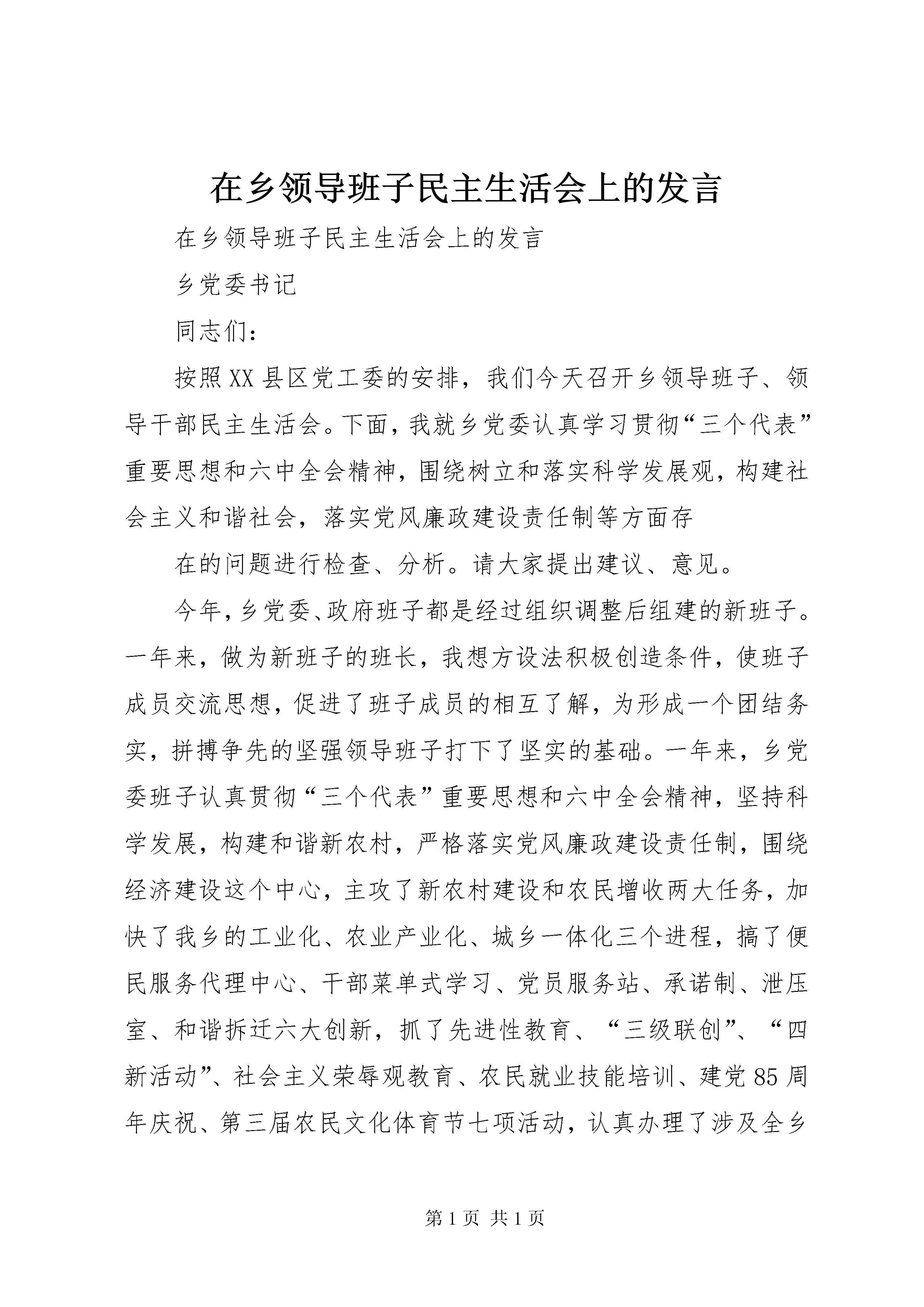 在乡领导班子民主生活会上的发言在乡领导班子民主生活会上的发言乡党委书记同志们:按照XX县区党工委的安排,我们今天召开乡领导班子、领导干部民主生活会。下面,我就乡党委认真学习贯彻“三个代表”重要思想和六中全会精神,围绕树立和落实科学发展观,构建社会主义和谐社会,落实党风廉政建设责任制等方面存在的问题进行检查、分析。请大家提出建议、意见。今年,乡党委、政府班子都是经过组织调整后组建的新班子。一年来,做为新班子的班长,我想方设法积极创造条件,使班子成员交流思想,促进了班子成员的相互了解,为形成一个团结务实,拼搏争先的坚强领导班子打下了坚实的基础。一年来,乡党委班子认真贯彻“三个代表”重要思想和六中全会精神,坚持科学发展,构建和谐新农村,严格落实党风廉政建设责任制,围绕经济建设这个中心,主攻了新农村建设和农民增收两大任务,加快了我乡的工业化、农业产业化、城乡一体化三个进程,搞了便民服务代理中心、干部菜单式学习、党员服务站、承诺制、泄压室、和谐拆迁六大创新,抓了先进性教育、“三级联创”、“四新活动”、社会主义荣辱观教育、农民就业技能培训、建党85周年庆祝、第三届农民文化体育节七项活动,认真办理了涉及全乡群众切身利益的柴园村“塞上农民新居”示范点,垃圾中转站,新接堡村、白寺滩村、刘碱滩村的人蓄饮水工程等二十件实事,促进了全乡的经济发展和农民增收,取得了可喜的成绩。但是,认真对照“三个代表”重要思想、科学发展观、和谐社会以及党风廉政建设责任制,党委班子还存在不少问题,现剖析如下:一、党委班子存在的问题(一)思想理论学习不够。对班子的学习抓的不紧,班子成员学习的自觉性不强,往往因为忙于事物性的工作而影响了学习,使学习时间难以保证。在学习过程中,念文章、读报纸的多,而把学习内容与我乡实际相结合起来的不多。学习缺乏系统性,对“三个代表”重要思想、党的十六届六中全会精神,树立和落实科学发展观,建设和谐社会,落实党风廉政建设责任制等方面学习还不够深入和全面。对其精神实质领会的不够深刻,没有形成一个系统的理解和深化。因此在执行过程中存在这样那样的偏差和不足。(二)思想解放程度不够,观念更新不快。党委对解放思想,与时俱进的思想作风发扬的还不够好,眼界还不够宽,对如何加快城郊乡发展的方法还不是很多,还存在着等靠要的思想和小富即安、自我满足的意识,对科学发展观,和谐社会领会不深,因此政策用起来还不是很得心应手。在与时俱进,开拓创新的思维方式和工作方法胆子还不是很大,还不能熟练地运用各种理论解决改革、发展中遇到的一些新情况、新问题、新矛盾。对当前经济结构的战略性调整缺乏超前性的研究和规划,在建设和谐新农村、发展农村经济、增加农民收入上步子迈得还不大,胆子还太小,在很多方面都达不到快半拍,例如柴园塞上农民新居工程的建设,由于我们动作迟缓,市上的塞上新居建设补助资金,给了别的乡镇,没有我们的,原因就是我们信息不灵,胆子过小,动作迟缓,在机遇面前缩手缩脚,畏畏懦懦。(三)对群众冷暖关心的还不够。党委对如何维护群众的切身利益,引导、发挥好群众的积极性,做得不够深入,不够细致,尤其是表现在我们制定的各项工作措施上,对群众的民主权益考虑的不是很充分,并且存在一相情愿的事情。对群众关注的问题关心的不够,解决的不是很有力。特别是在综合工作中,虽然对群众的利益考虑得很全面很细致,但有时有些问题涉及到上级部门和领导时,存在为难情绪。因此没有一一将问题解决得彻彻底底。在一些工作中,主观上想为群众多办一些实事、好事,而忽视了群众的意愿,增加了工作的难度。(四)深入群众,对群众的所思所想了解的不深不透。总感觉我们工作在最基层,工作在群众中,每天都与群众打交道,接触群众最多,了解群众最深、最透。其实我们每年真正静下心,深入到群众中做细致的调查研究工作能有几次,我看不多,即使下去了几次都是走马观花,不深入,不透彻,没能把握群众的新思想,造成我们领导班子思想与群众思想有时不合拍。(五)艰苦奋斗,廉洁勤政的自觉性不强。对于中央关于领导干部廉洁自律的有关规定理解的不深刻,总认为乡镇干部长期处在农村工作第一线,工作清苦,没有进行经常性地反腐倡廉教育的必要性。在工作中,对干部党风廉政建设和反腐败斗争教育抓得力度不大,只停留在一般性的学习教育上,没有把党风廉政建设放到关系人心向背和巩固党的执政地位的高度上对待,班子成员在工作中有参与迎来送往的吃喝现象。(六)干部教育管理抓得不严,干部整体素质还不能完全适应新时期的工作需要。在干部的教育上,只是组织一般性的政治理论学习,在业务能力提高的途径上方法形式不多,干部管理的激励机制还没能充分发挥作用,干部整体素质提高的不是很明显。二、今后努力的方向(