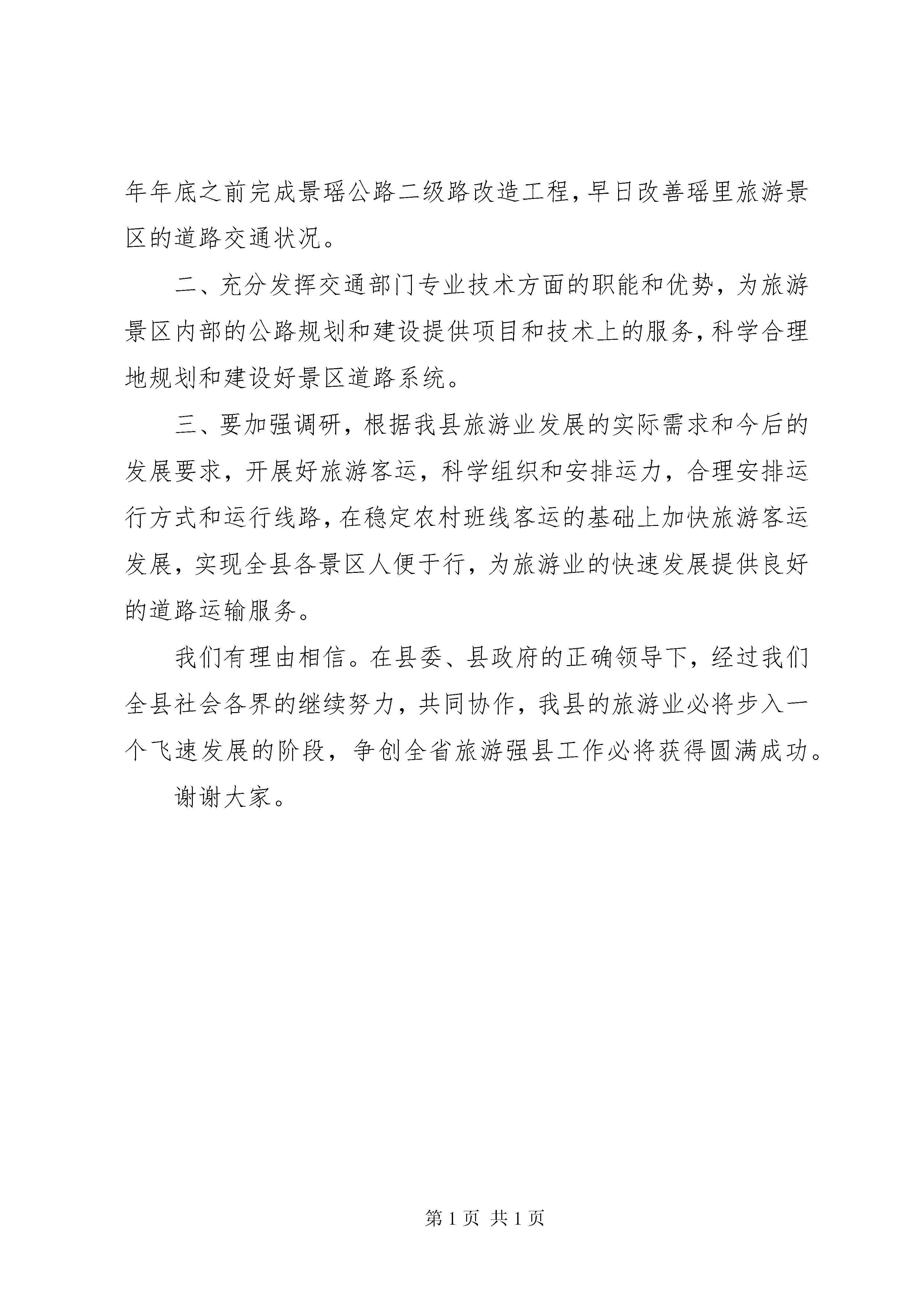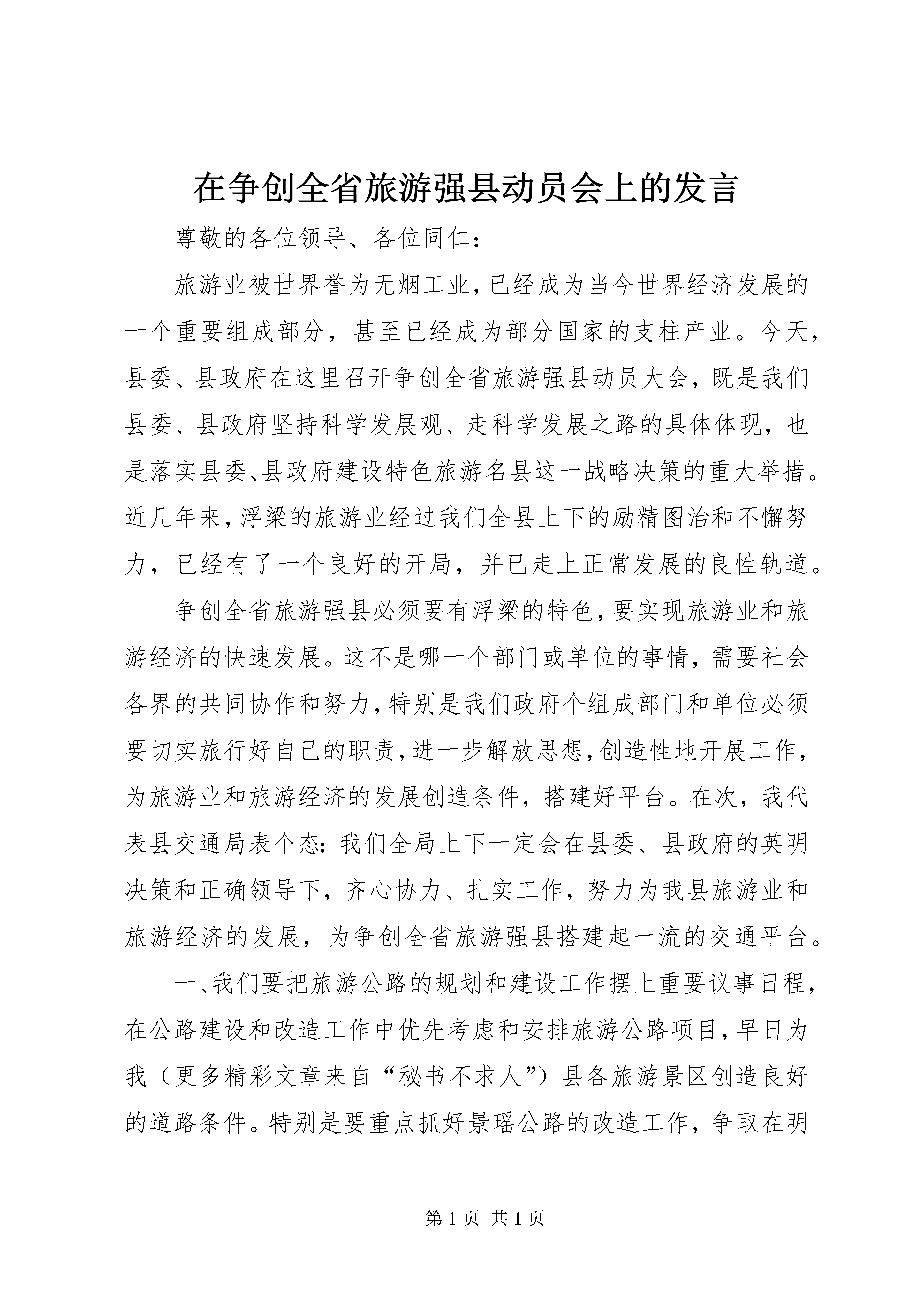 在争创全省旅游强县动员会上的发言尊敬的各位领导、各位同仁:旅游业被世界誉为无烟工业,已经成为当今世界经济发展的一个重要组成部分,甚至已经成为部分国家的支柱产业。今天,县委、县政府在这里召开争创全省旅游强县动员大会,既是我们县委、县政府坚持科学发展观、走科学发展之路的具体体现,也是落实县委、县政府建设特色旅游名县这一战略决策的重大举措。近几年来,浮梁的旅游业经过我们全县上下的励精图治和不懈努力,已经有了一个良好的开局,并已走上正常发展的良性轨道。争创全省旅游强县必须要有浮梁的特色,要实现旅游业和旅游经济的快速发展。这不是哪一个部门或单位的事情,需要社会各界的共同协作和努力,特别是我们政府个组成部门和单位必须要切实旅行好自己的职责,进一步解放思想,创造性地开展工作,为旅游业和旅游经济的发展创造条件,搭建好平台。在次,我代表县交通局表个态:我们全局上下一定会在县委、县政府的英明决策和正确领导下,齐心协力、扎实工作,努力为我县旅游业和旅游经济的发展,为争创全省旅游强县搭建起一流的交通平台。一、我们要把旅游公路的规划和建设工作摆上重要议事日程,在公路建设和改造工作中优先考虑和安排旅游公路项目,早日为我(更多精彩文章来自“秘书不求人”)县各旅游景区创造良好的道路条件。特别是要重点抓好景瑶公路的改造工作,争取在明年年底之前完成景瑶公路二级路改造工程,早日改善瑶里旅游景区的道路交通状况。二、充分发挥交通部门专业技术方面的职能和优势,为旅游景区内部的公路规划和建设提供项目和技术上的服务,科学合理地规划和建设好景区道路系统。三、要加强调研,根据我县旅游业发展的实际需求和今后的发展要求,开展好旅游客运,科学组织和安排运力,合理安排运行方式和运行线路,在稳定农村班线客运的基础上加快旅游客运发展,实现全县各景区人便于行,为旅游业的快速发展提供良好的道路运输服务。我们有理由相信。在县委、县政府的正确领导下,经过我们全县社会各界的继续努力,共同协作,我县的旅游业必将步入一个飞速发展的阶段,争创全省旅游强县工作必将获得圆满成功。谢谢大家。