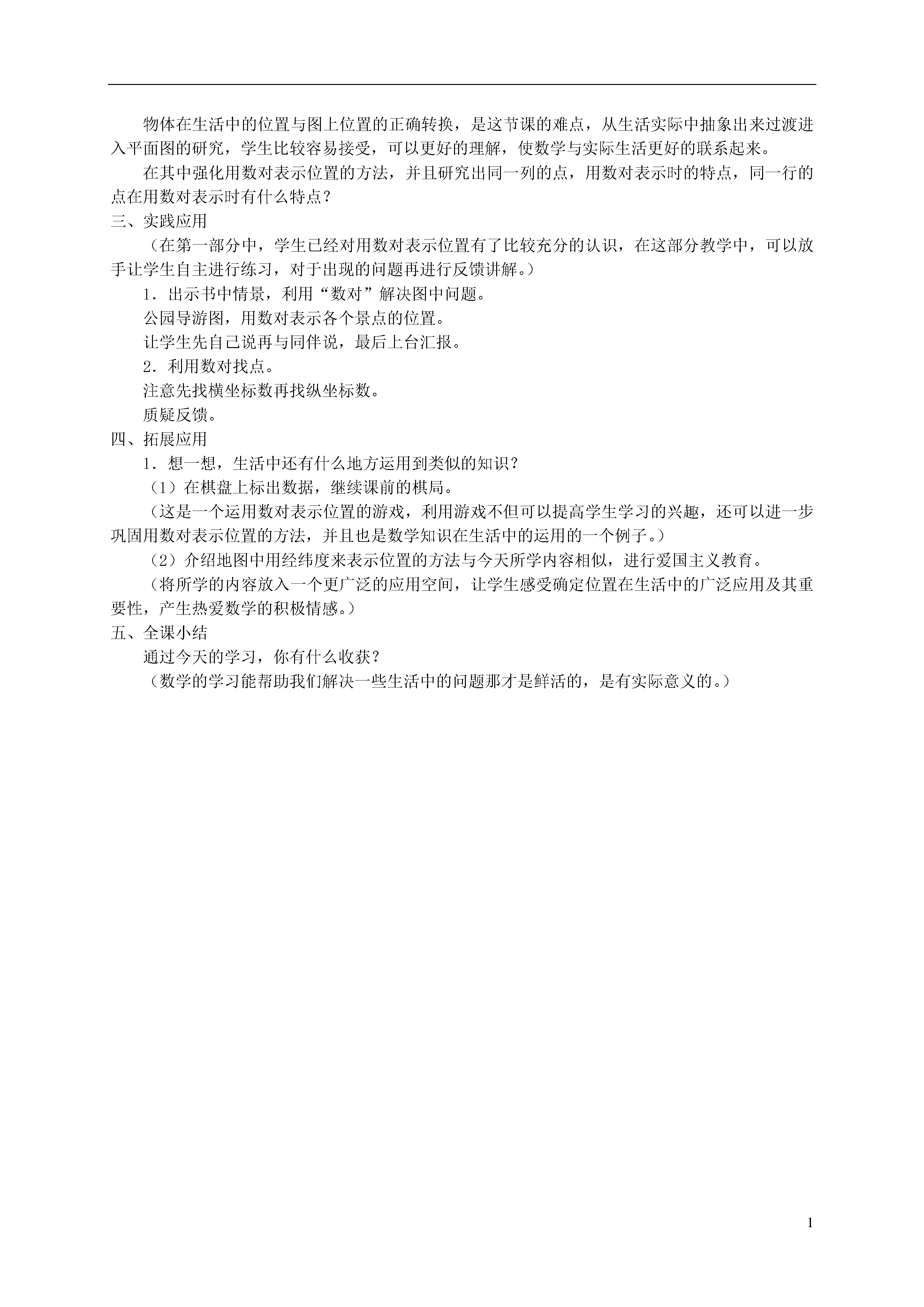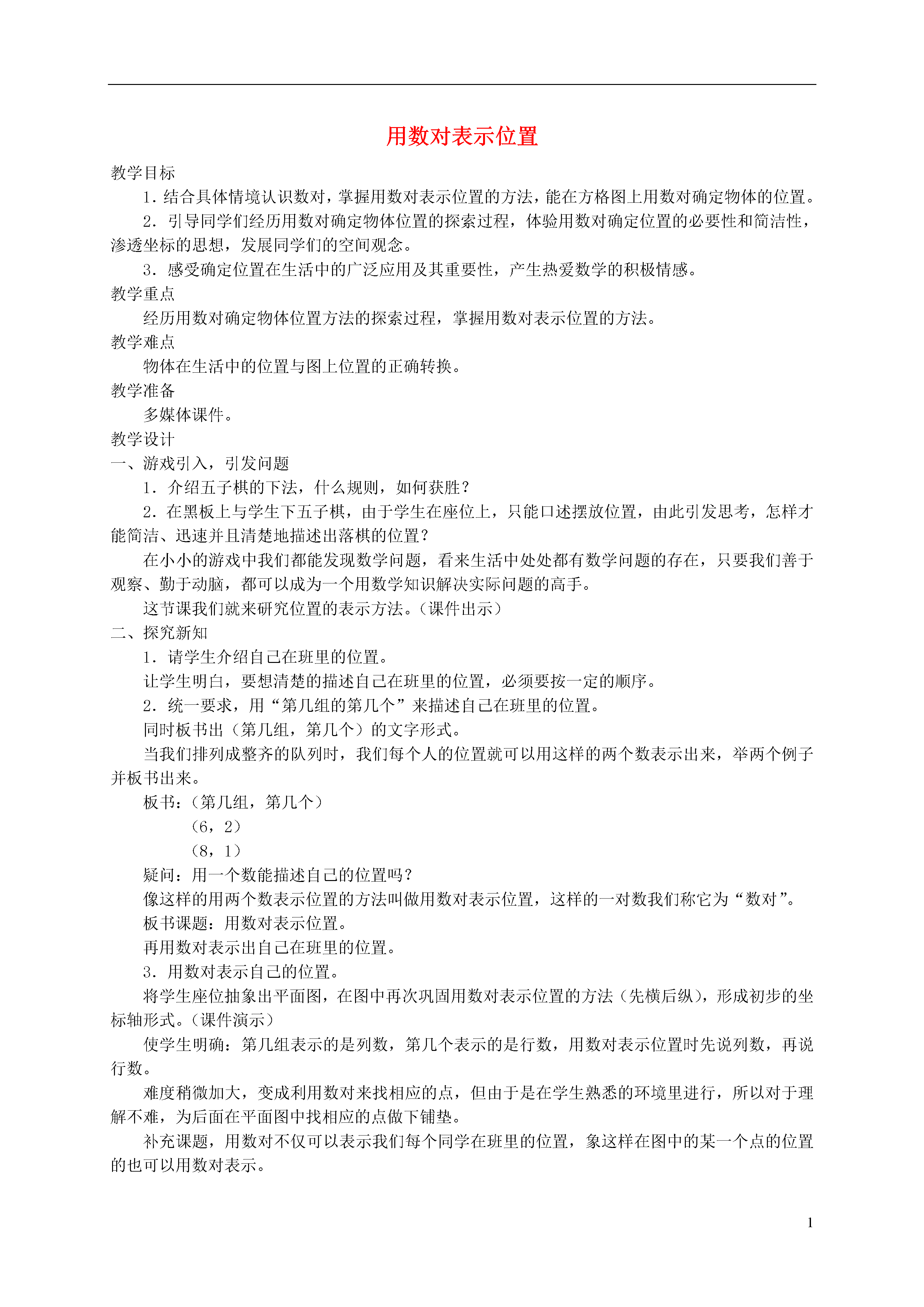 1用数对表示位置教学目标1.结合具体情境认识数对,掌握用数对表示位置的方法,能在方格图上用数对确定物体的位置。2.引导同学们经历用数对确定物体位置的探索过程,体验用数对确定位置的必要性和简洁性,渗透坐标的思想,发展同学们的空间观念。3.感受确定位置在生活中的广泛应用及其重要性,产生热爱数学的积极情感。教学重点经历用数对确定物体位置方法的探索过程,掌握用数对表示位置的方法。教学难点物体在生活中的位置与图上位置的正确转换。教学准备多媒体课件。教学设计一、游戏引入,引发问题1.介绍五子棋的下法,什么规则,如何获胜?2.在黑板上与学生下五子棋,由于学生在座位上,只能口述摆放位置,由此引发思考,怎样才能简洁、迅速并且清楚地描述出落棋的位置?在小小的游戏中我们都能发现数学问题,看来生活中处处都有数学问题的存在,只要我们善于观察、勤于动脑,都可以成为一个用数学知识解决实际问题的高手。这节课我们就来研究位置的表示方法。(课件出示)二、探究新知1.请学生介绍自己在班里的位置。让学生明白,要想清楚的描述自己在班里的位置,必须要按一定的顺序。2.统一要求,用“第几组的第几个”来描述自己在班里的位置。同时板书出(第几组,第几个)的文字形式。当我们排列成整齐的队列时,我们每个人的位置就可以用这样的两个数表示出来,举两个例子并板书出来。板书:(第几组,第几个)(6,2)(8,1)疑问:用一个数能描述自己的位置吗?像这样的用两个数表示位置的方法叫做用数对表示位置,这样的一对数我们称它为“数对”。板书课题:用数对表示位置。再用数对表示出自己在班里的位置。3.用数对表示自己的位置。将学生座位抽象出平面图,在图中再次巩固用数对表示位置的方法(先横后纵),形成初步的坐标轴形式。(课件演示)使学生明确:第几组表示的是列数,第几个表示的是行数,用数对表示位置时先说列数,再说行数。难度稍微加大,变成利用数对来找相应的点,但由于是在学生熟悉的环境里进行,所以对于理解不难,为后面在平面图中找相应的点做下铺垫。补充课题,用数对不仅可以表示我们每个同学在班里的位置,象这样在图中的某一个点的位置的也可以用数对表示。物体在生活中的位置与图上位置的正确转换,是这节课的难点,从生活实际中抽象出来过渡进入平面图的研究,学生比较容易接受,可以更好的理解,使数学与实际生活更好的联系起来。在其中强化用数对表示位置的方法,并且研究出同一列的点,用数对表示时的特点,同一行的点在用数对表示时有什么特点?三、实践应用(在第一部分中,学生已经对用数对表示位置有了比较充分的认识,在这部分教学中,可以放手让学生自主进行练习,对于出现的问题再进行反馈讲解。)1.出示书中情景,利用“数对”解决图中问题。公园导游图,用数对表示各个景点的位置。让学生先自己说再与同伴说,最后上台汇报。2.利用数对找点。注意先找横坐标数再找纵坐标数。质疑反馈。四、拓展应用1.想一想,生活中还有什么地方运用到类似的知识?(1)在棋盘上标出数据,继续课前的棋局。(这是一个运用数对表示位置的游戏,利用游戏不但可以提高学生学习的兴趣,还可以进一步巩固用数对表示位置的方法,并且也是数学知识在生活中的运用的一个例子。)(2)介绍地图中用经纬度来表示位置的方法与今天所学内容相似,进行爱国主义教育。(将所学的内容放入一个更广泛的应用空间,让学生感受确定位置在生活中的广泛应用及其重要性,产生热爱数学的积极情感。)五、全课小结通过今天的学习,你有什么收获?(数学的学习能帮助我们解决一些生活中的问题那才是鲜活的,是有实际意义的。)