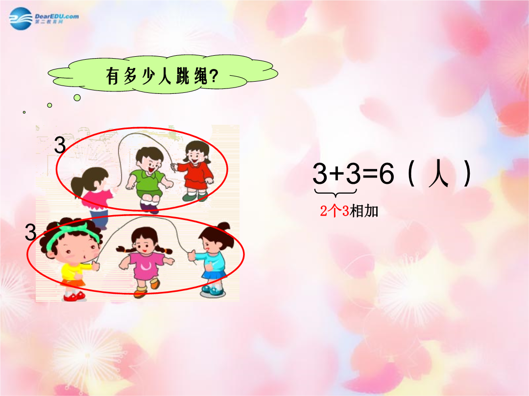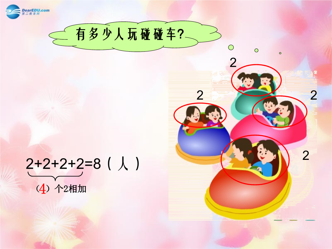 认识乘法(一)3+3=62+2+2+2=84+4+4+4+4=20求相同加数的和,可以用加法计算,也可以用乘法计算。列乘法算式:乘号“×”,是英国著名数学家奥特雷德在在1631年最早使用的。他认为乘法是加法的一种特殊形式,于是他就把“+”斜过来写变成了一个新的运算符号——“×”。列乘法算式:3+3=6乘法算式:或()个4()个()加法算式:乘法算式:或()个()加法算式:乘法算式:或加法算式:乘法算式:×=或×=读作:读作:我会读7+7+7+7+71+2+4=74+4=85+5+5=153+3+3=92+2+2+2=84+2+3=9