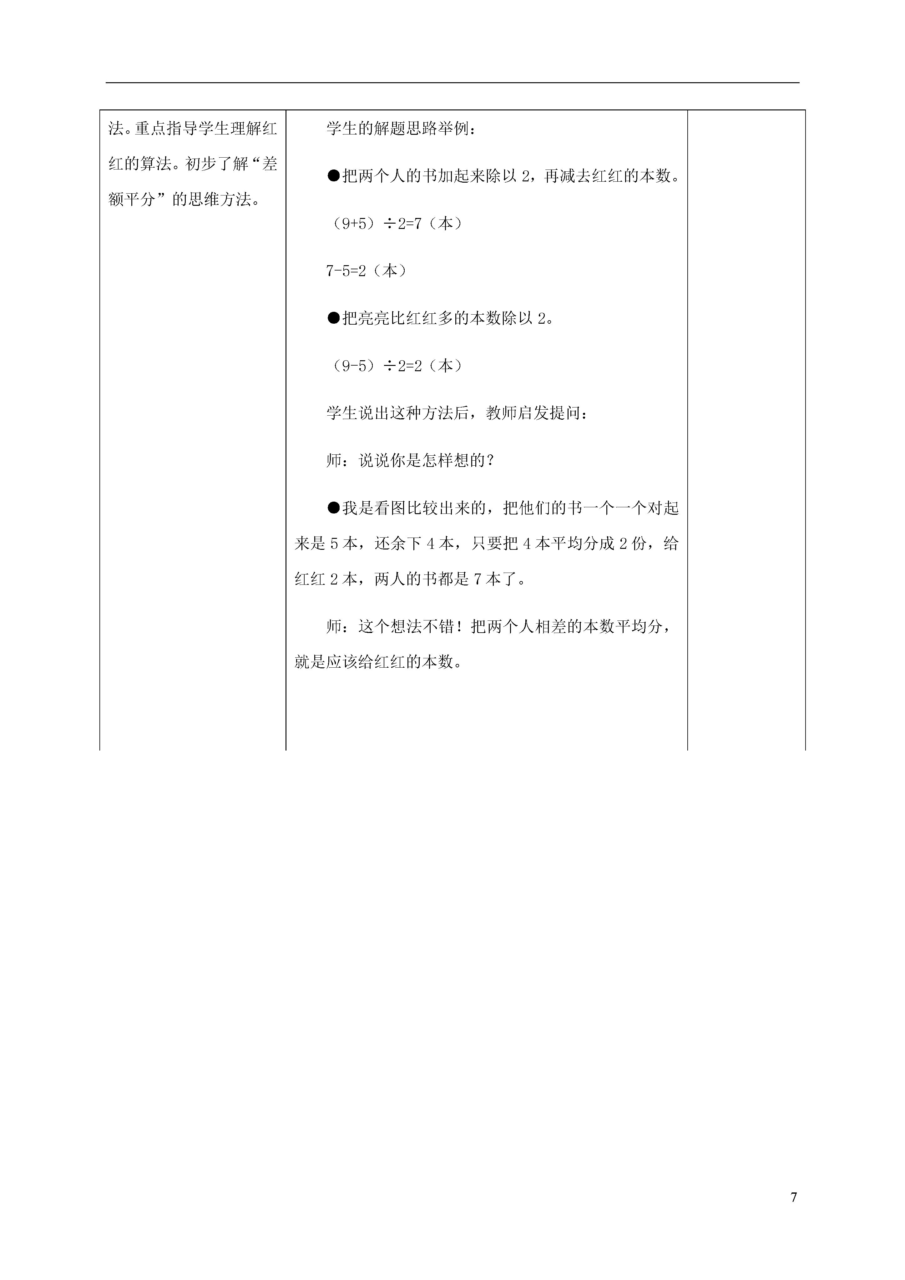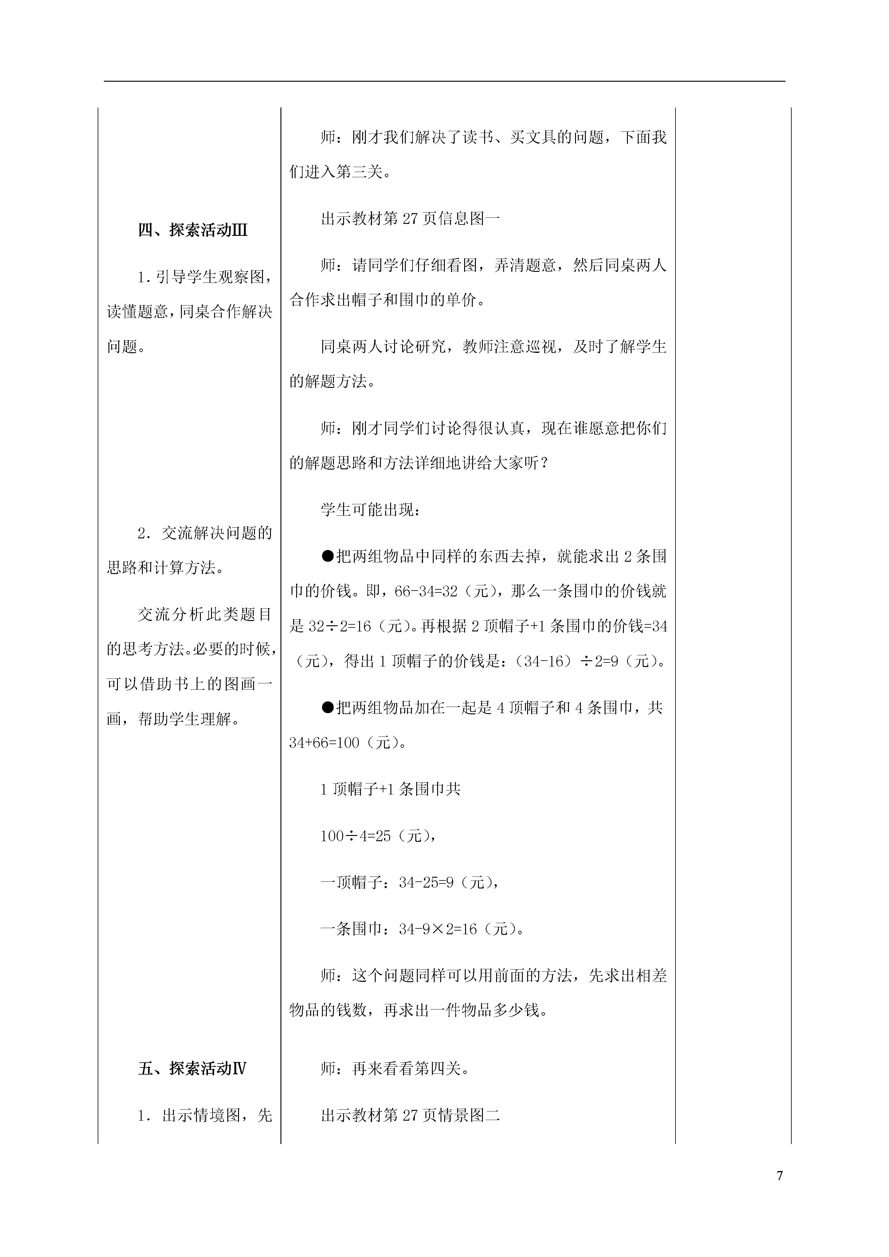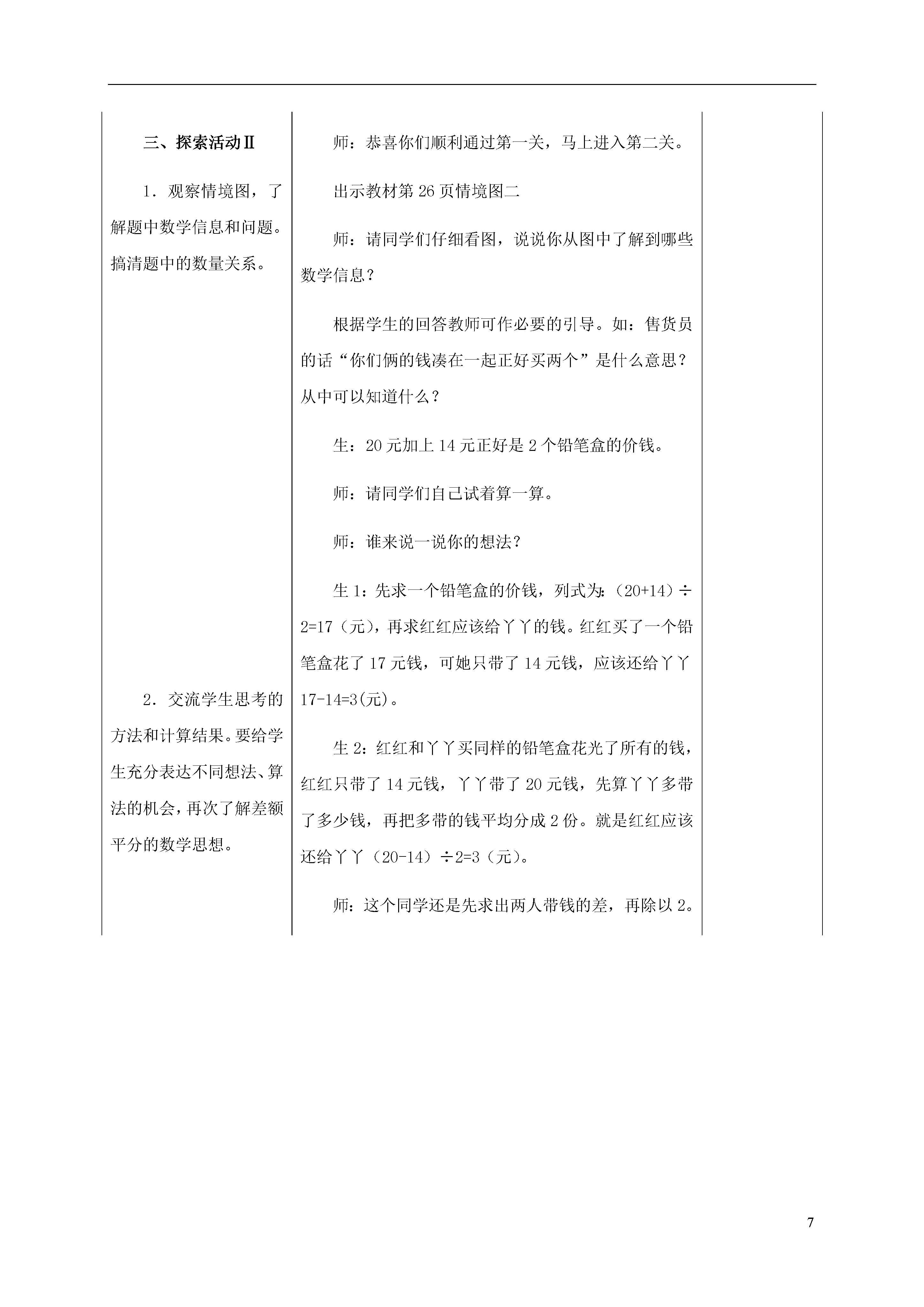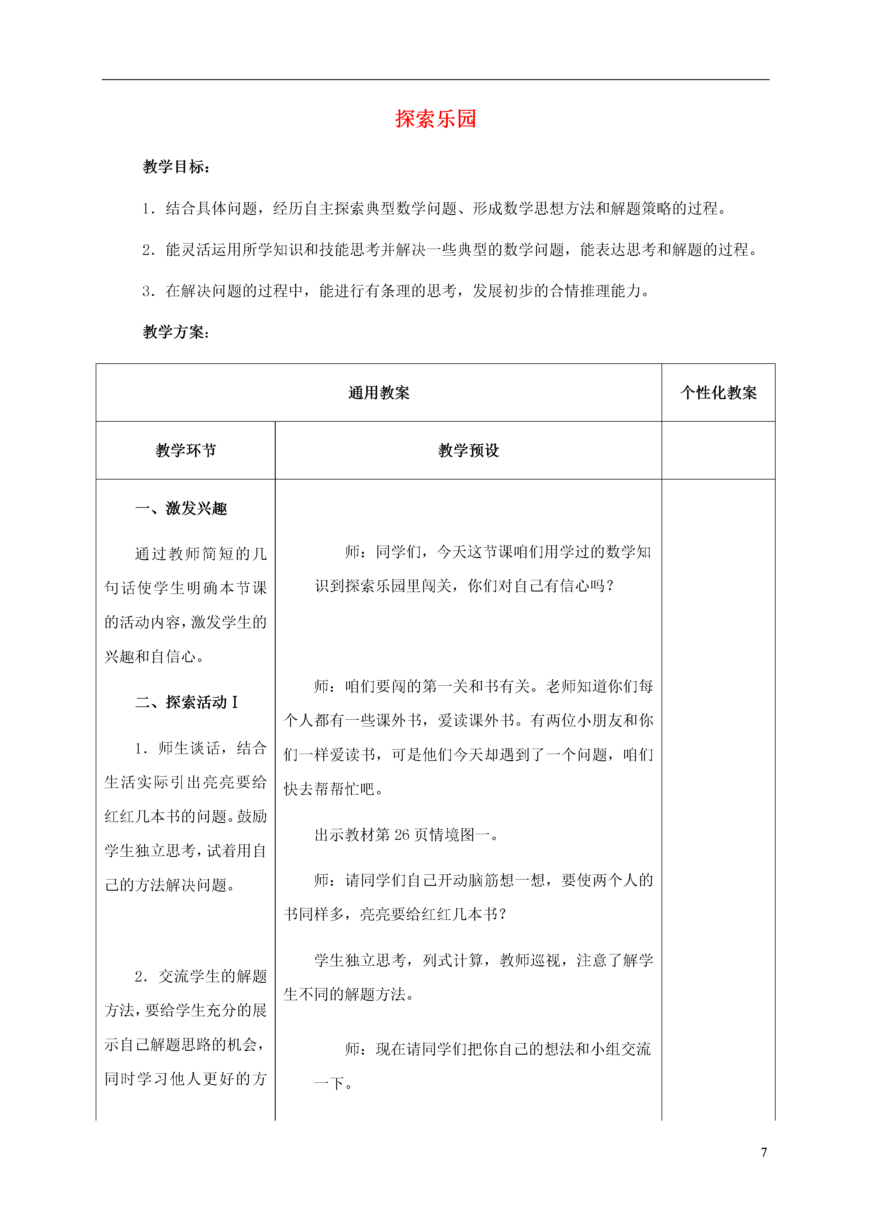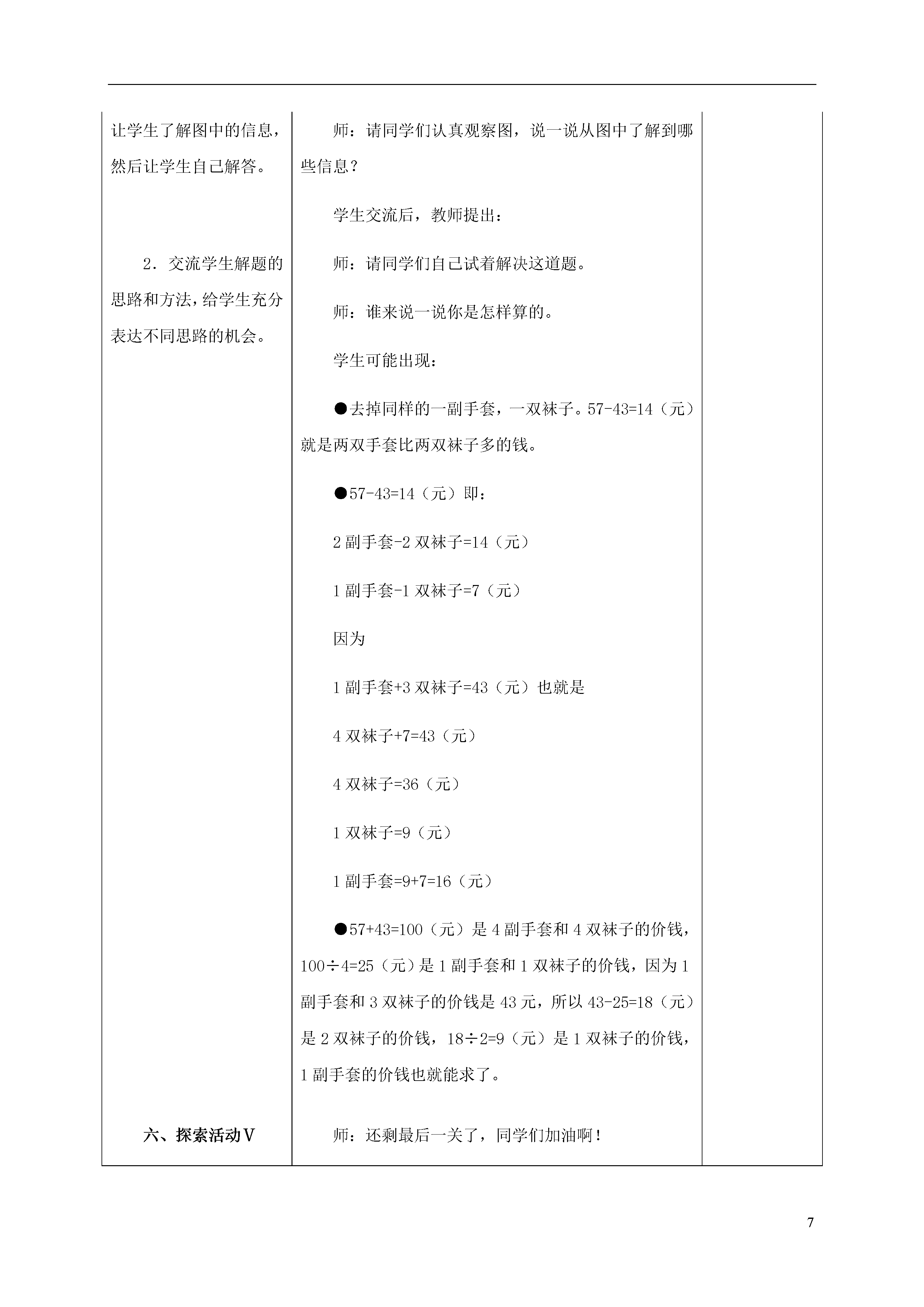 7探索乐园教学目标:1.结合具体问题,经历自主探索典型数学问题、形成数学思想方法和解题策略的过程。2.能灵活运用所学知识和技能思考并解决一些典型的数学问题,能表达思考和解题的过程。3.在解决问题的过程中,能进行有条理的思考,发展初步的合情推理能力。教学方案:通用教案个性化教案教学环节教学预设一、激发兴趣通过教师简短的几句话使学生明确本节课的活动内容,激发学生的兴趣和自信心。二、探索活动Ⅰ1.师生谈话,结合生活实际引出亮亮要给红红几本书的问题。鼓励学生独立思考,试着用自己的方法解决问题。2.交流学生的解题方法,要给学生充分的展示自己解题思路的机会,同时学习他人更好的方法。重点指导学生理解红红的算法。初步了解“差额平分”的思维方法。师:同学们,今天这节课咱们用学过的数学知识到探索乐园里闯关,你们对自己有信心吗?师:咱们要闯的第一关和书有关。老师知道你们每个人都有一些课外书,爱读课外书。有两位小朋友和你们一样爱读书,可是他们今天却遇到了一个问题,咱们快去帮帮忙吧。出示教材情境图一。师:请同学们自己开动脑筋想一想,要使两个人的书同样多,亮亮要给红红几本书?学生独立思考,列式计算,教师巡视,注意了解学生不同的解题方法。师:现在请同学们把你自己的想法和小组交流一下。学生的解题思路举例:●把两个人的书加起来除以2,再减去红红的本数。(9+5)÷2=7(本)7-5=2(本)●把亮亮比红红多的本数除以2。(9-5)÷2=2(本)学生说出这种方法后,教师启发提问:师:说说你是怎样想的?●我是看图比较出来的,把他们的书一个一个对起来是5本,还余下4本,只要把4本平均分成2份,给红红2本,两人的书都是7本了。师:这个想法不错!把两个人相差的本数平均分,就是应该给红红的本数。三、探索活动Ⅱ1.观察情境图,了解题中数学信息和问题。搞清题中的数量关系。2.交流学生思考的方法和计算结果。要给学生充分表达不同想法、算法的机会,再次了解差额平分的数学思想。师:恭喜你们顺利通过第一关,马上进入第二关。出示教材情境图二师:请同学们仔细看图,说说你从图中了解到哪些数学信息?根据学生的回答教师可作必要的引导。如:售货员的话“你们俩的钱凑在一起正好买两个”是什么意思?从中可以知道什么?生:20元加上14元正好是2个铅笔盒的价钱。师:请同学们自己试着算一算。师:谁来说一说你的想法?生1:先求一个铅笔盒的价钱,列式为:(20+14)÷2=17(元),再求红红应该给丫丫的钱。红红买了一个铅笔盒花了17元钱,可她只带了14元钱,应该还给丫丫17-14=3(元)。生2:红红和丫丫买同样的铅笔盒花光了所有的钱,红红只带了14元钱,丫丫带了20元钱,先算丫丫多带了多少钱,再把多带的钱平均分成2份。就是红红应该还给丫丫(20-14)÷2=3(元)。师:这个同学还是先求出两人带钱的差,再除以2。四、探索活动Ⅲ1.引导学生观察图,读懂题意,同桌合作解决问题。2.交流解决问题的思路和计算方法。交流分析此类题目的思考方法。必要的时候,可以借助书上的图画一画,帮助学生理解。师:刚才我们解决了读书、买文具的问题,下面我们进入第三关。出示教材信息图一师:请同学们仔细看图,弄清题意,然后同桌两人合作求出帽子和围巾的单价。同桌两人讨论研究,教师注意巡视,及时了解学生的解题方法。师:刚才同学们讨论得很认真,现在谁愿意把你们的解题思路和方法详细地讲给大家听?学生可能出现:●把两组物品中同样的东西去掉,就能求出2条围巾的价钱。即,66-34=32(元),那么一条围巾的价钱就是32÷2=16(元)。再根据2顶帽子+1条围巾的价钱=34(元),得出1顶帽子的价钱是:(34-16)÷2=9(元)。●把两组物品加在一起是4顶帽子和4条围巾,共34+66=100(元)。1顶帽子+1条围巾共100÷4=25(元),一顶帽子:34-25=9(元),一条围巾:34-9×2=16(元)。师:这个问题同样可以用前面的方法,先求出相差物品的钱数,再求出一件物品多少钱。五、探索活动Ⅳ1.出示情境图,先让学生了解图中的信息,然后让学生自己解答。2.交流学生解题的思路和方法,给学生充分表达不同思路的机会。师:再来看看第四关。出示教材情景图二师:请同学们认真观察图,说一说从图中了解到哪些信息?学生交流后,教师提出:师:请同学们自己试着解决这道题。师:谁来说一说你是怎样算的。学生可能出现:●去掉同样的一副手套,一双袜子。57-43=14(元)就是两双手套比两双袜子多的钱。●57-43=14(
