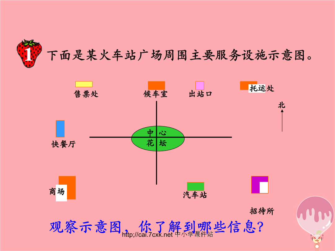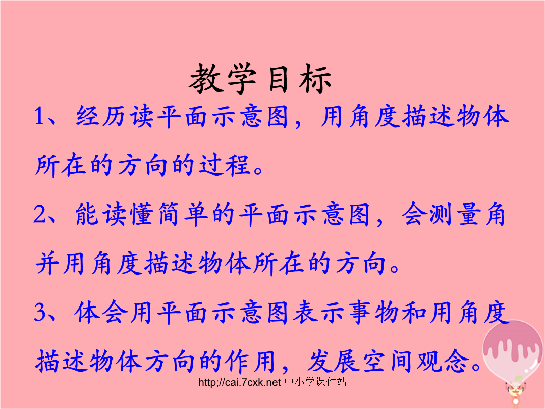 用角度描述物体所在的方向1、经历读平面示意图,用角度描述物体所在的方向的过程。2、能读懂简单的平面示意图,会测量角并用角度描述物体所在的方向。3、体会用平面示意图表示事物和用角度描述物体方向的作用,发展空间观念。下面是某火车站广场周围主要服务设施示意图。练一练2.观察某儿童公园主要场馆位置示意图。(1)学校在小明家北偏______的方向上。(3)邮局在小明家___偏______的方向上。4.(1)邮局和商场分别在医院的什么方向?(2)邮局和医院分别在商场的什么方向?