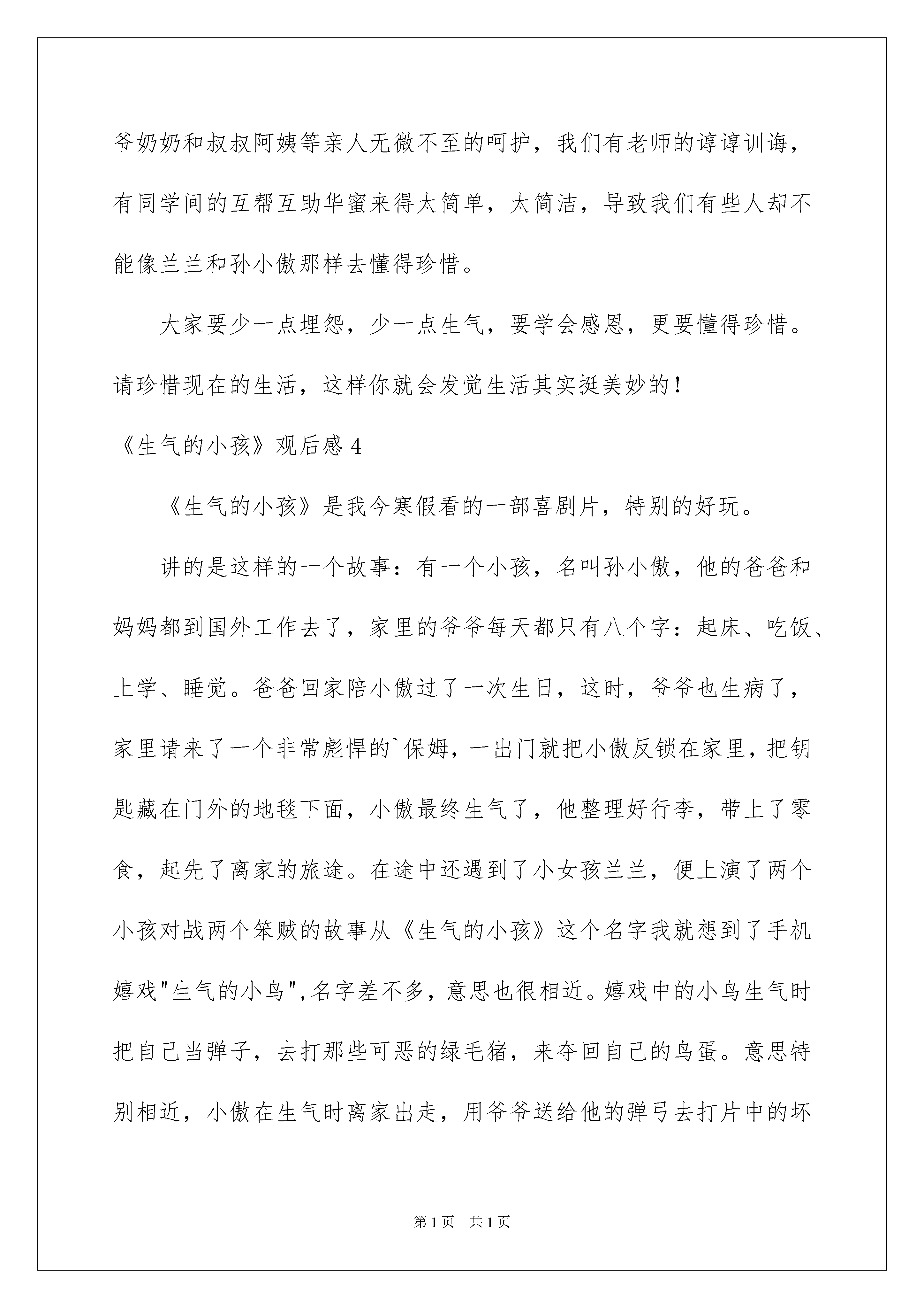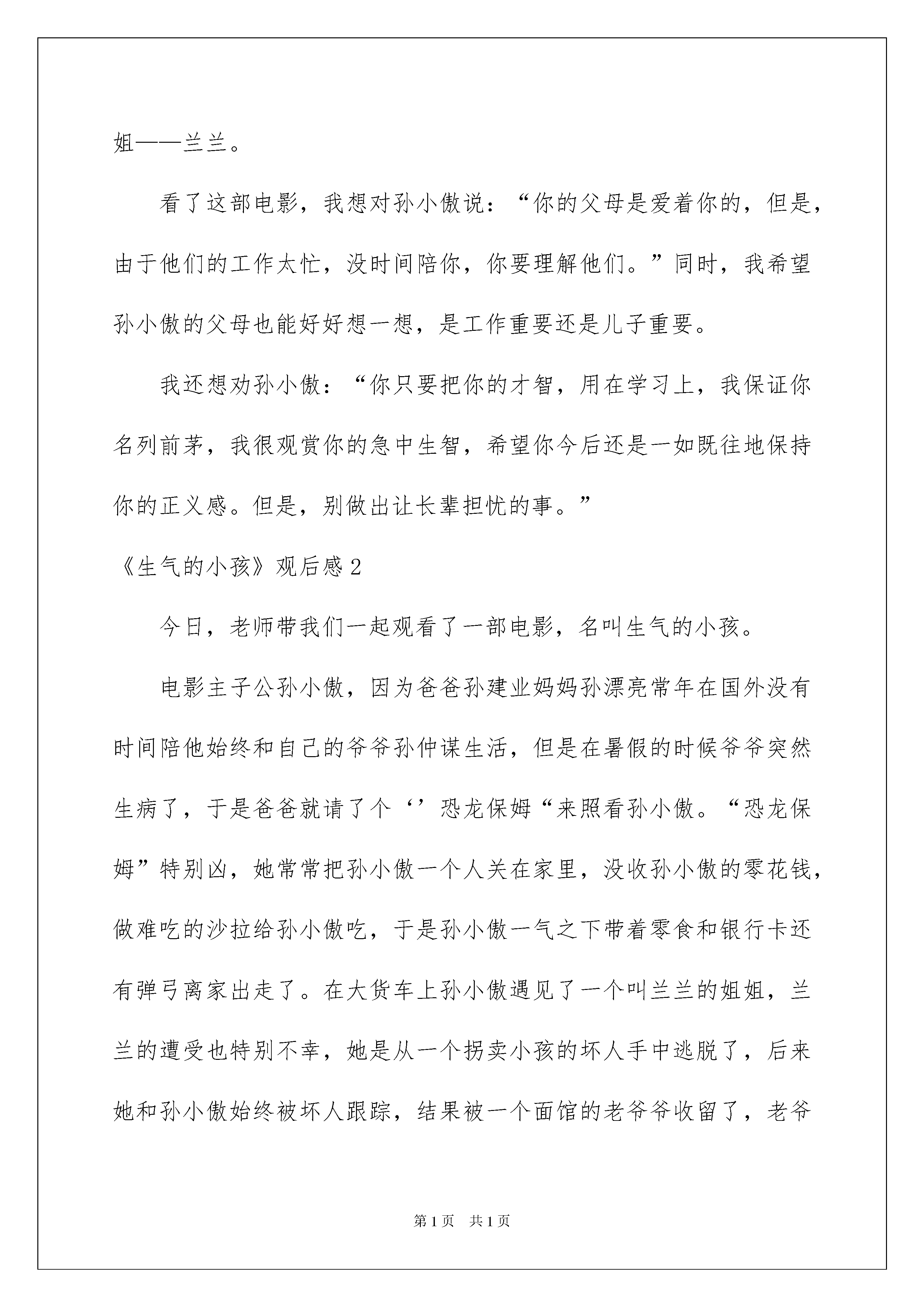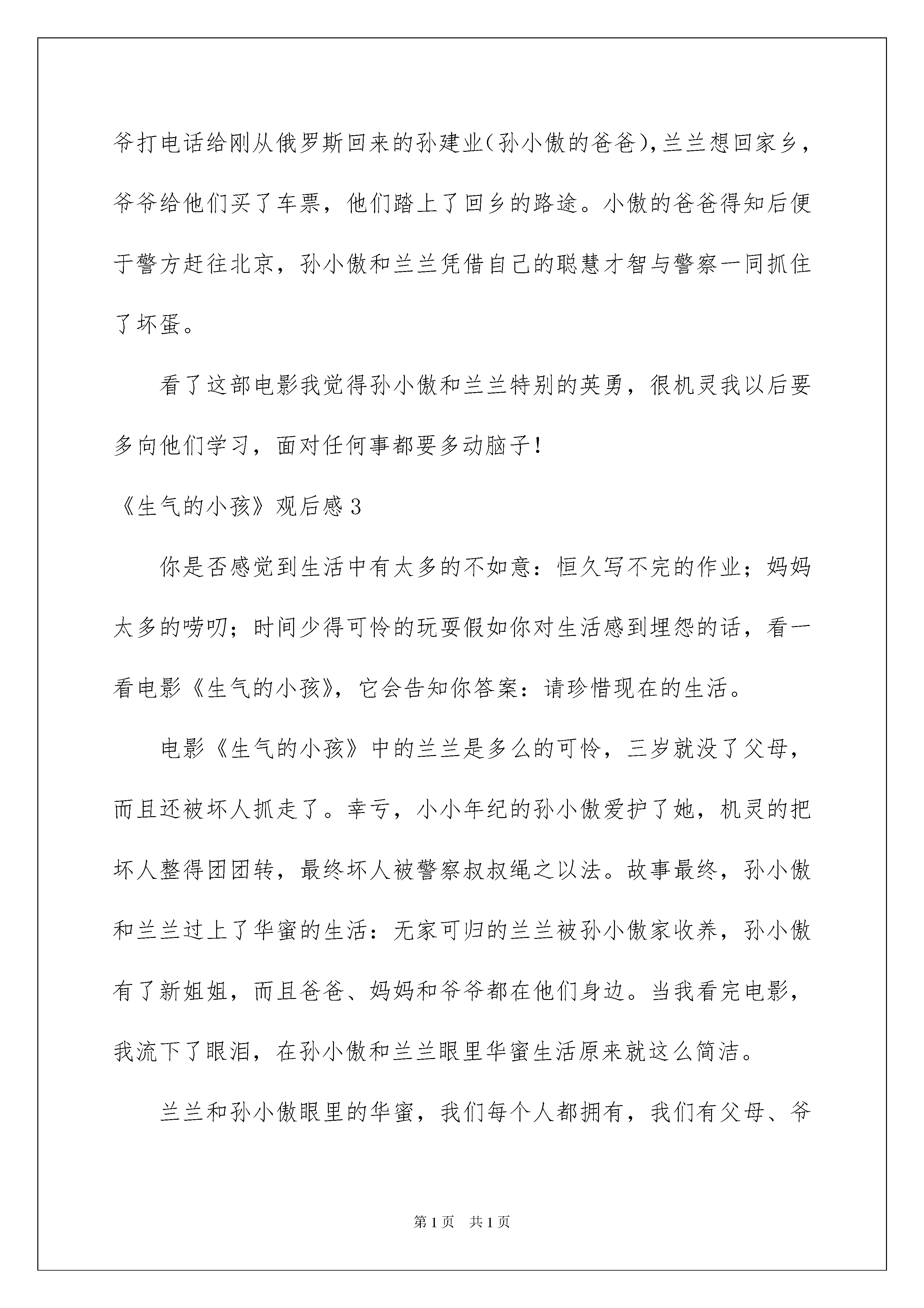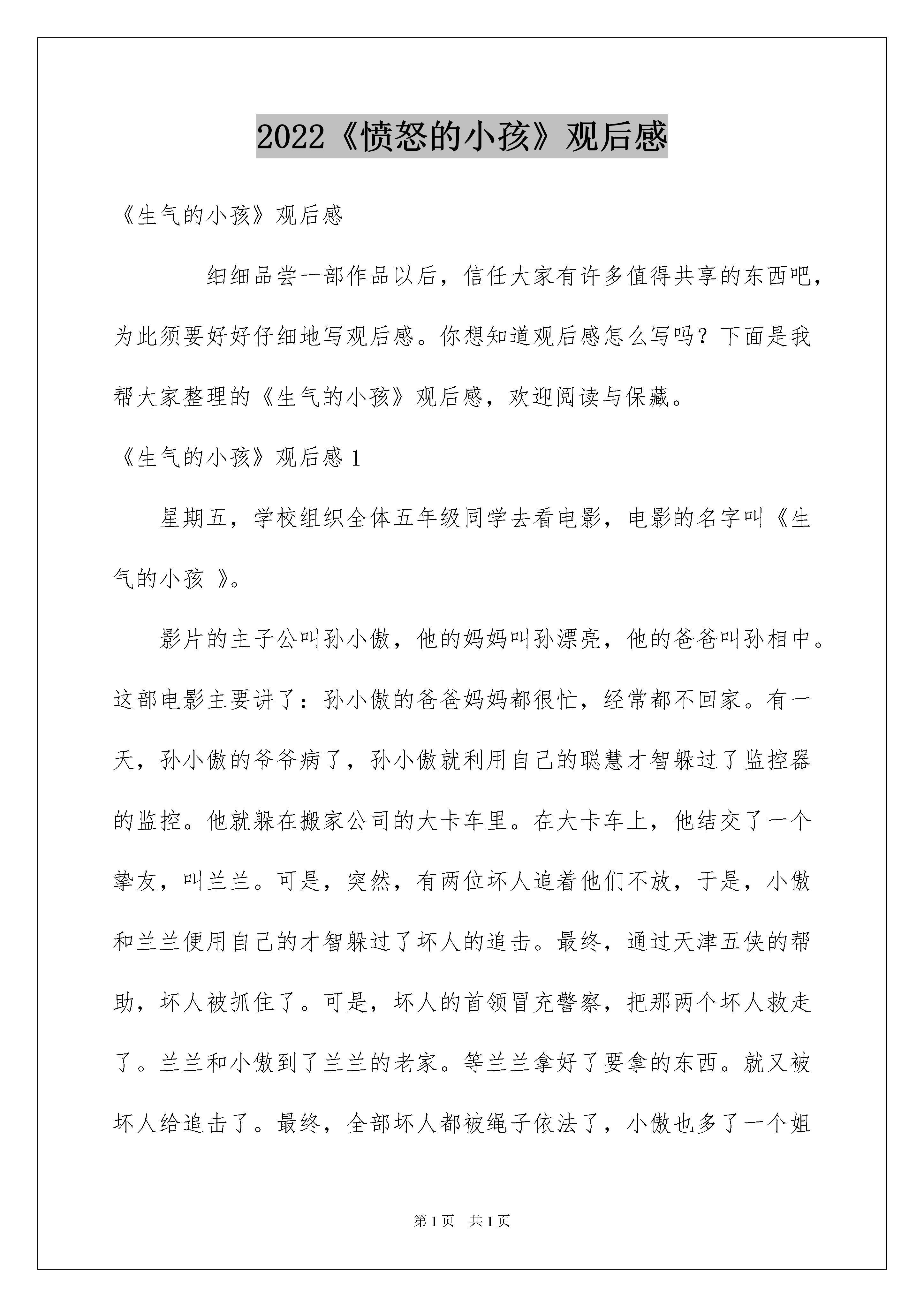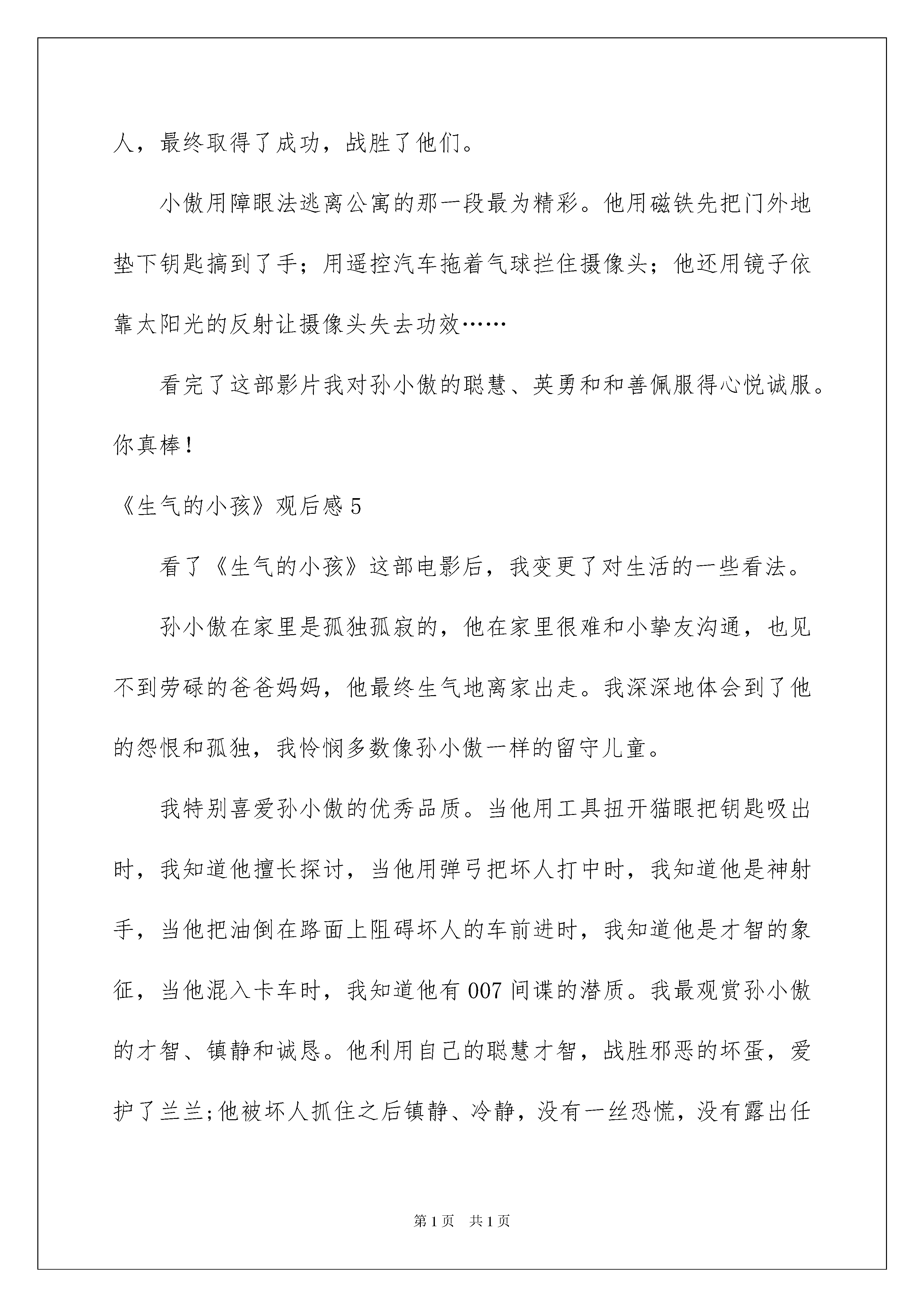 2022《愤怒的小孩》观后感《生气的小孩》观后感细细品尝一部作品以后,信任大家有许多值得共享的东西吧,为此须要好好仔细地写观后感。你想知道观后感怎么写吗?下面是我帮大家整理的《生气的小孩》观后感,欢迎阅读与保藏。《生气的小孩》观后感1星期五,学校组织全体五年级同学去看电影,电影的名字叫《生气的小孩》。影片的主子公叫孙小傲,他的妈妈叫孙漂亮,他的爸爸叫孙相中。这部电影主要讲了:孙小傲的爸爸妈妈都很忙,经常都不回家。有一天,孙小傲的爷爷病了,孙小傲就利用自己的聪慧才智躲过了监控器的监控。他就躲在搬家公司的大卡车里。在大卡车上,他结交了一个挚友,叫兰兰。可是,突然,有两位坏人追着他们不放,于是,小傲和兰兰便用自己的才智躲过了坏人的追击。最终,通过天津五侠的帮助,坏人被抓住了。可是,坏人的首领冒充警察,把那两个坏人救走了。兰兰和小傲到了兰兰的老家。等兰兰拿好了要拿的东西。就又被坏人给追击了。最终,全部坏人都被绳子依法了,小傲也多了一个姐姐——兰兰。看了这部电影,我想对孙小傲说:“你的父母是爱着你的,但是,由于他们的工作太忙,没时间陪你,你要理解他们。”同时,我希望孙小傲的父母也能好好想一想,是工作重要还是儿子重要。我还想劝孙小傲:“你只要把你的才智,用在学习上,我保证你名列前茅,我很观赏你的急中生智,希望你今后还是一如既往地保持你的正义感。但是,别做出让长辈担忧的事。”《生气的小孩》观后感2今日,老师带我们一起观看了一部电影,名叫生气的小孩。电影主子公孙小傲,因为爸爸孙建业妈妈孙漂亮常年在国外没有时间陪他始终和自己的爷爷孙仲谋生活,但是在暑假的时候爷爷突然生病了,于是爸爸就请了个‘’恐龙保姆“来照看孙小傲。“恐龙保姆”特别凶,她常常把孙小傲一个人关在家里,没收孙小傲的零花钱,做难吃的沙拉给孙小傲吃,于是孙小傲一气之下带着零食和银行卡还有弹弓离家出走了。在大货车上孙小傲遇见了一个叫兰兰的姐姐,兰兰的遭受也特别不幸,她是从一个拐卖小孩的坏人手中逃脱了,后来她和孙小傲始终被坏人跟踪,结果被一个面馆的老爷爷收留了,老爷爷打电话给刚从俄罗斯回来的孙建业(孙小傲的爸爸),兰兰想回家乡,爷爷给他们买了车票,他们踏上了回乡的路途。小傲的爸爸得知后便于警方赶往北京,孙小傲和兰兰凭借自己的聪慧才智与警察一同抓住了坏蛋。看了这部电影我觉得孙小傲和兰兰特别的英勇,很机灵我以后要多向他们学习,面对任何事都要多动脑子!《生气的小孩》观后感3你是否感觉到生活中有太多的不如意:恒久写不完的作业;妈妈太多的唠叨;时间少得可怜的玩耍假如你对生活感到埋怨的话,看一看电影《生气的小孩》,它会告知你答案:请珍惜现在的生活。电影《生气的小孩》中的兰兰是多么的可怜,三岁就没了父母,而且还被坏人抓走了。幸亏,小小年纪的孙小傲爱护了她,机灵的把坏人整得团团转,最终坏人被警察叔叔绳之以法。故事最终,孙小傲和兰兰过上了华蜜的生活:无家可归的兰兰被孙小傲家收养,孙小傲有了新姐姐,而且爸爸、妈妈和爷爷都在他们身边。当我看完电影,我流下了眼泪,在孙小傲和兰兰眼里华蜜生活原来就这么简洁。兰兰和孙小傲眼里的华蜜,我们每个人都拥有,我们有父母、爷爷奶奶和叔叔阿姨等亲人无微不至的呵护,我们有老师的谆谆训诲,有同学间的互帮互助华蜜来得太简单,太简洁,导致我们有些人却不能像兰兰和孙小傲那样去懂得珍惜。大家要少一点埋怨,少一点生气,要学会感恩,更要懂得珍惜。请珍惜现在的生活,这样你就会发觉生活其实挺美妙的!《生气的小孩》观后感4《生气的小孩》是我今寒假看的一部喜剧片,特别的好玩。讲的是这样的一个故事:有一个小孩,名叫孙小傲,他的爸爸和妈妈都到国外工作去了,家里的爷爷每天都只有八个字:起床、吃饭、上学、睡觉。爸爸回家陪小傲过了一次生日,这时,爷爷也生病了,家里请来了一个非常彪悍的`保姆,一出门就把小傲反锁在家里,把钥匙藏在门外的地毯下面,小傲最终生气了,他整理好行李,带上了零食,起先了离家的旅途。在途中还遇到了小女孩兰兰,便上演了两个小孩对战两个笨贼的故事从《生气的小孩》这个名字我就想到了手机嬉戏"生气的小鸟",名字差不多,意思也很相近。嬉戏中的小鸟生气时把自己当弹子,去打那些可恶的绿毛猪,来夺回自己的鸟蛋。意思特别相近,小傲在生气时离家出走,用爷爷送给他的弹弓去打片中的坏人,最终取得了成功,战胜了他们。小傲用障眼法逃离公寓的那一段最为精彩。他用磁铁先把门外地垫下钥匙搞到了手;用遥控汽车拖着气球拦住摄像头;他还用镜子依靠太阳光的反射让摄像头失去功效……看完了这部影片我对孙小傲的聪慧、英勇和和善佩服得心悦诚服。你真棒!《生气的小孩》观后感5看了《生气的小孩