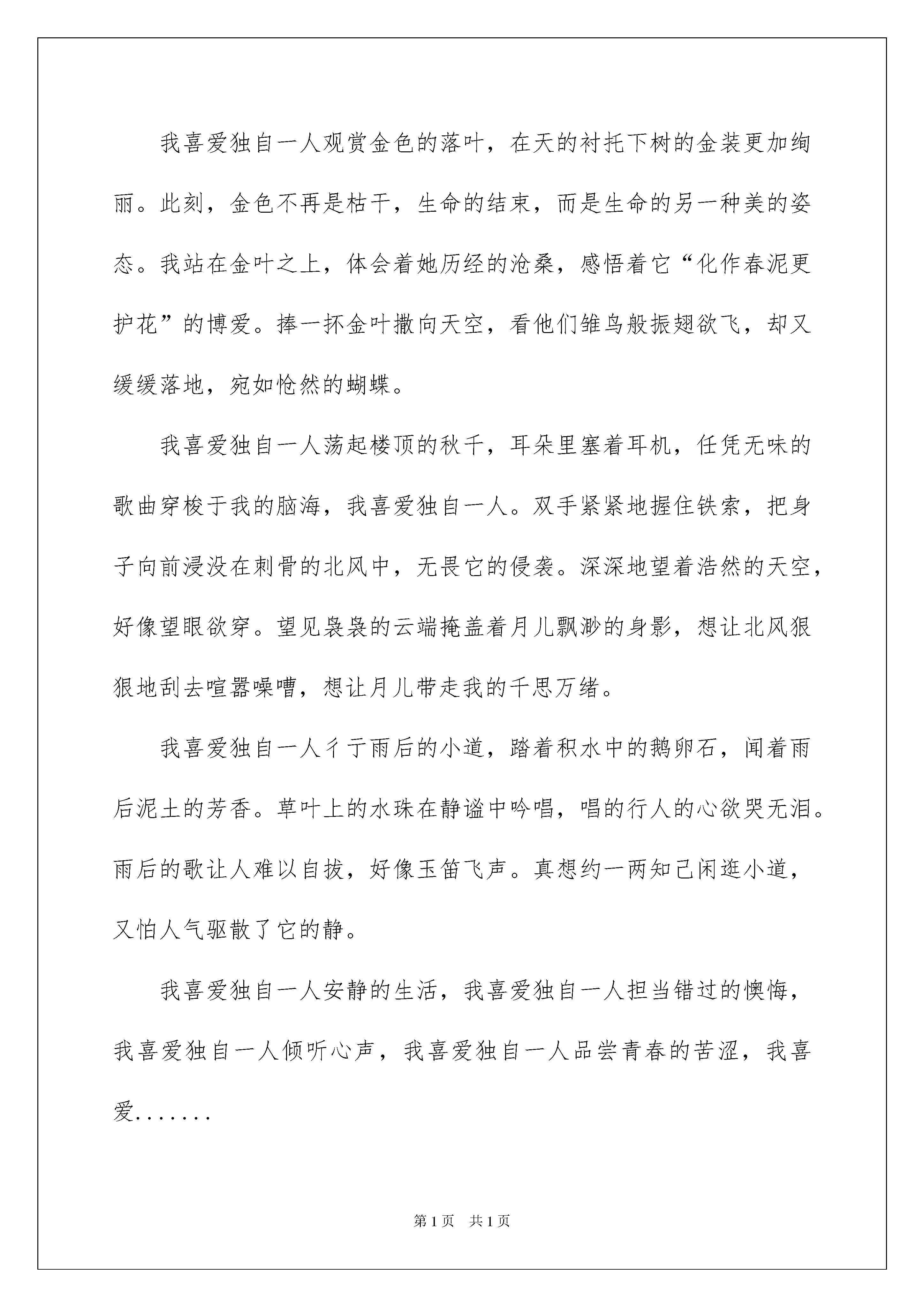 2022《我》初中作文《我》初中作文7篇在平常的学习、工作或生活中,大家都接触过作文吧,作文是人们把记忆中所存储的有关学问、阅历和思想用书面形式表达出来的记叙方式。你知道作文怎样才能写的好吗?下面是我细心整理的《我》初中作文8篇,仅供参考,大家一起来看看吧。《我》初中作文篇1从小到大,我是在“蜜罐”里长大的,家中事无论大小,我从来不干。今日,我突然心血来潮,想把我老家院子里的叶子和灰尘打扫干净,给日夜辛苦的姥姥一个惊喜。心动不如行动,说干就干,我立刻拿来了扫把和簸箕,打算大显身手,显示我扫地的“超高技术”。先从院子里的角落起先扫吧!谁知看起来简洁的工作,做起来却这么难,我使出浑身力气也只能扫出一小堆,更多的灰尘躺在墙角里不愿出来。这可怎么办呢?于是,我就学着姥姥的样子,把扫帚竖着这样来扫,这一招果真见效,一大堆垃圾最终被我扫了出来。我想:后面的平地可就好扫喽!我一边扫地,一边哼着小曲,想不到庭院真是太大了,扫到一半我就觉得胳膊酸酸的,腿也有点颤抖,有一种四肢无力的感觉。看来劳动这“玩意儿”真累人啊!但是我也不能半途而废呀,我咬着牙,忍着酸痛,接着扫地......当我把院子里的叶子和灰尘扫成一堆时,突然有一阵风吹过,把这堆垃圾吹得七零八落。唉!真倒霉,我坐在地上,几乎快要气哭了,这可是我的劳动成果啊!万般无奈之下,我只好重新打扫了一遍。过了一会儿,我终于完成了这道看似简洁,工作起来这么累的工作。难怪人家常说,当家才知柴米贵,养儿才知父母恩啊!不亲自参与这项劳动,我是很难知道扫地也会这么辛苦的。经过这次扫地,我确定多帮姥姥做一些力所能及的事情,减轻姥姥的负担,不再让姥姥这么劳累了。《我》初中作文篇2我喜爱独自一人享受午后的阳光,看着金色泼洒在绿意之上,我喜爱独自一人。微风缓缓,叶儿上的金色在颤抖,抖落了一地金沙。呆呆的望着窗外,手持画笔想要描绘出它的色调,却显得苍白。屋外车水马龙,而我却支身坐在角落。我喜爱独自一人观赏金色的落叶,在天的衬托下树的金装更加绚丽。此刻,金色不再是枯干,生命的结束,而是生命的另一种美的姿态。我站在金叶之上,体会着她历经的沧桑,感悟着它“化作春泥更护花”的博爱。捧一抔金叶撒向天空,看他们雏鸟般振翅欲飞,却又缓缓落地,宛如怆然的蝴蝶。我喜爱独自一人荡起楼顶的秋千,耳朵里塞着耳机,任凭无味的歌曲穿梭于我的脑海,我喜爱独自一人。双手紧紧地握住铁索,把身子向前浸没在刺骨的北风中,无畏它的侵袭。深深地望着浩然的天空,好像望眼欲穿。望见袅袅的云端掩盖着月儿飘渺的身影,想让北风狠狠地刮去喧嚣噪嘈,想让月儿带走我的千思万绪。我喜爱独自一人彳亍雨后的小道,踏着积水中的鹅卵石,闻着雨后泥土的芳香。草叶上的水珠在静谧中吟唱,唱的行人的心欲哭无泪。雨后的歌让人难以自拔,好像玉笛飞声。真想约一两知己闲逛小道,又怕人气驱散了它的静。我喜爱独自一人安静的生活,我喜爱独自一人担当错过的懊悔,我喜爱独自一人倾听心声,我喜爱独自一人品尝青春的苦涩,我喜爱.......《我》初中作文篇3我感受到了爱我们应当像花感谢春光一样,专心感悟母爱的点点滴滴——题记从诞生到现在,我不知道哭过多少回,流过多少次泪,唯有那一次泪,让我终身难忘。夜深了,窗外的路灯还在不知疲乏地工作着,好像在陪我学习,同样陪我学习的还有我的妈妈。我打了哈欠,困倦的对妈妈说:“妈妈,我困了,明天再写吧?”妈妈摇着头说:“你怎么可以把今日的事放到明天再去做呢?”“我是人,不是机器,我也会累!”我反对道。妈妈生气地说:“学习是你自己的事,写点作业都觉得累,还去上什么学?”我被激怒了,将作业本撕得粉碎。妈妈气得脸发红,一个耳光在我的脸上炸响:“以后你还敢不敢顶嘴?”“不敢,不敢。”我抽抽搭搭地说。妈妈转身走出我的房间。房间里一片漆黑,沉没了一个无声哭泣的我。窗外,路灯还在昏暗的亮着,好像在陪我无声哭泣,我的脑海中出现出我成长道路上曾被泪水打湿的一幕幕场景:蹒跚学步时,我一次次跌倒,任凭我如何哭喊可妈妈从未主动的扶起我却大声叫我英勇往走;上幼儿园的时候,我死活不情愿去,可任凭我如何哭闹,妈妈还是狠心的把我一个人孤零零扔在幼儿园里;刚小学毕业,妈妈就让我自己洗衣服,任凭我一次次哭泣,妈妈也不予理睬。我时常怀疑我是不是妈妈亲生的,我更反感妈妈的育儿方式。模模糊糊之间,我听见妈妈轻手轻脚的走进房间,静静地坐在床边,轻轻地摩挲着我还隐隐发痛的脸。我背对妈妈假装睡去。不知过了多久,听到妈妈一声轻叹,低头在我脸上轻吻了一下,一滴滚烫的泪珠落在我的脸上。妈妈起身打算离开;我再也忍不住,转身紧紧拉着妈妈的手,扑到他怀里放声大哭:“妈妈,我错了。”那