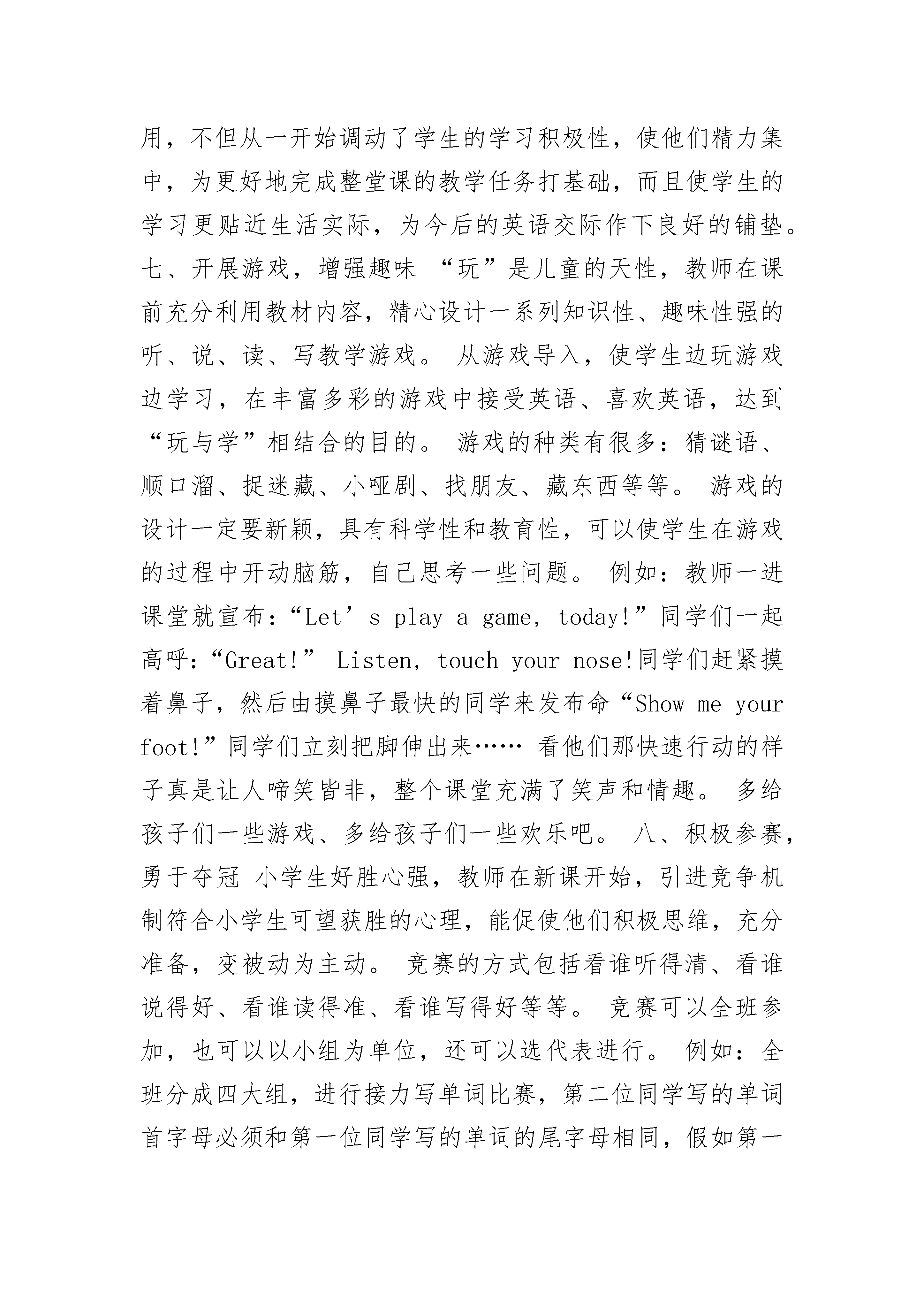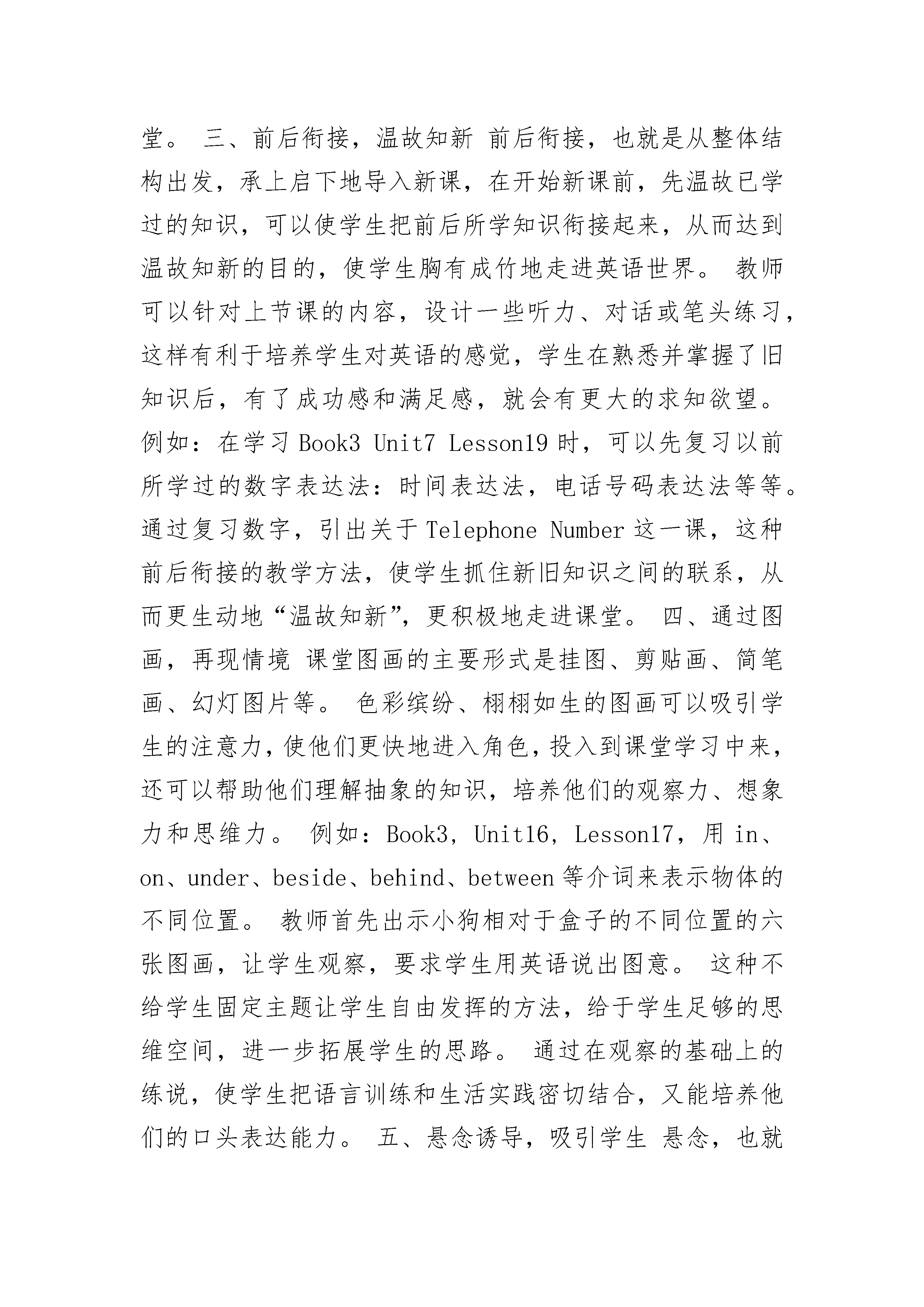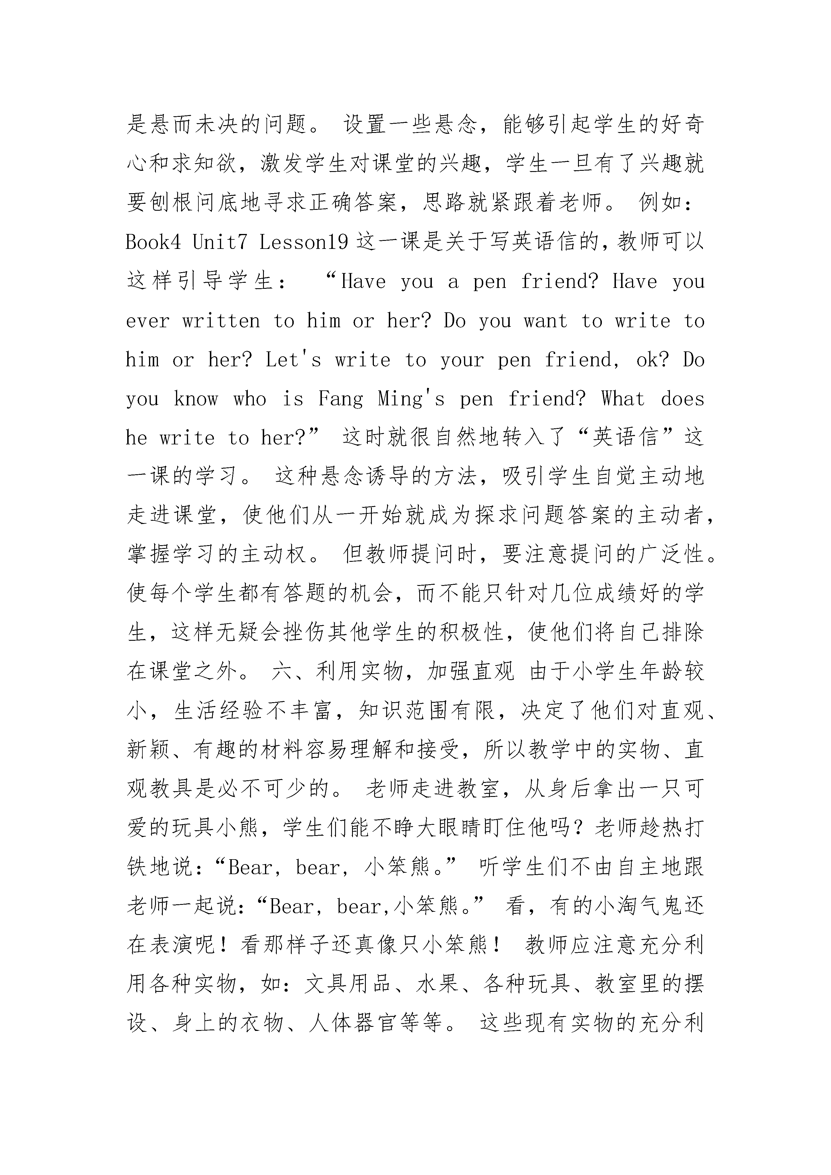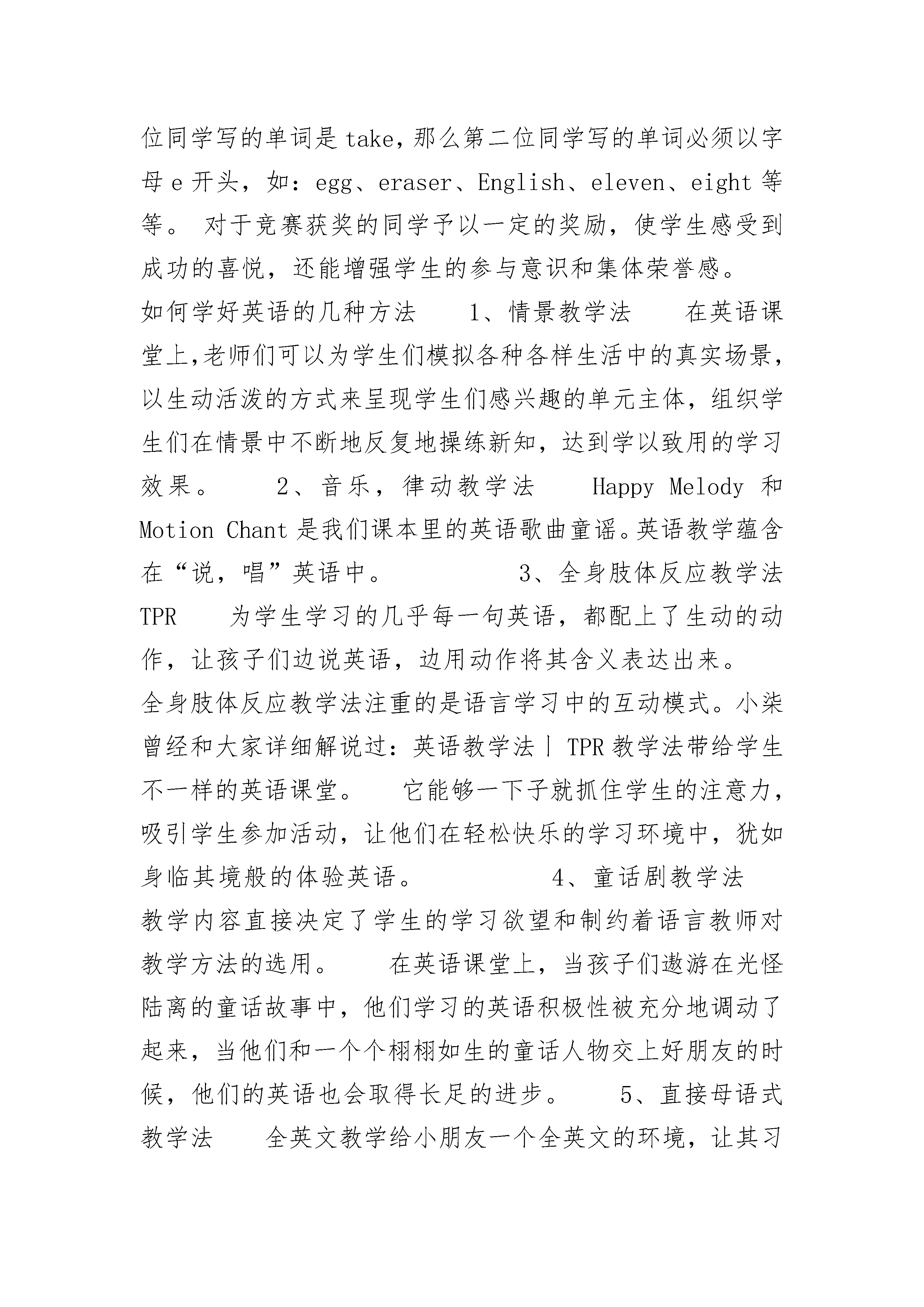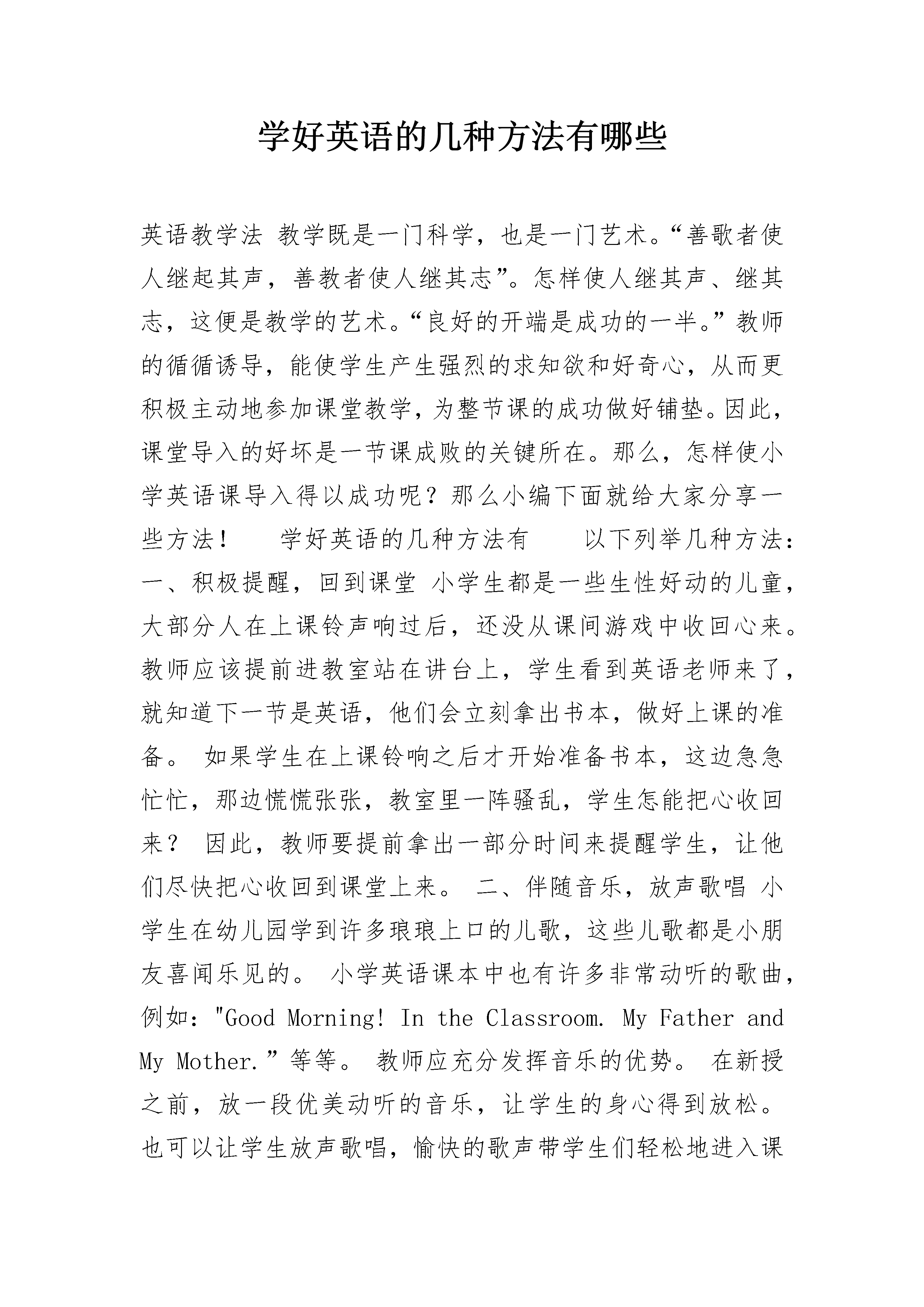 学好英语的几种方法有哪些英语教学法教学既是一门科学,也是一门艺术。“善歌者使人继起其声,善教者使人继其志”。怎样使人继其声、继其志,这便是教学的艺术。“良好的开端是成功的一半。”教师的循循诱导,能使学生产生强烈的求知欲和好奇心,从而更积极主动地参加课堂教学,为整节课的成功做好铺垫。因此,课堂导入的好坏是一节课成败的关键所在。那么,怎样使小学英语课导入得以成功呢?那么小编下面就给大家分享一些方法!学好英语的几种方法有以下列举几种方法:一、积极提醒,回到课堂小学生都是一些生性好动的儿童,大部分人在上课铃声响过后,还没从课间游戏中收回心来。教师应该提前进教室站在讲台上,学生看到英语老师来了,就知道下一节是英语,他们会立刻拿出书本,做好上课的准备。如果学生在上课铃响之后才开始准备书本,这边急急忙忙,那边慌慌张张,教室里一阵骚乱,学生怎能把心收回来?因此,教师要提前拿出一部分时间来提醒学生,让他们尽快把心收回到课堂上来。二、伴随音乐,放声歌唱小学生在幼儿园学到许多琅琅上口的儿歌,这些儿歌都是小朋友喜闻乐见的。小学英语课本中也有许多非常动听的歌曲,例如:"GoodMorning!IntheClassroom.MyFatherandMyMother.”等等。教师应充分发挥音乐的优势。在新授之前,放一段优美动听的音乐,让学生的身心得到放松。也可以让学生放声歌唱,愉快的歌声带学生们轻松地进入课堂。三、前后衔接,温故知新前后衔接,也就是从整体结构出发,承上启下地导入新课,在开始新课前,先温故已学过的知识,可以使学生把前后所学知识衔接起来,从而达到温故知新的目的,使学生胸有成竹地走进英语世界。教师可以针对上节课的内容,设计一些听力、对话或笔头练习,这样有利于培养学生对英语的感觉,学生在熟悉并掌握了旧知识后,有了成功感和满足感,就会有更大的求知欲望。例如:在学习Book3Unit7Lesson19时,可以先复习以前所学过的数字表达法:时间表达法,电话号码表达法等等。通过复习数字,引出关于TelephoneNumber这一课,这种前后衔接的教学方法,使学生抓住新旧知识之间的联系,从而更生动地“温故知新”,更积极地走进课堂。四、通过图画,再现情境课堂图画的主要形式是挂图、剪贴画、简笔画、幻灯图片等。色彩缤纷、栩栩如生的图画可以吸引学生的注意力,使他们更快地进入角色,投入到课堂学习中来,还可以帮助他们理解抽象的知识,培养他们的观察力、想象力和思维力。例如:Book3,Unit16,Lesson17,用in、on、under、beside、behind、between等介词来表示物体的不同位置。教师首先出示小狗相对于盒子的不同位置的六张图画,让学生观察,要求学生用英语说出图意。这种不给学生固定主题让学生自由发挥的方法,给于学生足够的思维空间,进一步拓展学生的思路。通过在观察的基础上的练说,使学生把语言训练和生活实践密切结合,又能培养他们的口头表达能力。五、悬念诱导,吸引学生悬念,也就是悬而未决的问题。设置一些悬念,能够引起学生的好奇心和求知欲,激发学生对课堂的兴趣,学生一旦有了兴趣就要刨根问底地寻求正确答案,思路就紧跟着老师。例如:Book4Unit7Lesson19这一课是关于写英语信的,教师可以这样引导学生:“Haveyouapenfriend?Haveyoueverwrittentohimorher?Doyouwanttowritetohimorher?Let'swritetoyourpenfriend,ok?DoyouknowwhoisFangMing'spenfriend?Whatdoeshewritetoher?”这时就很自然地转入了“英语信”这一课的学习。这种悬念诱导的方法,吸引学生自觉主动地走进课堂,使他们从一开始就成为探求问题答案的主动者,掌握学习的主动权。但教师提问时,要注意提问的广泛性。使每个学生都有答题的机会,而不能只针对几位成绩好的学生,这样无疑会挫伤其他学生的积极性,使他们将自己排除在课堂之外。六、利用实物,加强直观由于小学生年龄较小,生活经验不丰富,知识范围有限,决定了他们对直观、新颖、有趣的材料容易理解和接受,所以教学中的实物、直观教具是必不可少的。老师走进教室,从身后拿出一只可爱的玩具小熊,学生们能不睁大眼睛盯住他吗?老师趁热打铁地说:“Bear,bear,小笨熊。”听学生们不由自主地跟老师一起说:“Bear,bear,小笨熊。”看,有的小淘气鬼还在表演呢!看那样子还真像只小笨熊!教师应注意充分利用各种实物,如:文具用品、水果、各种玩具、教室里的摆设、身上的衣物、人体器官等等。这些现有实物的充分利用,不但从一开始调动了学生的学习积极性,使他们精力集中,为更好地完成整堂课的教学任务打基础,而且使学生的学习更贴近生活实际