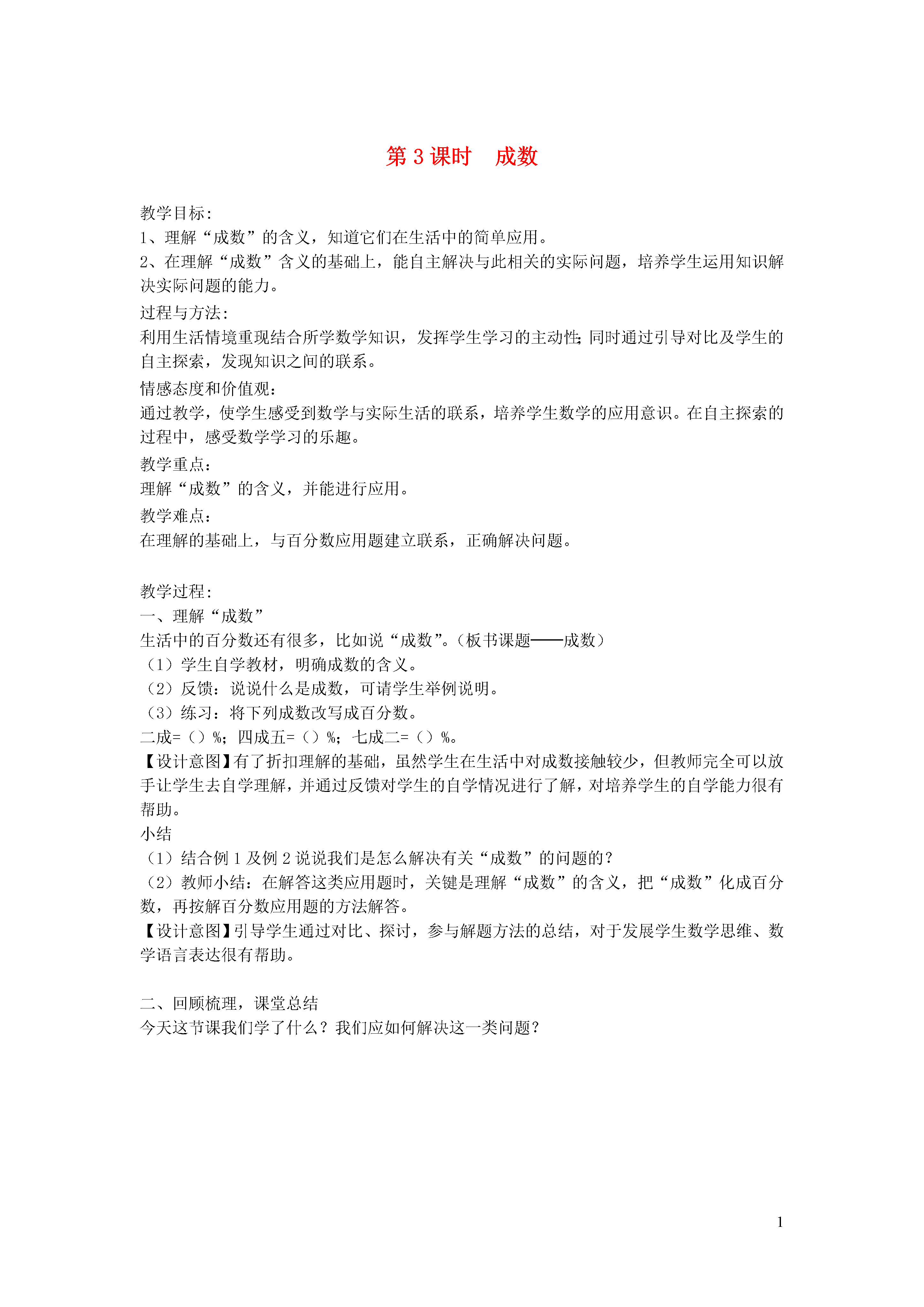 1第3课时成数教学目标:1、理解“成数”的含义,知道它们在生活中的简单应用。2、在理解“成数”含义的基础上,能自主解决与此相关的实际问题,培养学生运用知识解决实际问题的能力。过程与方法:利用生活情境重现结合所学数学知识,发挥学生学习的主动性;同时通过引导对比及学生的自主探索,发现知识之间的联系。情感态度和价值观:通过教学,使学生感受到数学与实际生活的联系,培养学生数学的应用意识。在自主探索的过程中,感受数学学习的乐趣。教学重点:理解“成数”的含义,并能进行应用。教学难点:在理解的基础上,与百分数应用题建立联系,正确解决问题。教学过程:一、理解“成数”生活中的百分数还有很多,比如说“成数”。(板书课题──成数)(1)学生自学教材,明确成数的含义。(2)反馈:说说什么是成数,可请学生举例说明。(3)练习:将下列成数改写成百分数。二成=()%;四成五=()%;七成二=()%。【设计意图】有了折扣理解的基础,虽然学生在生活中对成数接触较少,但教师完全可以放手让学生去自学理解,并通过反馈对学生的自学情况进行了解,对培养学生的自学能力很有帮助。小结(1)结合例1及例2说说我们是怎么解决有关“成数”的问题的?(2)教师小结:在解答这类应用题时,关键是理解“成数”的含义,把“成数”化成百分数,再按解百分数应用题的方法解答。【设计意图】引导学生通过对比、探讨,参与解题方法的总结,对于发展学生数学思维、数学语言表达很有帮助。二、回顾梳理,课堂总结今天这节课我们学了什么?我们应如何解决这一类问题?