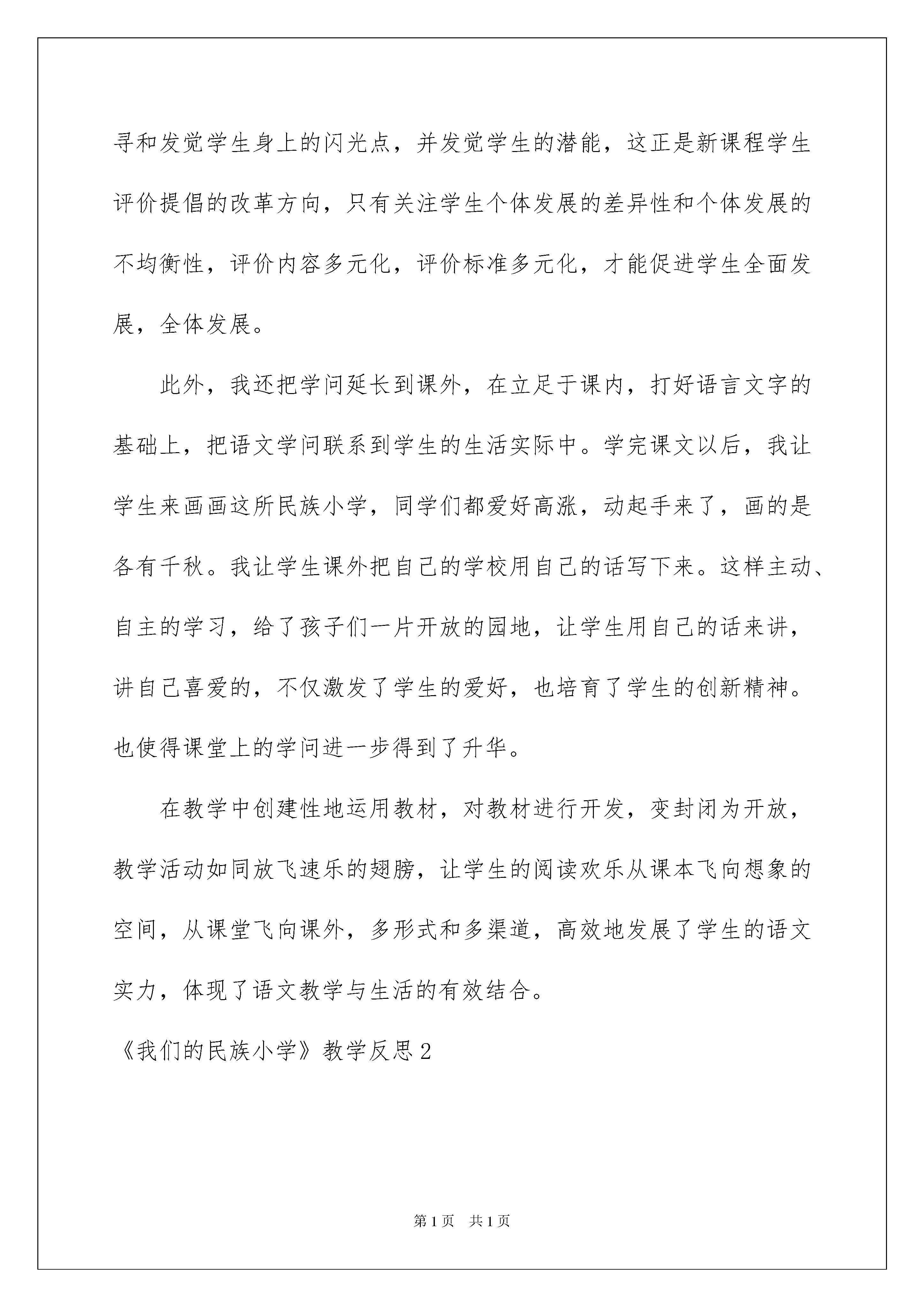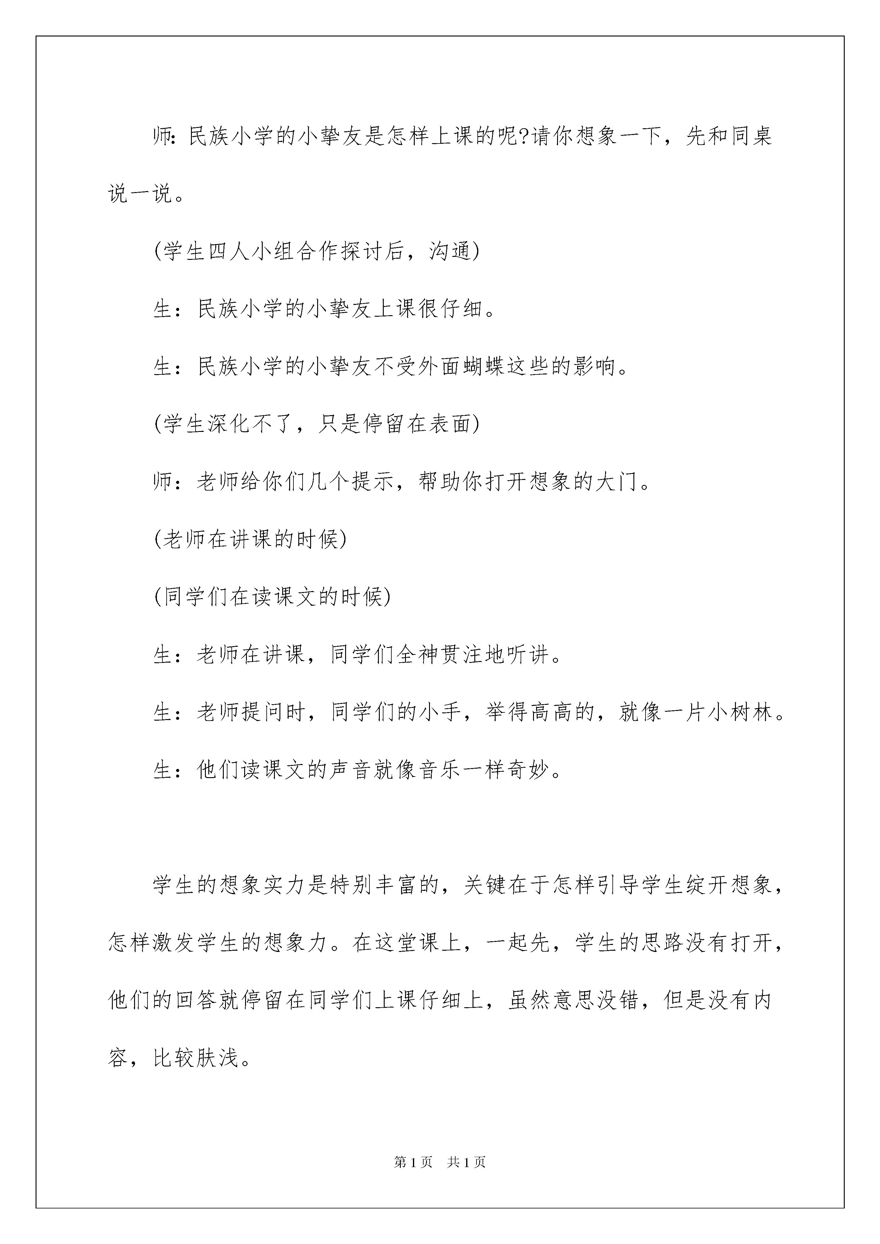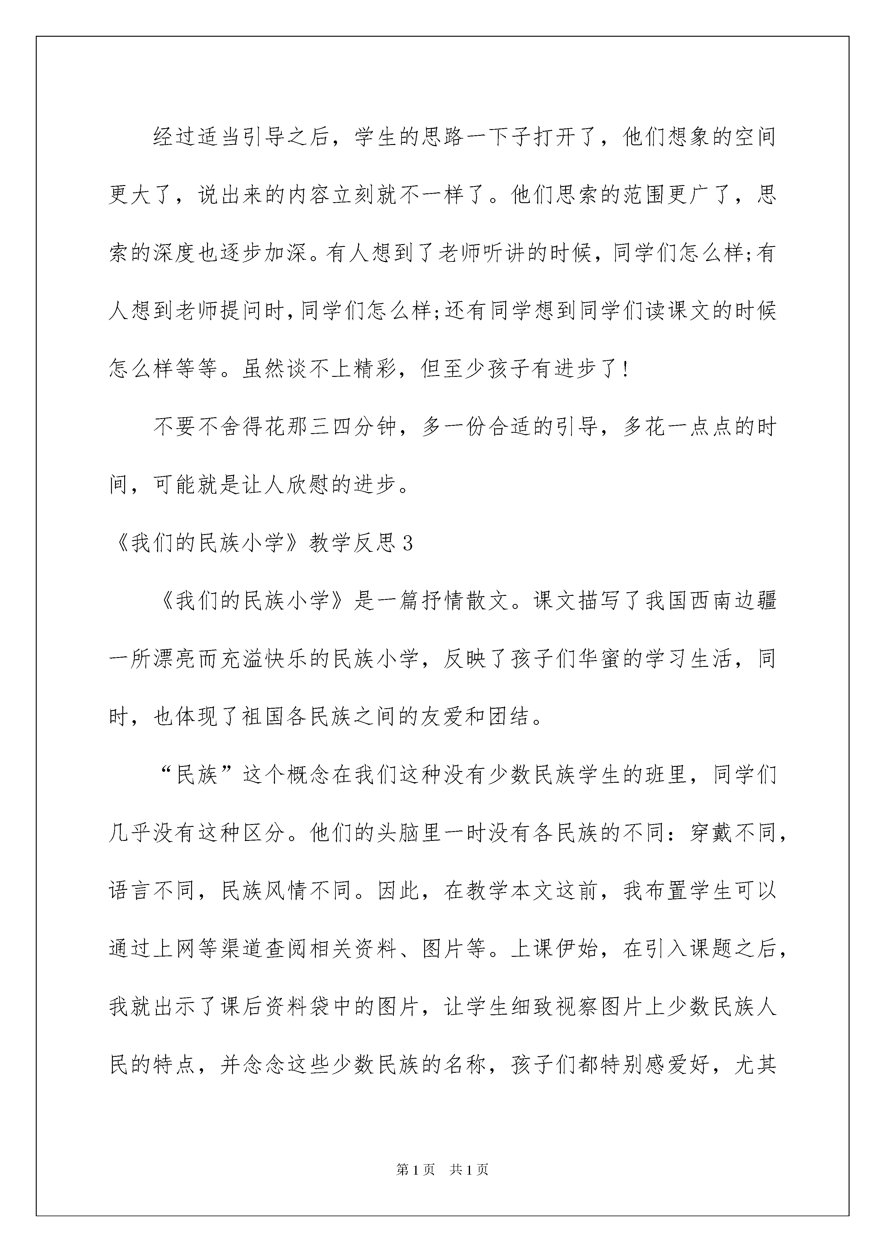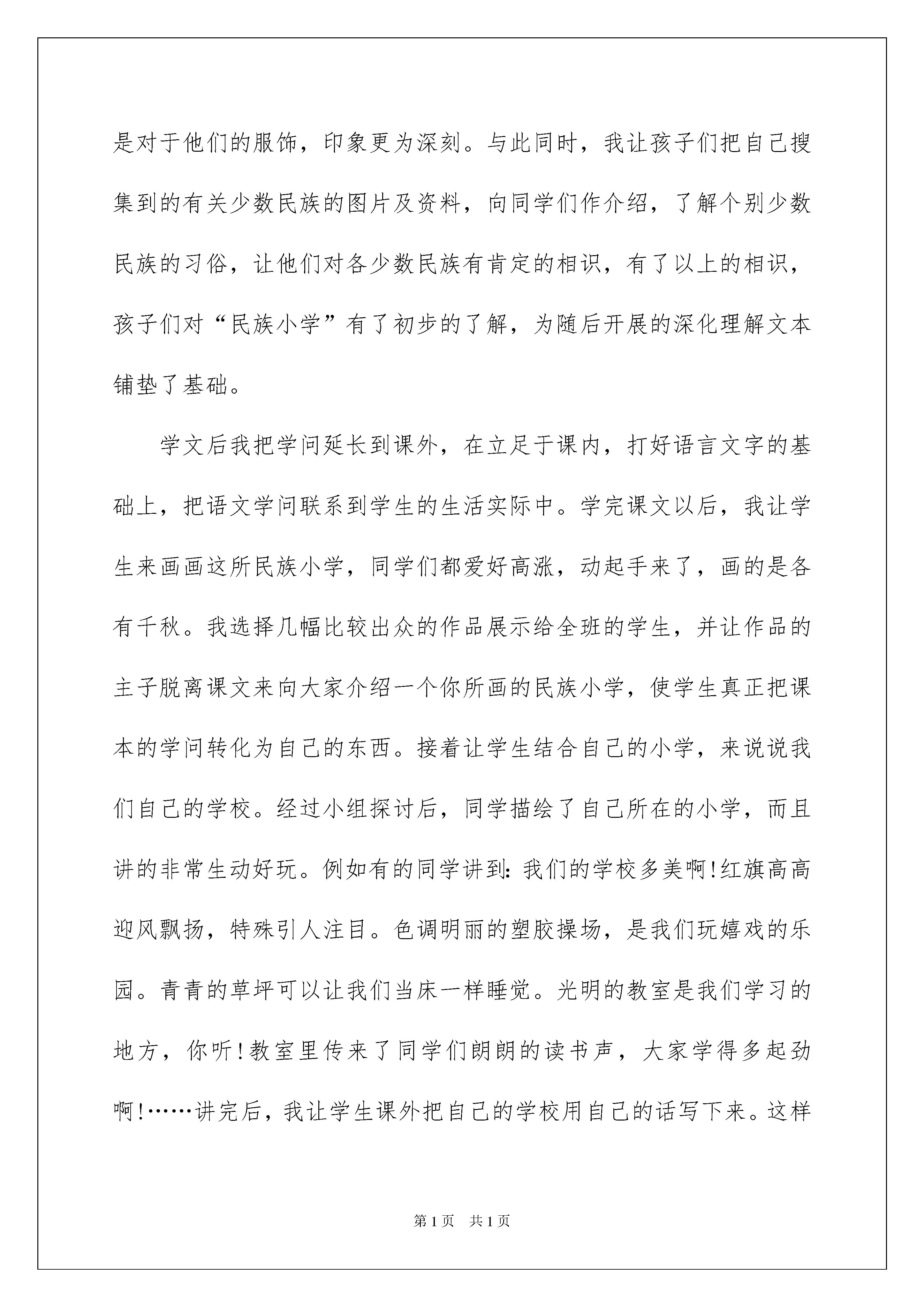 2022《我们的民族小学》教学反思《我们的民族小学》教学反思身为一名人民老师,教学是我们的任务之一,通过教学反思可以快速积累我们的教学阅历,教学反思我们应当怎么写呢?下面是我为大家整理的《我们的民族小学》教学反思,欢迎阅读,希望大家能够喜爱。《我们的民族小学》教学反思1《我们的民族小学》有一段描写窗外非常宁静的文字,我创设了一个“蝴蝶飘舞”的师生活动情境,由老师扮演蝴蝶,邀请同学读文段,谁能读出“宁静”的感觉,“蝴蝶”就会“停留”在谁的身边表示观赏,由于有的学生理解课文有差异,读这段时声音非常洪亮,于是我说:“哎呀,蝴蝶都被‘吓飞’啦,你们说为啥呢?”该学生立刻醒悟过来,改成了静静地诵读,这样通过创设生活情境,加上老师恰到好处的提示,使学生的朗读实力得到了提高,这比单纯的朗读技巧的指导更有效,给学生的印象更深刻,也使短暂朗读不到位的学生主动性没有受到挫伤,仅成了学生提高自己朗读水平的一次鼓舞。找寻和发觉学生身上的闪光点,并发觉学生的潜能,这正是新课程学生评价提倡的改革方向,只有关注学生个体发展的差异性和个体发展的不均衡性,评价内容多元化,评价标准多元化,才能促进学生全面发展,全体发展。此外,我还把学问延长到课外,在立足于课内,打好语言文字的基础上,把语文学问联系到学生的生活实际中。学完课文以后,我让学生来画画这所民族小学,同学们都爱好高涨,动起手来了,画的是各有千秋。我让学生课外把自己的学校用自己的话写下来。这样主动、自主的学习,给了孩子们一片开放的园地,让学生用自己的话来讲,讲自己喜爱的,不仅激发了学生的爱好,也培育了学生的创新精神。也使得课堂上的学问进一步得到了升华。在教学中创建性地运用教材,对教材进行开发,变封闭为开放,教学活动如同放飞速乐的翅膀,让学生的阅读欢乐从课本飞向想象的空间,从课堂飞向课外,多形式和多渠道,高效地发展了学生的语文实力,体现了语文教学与生活的有效结合。《我们的民族小学》教学反思2师:民族小学的小挚友是怎样上课的呢?请你想象一下,先和同桌说一说。(学生四人小组合作探讨后,沟通)生:民族小学的小挚友上课很仔细。生:民族小学的小挚友不受外面蝴蝶这些的影响。(学生深化不了,只是停留在表面)师:老师给你们几个提示,帮助你打开想象的大门。(老师在讲课的时候)(同学们在读课文的时候)生:老师在讲课,同学们全神贯注地听讲。生:老师提问时,同学们的小手,举得高高的,就像一片小树林。生:他们读课文的声音就像音乐一样奇妙。学生的想象实力是特别丰富的,关键在于怎样引导学生绽开想象,怎样激发学生的想象力。在这堂课上,一起先,学生的思路没有打开,他们的回答就停留在同学们上课仔细上,虽然意思没错,但是没有内容,比较肤浅。经过适当引导之后,学生的思路一下子打开了,他们想象的空间更大了,说出来的内容立刻就不一样了。他们思索的范围更广了,思索的深度也逐步加深。有人想到了老师听讲的时候,同学们怎么样;有人想到老师提问时,同学们怎么样;还有同学想到同学们读课文的时候怎么样等等。虽然谈不上精彩,但至少孩子有进步了!不要不舍得花那三四分钟,多一份合适的引导,多花一点点的时间,可能就是让人欣慰的进步。《我们的民族小学》教学反思3《我们的民族小学》是一篇抒情散文。课文描写了我国西南边疆一所漂亮而充溢快乐的民族小学,反映了孩子们华蜜的学习生活,同时,也体现了祖国各民族之间的友爱和团结。“民族”这个概念在我们这种没有少数民族学生的班里,同学们几乎没有这种区分。他们的头脑里一时没有各民族的不同:穿戴不同,语言不同,民族风情不同。因此,在教学本文这前,我布置学生可以通过上网等渠道查阅相关资料、图片等。上课伊始,在引入课题之后,我就出示了课后资料袋中的图片,让学生细致视察图片上少数民族人民的特点,并念念这些少数民族的名称,孩子们都特别感爱好,尤其是对于他们的服饰,印象更为深刻。与此同时,我让孩子们把自己搜集到的有关少数民族的图片及资料,向同学们作介绍,了解个别少数民族的习俗,让他们对各少数民族有肯定的相识,有了以上的相识,孩子们对“民族小学”有了初步的了解,为随后开展的深化理解文本铺垫了基础。学文后我把学问延长到课外,在立足于课内,打好语言文字的基础上,把语文学问联系到学生的生活实际中。学完课文以后,我让学生来画画这所民族小学,同学们都爱好高涨,动起手来了,画的是各有千秋。我选择几幅比较出众的作品展示给全班的学生,并让作品的主子脱离课文来向大家介绍一个你所画的民族小学,使学生真正把课本的学问转化为自己的东西。接着让学生结合自己的小学,来说说我们自己的学校。经过小组探讨后,同学描绘了自己所在的小学,而