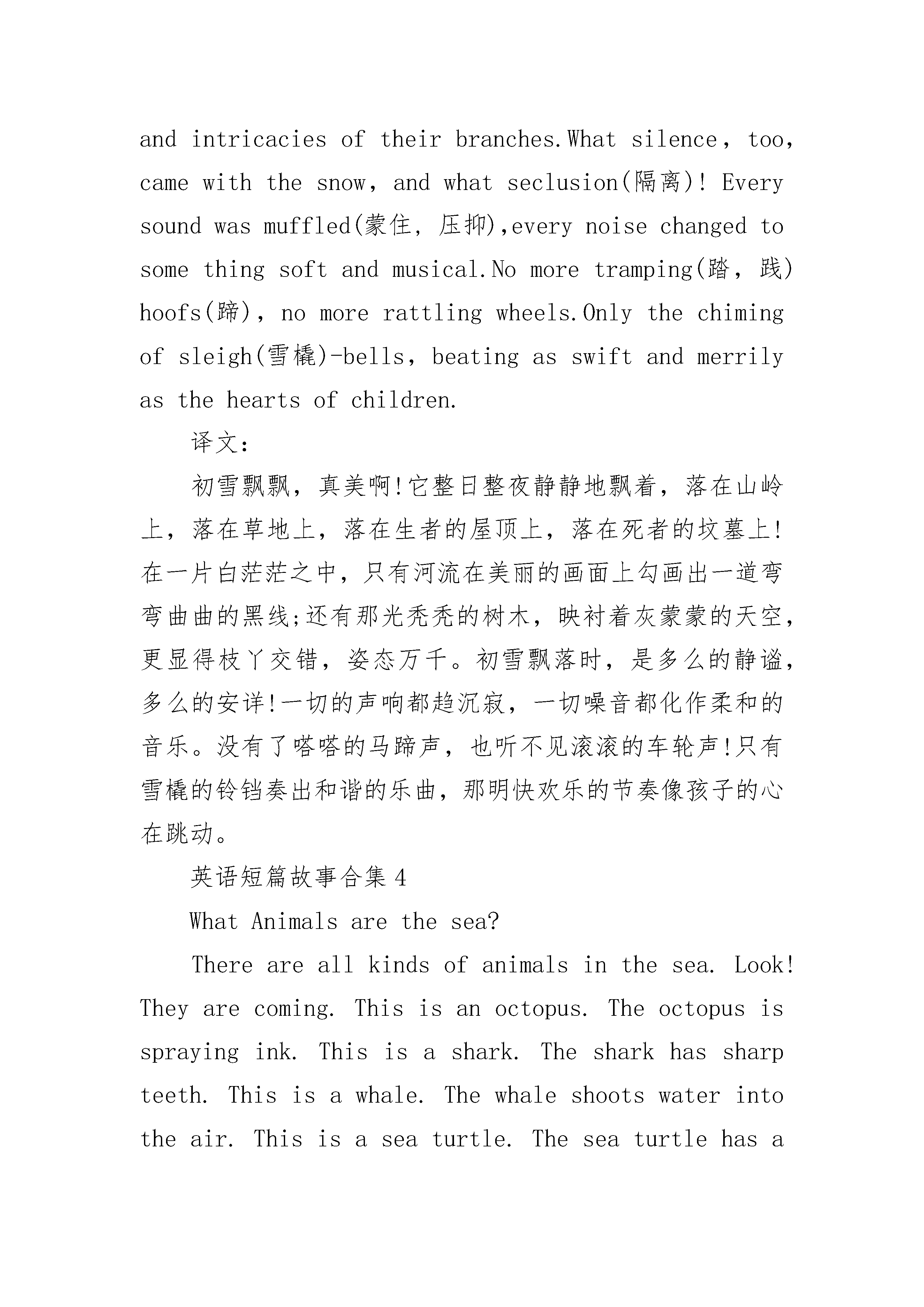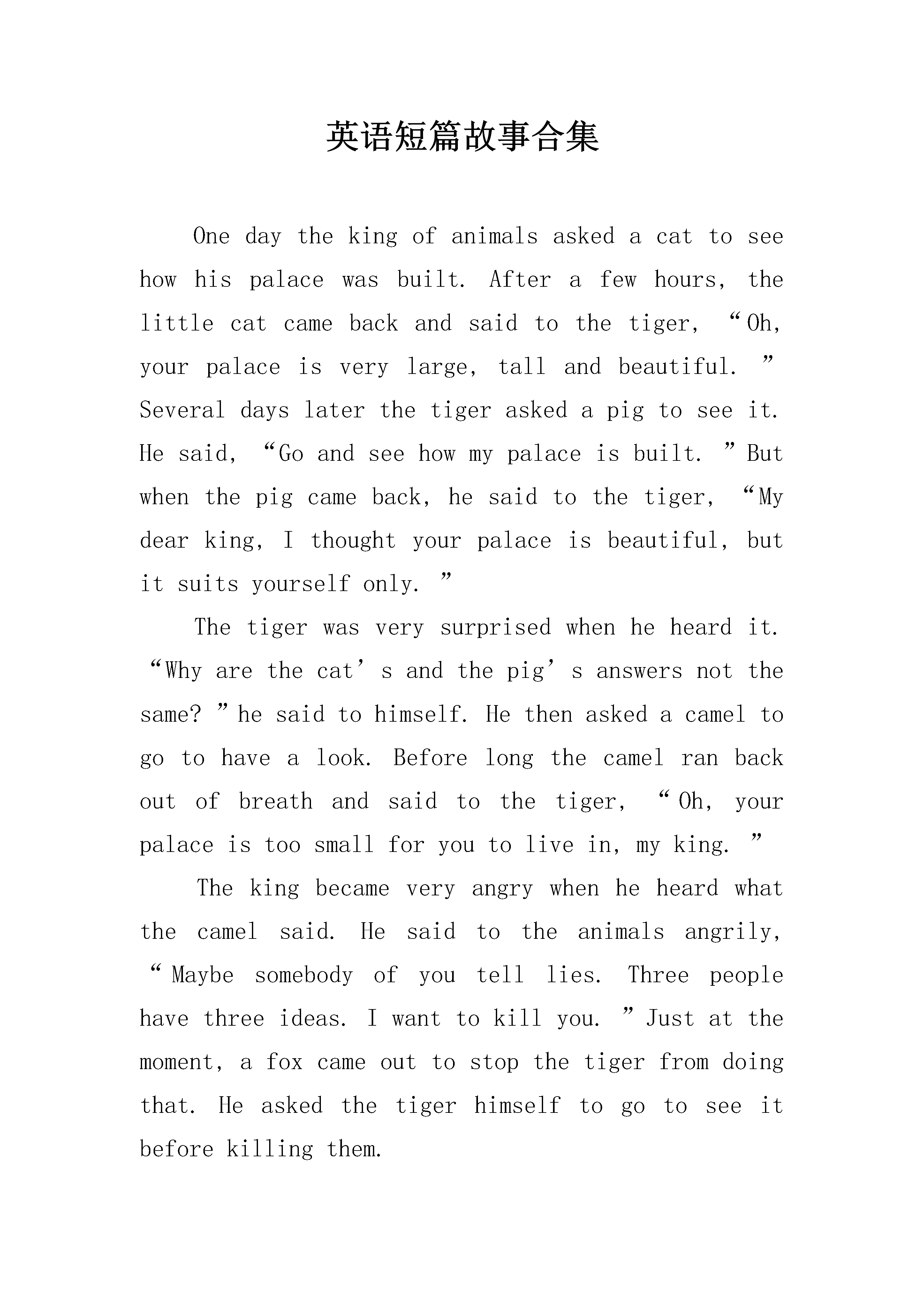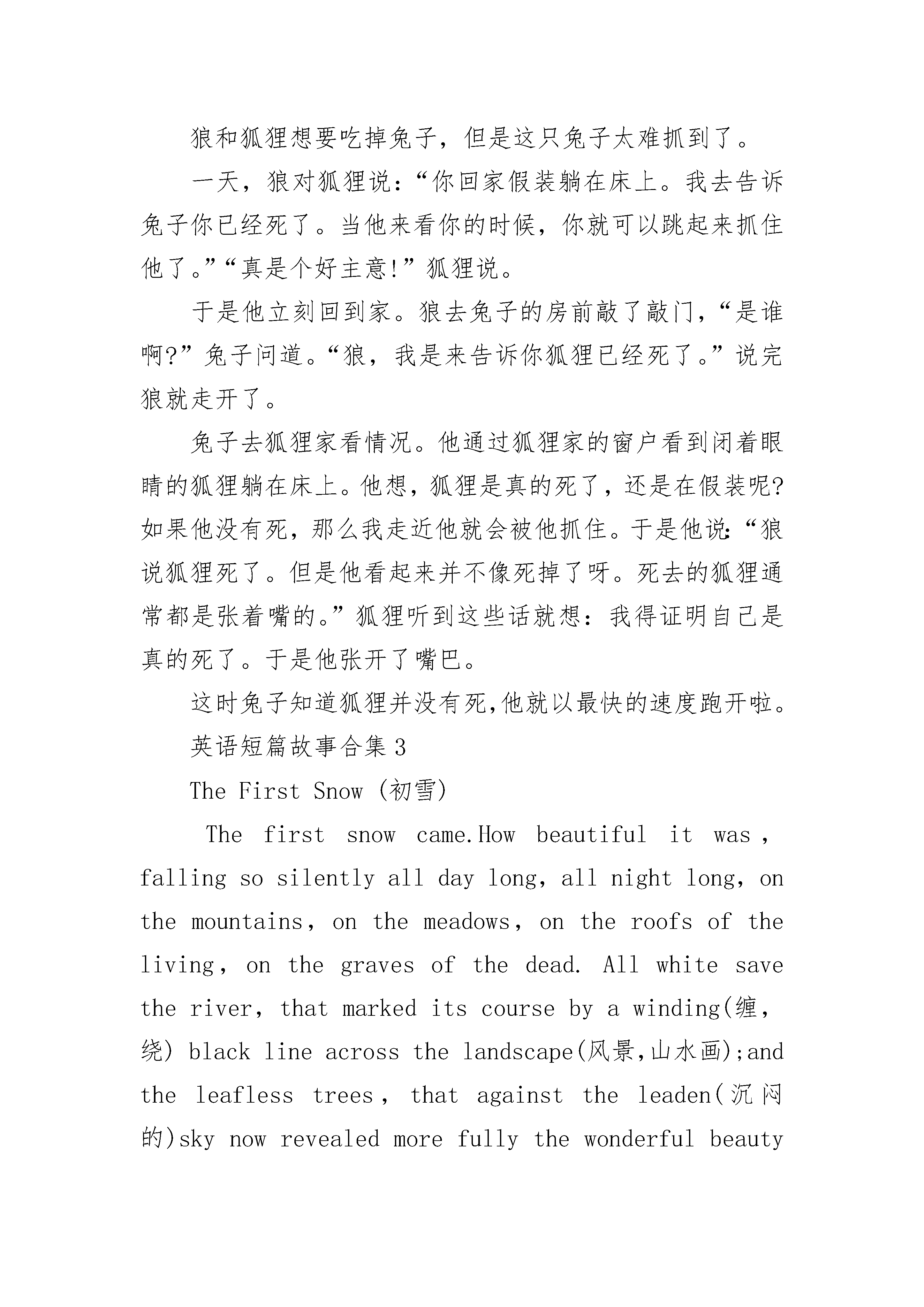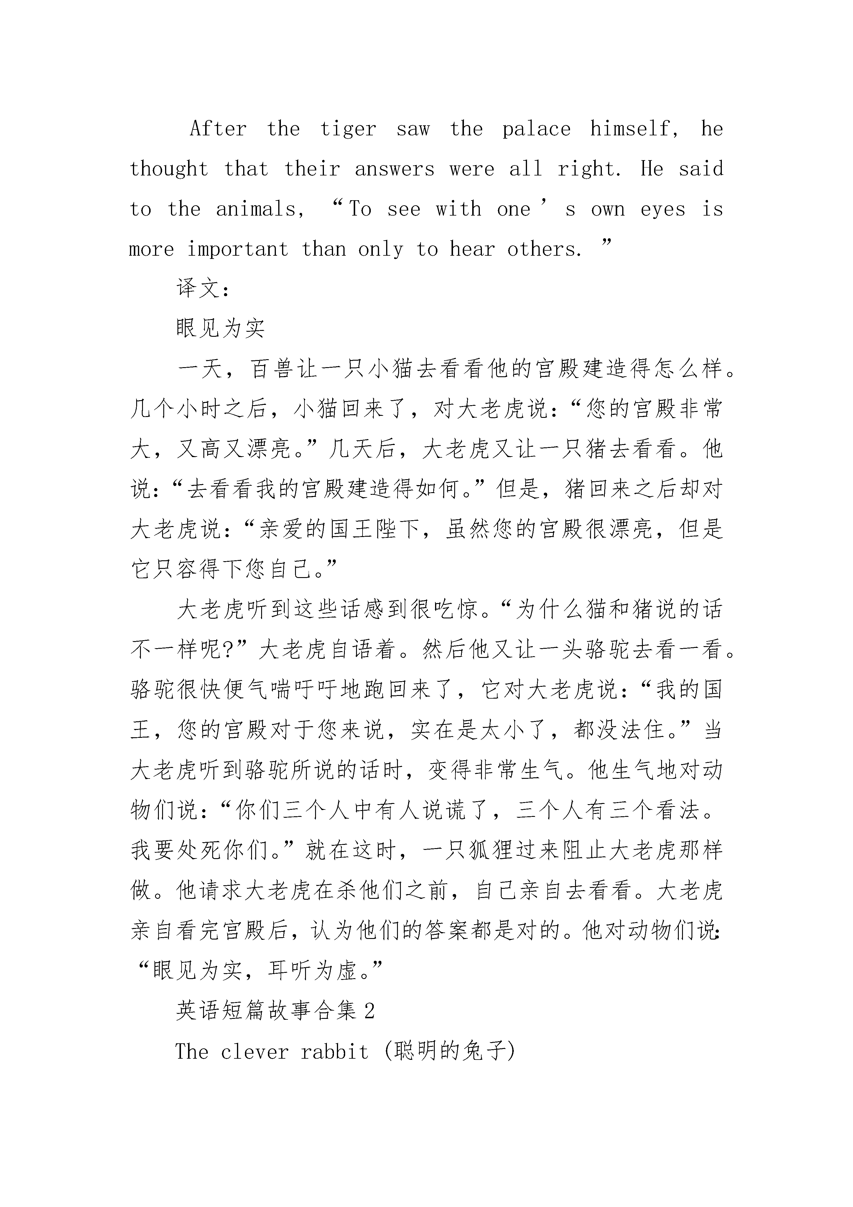 英语短篇故事合集Onedaythekingofanimalsaskedacattoseehowhispalacewasbuilt.Afterafewhours,thelittlecatcamebackandsaidtothetiger,“Oh,yourpalaceisverylarge,tallandbeautiful.”Severaldayslaterthetigeraskedapigtoseeit.Hesaid,“Goandseehowmypalaceisbuilt.”Butwhenthepigcameback,hesaidtothetiger,“Mydearking,Ithoughtyourpalaceisbeautiful,butitsuitsyourselfonly.”Thetigerwasverysurprisedwhenheheardit.“Whyarethecat’sandthepig’sanswersnotthesame?”hesaidtohimself.Hethenaskedacameltogotohavealook.Beforelongthecamelranbackoutofbreathandsaidtothetiger,“Oh,yourpalaceistoosmallforyoutolivein,myking.”Thekingbecameveryangrywhenheheardwhatthecamelsaid.Hesaidtotheanimalsangrily,“Maybesomebodyofyoutelllies.Threepeoplehavethreeideas.Iwanttokillyou.”Justatthemoment,afoxcameouttostopthetigerfromdoingthat.Heaskedthetigerhimselftogotoseeitbeforekillingthem.Afterthetigersawthepalacehimself,hethoughtthattheiranswerswereallright.Hesaidtotheanimals,“Toseewithone’sowneyesismoreimportantthanonlytohearothers.”译文:眼见为实一天,百兽让一只小猫去看看他的宫殿建造得怎么样。几个小时之后,小猫回来了,对大老虎说:“您的宫殿非常大,又高又漂亮。”几天后,大老虎又让一只猪去看看。他说:“去看看我的宫殿建造得如何。”但是,猪回来之后却对大老虎说:“亲爱的国王陛下,虽然您的宫殿很漂亮,但是它只容得下您自己。”大老虎听到这些话感到很吃惊。“为什么猫和猪说的话不一样呢?”大老虎自语着。然后他又让一头骆驼去看一看。骆驼很快便气喘吁吁地跑回来了,它对大老虎说:“我的国王,您的宫殿对于您来说,实在是太小了,都没法住。”当大老虎听到骆驼所说的话时,变得非常生气。他生气地对动物们说:“你们三个人中有人说谎了,三个人有三个看法。我要处死你们。”就在这时,一只狐狸过来阻止大老虎那样做。他请求大老虎在杀他们之前,自己亲自去看看。大老虎亲自看完宫殿后,认为他们的答案都是对的。他对动物们说:“眼见为实,耳听为虚。”英语短篇故事合集2Thecleverrabbit(聪明的兔子)Thewolfandthefoxwanttoeattherabbit,butitwasn'teasytocatchhim.Onedaythewolfsaystothefox,"Yougohomeandlieinbed.I'lltelltherabbitthatyouaredead.Whenhecomestolookatyou,youcanjumpupandcatchhim."That'sagoodidea,"saysthefox.Thefoxgoeshomeatonce.Thewolfgoestotherabbit'shouseandknockedatthedoor."Whoisit?"askstherabbit."It'sthewolf.Icometotellyouthatthefoxisdead."Thenthewolfgoesaway.Therabbitgoestothefox'shouse.Helookedinthroughthewindowandseesthefoxlyinginbedwithhiseyesclosed.Hethinks,"Isthefoxreallydeadorishepretendingtobedead?Ifhe'snotdead,he'llcatchmewhenIgonearhim."sohesaid,"Thewolfsaysthatthefo