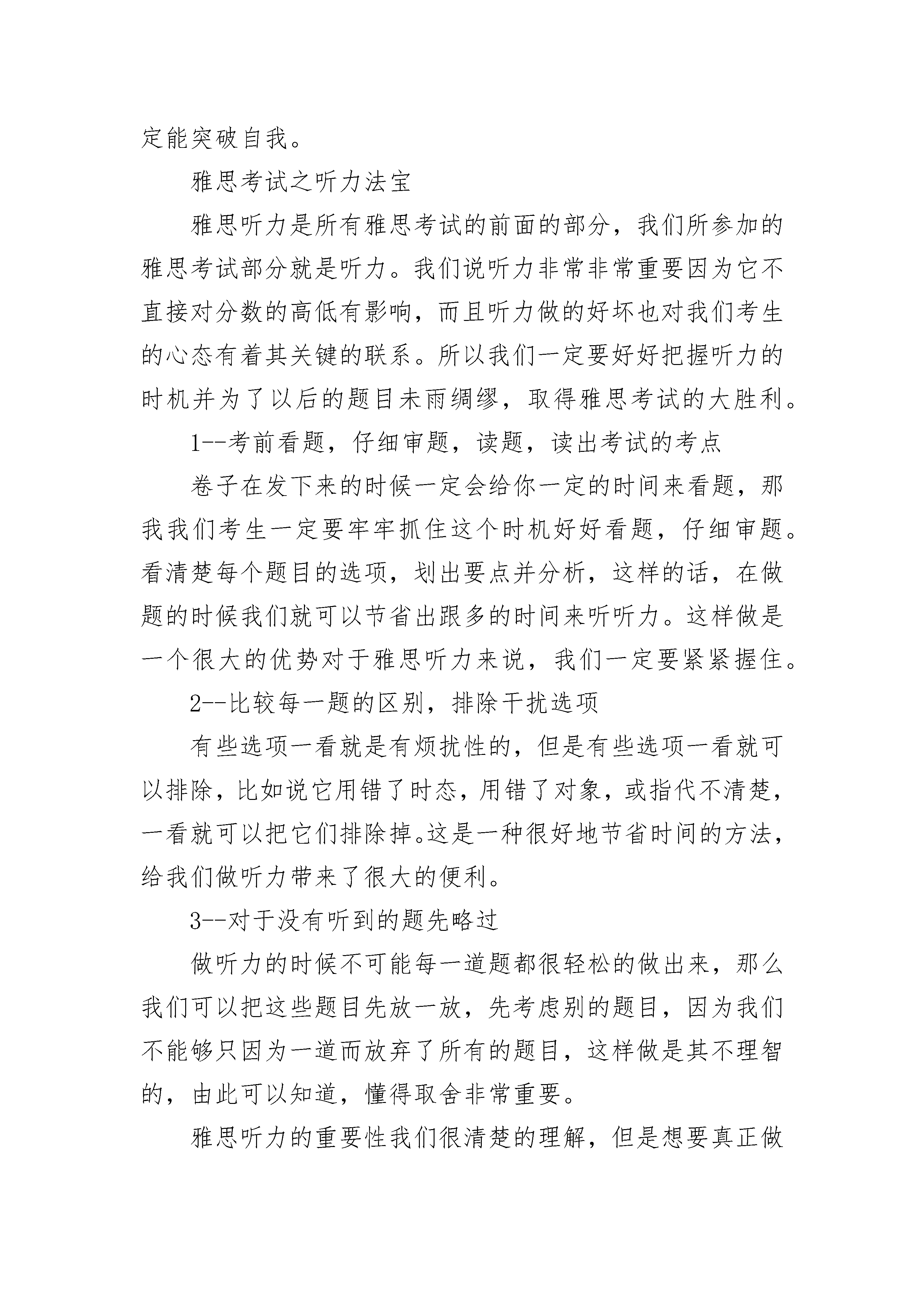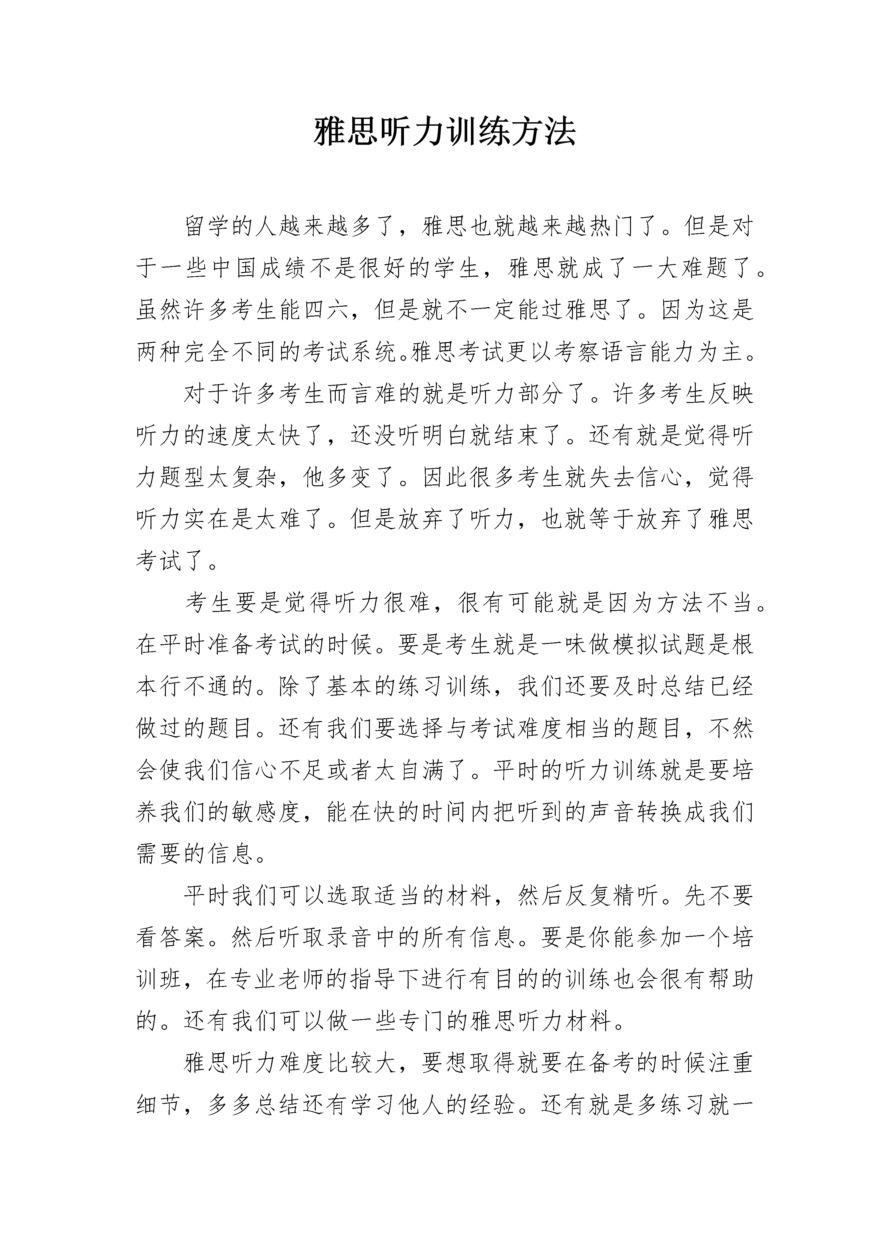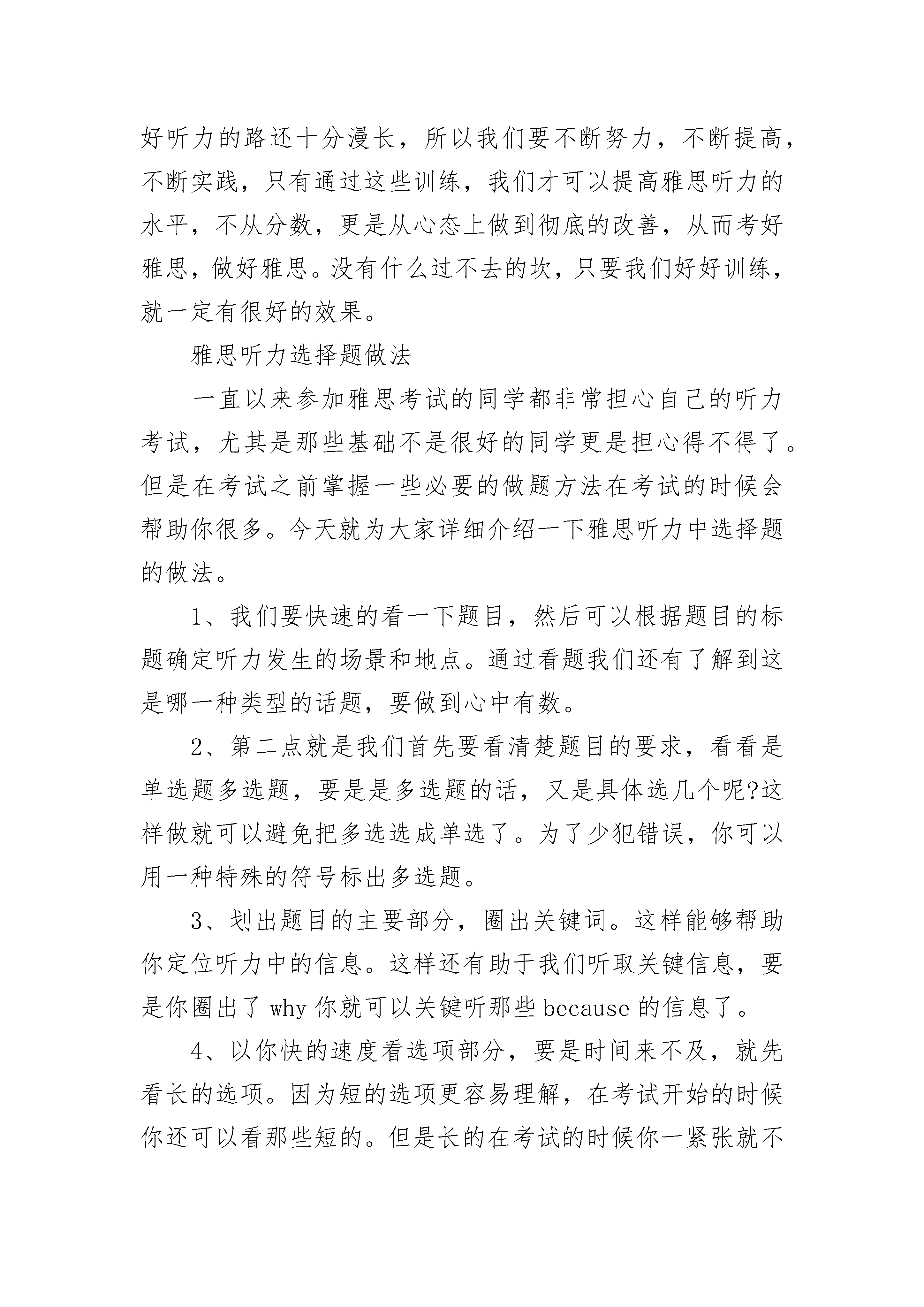 雅思听力训练方法留学的人越来越多了,雅思也就越来越热门了。但是对于一些中国成绩不是很好的学生,雅思就成了一大难题了。虽然许多考生能四六,但是就不一定能过雅思了。因为这是两种完全不同的考试系统。雅思考试更以考察语言能力为主。对于许多考生而言难的就是听力部分了。许多考生反映听力的速度太快了,还没听明白就结束了。还有就是觉得听力题型太复杂,他多变了。因此很多考生就失去信心,觉得听力实在是太难了。但是放弃了听力,也就等于放弃了雅思考试了。考生要是觉得听力很难,很有可能就是因为方法不当。在平时准备考试的时候。要是考生就是一味做模拟试题是根本行不通的。除了基本的练习训练,我们还要及时总结已经做过的题目。还有我们要选择与考试难度相当的题目,不然会使我们信心不足或者太自满了。平时的听力训练就是要培养我们的敏感度,能在快的时间内把听到的声音转换成我们需要的信息。平时我们可以选取适当的材料,然后反复精听。先不要看答案。然后听取录音中的所有信息。要是你能参加一个培训班,在专业老师的指导下进行有目的的训练也会很有帮助的。还有我们可以做一些专门的雅思听力材料。雅思听力难度比较大,要想取得就要在备考的时候注重细节,多多总结还有学习他人的经验。还有就是多练习就一定能突破自我。雅思考试之听力法宝雅思听力是所有雅思考试的前面的部分,我们所参加的雅思考试部分就是听力。我们说听力非常非常重要因为它不直接对分数的高低有影响,而且听力做的好坏也对我们考生的心态有着其关键的联系。所以我们一定要好好把握听力的时机并为了以后的题目未雨绸缪,取得雅思考试的大胜利。1--考前看题,仔细审题,读题,读出考试的考点卷子在发下来的时候一定会给你一定的时间来看题,那我我们考生一定要牢牢抓住这个时机好好看题,仔细审题。看清楚每个题目的选项,划出要点并分析,这样的话,在做题的时候我们就可以节省出跟多的时间来听听力。这样做是一个很大的优势对于雅思听力来说,我们一定要紧紧握住。2--比较每一题的区别,排除干扰选项有些选项一看就是有烦扰性的,但是有些选项一看就可以排除,比如说它用错了时态,用错了对象,或指代不清楚,一看就可以把它们排除掉。这是一种很好地节省时间的方法,给我们做听力带来了很大的便利。3--对于没有听到的题先略过做听力的时候不可能每一道题都很轻松的做出来,那么我们可以把这些题目先放一放,先考虑别的题目,因为我们不能够只因为一道而放弃了所有的题目,这样做是其不理智的,由此可以知道,懂得取舍非常重要。雅思听力的重要性我们很清楚的理解,但是想要真正做好听力的路还十分漫长,所以我们要不断努力,不断提高,不断实践,只有通过这些训练,我们才可以提高雅思听力的水平,不从分数,更是从心态上做到彻底的改善,从而考好雅思,做好雅思。没有什么过不去的坎,只要我们好好训练,就一定有很好的效果。雅思听力选择题做法一直以来参加雅思考试的同学都非常担心自己的听力考试,尤其是那些基础不是很好的同学更是担心得不得了。但是在考试之前掌握一些必要的做题方法在考试的时候会帮助你很多。今天就为大家详细介绍一下雅思听力中选择题的做法。1、我们要快速的看一下题目,然后可以根据题目的标题确定听力发生的场景和地点。通过看题我们还有了解到这是哪一种类型的话题,要做到心中有数。2、第二点就是我们首先要看清楚题目的要求,看看是单选题多选题,要是是多选题的话,又是具体选几个呢?这样做就可以避免把多选选成单选了。为了少犯错误,你可以用一种特殊的符号标出多选题。3、划出题目的主要部分,圈出关键词。这样能够帮助你定位听力中的信息。这样还有助于我们听取关键信息,要是你圈出了why你就可以关键听那些because的信息了。4、以你快的速度看选项部分,要是时间来不及,就先看长的选项。因为短的选项更容易理解,在考试开始的时候你还可以看那些短的。但是长的在考试的时候你一紧张就不一定看得懂了。4.要是选项中有很多相似的东西,那么你只要圈出不同点就是了。例如选项中有几个电话号码,5079633,5076933,5099633,还有5096933,你可以仔细看下选项,这四个号码,前面两个只是96和69的区别,然后后两个和前面两个的区别就是一个是507一个是509,所以在考试的时候你只要先判断是507还是509,再判断是96还是69就可以了。通过找这种不同点,这些题目就变得很简单了。