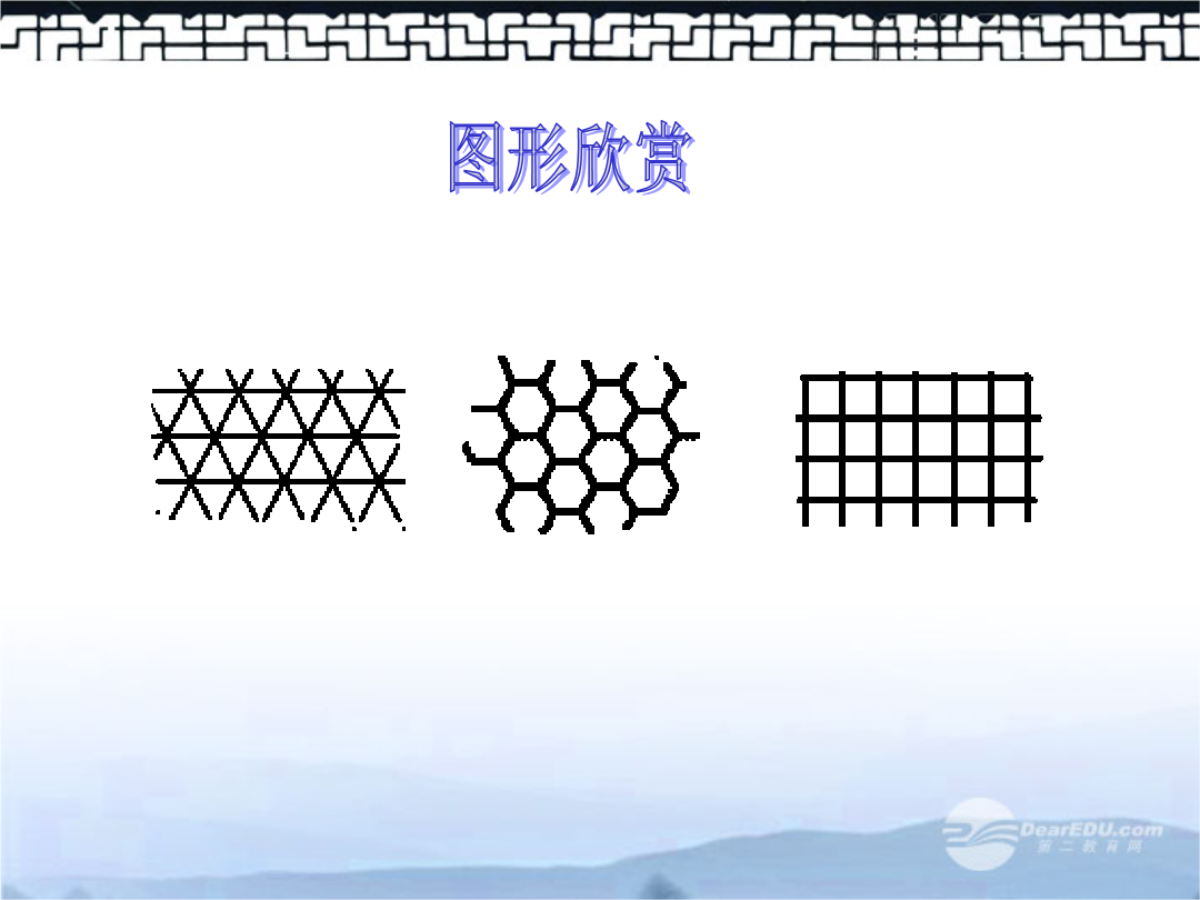 设计图案教学目标图形欣赏图形欣赏图形欣赏图形欣赏图形欣赏简单图形经过平移、旋转或对称的方法,就能设计出更美丽的图案、自己喜欢的图案。基础练习2.继续画下去。提高练习拓展练习我们通过动眼、动脑、动手,去体会和理解平移、旋转和对称在图案中的应用,知道有很多美丽的图案都是由一个简单的图形通过平移、旋转和对称等变换而成的。再见!