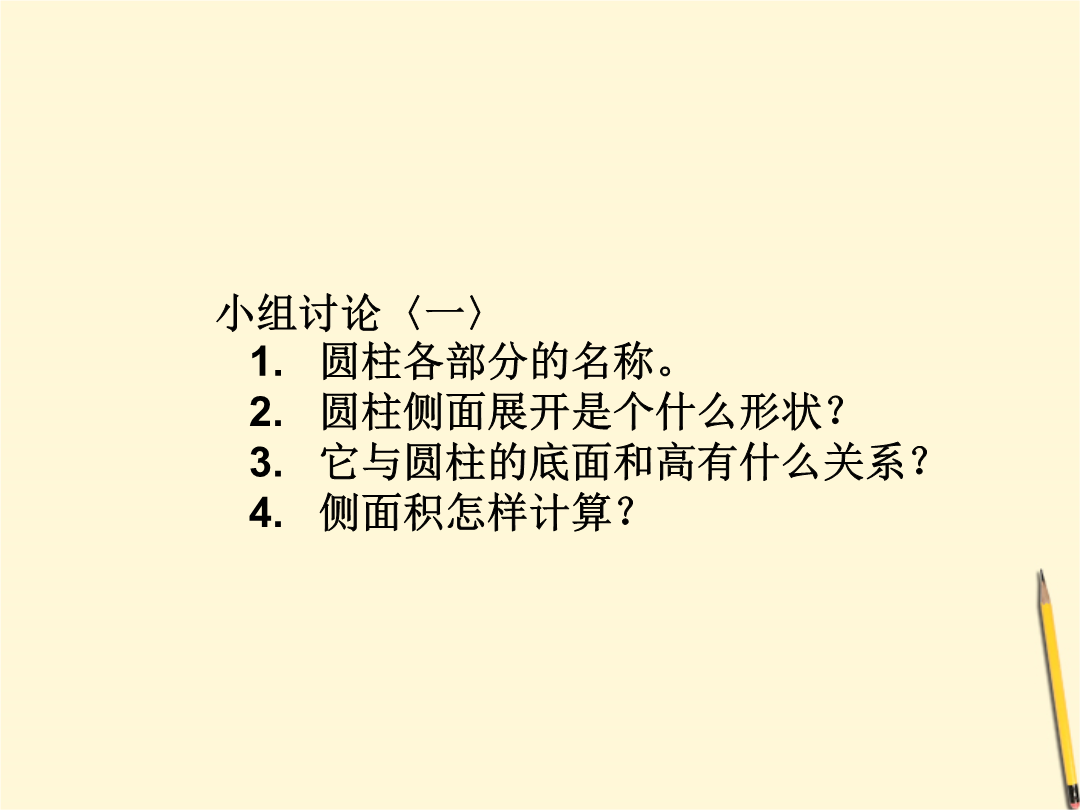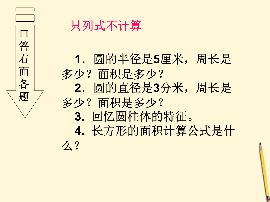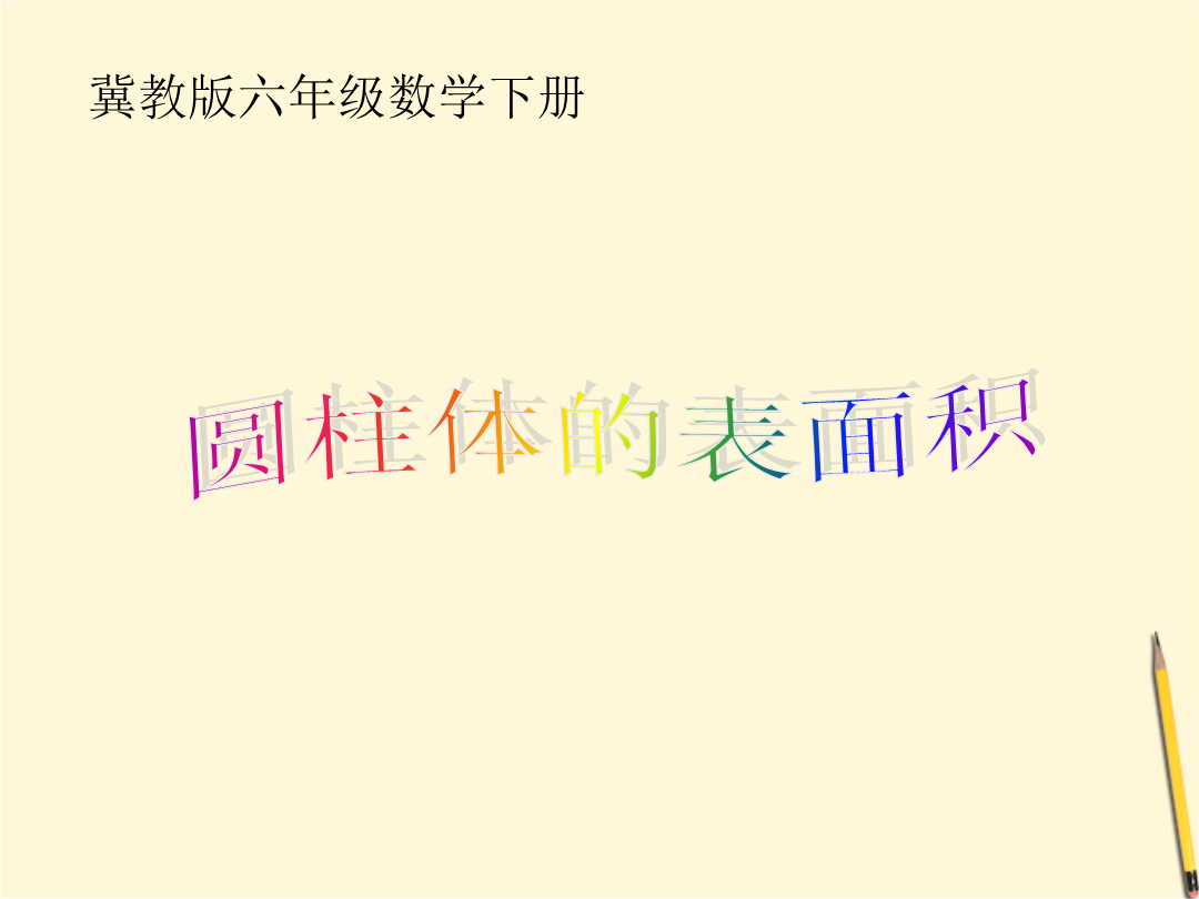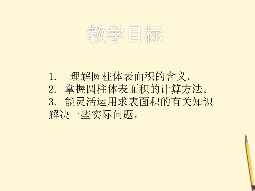 圆柱体的表面积教学目标1.圆的半径是5厘米,周长是多少?面积是多少?2.圆的直径是3分米,周长是多少?面积是多少?3.回忆圆柱体的特征。4.长方形的面积计算公式是什么?小组讨论〈一〉1.圆柱各部分的名称。2.圆柱侧面展开是个什么形状?3.它与圆柱的底面和高有什么关系?4.侧面积怎样计算?底面1.什么是圆柱体的表面积。2.圆柱体的表面积包括哪些部分?3.怎样计算圆柱的表面积?(先算....后算.....最后.....)4.完成例1:一个圆柱,底面的直径是0.5米,高是1.8米,求它的侧面积。(得数保留两位小数)例2:一个圆柱的高是15厘米,底面半径是5厘米,它的表面积是多少?侧=底=表=例3:一个没有盖的圆柱形铁皮水桶,高是24厘米,底面直径是20厘米,做这个水桶要用铁皮多少平方厘米?(得数保留整百平方厘米)全课小结