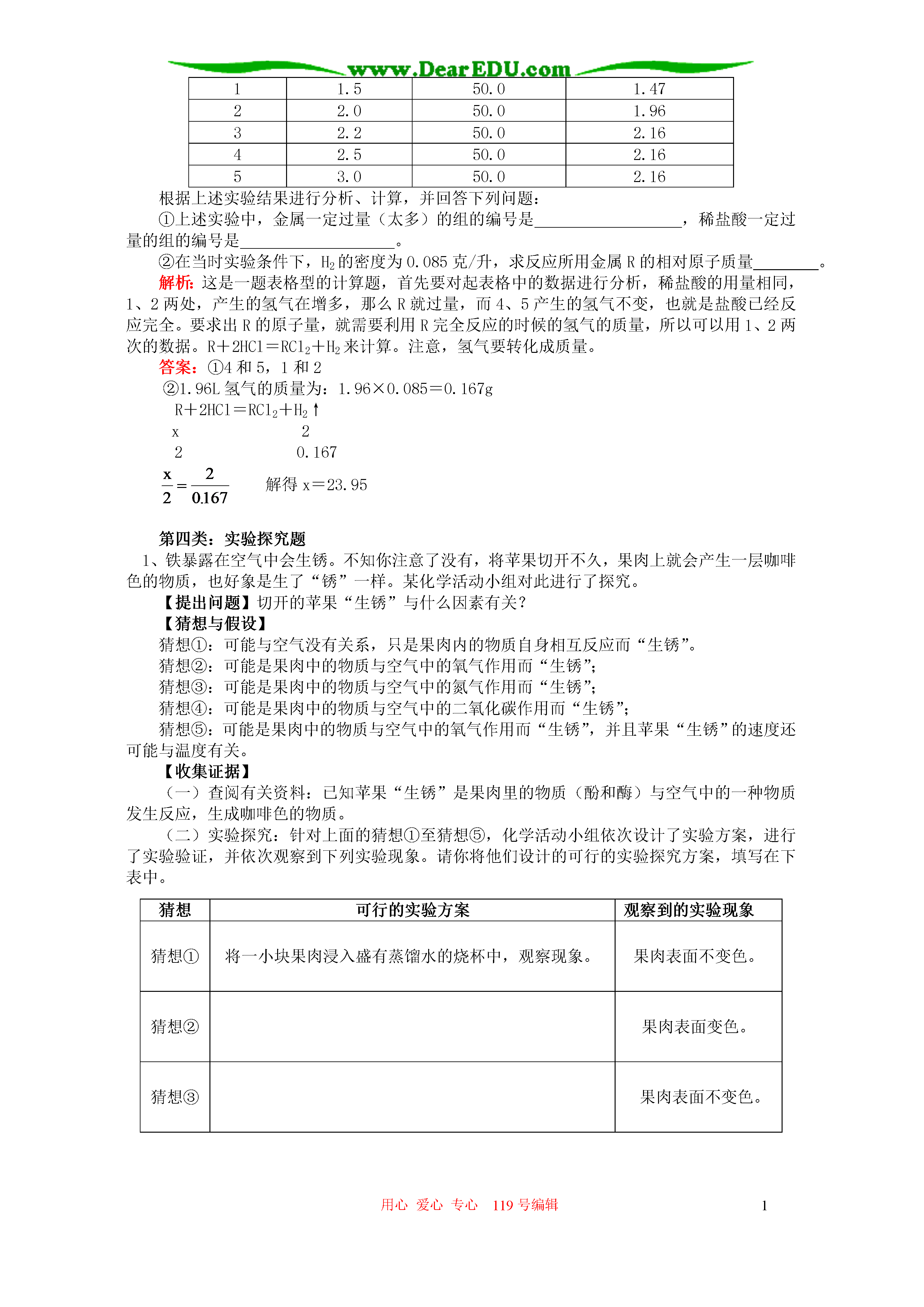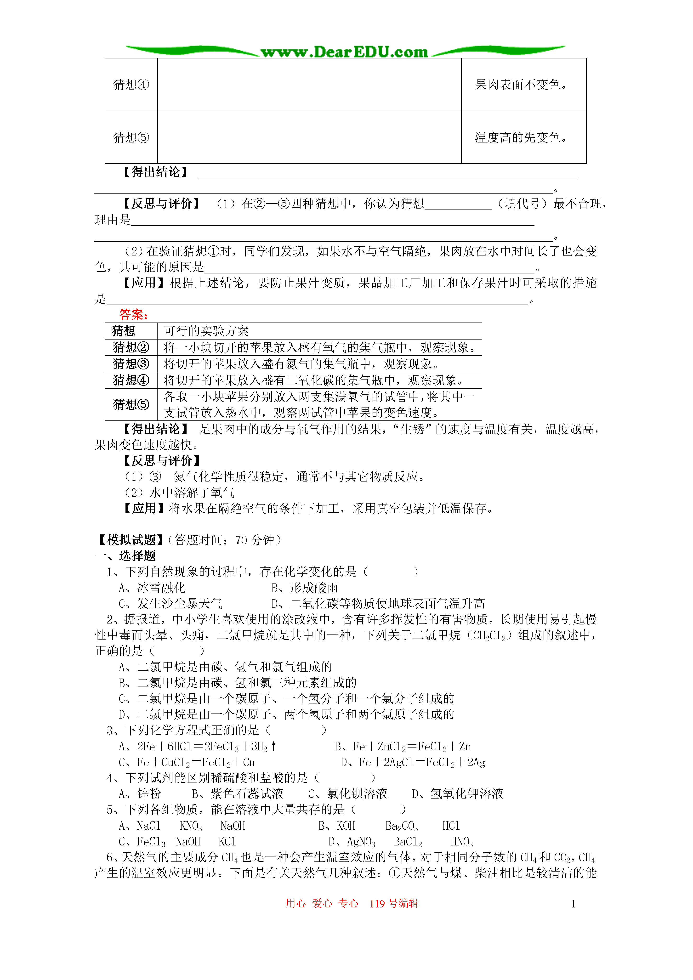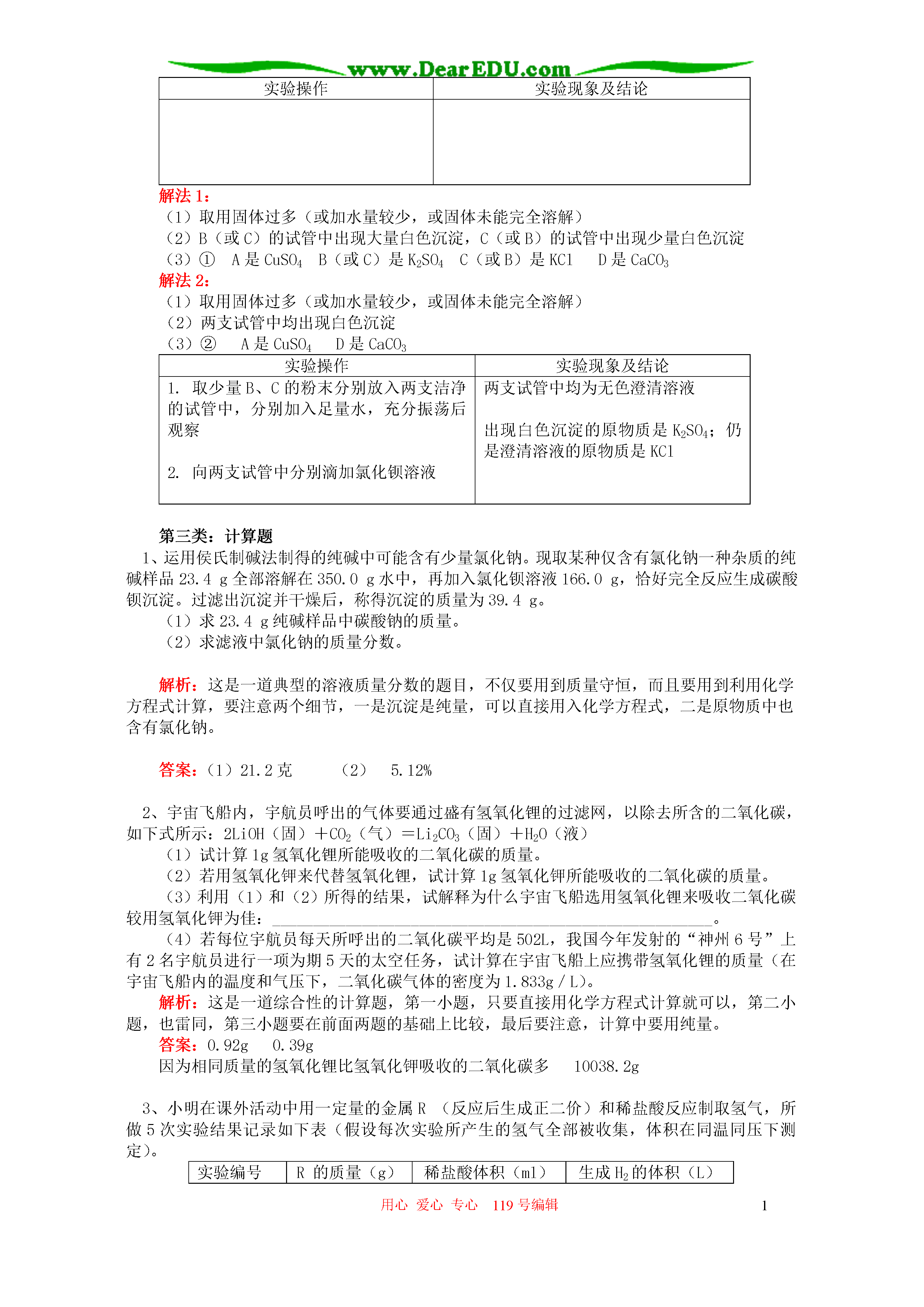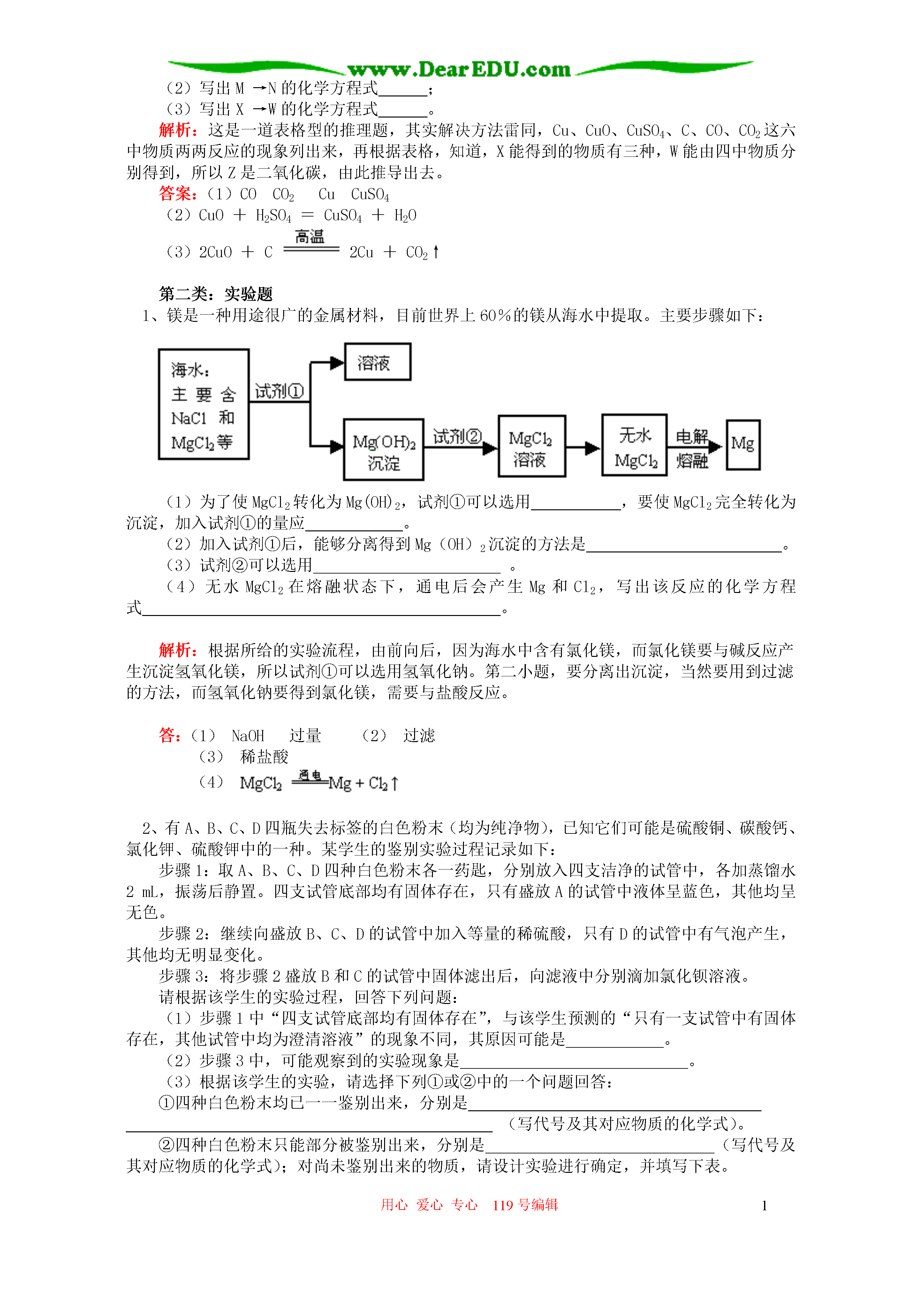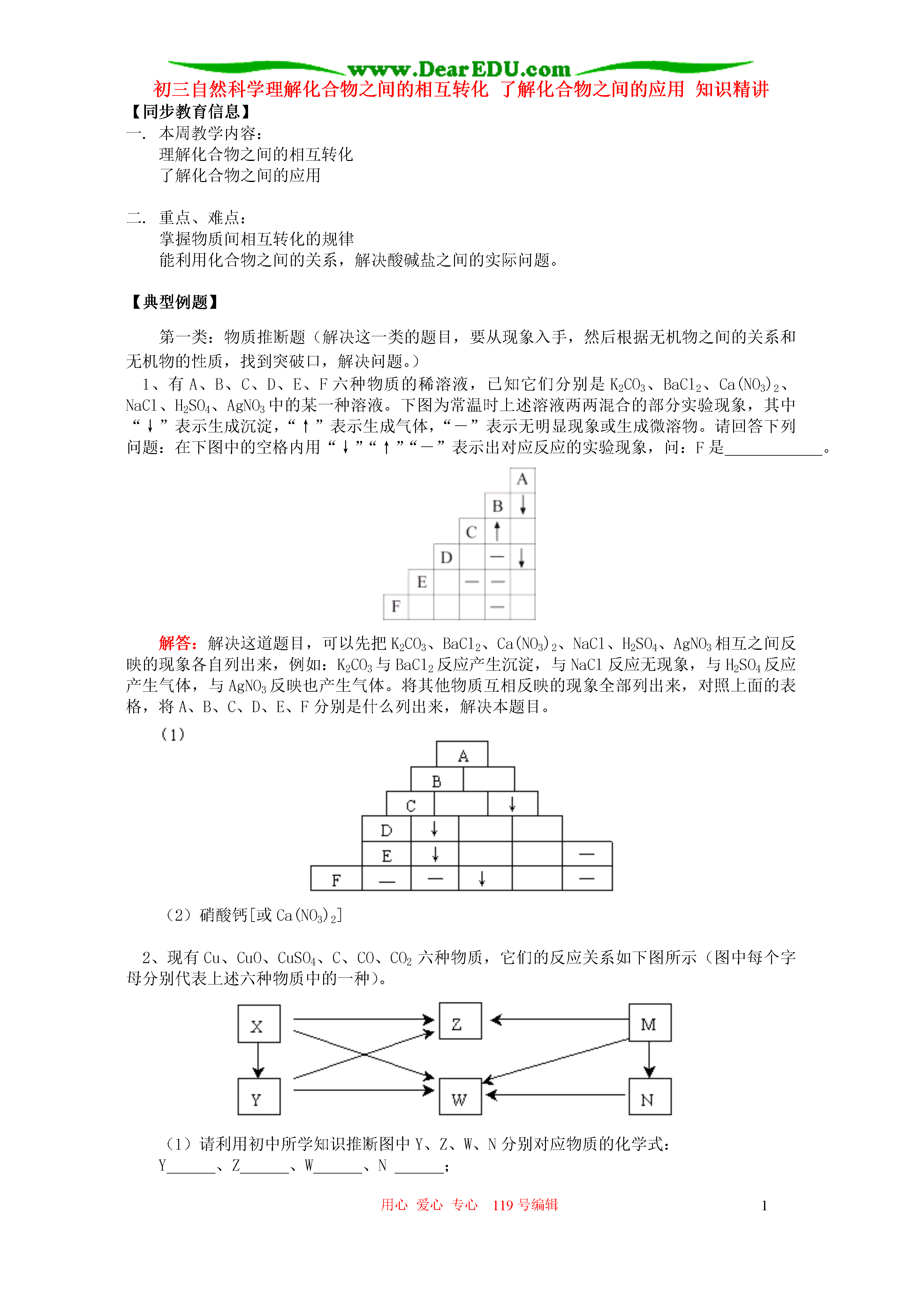 用心爱心专心119号编辑1初三自然科学理解化合物之间的相互转化了解化合物之间的应用知识精讲【同步教育信息】一.本周教学内容:理解化合物之间的相互转化了解化合物之间的应用二.重点、难点:掌握物质间相互转化的规律能利用化合物之间的关系,解决酸碱盐之间的实际问题。【典型例题】第一类:物质推断题(解决这一类的题目,要从现象入手,然后根据无机物之间的关系和无机物的性质,找到突破口,解决问题。)1、有A、B、C、D、E、F六种物质的稀溶液,已知它们分别是K2CO3、BaCl2、Ca(NO3)2、NaCl、H2SO4、AgNO3中的某一种溶液。下图为常温时上述溶液两两混合的部分实验现象,其中“↓”表示生成沉淀,“↑”表示生成气体,“-”表示无明显现象或生成微溶物。请回答下列问题:在下图中的空格内用“↓”“↑”“-”表示出对应反应的实验现象,问:F是。解答:解决这道题目,可以先把K2CO3、BaCl2、Ca(NO3)2、NaCl、H2SO4、AgNO3相互之间反映的现象各自列出来,例如:K2CO3与BaCl2反应产生沉淀,与NaCl反应无现象,与H2SO4反应产生气体,与AgNO3反映也产生气体。将其他物质互相反映的现象全部列出来,对照上面的表格,将A、B、C、D、E、F分别是什么列出来,解决本题目。(2)硝酸钙[或Ca(NO3)2]2、现有Cu、CuO、CuSO4、C、CO、CO2六种物质,它们的反应关系如下图所示(图中每个字母分别代表上述六种物质中的一种)。(1)请利用初中所学知识推断图中Y、Z、W、N分别对应物质的化学式:Y、Z、W、N;(2)写出M→N的化学方程式;(3)写出X→W的化学方程式。解析:这是一道表格型的推理题,其实解决方法雷同,Cu、CuO、CuSO4、C、CO、CO2这六中物质两两反应的现象列出来,再根据表格,知道,X能得到的物质有三种,W能由四中物质分别得到,所以Z是二氧化碳,由此推导出去。答案:(1)COCO2CuCuSO4(2)CuO+H2SO4=CuSO4+H2O(3)2CuO+C2Cu+CO2↑第二类:实验题1、镁是一种用途很广的金属材料,目前世界上60%的镁从海水中提取。主要步骤如下:(1)为了使MgCl2转化为Mg(OH)2,试剂①可以选用,要使MgCl2完全转化为沉淀,加入试剂①的量应。(2)加入试剂①后,能够分离得到Mg(OH)2沉淀的方法是。(3)试剂②可以选用。(4)无水MgCl2在熔融状态下,通电后会产生Mg和Cl2,写出该反应的化学方程式。解析:根据所给的实验流程,由前向后,因为海水中含有氯化镁,而氯化镁要与碱反应产生沉淀氢氧化镁,所以试剂①可以选用氢氧化钠。第二小题,要分离出沉淀,当然要用到过滤的方法,而氢氧化钠要得到氯化镁,需要与盐酸反应。答:(1)NaOH过量(2)过滤(3)稀盐酸(4)2、有A、B、C、D四瓶失去标签的白色粉末(均为纯净物),已知它们可能是硫酸铜、碳酸钙、氯化钾、硫酸钾中的一种。某学生的鉴别实验过程记录如下:步骤1:取A、B、C、D四种白色粉末各一药匙,分别放入四支洁净的试管中,各加蒸馏水2mL,振荡后静置。四支试管底部均有固体存在,只有盛放A的试管中液体呈蓝色,其他均呈无色。步骤2:继续向盛放B、C、D的试管中加入等量的稀硫酸,只有D的试管中有气泡产生,其他均无明显变化。步骤3:将步骤2盛放B和C的试管中固体滤出后,向滤液中分别滴加氯化钡溶液。请根据该学生的实验过程,回答下列问题:(1)步骤1中“四支试管底部均有固体存在”,与该学生预测的“只有一支试管中有固体存在,其他试管中均为澄清溶液”的现象不同,其原因可能是。(2)步骤3中,可能观察到的实验现象是。(3)根据该学生的实验,请选择下列①或②中的一个问题回答:①四种白色粉末均已一一鉴别出来,分别是(写代号及其对应物质的化学式)。②四种白色粉末只能部分被鉴别出来,分别是(写代号及其对应物质的化学式);对尚未鉴别出来的物质,请设计实验进行确定,并填写下表。实验操作实验现象及结论解法1:(1)取用固体过多(或加水量较少,或固体未能完全溶解)(2)B(或C)的试管中出现大量白色沉淀,C(或B)的试管中出现少量白色沉淀(3)①A是CuSO4B(或C)是K2SO4C(或B)是KClD是CaCO3解法2:(1)取用固体过多(或加水量较少,或固体未能完全溶解)(2)两支试管中均出现白色沉淀(3)②A是CuSO4D是CaCO3实验操作实验现象及结论1.取少量B、C的粉末分别放入两支洁净的试管中,分别加入足量水,充分振荡后观察2.向两支试管中分别滴加氯化钡溶液两支试管中均为无色澄清溶液出现白色沉