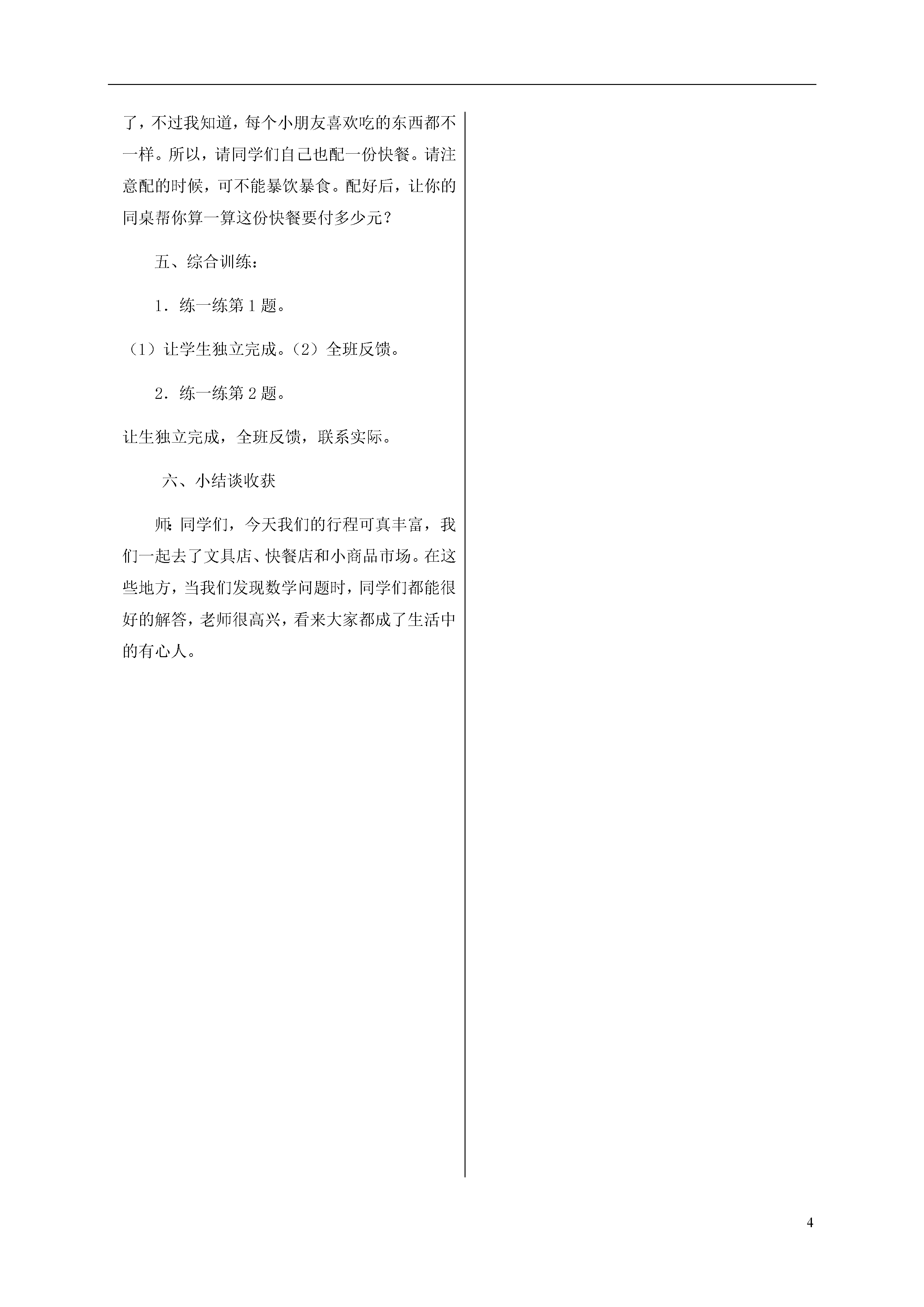 4元、角、分的简单计算元、角、分的简单计算教学目标:1.2.3.教学重点:人民币的换算和计算教学重点:教学难点:自主购买并能计算准确教学难点:教学过程一、创设情境:师:今天是明明的生日,爸爸想送给他一些文具。于是,他们来到了一家文具店。师:同学们,你们看到了什么?……二、自主探究与小组合作师:同学们观察得真仔细。爸爸让明明从这么多的文具中,任意选出两样作为他的生日礼物。同学们,如果你是明明,你会选哪两样呢?请同学们先选一选,选好后和你的同桌互相说一说,最后算一算你所选的两样东西要付多少钱?(1)同桌互相交流。(2)全班反馈。师:大家都选好了吗?谁愿意来说说,你选了哪两样的文具,需要付多少钱呢?并能说说你是怎样算的吗?教师注意鼓励评价:你真棒!其他同学也能和他说的一样好吗?谁还愿意说一说?那你又是怎样算的?让孩子们多说,尤其要关注到后进生。三、质疑答疑:师:通过同学们的回答,老师发现大家巴经学会了与人民币有关的计算。现在,老师也想买一些文具,可是我只有1元钱。请你给老师一些建议,帮老师选一选,1元钱在文具店里,可以买到什么呢?同学们选好后,先和你的同桌说一说。同桌互相交流。全班反馈。师:谁愿意第一个告诉老师你的建议?四、专项训练:小小快餐店。师:同学们,在快餐店里,你看到了什么?生:有:面包、……生:我看到有两个小朋友在购买快餐,其中一个小朋友买了12元的快餐。师:你怎么知道的?师:原来,你是从阿姨的话中获得的信息。那么,如果阿姨没说话,你能知道这份快餐多少元吗?生:能。因为这个小朋友买了1个汉堡包、1份薯条和1瓶饮料.1个汉堡包是6元,1份薯条是4元,1瓶饮料是2元,只要把它们相加,就知道是多少钱了。师:说得不错。那么,你能算算吗?生:6+4+2=12(元)。师:XX同学运用自己学到的数学知识,很好地解决了快餐问题。接着老师就要请大家用餐了,不过我知道,每个小朋友喜欢吃的东西都不一样。所以,请同学们自己也配一份快餐。请注意配的时候,可不能暴饮暴食。配好后,让你的同桌帮你算一算这份快餐要付多少元?五、综合训练:1.练一练第1题。(1)让学生独立完成。(2)全班反馈。2.练一练第2题。让生独立完成,全班反馈,联系实际。六、小结谈收获师:同学们,今天我们的行程可真丰富,我们一起去了文具店、快餐店和小商品市场。在这些地方,当我们发现数学问题时,同学们都能很好的解答,老师很高兴,看来大家都成了生活中的有心人。创设情境:自主探究与小组合作质疑答疑:专项训练:综合训练:小结谈收获: