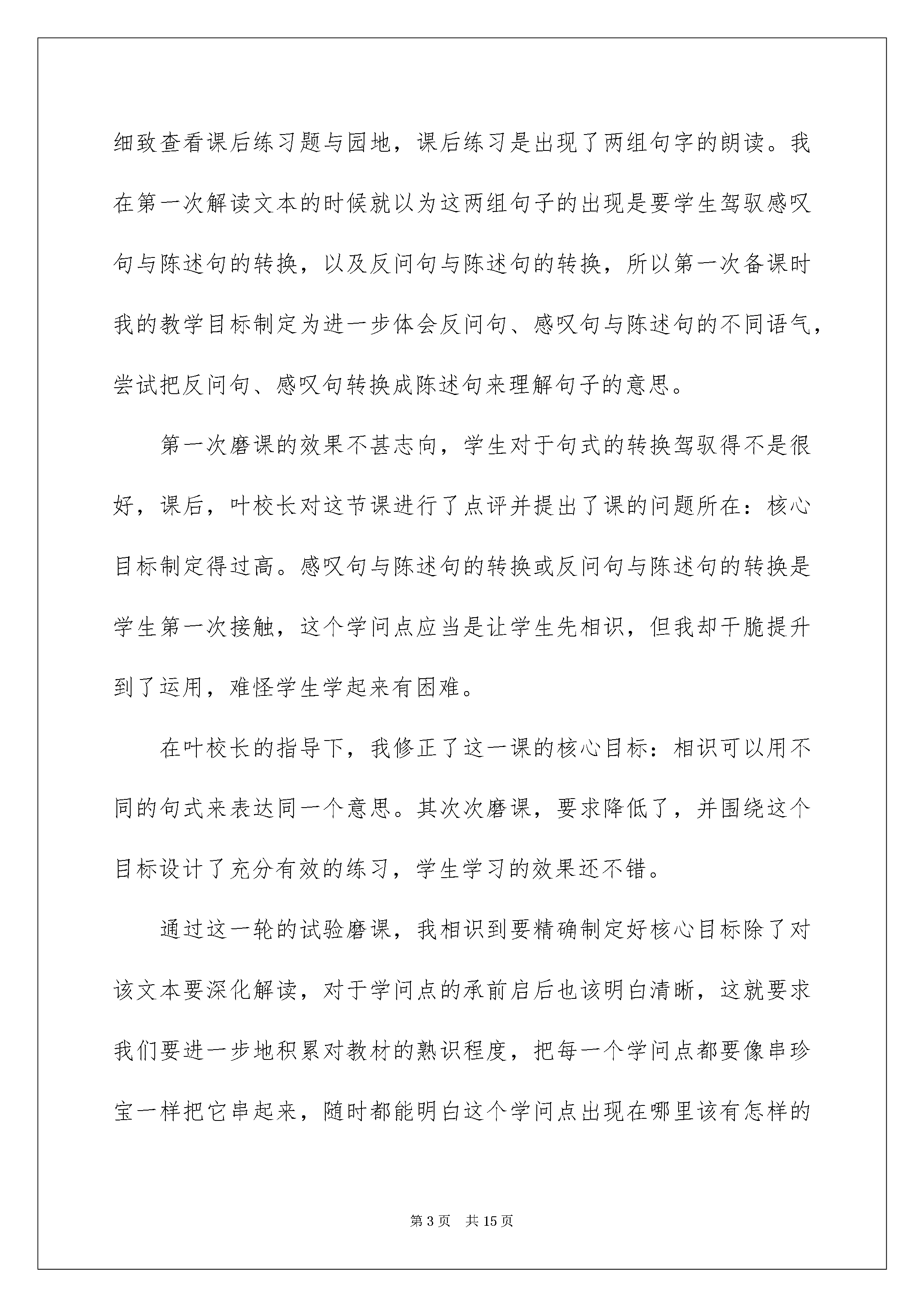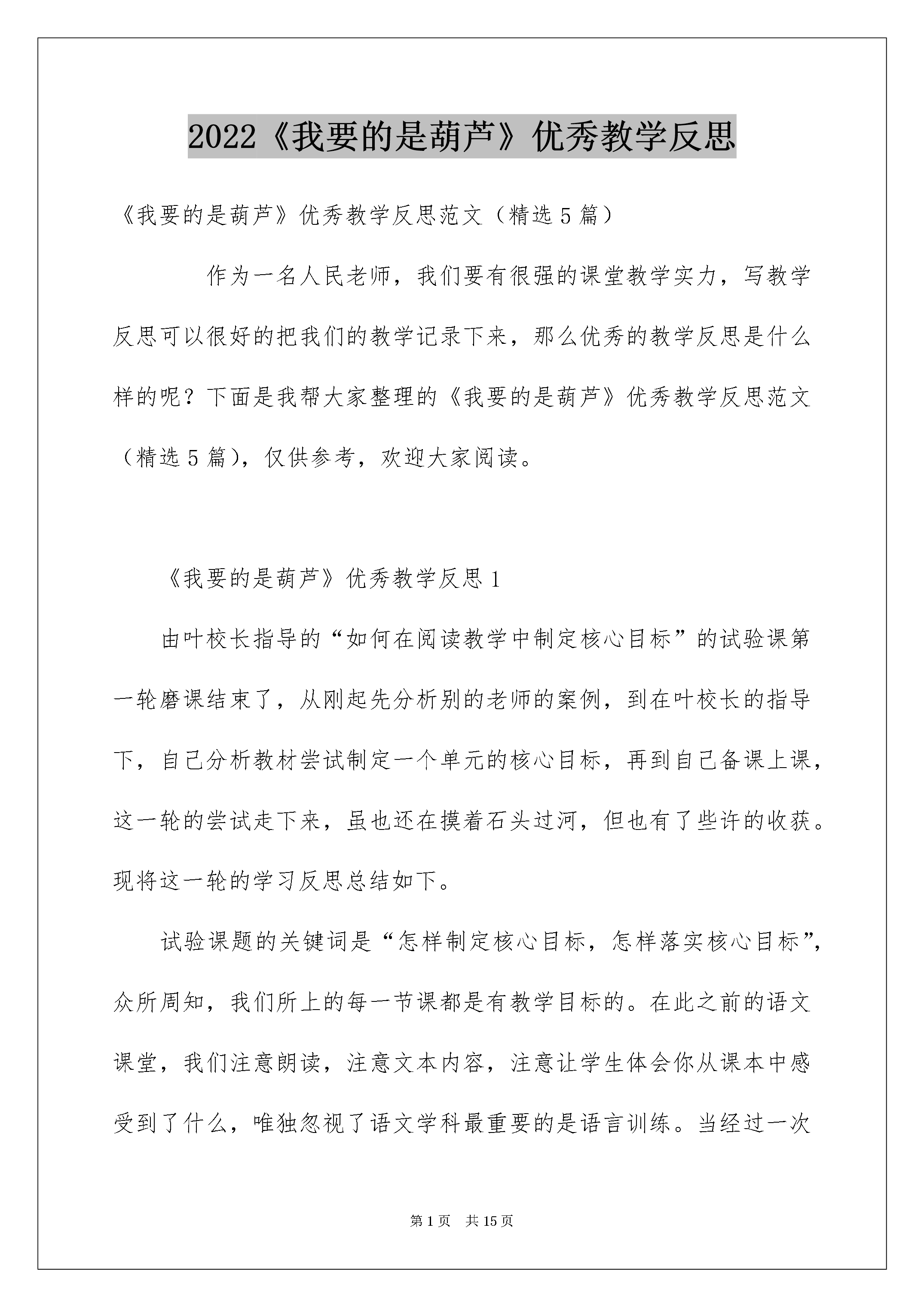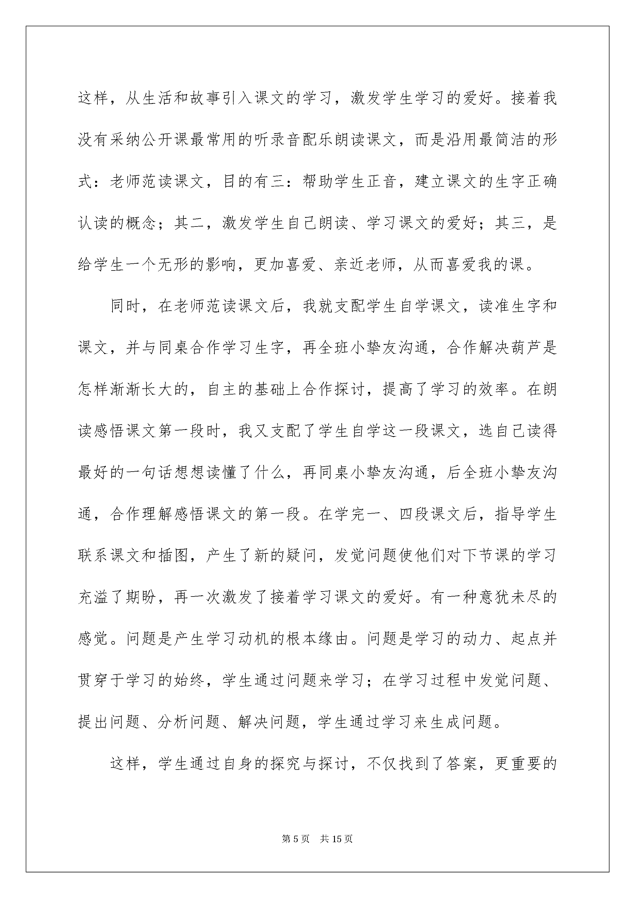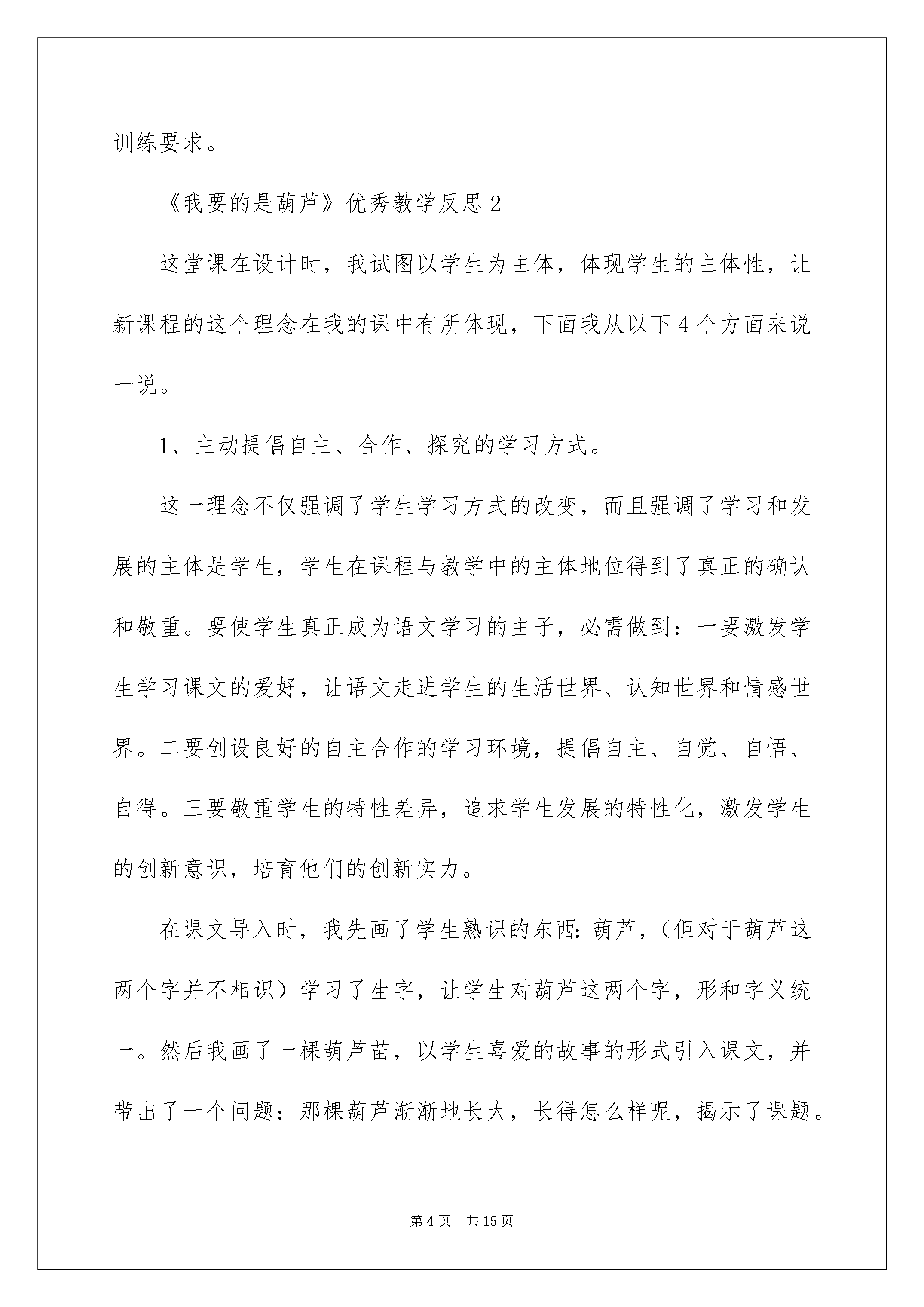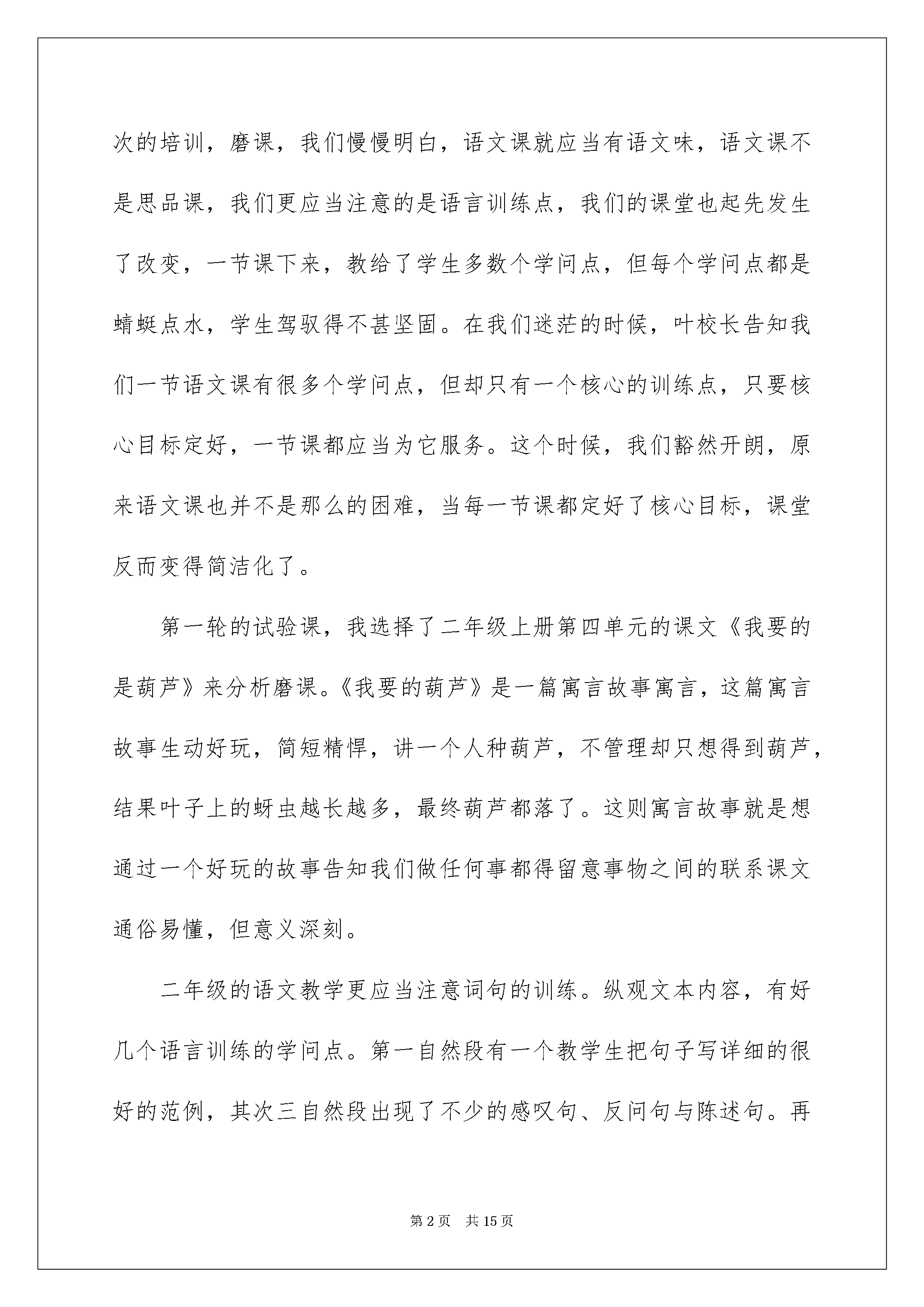 2022《我要的是葫芦》优秀教学反思《我要的是葫芦》优秀教学反思范文(精选5篇)作为一名人民老师,我们要有很强的课堂教学实力,写教学反思可以很好的把我们的教学记录下来,那么优秀的教学反思是什么样的呢?下面是我帮大家整理的《我要的是葫芦》优秀教学反思范文(精选5篇),仅供参考,欢迎大家阅读。《我要的是葫芦》优秀教学反思1由叶校长指导的“如何在阅读教学中制定核心目标”的试验课第一轮磨课结束了,从刚起先分析别的老师的案例,到在叶校长的指导下,自己分析教材尝试制定一个单元的核心目标,再到自己备课上课,这一轮的尝试走下来,虽也还在摸着石头过河,但也有了些许的收获。现将这一轮的学习反思总结如下。试验课题的关键词是“怎样制定核心目标,怎样落实核心目标”,众所周知,我们所上的每一节课都是有教学目标的。在此之前的语文课堂,我们注意朗读,注意文本内容,注意让学生体会你从课本中感受到了什么,唯独忽视了语文学科最重要的是语言训练。当经过一次次的培训,磨课,我们慢慢明白,语文课就应当有语文味,语文课不是思品课,我们更应当注意的是语言训练点,我们的课堂也起先发生了改变,一节课下来,教给了学生多数个学问点,但每个学问点都是蜻蜓点水,学生驾驭得不甚坚固。在我们迷茫的时候,叶校长告知我们一节语文课有很多个学问点,但却只有一个核心的训练点,只要核心目标定好,一节课都应当为它服务。这个时候,我们豁然开朗,原来语文课也并不是那么的困难,当每一节课都定好了核心目标,课堂反而变得简洁化了。第一轮的试验课,我选择了二年级上册第四单元的课文《我要的是葫芦》来分析磨课。《我要的葫芦》是一篇寓言故事寓言,这篇寓言故事生动好玩,简短精悍,讲一个人种葫芦,不管理却只想得到葫芦,结果叶子上的蚜虫越长越多,最终葫芦都落了。这则寓言故事就是想通过一个好玩的故事告知我们做任何事都得留意事物之间的联系课文通俗易懂,但意义深刻。二年级的语文教学更应当注意词句的训练。纵观文本内容,有好几个语言训练的学问点。第一自然段有一个教学生把句子写详细的很好的范例,其次三自然段出现了不少的感叹句、反问句与陈述句。再细致查看课后练习题与园地,课后练习是出现了两组句字的朗读。我在第一次解读文本的时候就以为这两组句子的出现是要学生驾驭感叹句与陈述句的转换,以及反问句与陈述句的转换,所以第一次备课时我的教学目标制定为进一步体会反问句、感叹句与陈述句的不同语气,尝试把反问句、感叹句转换成陈述句来理解句子的意思。第一次磨课的效果不甚志向,学生对于句式的转换驾驭得不是很好,课后,叶校长对这节课进行了点评并提出了课的问题所在:核心目标制定得过高。感叹句与陈述句的转换或反问句与陈述句的转换是学生第一次接触,这个学问点应当是让学生先相识,但我却干脆提升到了运用,难怪学生学起来有困难。在叶校长的指导下,我修正了这一课的核心目标:相识可以用不同的句式来表达同一个意思。其次次磨课,要求降低了,并围绕这个目标设计了充分有效的练习,学生学习的效果还不错。通过这一轮的试验磨课,我相识到要精确制定好核心目标除了对该文本要深化解读,对于学问点的承前启后也该明白清晰,这就要求我们要进一步地积累对教材的熟识程度,把每一个学问点都要像串珍宝一样把它串起来,随时都能明白这个学问点出现在哪里该有怎样的训练要求。《我要的是葫芦》优秀教学反思2这堂课在设计时,我试图以学生为主体,体现学生的主体性,让新课程的这个理念在我的课中有所体现,下面我从以下4个方面来说一说。1、主动提倡自主、合作、探究的学习方式。这一理念不仅强调了学生学习方式的改变,而且强调了学习和发展的主体是学生,学生在课程与教学中的主体地位得到了真正的确认和敬重。要使学生真正成为语文学习的主子,必需做到:一要激发学生学习课文的爱好,让语文走进学生的生活世界、认知世界和情感世界。二要创设良好的自主合作的学习环境,提倡自主、自觉、自悟、自得。三要敬重学生的特性差异,追求学生发展的特性化,激发学生的创新意识,培育他们的创新实力。在课文导入时,我先画了学生熟识的东西:葫芦,(但对于葫芦这两个字并不相识)学习了生字,让学生对葫芦这两个字,形和字义统一。然后我画了一棵葫芦苗,以学生喜爱的故事的形式引入课文,并带出了一个问题:那棵葫芦渐渐地长大,长得怎么样呢,揭示了课题。这样,从生活和故事引入课文的学习,激发学生学习的爱好。接着我没有采纳公开课最常用的听录音配乐朗读课文,而是沿用最简洁的形式:老师范读课文,目的有三:帮助学生正音,建立课文的生字正确认读的概念;其二,激发学生自己朗读、学习课文的爱好;其三,是给学生一个无形的影响,更加喜爱、亲近老师,从而