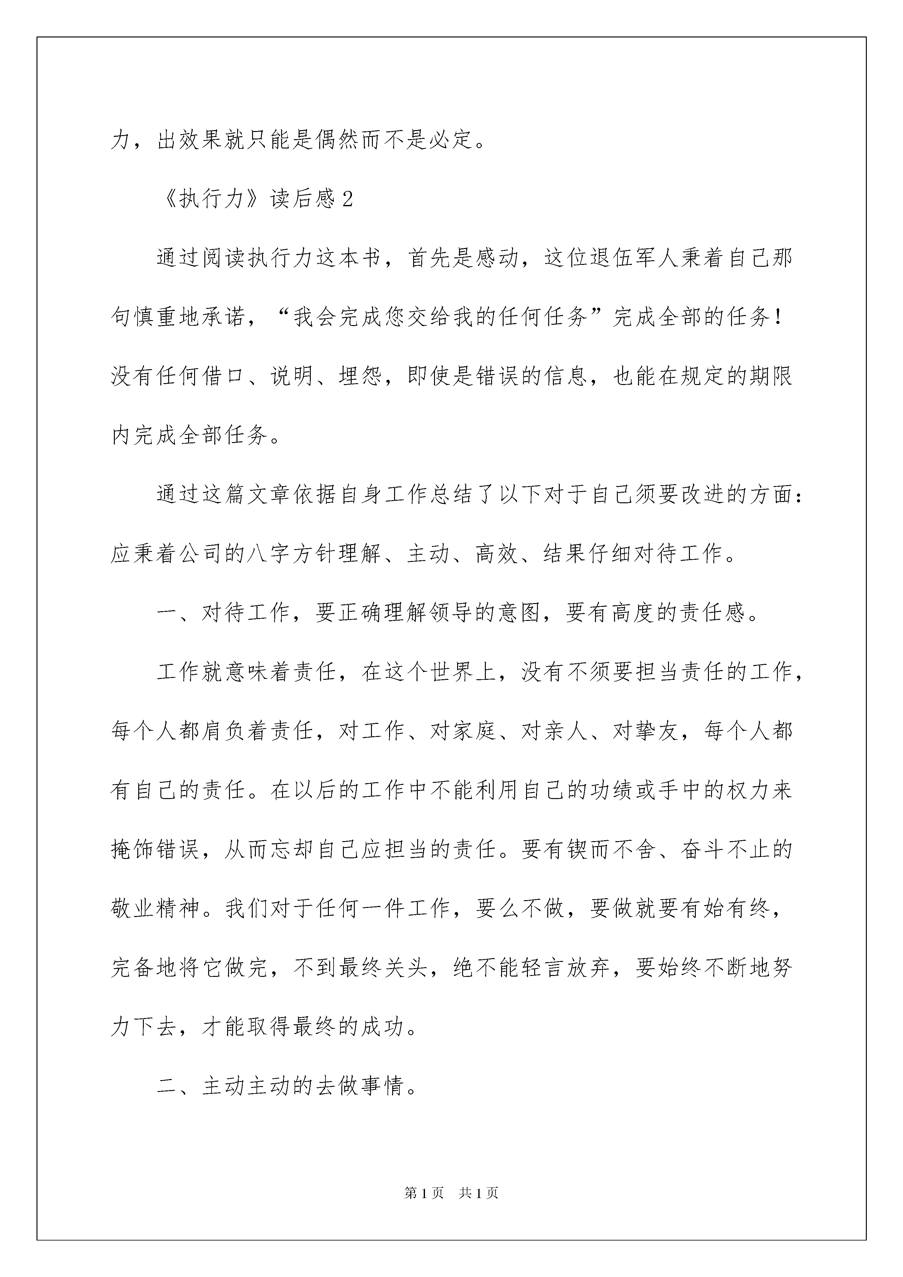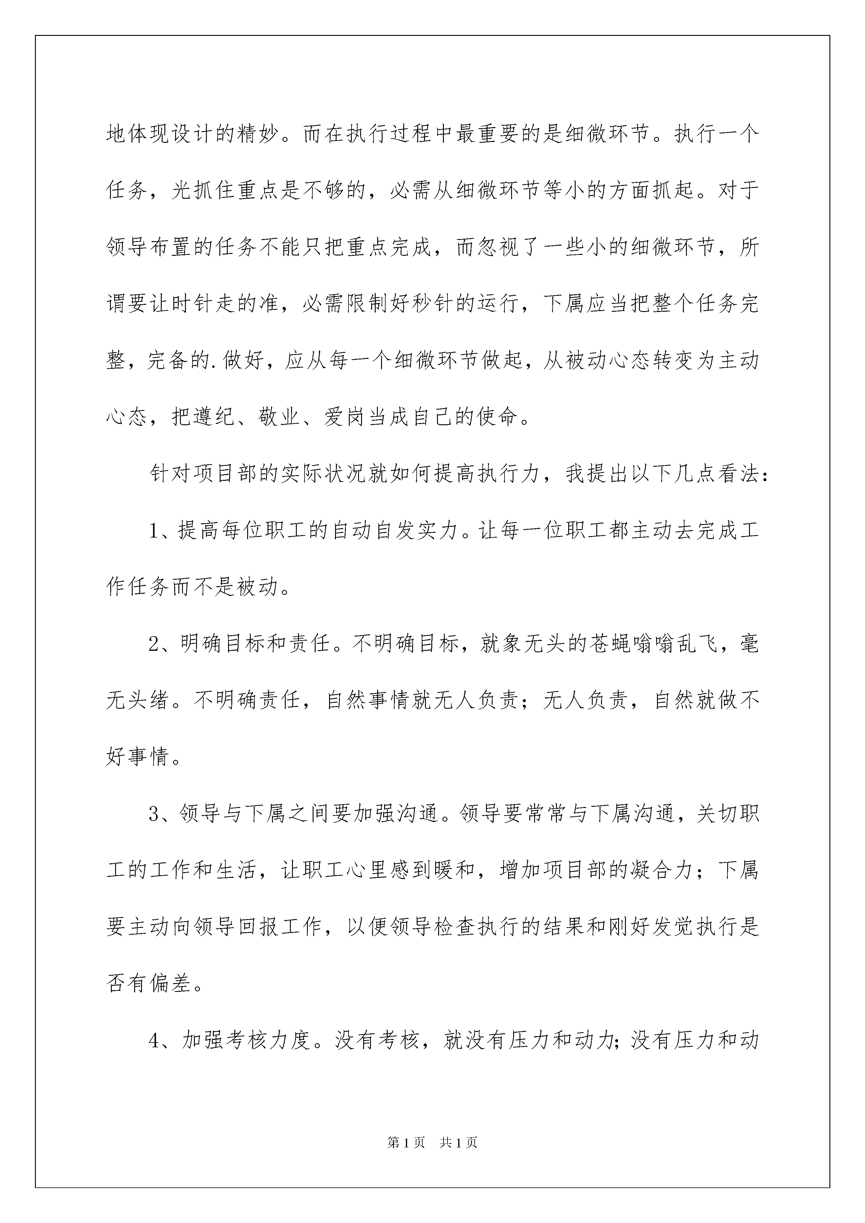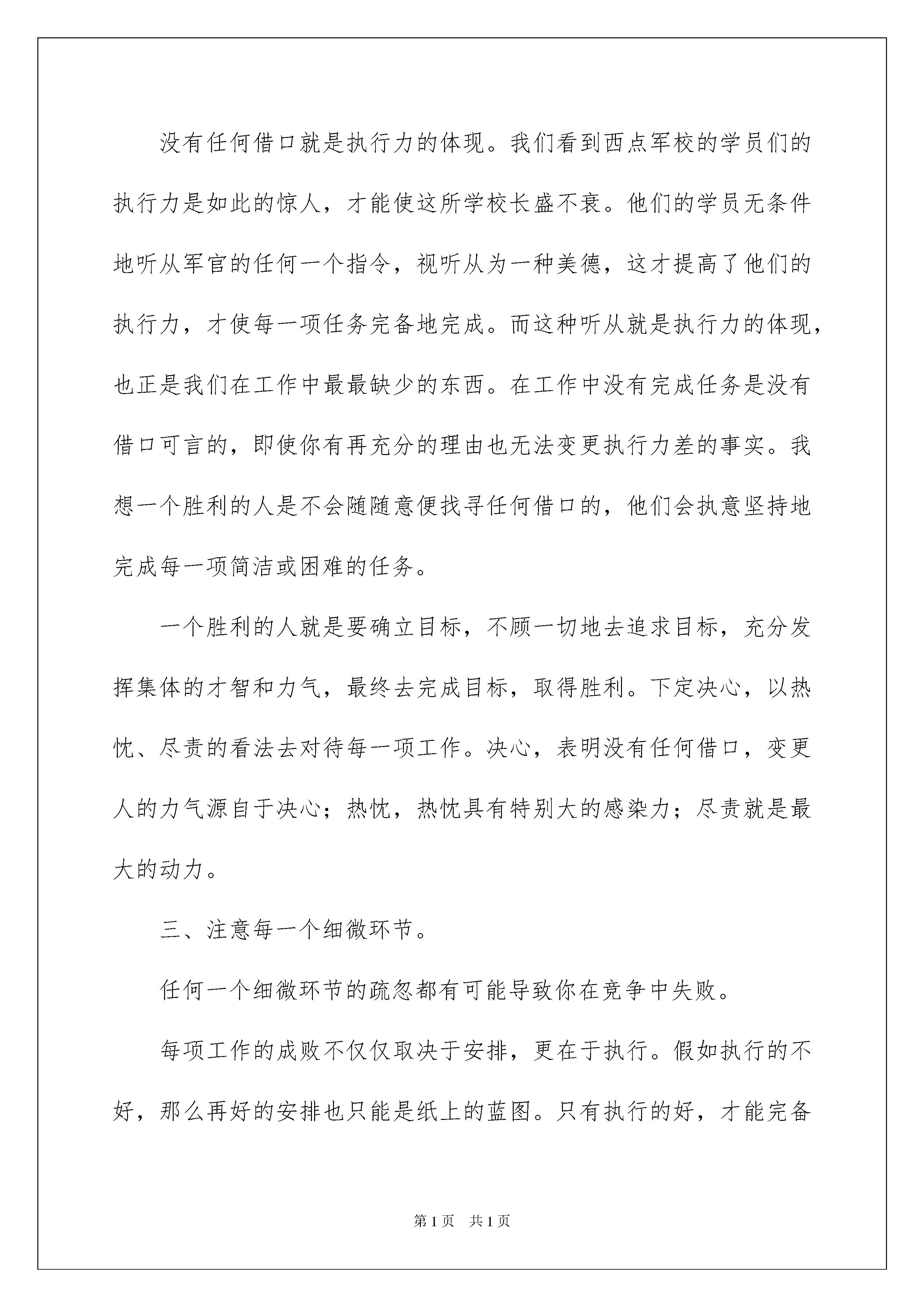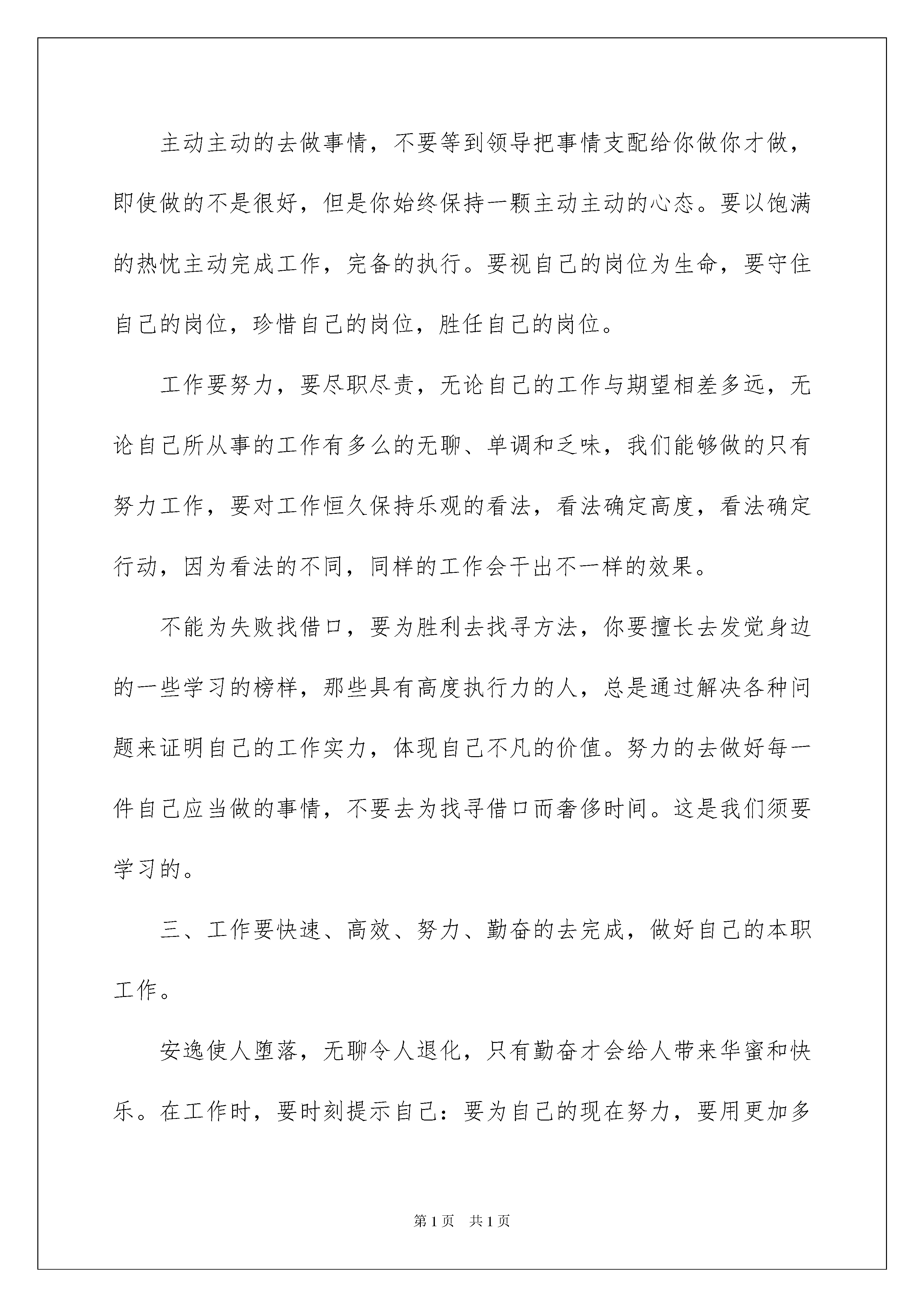 2022《执行力》读后感《执行力》读后感范文(精选3篇)细细品尝一本名著后,你有什么体会呢?何不写一篇读后感记录下呢?那么我们该怎么去写读后感呢?以下是我整理的《执行力》读后感范文(精选3篇),欢迎大家借鉴与参考,希望对大家有所帮助。《执行力》读后感1听了余世维先生讲的《执行力》,有很深的感受,对于如何经营好一个企业他提出了许多独特的见解,作为一般职工的我,对以下几点体会最深:一、按质按量完成自己的工作任务。不管是处于项目哪个部门的职工,每个人都能做到这一点,就没有做不好的事,就没有实现不了的目标,那么我们项目的生产经营安排就能完成。而事实上许多人没能做到这一点,还有较多的人是做一天和尚撞一天钟,甚至个别职工连钟都没有撞响,没有尽到自己的岗位职责。二、没有任何借口。没有任何借口就是执行力的体现。我们看到西点军校的学员们的执行力是如此的惊人,才能使这所学校长盛不衰。他们的学员无条件地听从军官的任何一个指令,视听从为一种美德,这才提高了他们的执行力,才使每一项任务完备地完成。而这种听从就是执行力的体现,也正是我们在工作中最最缺少的东西。在工作中没有完成任务是没有借口可言的,即使你有再充分的理由也无法变更执行力差的事实。我想一个胜利的人是不会随随意便找寻任何借口的,他们会执意坚持地完成每一项简洁或困难的任务。一个胜利的人就是要确立目标,不顾一切地去追求目标,充分发挥集体的才智和力气,最终去完成目标,取得胜利。下定决心,以热忱、尽责的看法去对待每一项工作。决心,表明没有任何借口,变更人的力气源自于决心;热忱,热忱具有特别大的感染力;尽责就是最大的动力。三、注意每一个细微环节。任何一个细微环节的疏忽都有可能导致你在竞争中失败。每项工作的成败不仅仅取决于安排,更在于执行。假如执行的不好,那么再好的安排也只能是纸上的蓝图。只有执行的好,才能完备地体现设计的精妙。而在执行过程中最重要的是细微环节。执行一个任务,光抓住重点是不够的,必需从细微环节等小的方面抓起。对于领导布置的任务不能只把重点完成,而忽视了一些小的细微环节,所谓要让时针走的准,必需限制好秒针的运行,下属应当把整个任务完整,完备的.做好,应从每一个细微环节做起,从被动心态转变为主动心态,把遵纪、敬业、爱岗当成自己的使命。针对项目部的实际状况就如何提高执行力,我提出以下几点看法:1、提高每位职工的自动自发实力。让每一位职工都主动去完成工作任务而不是被动。2、明确目标和责任。不明确目标,就象无头的苍蝇嗡嗡乱飞,毫无头绪。不明确责任,自然事情就无人负责;无人负责,自然就做不好事情。3、领导与下属之间要加强沟通。领导要常常与下属沟通,关切职工的工作和生活,让职工心里感到暖和,增加项目部的凝合力;下属要主动向领导回报工作,以便领导检查执行的结果和刚好发觉执行是否有偏差。4、加强考核力度。没有考核,就没有压力和动力;没有压力和动力,出效果就只能是偶然而不是必定。《执行力》读后感2通过阅读执行力这本书,首先是感动,这位退伍军人秉着自己那句慎重地承诺,“我会完成您交给我的任何任务”完成全部的任务!没有任何借口、说明、埋怨,即使是错误的信息,也能在规定的期限内完成全部任务。通过这篇文章依据自身工作总结了以下对于自己须要改进的方面:应秉着公司的八字方针理解、主动、高效、结果仔细对待工作。一、对待工作,要正确理解领导的意图,要有高度的责任感。工作就意味着责任,在这个世界上,没有不须要担当责任的工作,每个人都肩负着责任,对工作、对家庭、对亲人、对挚友,每个人都有自己的责任。在以后的工作中不能利用自己的功绩或手中的权力来掩饰错误,从而忘却自己应担当的责任。要有锲而不舍、奋斗不止的敬业精神。我们对于任何一件工作,要么不做,要做就要有始有终,完备地将它做完,不到最终关头,绝不能轻言放弃,要始终不断地努力下去,才能取得最终的成功。二、主动主动的去做事情。主动主动的去做事情,不要等到领导把事情支配给你做你才做,即使做的不是很好,但是你始终保持一颗主动主动的心态。要以饱满的热忱主动完成工作,完备的执行。要视自己的岗位为生命,要守住自己的岗位,珍惜自己的岗位,胜任自己的岗位。工作要努力,要尽职尽责,无论自己的工作与期望相差多远,无论自己所从事的工作有多么的无聊、单调和乏味,我们能够做的只有努力工作,要对工作恒久保持乐观的看法,看法确定高度,看法确定行动,因为看法的不同,同样的工作会干出不一样的效果。不能为失败找借口,要为胜利去找寻方法,你要擅长去发觉身边的一些学习的榜样,那些具有高度执行力的人,总是通过解决各种问题来证明自己的工作实力,体现自己不凡的价值。努力的去