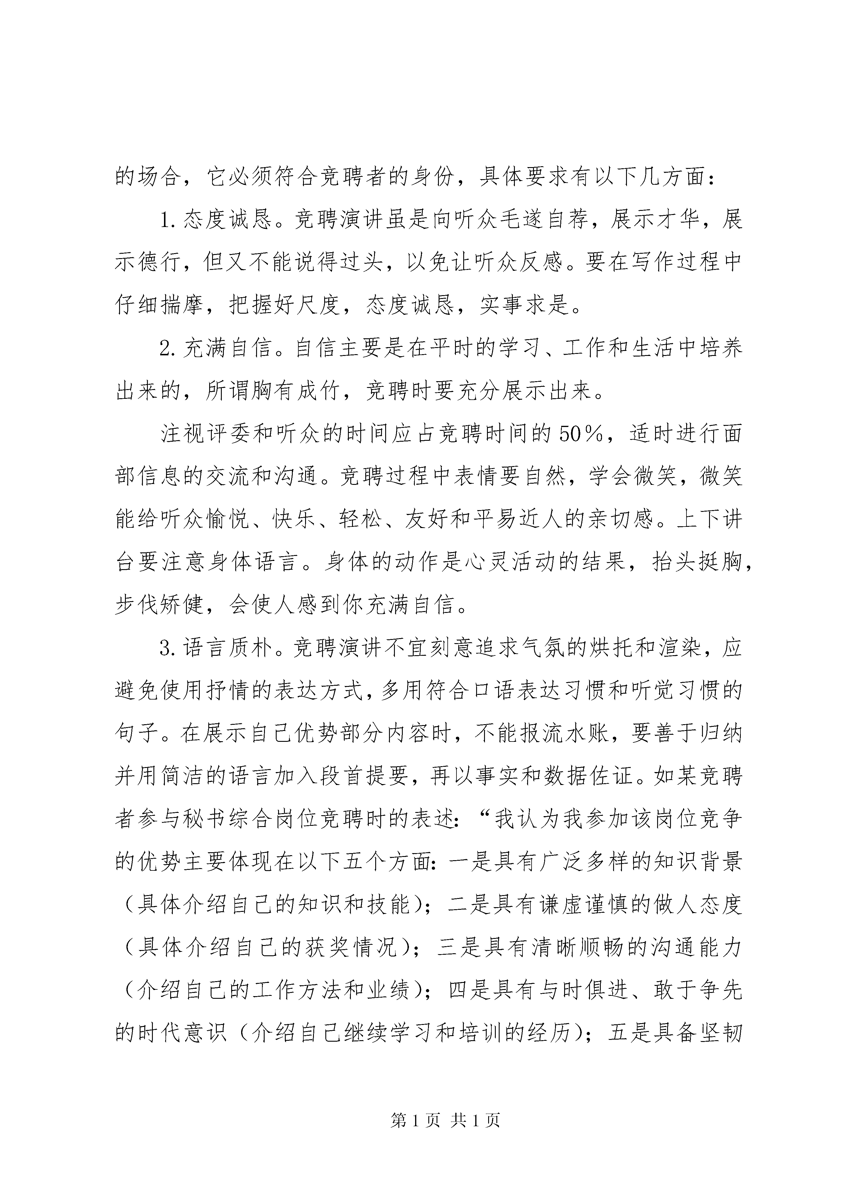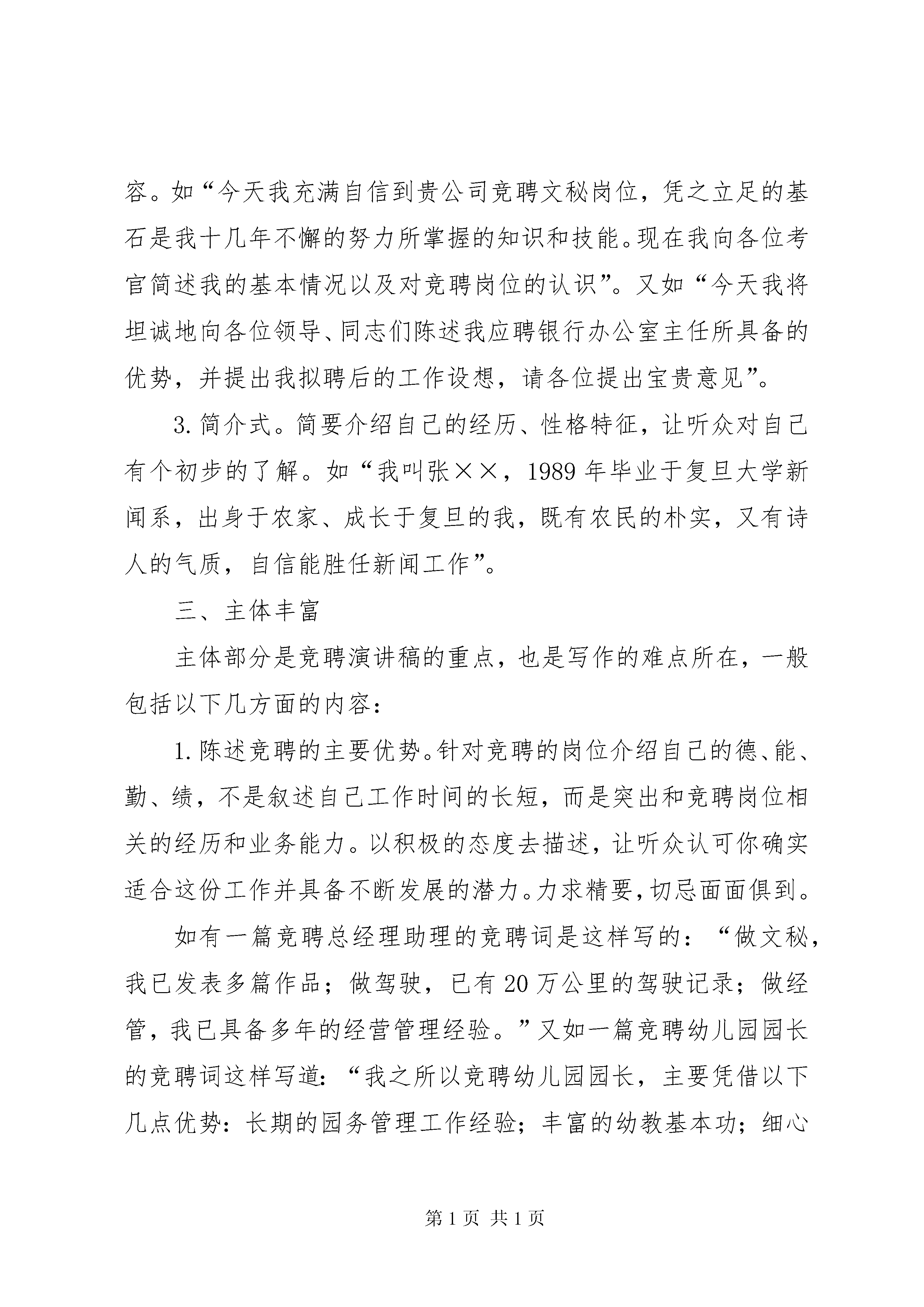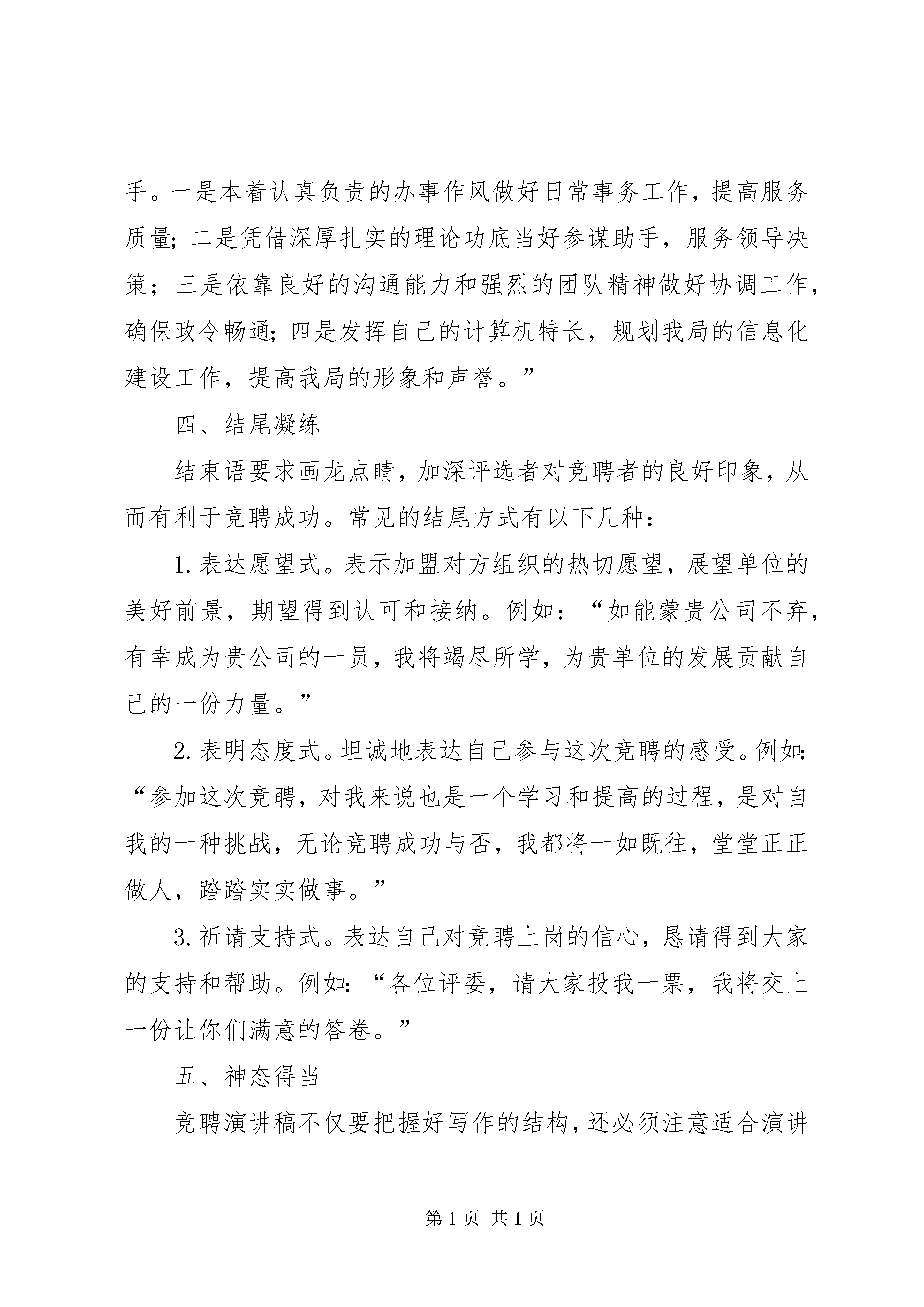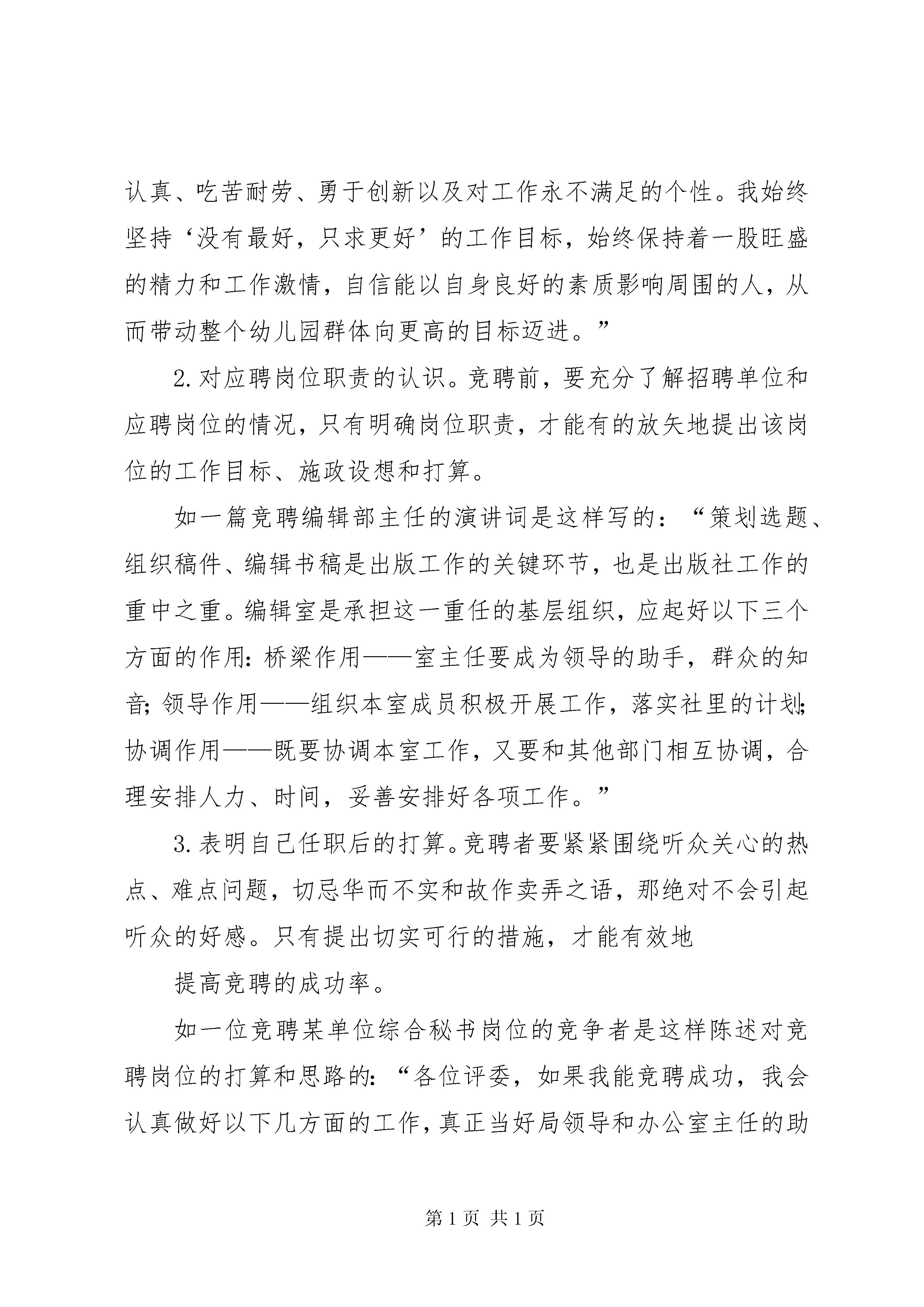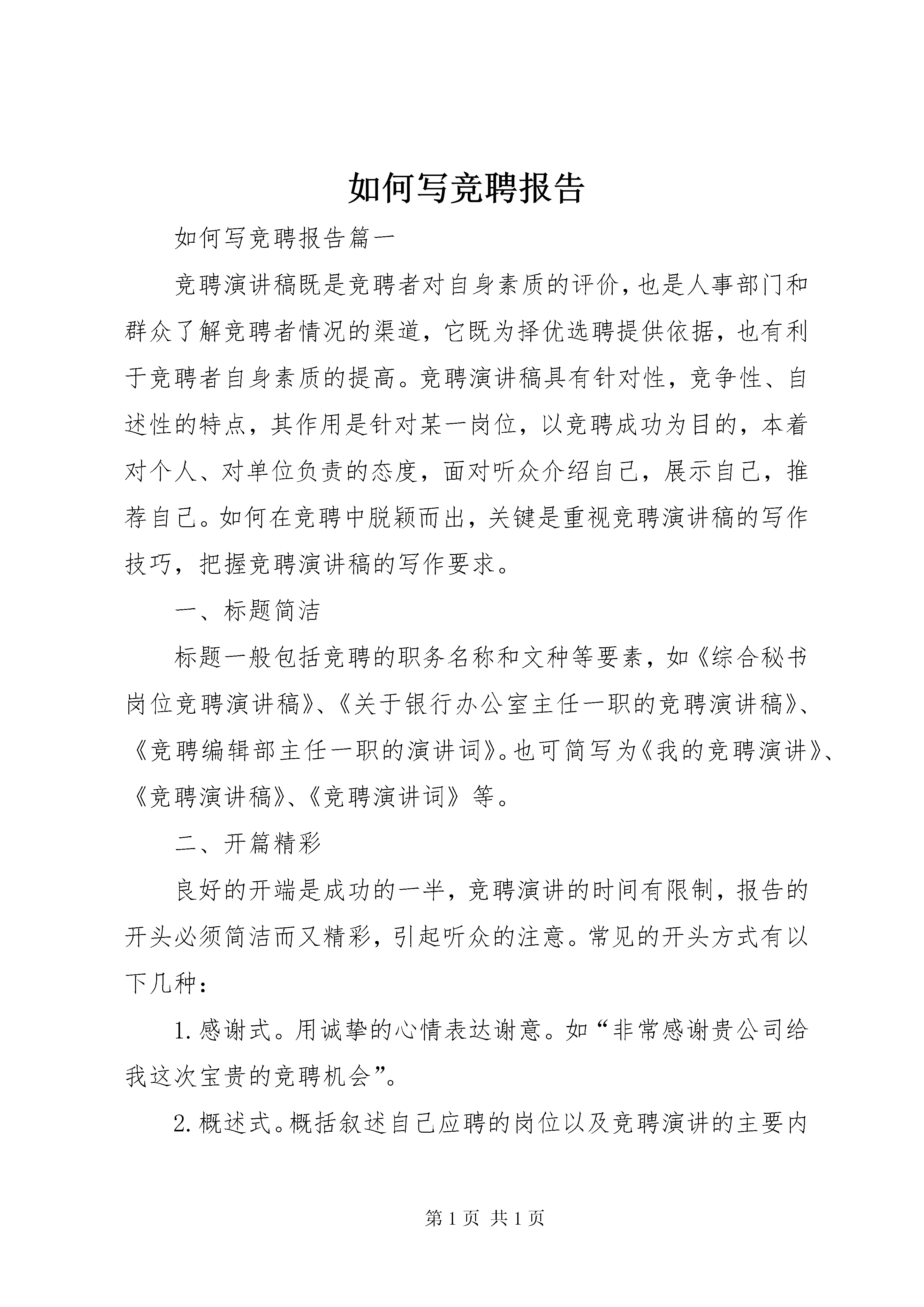 如何写竞聘报告如何写竞聘报告篇一竞聘演讲稿既是竞聘者对自身素质的评价,也是人事部门和群众了解竞聘者情况的渠道,它既为择优选聘提供依据,也有利于竞聘者自身素质的提高。竞聘演讲稿具有针对性,竞争性、自述性的特点,其作用是针对某一岗位,以竞聘成功为目的,本着对个人、对单位负责的态度,面对听众介绍自己,展示自己,推荐自己。如何在竞聘中脱颖而出,关键是重视竞聘演讲稿的写作技巧,把握竞聘演讲稿的写作要求。一、标题简洁标题一般包括竞聘的职务名称和文种等要素,如《综合秘书岗位竞聘演讲稿》、《关于银行办公室主任一职的竞聘演讲稿》、《竞聘编辑部主任一职的演讲词》。也可简写为《我的竞聘演讲》、《竞聘演讲稿》、《竞聘演讲词》等。二、开篇精彩良好的开端是成功的一半,竞聘演讲的时间有限制,报告的开头必须简洁而又精彩,引起听众的注意。常见的开头方式有以下几种:1.感谢式。用诚挚的心情表达谢意。如“非常感谢贵公司给我这次宝贵的竞聘机会”。2.概述式。概括叙述自己应聘的岗位以及竞聘演讲的主要内容。如“今天我充满自信到贵公司竞聘文秘岗位,凭之立足的基石是我十几年不懈的努力所掌握的知识和技能。现在我向各位考官简述我的基本情况以及对竞聘岗位的认识”。又如“今天我将坦诚地向各位领导、同志们陈述我应聘银行办公室主任所具备的优势,并提出我拟聘后的工作设想,请各位提出宝贵意见”。3.简介式。简要介绍自己的经历、性格特征,让听众对自己有个初步的了解。如“我叫张××,1989年毕业于复旦大学新闻系,出身于农家、成长于复旦的我,既有农民的朴实,又有诗人的气质,自信能胜任新闻工作”。三、主体丰富主体部分是竞聘演讲稿的重点,也是写作的难点所在,一般包括以下几方面的内容:1.陈述竞聘的主要优势。针对竞聘的岗位介绍自己的德、能、勤、绩,不是叙述自己工作时间的长短,而是突出和竞聘岗位相关的经历和业务能力。以积极的态度去描述,让听众认可你确实适合这份工作并具备不断发展的潜力。力求精要,切忌面面俱到。如有一篇竞聘总经理助理的竞聘词是这样写的:“做文秘,我已发表多篇作品;做驾驶,已有20万公里的驾驶记录;做经管,我已具备多年的经营管理经验。”又如一篇竞聘幼儿园园长的竞聘词这样写道:“我之所以竞聘幼儿园园长,主要凭借以下几点优势:长期的园务管理工作经验;丰富的幼教基本功;细心认真、吃苦耐劳、勇于创新以及对工作永不满足的个性。我始终坚持‘没有最好,只求更好’的工作目标,始终保持着一股旺盛的精力和工作激情,自信能以自身良好的素质影响周围的人,从而带动整个幼儿园群体向更高的目标迈进。”2.对应聘岗位职责的认识。竞聘前,要充分了解招聘单位和应聘岗位的情况,只有明确岗位职责,才能有的放矢地提出该岗位的工作目标、施政设想和打算。如一篇竞聘编辑部主任的演讲词是这样写的:“策划选题、组织稿件、编辑书稿是出版工作的关键环节,也是出版社工作的重中之重。编辑室是承担这一重任的基层组织,应起好以下三个方面的作用:桥梁作用——室主任要成为领导的助手,群众的知音;领导作用——组织本室成员积极开展工作,落实社里的计划;协调作用——既要协调本室工作,又要和其他部门相互协调,合理安排人力、时间,妥善安排好各项工作。”3.表明自己任职后的打算。竞聘者要紧紧围绕听众关心的热点、难点问题,切忌华而不实和故作卖弄之语,那绝对不会引起听众的好感。只有提出切实可行的措施,才能有效地提高竞聘的成功率。如一位竞聘某单位综合秘书岗位的竞争者是这样陈述对竞聘岗位的打算和思路的:“各位评委,如果我能竞聘成功,我会认真做好以下几方面的工作,真正当好局领导和办公室主任的助手。一是本着认真负责的办事作风做好日常事务工作,提高服务质量;二是凭借深厚扎实的理论功底当好参谋助手,服务领导决策;三是依靠良好的沟通能力和强烈的团队精神做好协调工作,确保政令畅通;四是发挥自己的计算机特长,规划我局的信息化建设工作,提高我局的形象和声誉。”四、结尾凝练结束语要求画龙点睛,加深评选者对竞聘者的良好印象,从而有利于竞聘成功。常见的结尾方式有以下几种:1.表达愿望式。表示加盟对方组织的热切愿望,展望单位的美好前景,期望得到认可和接纳。例如:“如能蒙贵公司不弃,有幸成为贵公司的一员,我将竭尽所学,为贵单位的发展贡献自己的一份力量。”2.表明态度式。坦诚地表达自己参与这次竞聘的感受。例如:“参加这次竞聘,对我来说也是一个学习和提高的过程,是对自我的一种挑战,无论竞聘成功与否,我都将一如既往,堂堂正正做人,踏踏实实做事。”3.祈请支持式。表达自己对竞聘上岗的信心,恳请得到大家的支持和帮助。例如:“各位评委,请大家投我一票,我将交上一份让你们满意的答卷。”五、神态得当竞聘演讲稿不仅要把握好写作的结构,还必须注意适合演讲的场合,它必须符合竞聘者的身份,具体要求有