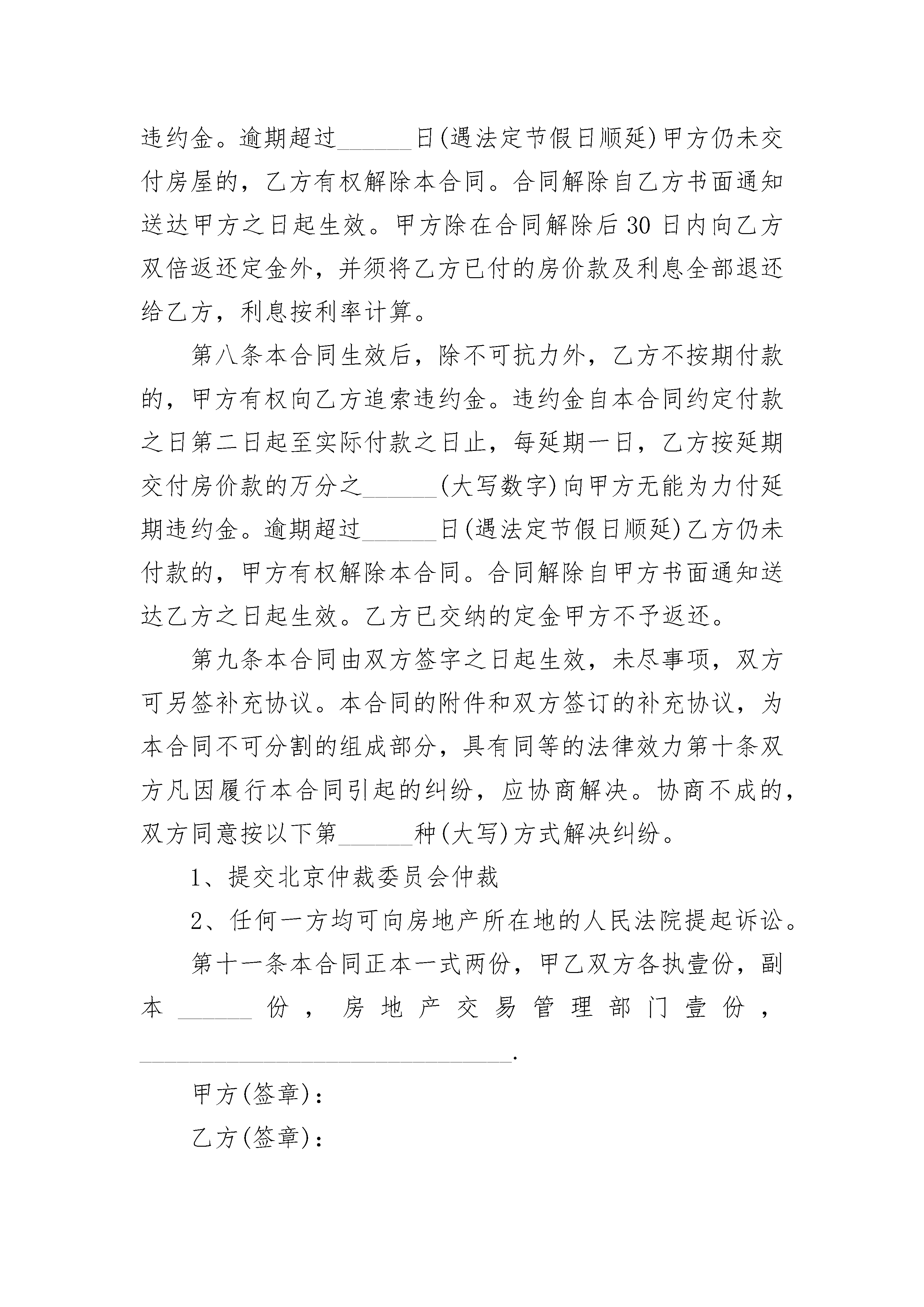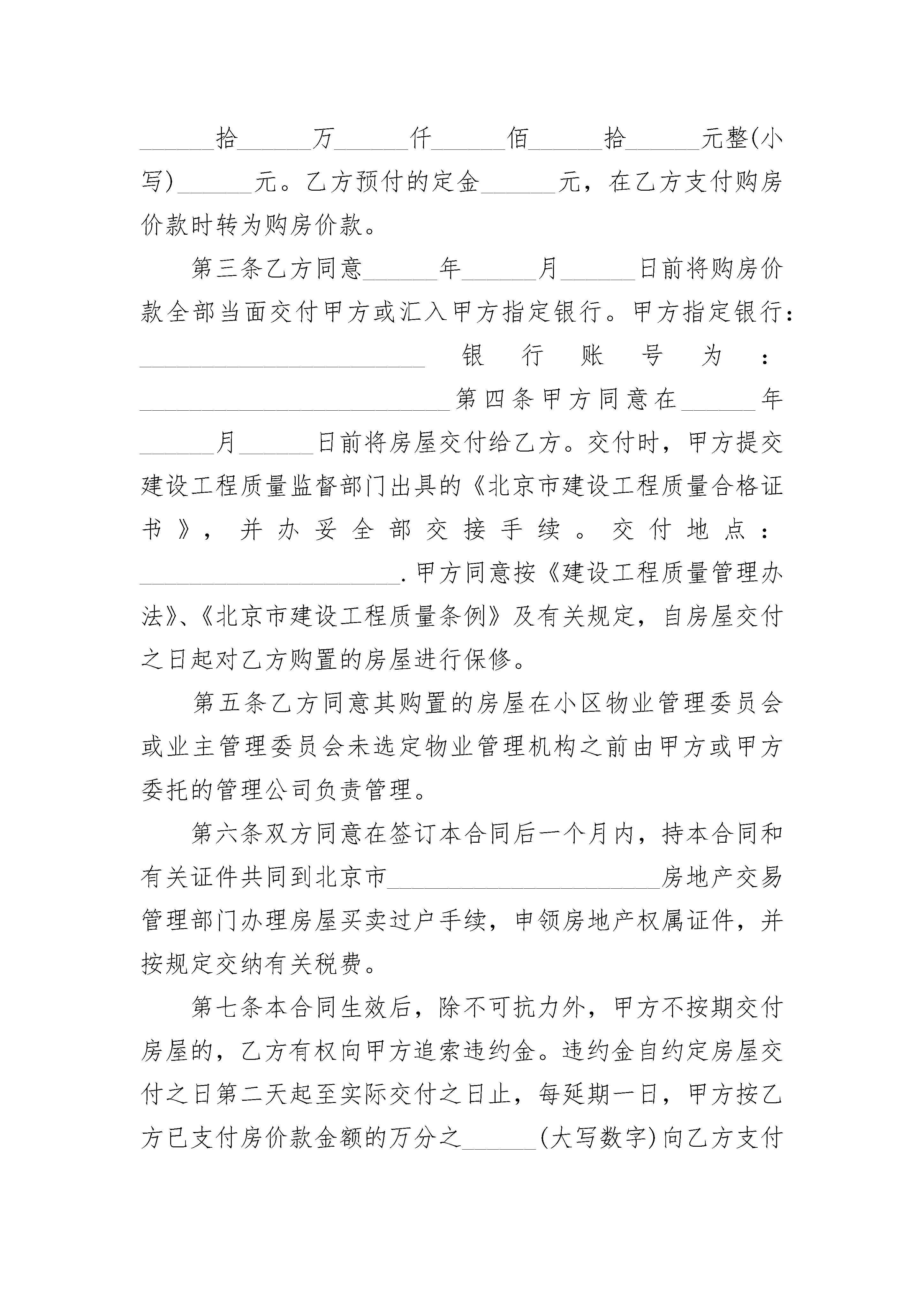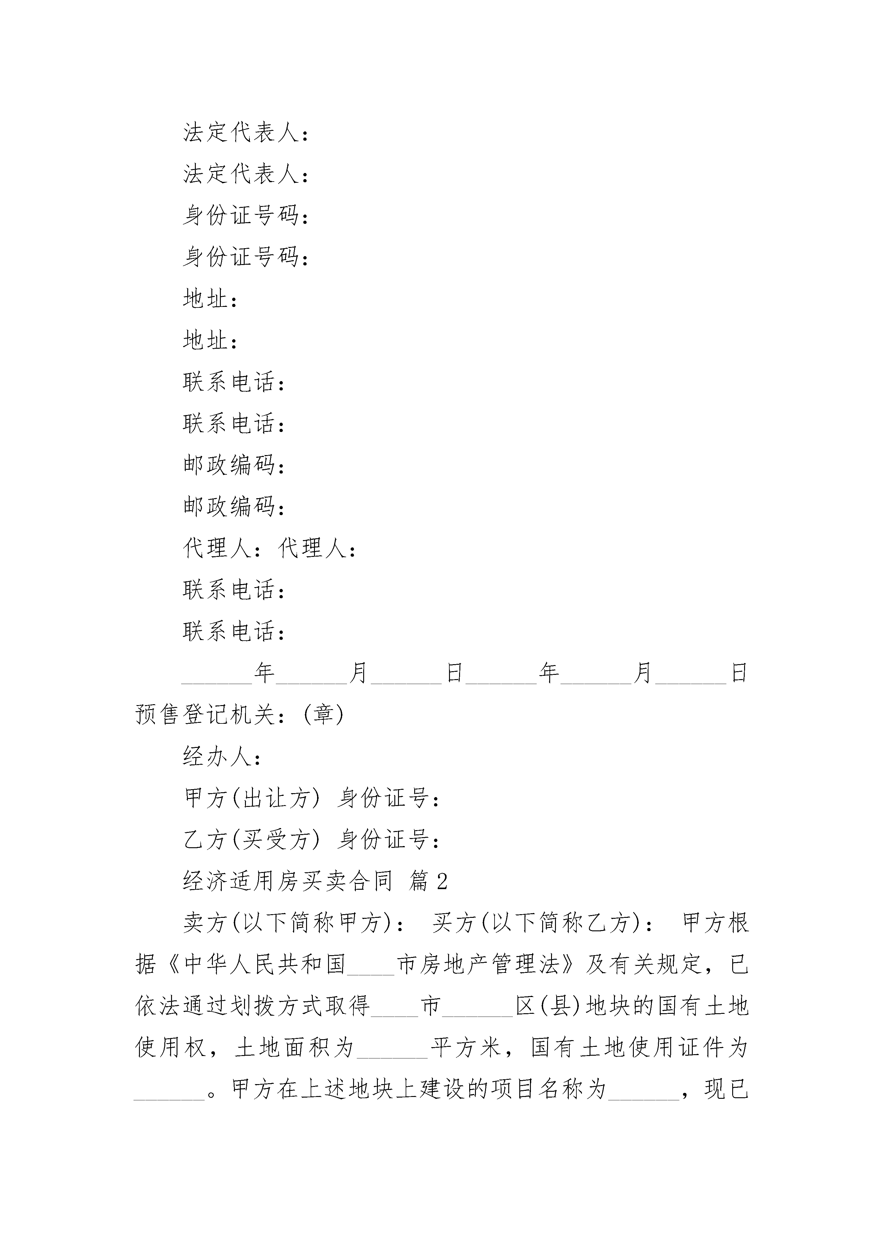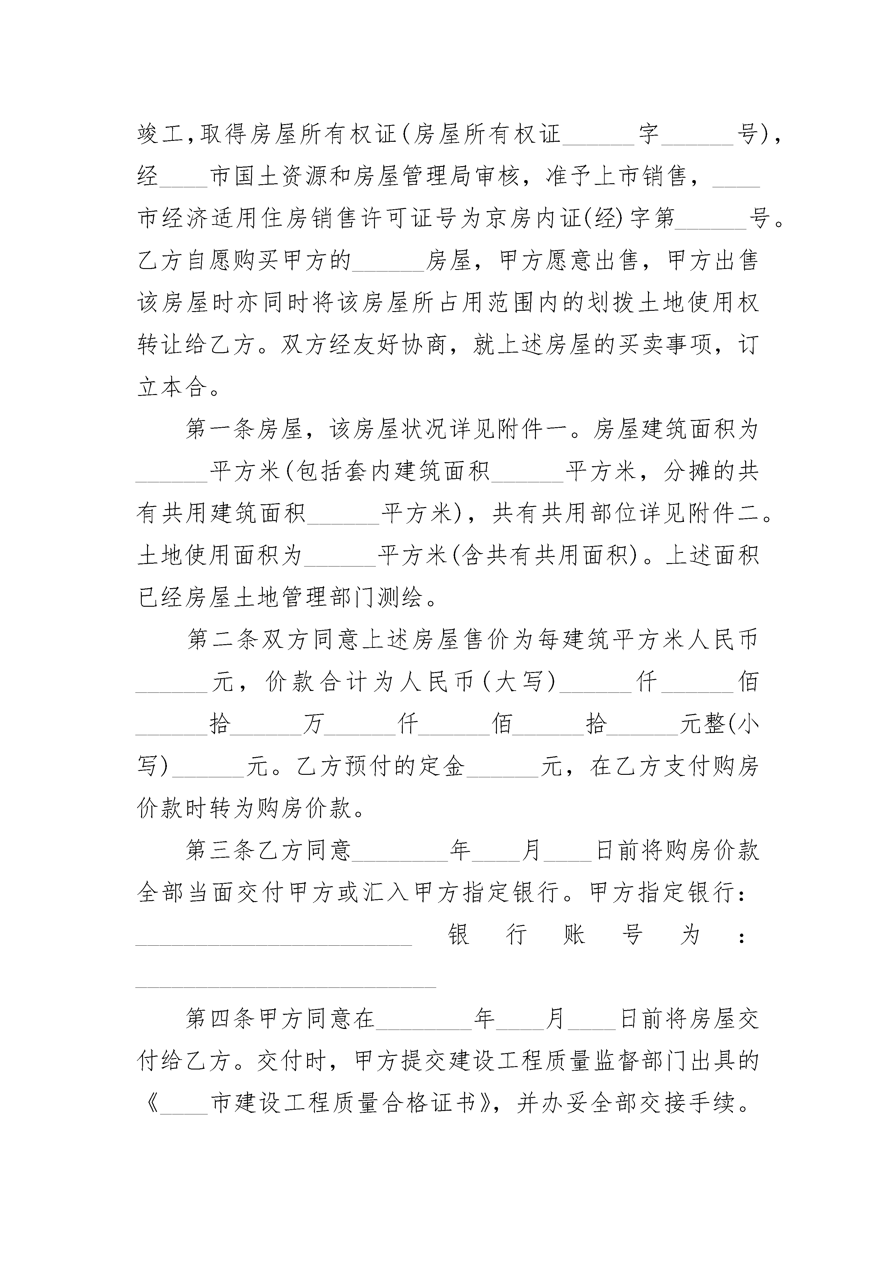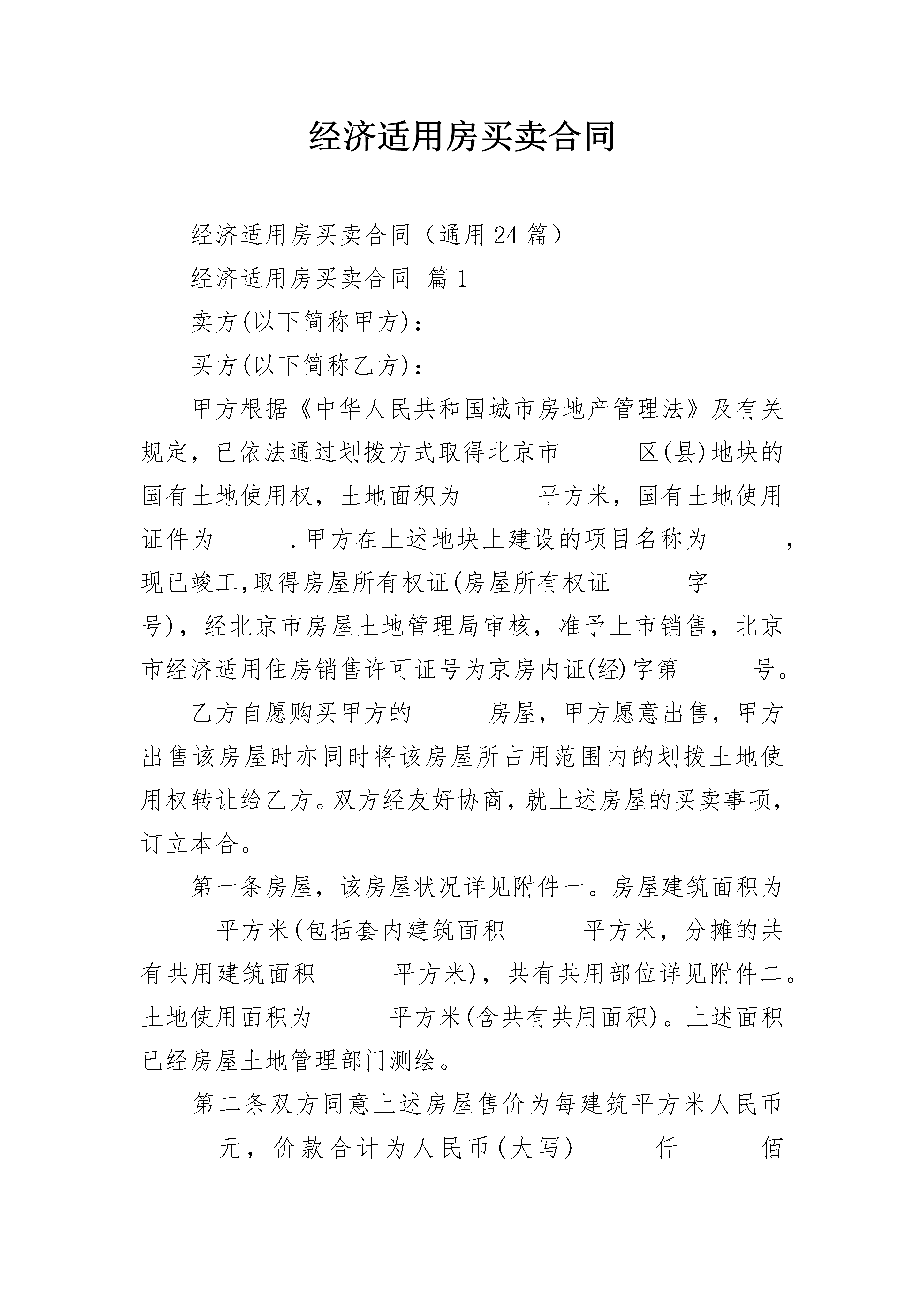 经济适用房买卖合同经济适用房买卖合同(通用24篇)经济适用房买卖合同篇1卖方(以下简称甲方):买方(以下简称乙方):甲方根据《中华人民共和国城市房地产管理法》及有关规定,已依法通过划拨方式取得北京市______区(县)地块的国有土地使用权,土地面积为______平方米,国有土地使用证件为______.甲方在上述地块上建设的项目名称为______,现已竣工,取得房屋所有权证(房屋所有权证______字______号),经北京市房屋土地管理局审核,准予上市销售,北京市经济适用住房销售许可证号为京房内证(经)字第______号。乙方自愿购买甲方的______房屋,甲方愿意出售,甲方出售该房屋时亦同时将该房屋所占用范围内的划拨土地使用权转让给乙方。双方经友好协商,就上述房屋的买卖事项,订立本合。第一条房屋,该房屋状况详见附件一。房屋建筑面积为______平方米(包括套内建筑面积______平方米,分摊的共有共用建筑面积______平方米),共有共用部位详见附件二。土地使用面积为______平方米(含共有共用面积)。上述面积已经房屋土地管理部门测绘。第二条双方同意上述房屋售价为每建筑平方米人民币______元,价款合计为人民币(大写)______仟______佰______拾______万______仟______佰______拾______元整(小写)______元。乙方预付的定金______元,在乙方支付购房价款时转为购房价款。第三条乙方同意______年______月______日前将购房价款全部当面交付甲方或汇入甲方指定银行。甲方指定银行:_______________________银行账号为:_________________________第四条甲方同意在______年______月______日前将房屋交付给乙方。交付时,甲方提交建设工程质量监督部门出具的《北京市建设工程质量合格证书》,并办妥全部交接手续。交付地点:_____________________.甲方同意按《建设工程质量管理办法》、《北京市建设工程质量条例》及有关规定,自房屋交付之日起对乙方购置的房屋进行保修。第五条乙方同意其购置的房屋在小区物业管理委员会或业主管理委员会未选定物业管理机构之前由甲方或甲方委托的管理公司负责管理。第六条双方同意在签订本合同后一个月内,持本合同和有关证件共同到北京市______________________房地产交易管理部门办理房屋买卖过户手续,申领房地产权属证件,并按规定交纳有关税费。第七条本合同生效后,除不可抗力外,甲方不按期交付房屋的,乙方有权向甲方追索违约金。违约金自约定房屋交付之日第二天起至实际交付之日止,每延期一日,甲方按乙方已支付房价款金额的万分之______(大写数字)向乙方支付违约金。逾期超过______日(遇法定节假日顺延)甲方仍未交付房屋的,乙方有权解除本合同。合同解除自乙方书面通知送达甲方之日起生效。甲方除在合同解除后30日内向乙方双倍返还定金外,并须将乙方已付的房价款及利息全部退还给乙方,利息按利率计算。第八条本合同生效后,除不可抗力外,乙方不按期付款的,甲方有权向乙方追索违约金。违约金自本合同约定付款之日第二日起至实际付款之日止,每延期一日,乙方按延期交付房价款的万分之______(大写数字)向甲方无能为力付延期违约金。逾期超过______日(遇法定节假日顺延)乙方仍未付款的,甲方有权解除本合同。合同解除自甲方书面通知送达乙方之日起生效。乙方已交纳的定金甲方不予返还。第九条本合同由双方签字之日起生效,未尽事项,双方可另签补充协议。本合同的附件和双方签订的补充协议,为本合同不可分割的组成部分,具有同等的法律效力第十条双方凡因履行本合同引起的纠纷,应协商解决。协商不成的,双方同意按以下第______种(大写)方式解决纠纷。1、提交北京仲裁委员会仲裁2、任何一方均可向房地产所在地的人民法院提起诉讼。第十一条本合同正本一式两份,甲乙双方各执壹份,副本______份,房地产交易管理部门壹份,______________________________.甲方(签章):乙方(签章):法定代表人:法定代表人:身份证号码:身份证号码:地址:地址:联系电话:联系电话:邮政编码:邮政编码:代理人:代理人:联系电话:联系电话:______年______月______日______年______月______日预售登记机关:(章)经办人:甲方(出让方)身份证号:乙方(买受方)身份证号:经济适用房买卖合同篇2卖方(以下简称甲方):买方(以下简称乙方):甲方根据《中华人民共和国____市房地产管理法》及有关规定,已依法通过划拨方式取得____市______区(县)地块的国有土地使用权,土地面积为______平方米,国有土地使