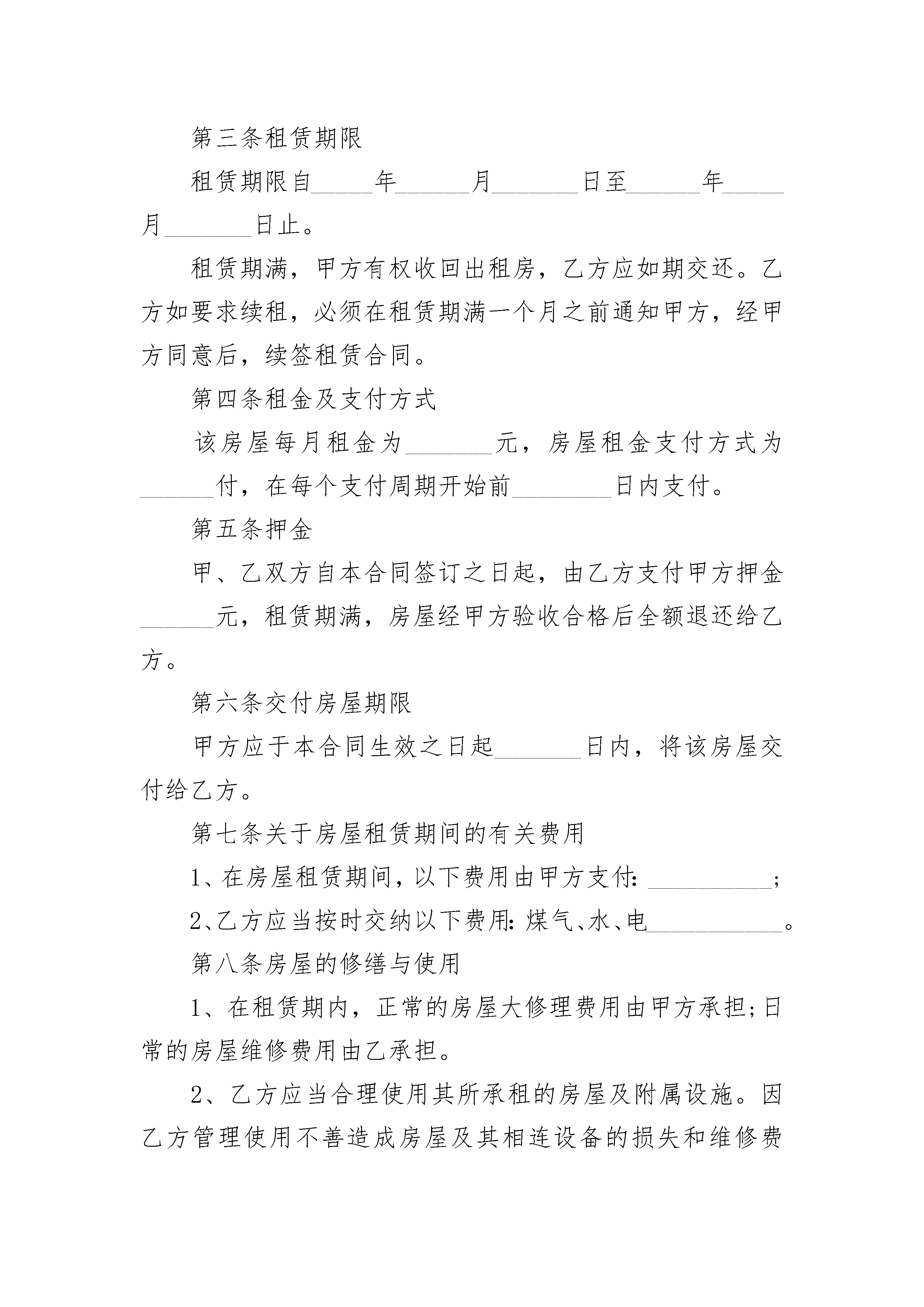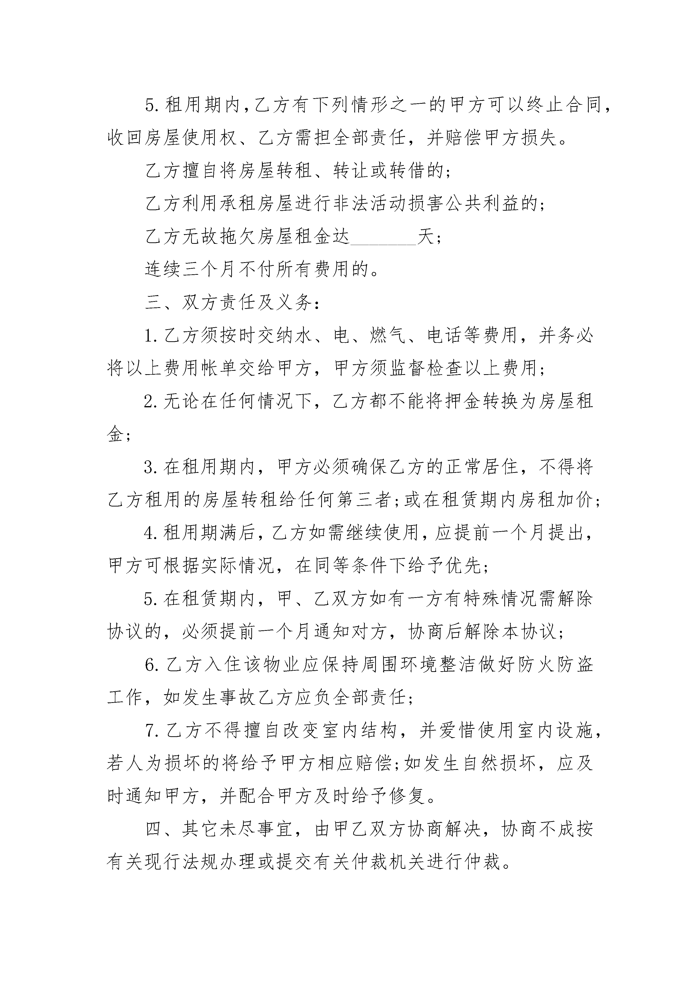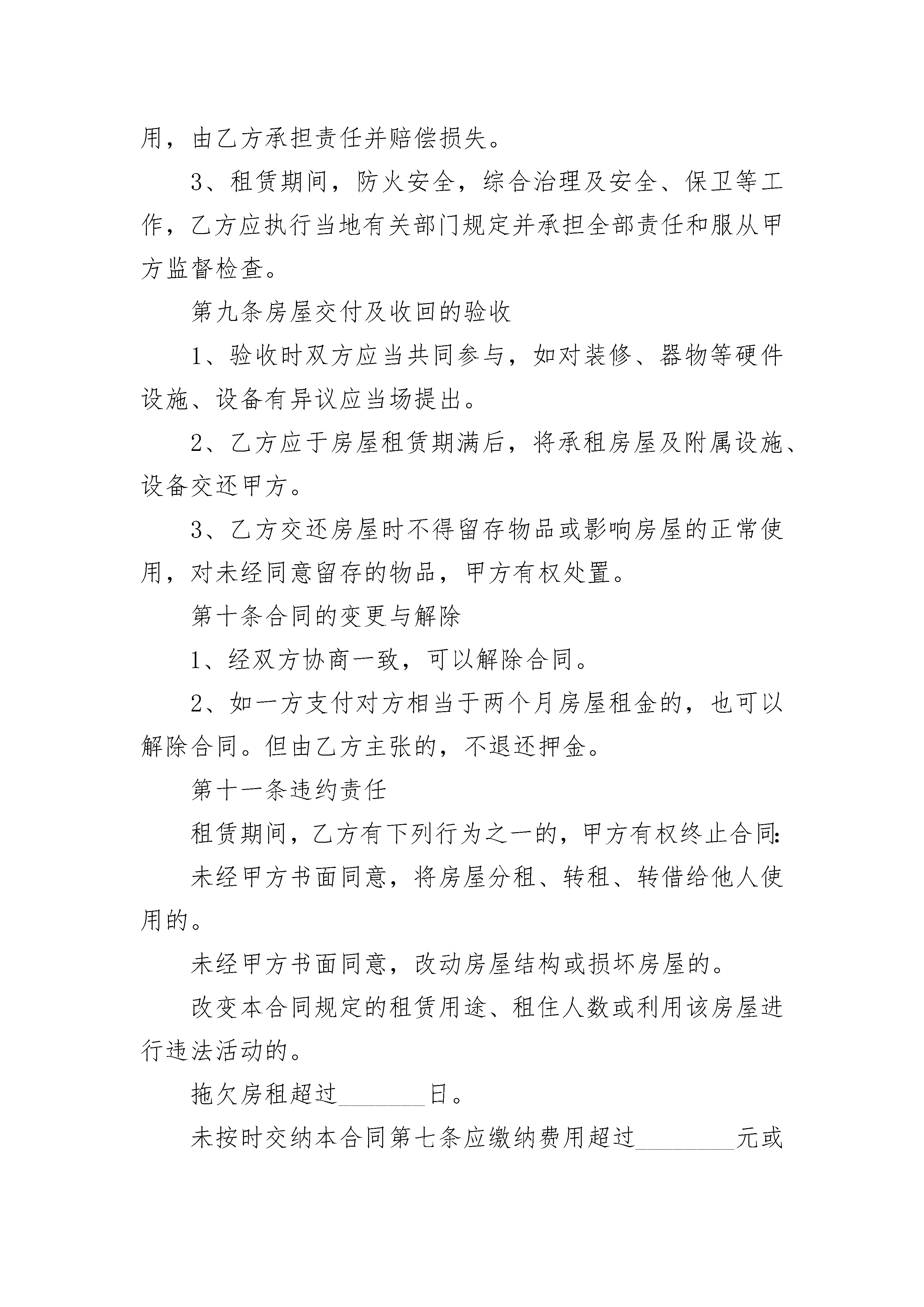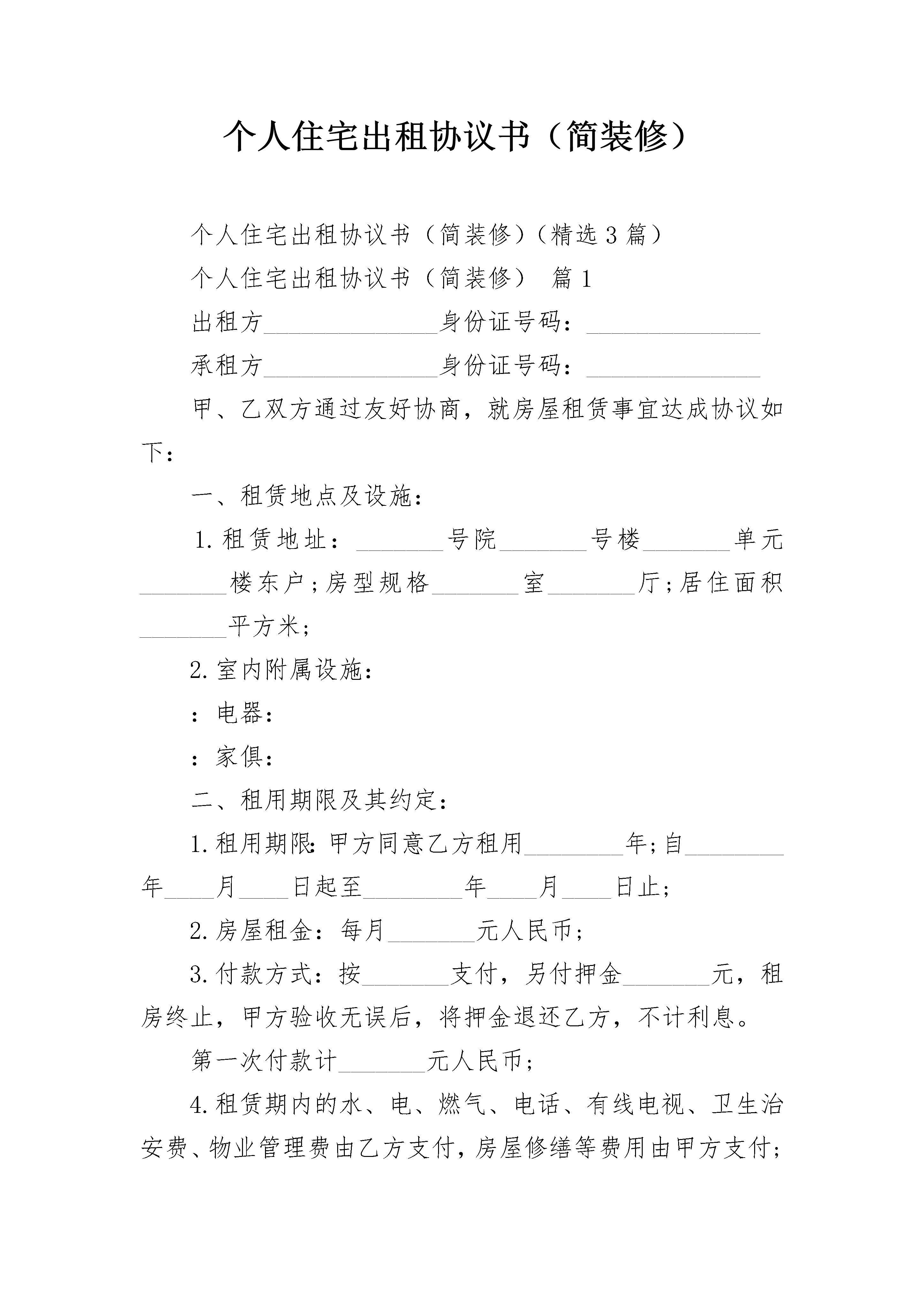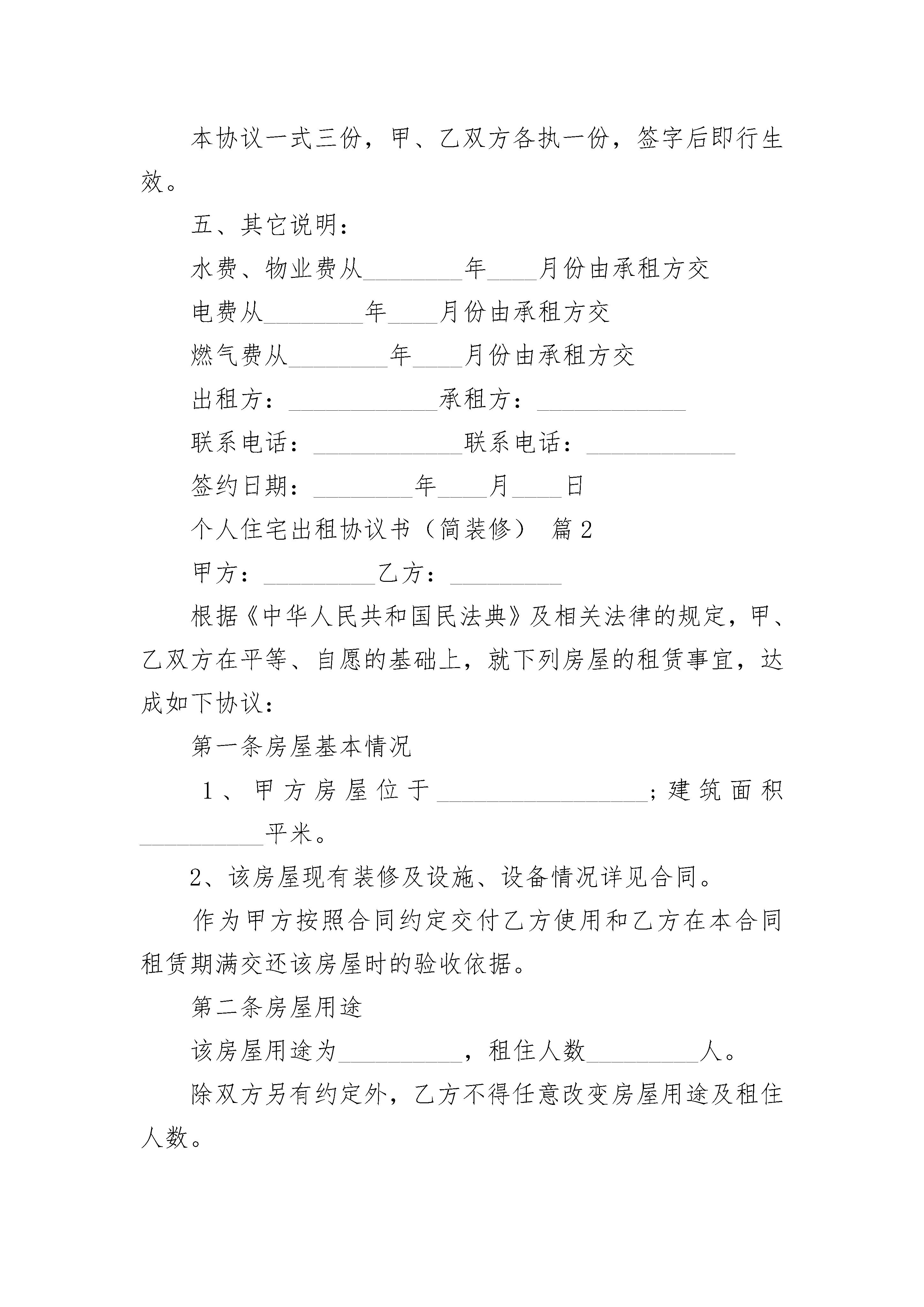 个人住宅出租协议书(简装修)个人住宅出租协议书(简装修)(精选3篇)个人住宅出租协议书(简装修)篇1出租方______________身份证号码:______________承租方______________身份证号码:______________甲、乙双方通过友好协商,就房屋租赁事宜达成协议如下:一、租赁地点及设施:1.租赁地址:_______号院_______号楼_______单元_______楼东户;房型规格_______室_______厅;居住面积_______平方米;2.室内附属设施::电器::家俱:二、租用期限及其约定:1.租用期限:甲方同意乙方租用________年;自________年____月____日起至________年____月____日止;2.房屋租金:每月_______元人民币;3.付款方式:按_______支付,另付押金_______元,租房终止,甲方验收无误后,将押金退还乙方,不计利息。第一次付款计_______元人民币;4.租赁期内的水、电、燃气、电话、有线电视、卫生治安费、物业管理费由乙方支付,房屋修缮等费用由甲方支付;5.租用期内,乙方有下列情形之一的甲方可以终止合同,收回房屋使用权、乙方需担全部责任,并赔偿甲方损失。乙方擅自将房屋转租、转让或转借的;乙方利用承租房屋进行非法活动损害公共利益的;乙方无故拖欠房屋租金达_______天;连续三个月不付所有费用的。三、双方责任及义务:1.乙方须按时交纳水、电、燃气、电话等费用,并务必将以上费用帐单交给甲方,甲方须监督检查以上费用;2.无论在任何情况下,乙方都不能将押金转换为房屋租金;3.在租用期内,甲方必须确保乙方的正常居住,不得将乙方租用的房屋转租给任何第三者;或在租赁期内房租加价;4.租用期满后,乙方如需继续使用,应提前一个月提出,甲方可根据实际情况,在同等条件下给予优先;5.在租赁期内,甲、乙双方如有一方有特殊情况需解除协议的,必须提前一个月通知对方,协商后解除本协议;6.乙方入住该物业应保持周围环境整洁做好防火防盗工作,如发生事故乙方应负全部责任;7.乙方不得擅自改变室内结构,并爱惜使用室内设施,若人为损坏的将给予甲方相应赔偿;如发生自然损坏,应及时通知甲方,并配合甲方及时给予修复。四、其它未尽事宜,由甲乙双方协商解决,协商不成按有关现行法规办理或提交有关仲裁机关进行仲裁。本协议一式三份,甲、乙双方各执一份,签字后即行生效。五、其它说明:水费、物业费从________年____月份由承租方交电费从________年____月份由承租方交燃气费从________年____月份由承租方交出租方:____________承租方:____________联系电话:____________联系电话:____________签约日期:________年____月____日个人住宅出租协议书(简装修)篇2甲方:_________乙方:_________根据《中华人民共和国民法典》及相关法律的规定,甲、乙双方在平等、自愿的基础上,就下列房屋的租赁事宜,达成如下协议:第一条房屋基本情况1、甲方房屋位于_________________;建筑面积__________平米。2、该房屋现有装修及设施、设备情况详见合同。作为甲方按照合同约定交付乙方使用和乙方在本合同租赁期满交还该房屋时的验收依据。第二条房屋用途该房屋用途为__________,租住人数_________人。除双方另有约定外,乙方不得任意改变房屋用途及租住人数。第三条租赁期限租赁期限自_____年______月_______日至______年_____月_______日止。租赁期满,甲方有权收回出租房,乙方应如期交还。乙方如要求续租,必须在租赁期满一个月之前通知甲方,经甲方同意后,续签租赁合同。第四条租金及支付方式该房屋每月租金为_______元,房屋租金支付方式为______付,在每个支付周期开始前________日内支付。第五条押金甲、乙双方自本合同签订之日起,由乙方支付甲方押金______元,租赁期满,房屋经甲方验收合格后全额退还给乙方。第六条交付房屋期限甲方应于本合同生效之日起_______日内,将该房屋交付给乙方。第七条关于房屋租赁期间的有关费用1、在房屋租赁期间,以下费用由甲方支付:__________;2、乙方应当按时交纳以下费用:煤气、水、电___________。第八条房屋的修缮与使用1、在租赁期内,正常的房屋大修理费用由甲方承担;日常的房屋维修费用由乙承担。2、乙方应当合理使用其所承租的房屋及附属设施。因乙方管理使用不善造成房屋及其相连设备的损失和维修费用,由乙方承担责任并赔偿损失。3、租赁期间,防火安全,综合治理及安全、保卫等工作,乙方应执行当地有关部门规定并承担全部责任
