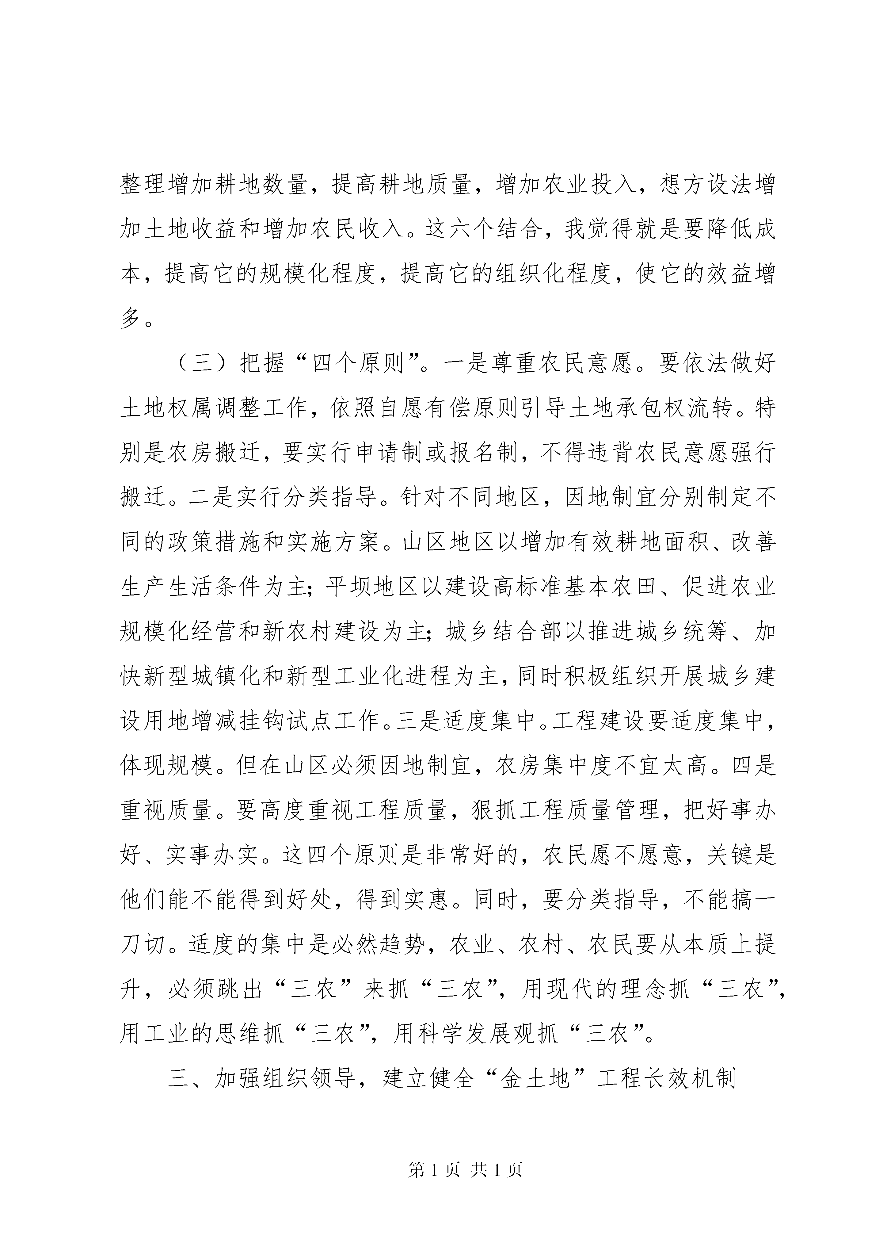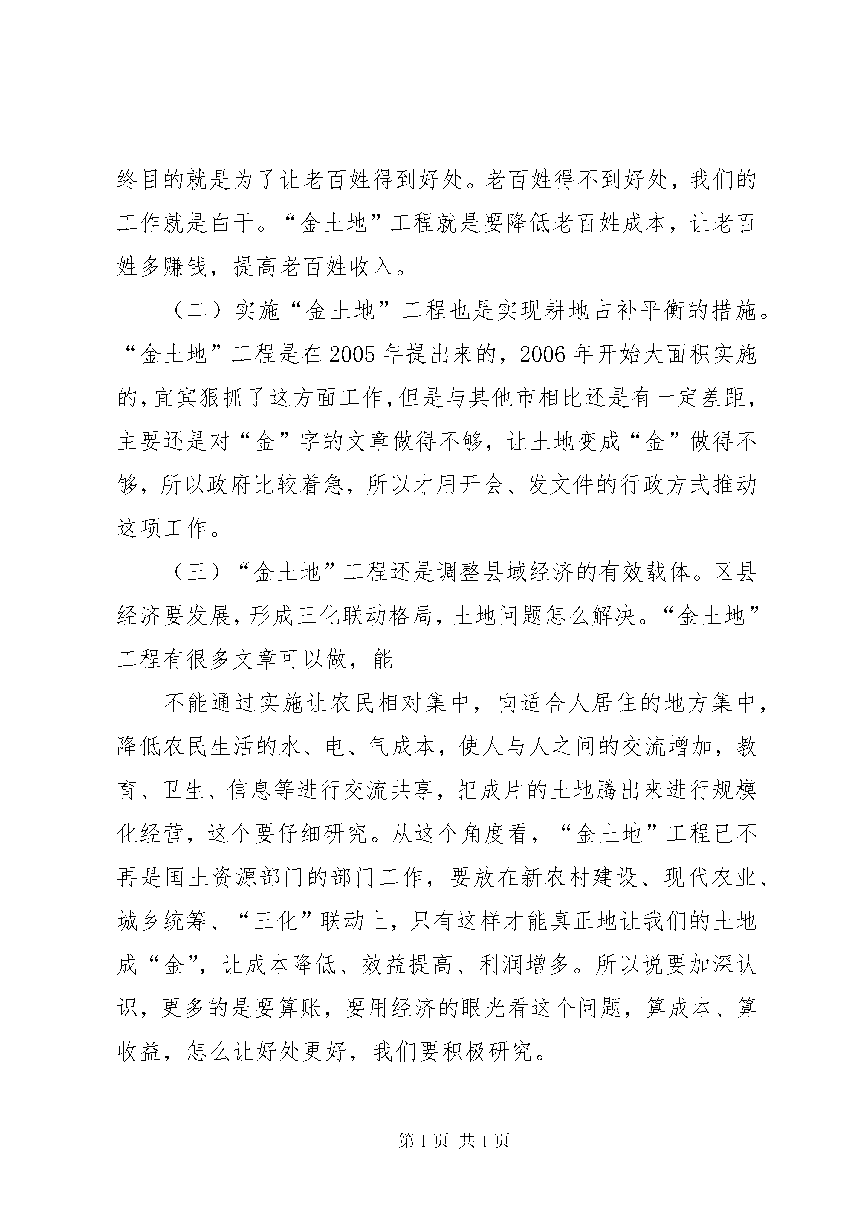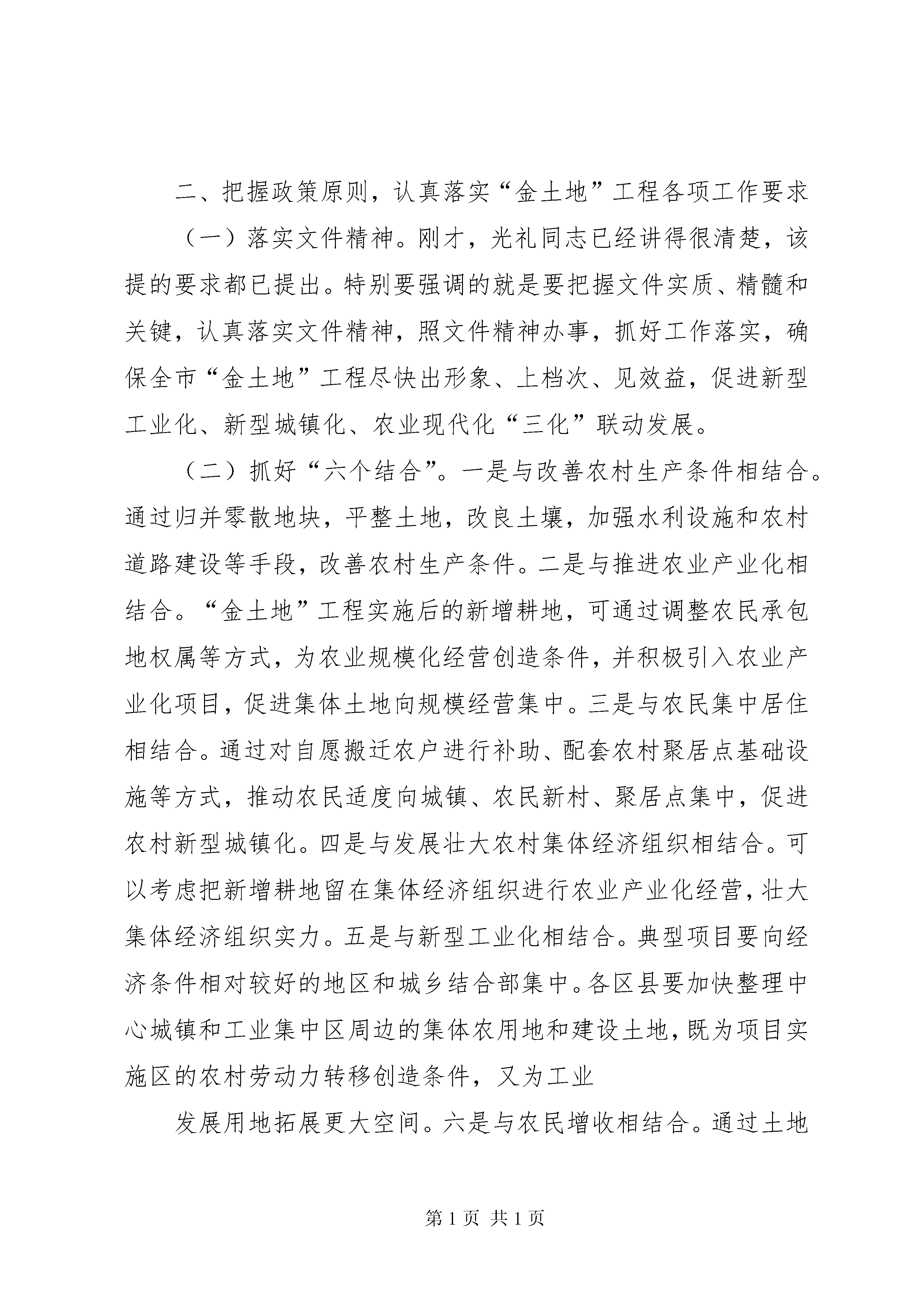在企业年金落地实施工作会议上的讲话在全市加快实施“金土地”工程会议上的讲话市委副书记、市政府市长吴光镭“金土地”工程要从科学发展观的角度来理解,就必须多动脑筋去研究“金土地”工程的“金”字。为什么不叫土地工程,叫“金土地”工程,也就是土地一定要长“金”,不是长草。上升到理论高度就是要把我们的土地变成“金”。那么什么是“金”。怎么来变成“金”。我认为,用规范的话来说就是要通过实施“金土地工程”实现农村发展、农业增产、农民增收,最终是在增收,农民增收是核心,如果农民不增收,就等于白干。现在,我们的工作要从“三化”联动,新型工业化、新型城镇化和新型农业化来把握、来理解。不从这个方面来理解,我们对土地的经营、土地的管理,就跳不出固定模式。怎么样让我们的土地变成“金”,我觉得要好好研究,要正确处理土地管理和土地开发的关系。管好土地是为了用,不用土地管好了干什么。我理解就是要创新,用创新的思维和科学发展观来把握“金土地”工程的实质,用科学发展观来统筹好土地的开发、管理和使用,提升宜宾耕地的质量和附加值,形成三化联动的格局。对于“金土地工程”要回到农村要发展、农业要增产、农民要增收,让老百姓得到好处。十七届三中全会说到底就是要统筹城乡发展,其亮点就是在土地制度方面提出了一些创新的思路。我们既要让农民得到好处,地方得到发展,同时又不违背国家相关政策。为官一任,一定要想办法为老百姓做事,对一个地方的发展要做贡献。要实事求是,要务实,要用科学发展观来统领我们的工作,包括“金土地”工程。一、统一思想,充分认识“金土地”工程的重要性和必要性金土地工程,什么是“金”。怎样变成“金”,老百姓是不是得到好处,地方是不是发展了,我们工作是不是卓有成效。在“三化”联动的过程中,加强金土地工程的实施,促进农村的发展,农业的增产,农民的增收。(一)“金土地工程”是落实十七届三中全会精神的一个重要举措。十七届三中全会《决定》对农村制度建设和改革创新提出了6项任务,我认为归结起来都是要用科学发展观来解释,来使我们的“三农”工作不断地向前推进。在推进过程中既要面对我们的现实,继承我们的传统,更要改革和创新,在继承中发展。《决定》提出两个最严格,一个是坚持最严格的耕地保护制度,一个是坚持最严格的节约用地制度。党中央、国务院的要求是明确的,18亿亩,18亿亩是针对全国而言。我们宜宾只是18亿亩当中的一小部分,我们要面对实际,从我们宜宾的实际出发做好这项工作。包括继续推进耕地开发整理、耕地先补后占,包括建立保护补偿机制,保证总量不减少、用途不改变、质量有提高,真正的能够强农。我们的工作,包括“金土地”工程项目的推进,要真正让农民得到好处,强农惠农,农民自然就要干。我们的最终目的就是为了让老百姓得到好处。老百姓得不到好处,我们的工作就是白干。“金土地”工程就是要降低老百姓成本,让老百姓多赚钱,提高老百姓收入。(二)实施“金土地”工程也是实现耕地占补平衡的措施。“金土地”工程是在2005年提出来的,2006年开始大面积实施的,宜宾狠抓了这方面工作,但是与其他市相比还是有一定差距,主要还是对“金”字的文章做得不够,让土地变成“金”做得不够,所以政府比较着急,所以才用开会、发文件的行政方式推动这项工作。(三)“金土地”工程还是调整县域经济的有效载体。区县经济要发展,形成三化联动格局,土地问题怎么解决。“金土地”工程有很多文章可以做,能不能通过实施让农民相对集中,向适合人居住的地方集中,降低农民生活的水、电、气成本,使人与人之间的交流增加,教育、卫生、信息等进行交流共享,把成片的土地腾出来进行规模化经营,这个要仔细研究。从这个角度看,“金土地”工程已不再是国土资源部门的部门工作,要放在新农村建设、现代农业、城乡统筹、“三化”联动上,只有这样才能真正地让我们的土地成“金”,让成本降低、效益提高、利润增多。所以说要加深认识,更多的是要算账,要用经济的眼光看这个问题,算成本、算收益,怎么让好处更好,我们要积极研究。二、把握政策原则,认真落实“金土地”工程各项工作要求(一)落实文件精神。刚才,光礼同志已经讲得很清楚,该提的要求都已提出。特别要强调的就是要把握文件实质、精髓和关键,认真落实文件精神,照文件精神办事,抓好工作落实,确保全市“金土地”工程尽快出形象、上档次、见效益,促进新型工业化、新型城镇化、农业现代化“三化”联动发展。(二)抓好“六个结合”。一是与改善农村生产条件相结合。通过归并零散地块,平整土地,改良土壤,加强水利设施和农村道路建设等手段,改善农村生产条件。二是与推进农业产业化相结合。“金土地”工程实施后的新增耕地,可通过调整农民承包地权属等方式,为农业规模化经营创造条件,并积极引入农业产业化项目,促进集体土地向规模经营集中。三是与农民集中居住相结合。通