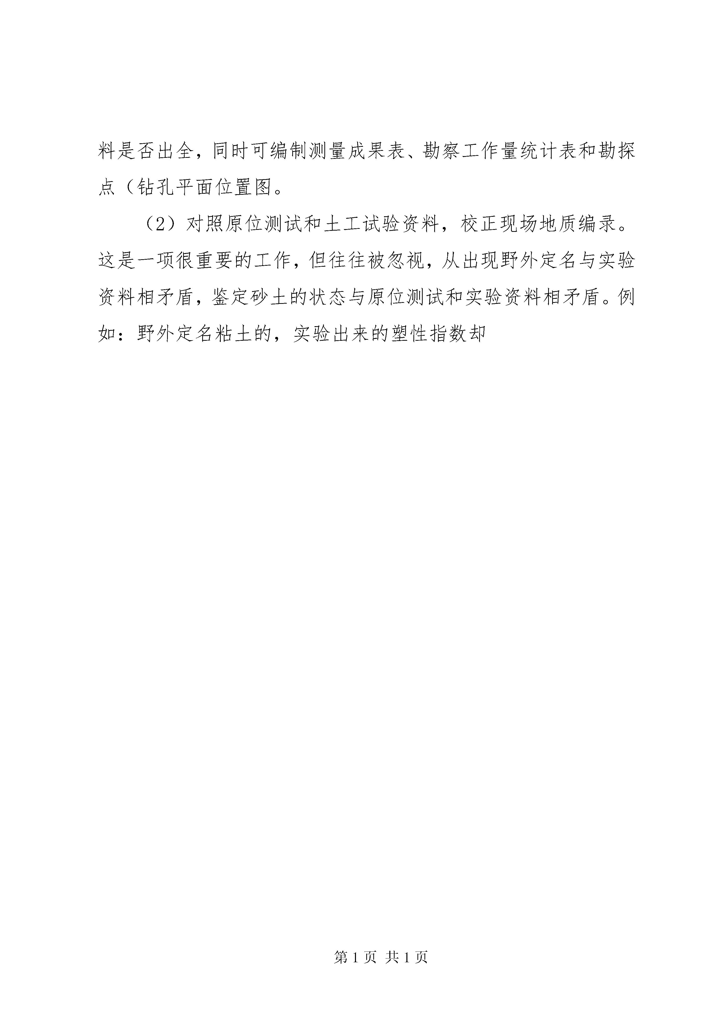 如何编写管理评审报告?网上看到一篇关于编写岩土工程勘察报告的文章,写得比较详细,可以抽时间看看。(转载资料)如何编写岩土工程勘察报告岩土工程勘察报告是工程地质勘察的最终成果,是建筑地基基础设计和施工的重要依据。报告否正确反映工程地质条件和岩土工程特点,关系到工程设计和建筑施工能否安全可靠、措施得当、济合理。当然,不同的工程项目,不同的勘察阶段,报告反映的内容和侧重有所不同;有关规范、规对报告的编写也有相应的要求。下面着重谈一谈有关工业与民用建筑的岩土工程勘察报告编写工且侧重于详细勘察阶段。1、报告的编制程序一项勘察任务在完成现场放点、测量、钻探、取样、原位测试、现场地质编录和实验室测试等前工作的基础上,即转入资料整理工作,并着手编写勘察报告。岩土工程勘察报告编写工作应遵循一的程序,才能前后照应,顺当进行。不然的话,常会出现现场编录与实验资料的矛盾、图表间的矛盾文图间的矛盾,改动起来费时费力,影响效率,影响质量。通常的编制程序是:(1)外业和实验资料的汇集、检查和统计。此项工作应于外业结束后即进行。首先应检查各项料是否齐全,特别是实验资料是否出全,同时可编制测量成果表、勘察工作量统计表和勘探点(钻孔平面位置图。(2)对照原位测试和土工试验资料,校正现场地质编录。这是一项很重要的工作,但往往被忽视,从出现野外定名与实验资料相矛盾,鉴定砂土的状态与原位测试和实验资料相矛盾。例如:野外定名粘土的,实验出来的塑性指数却