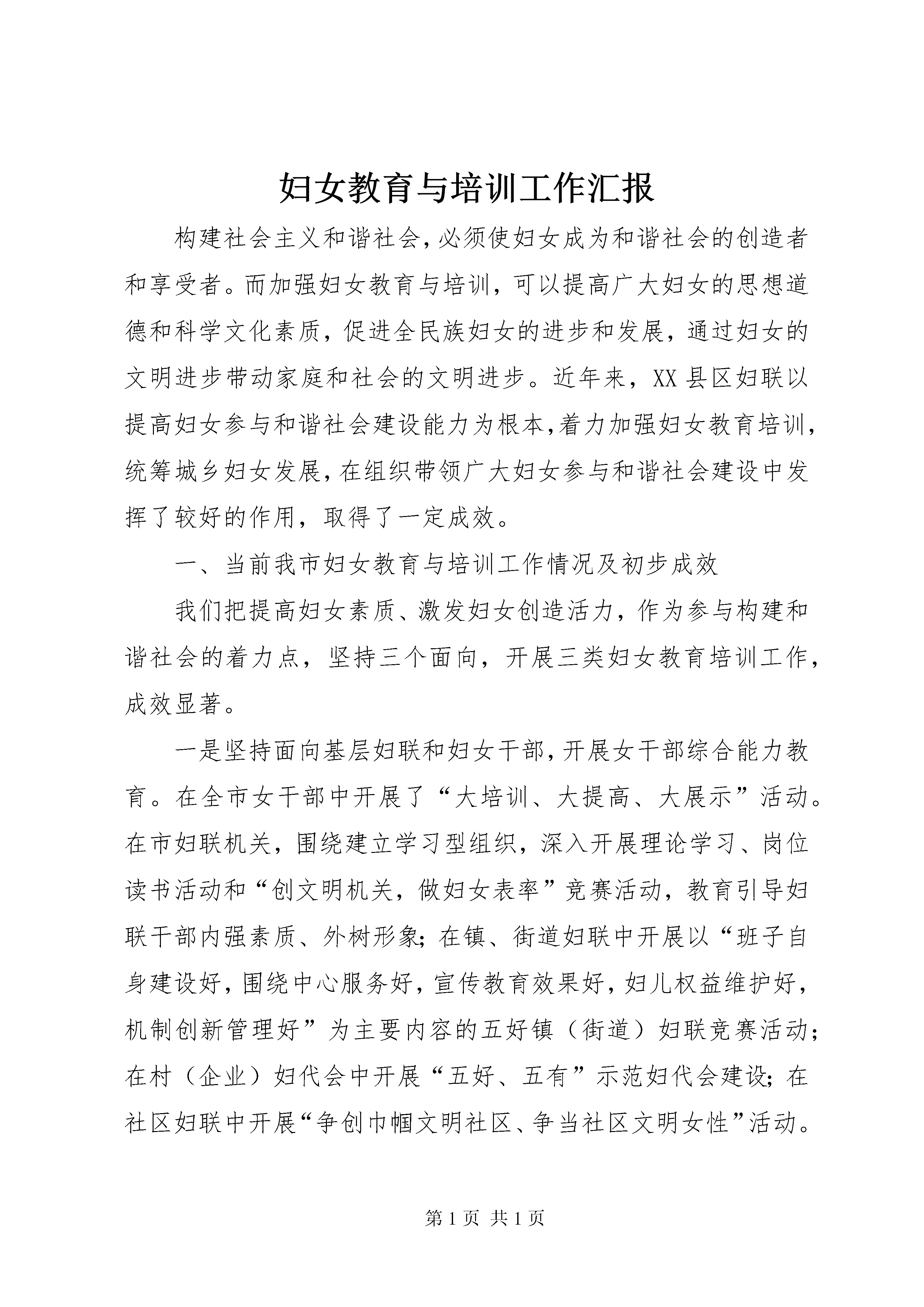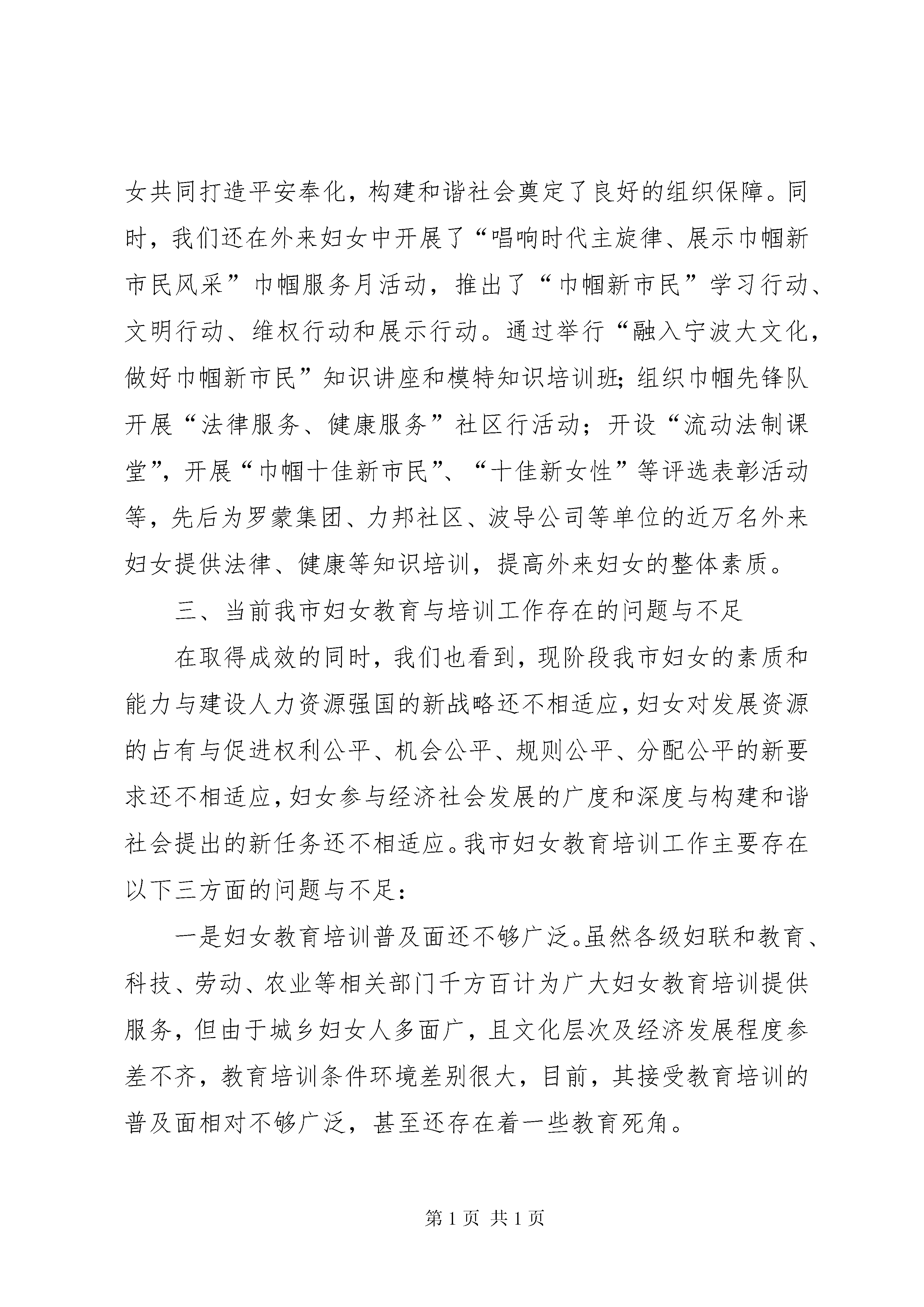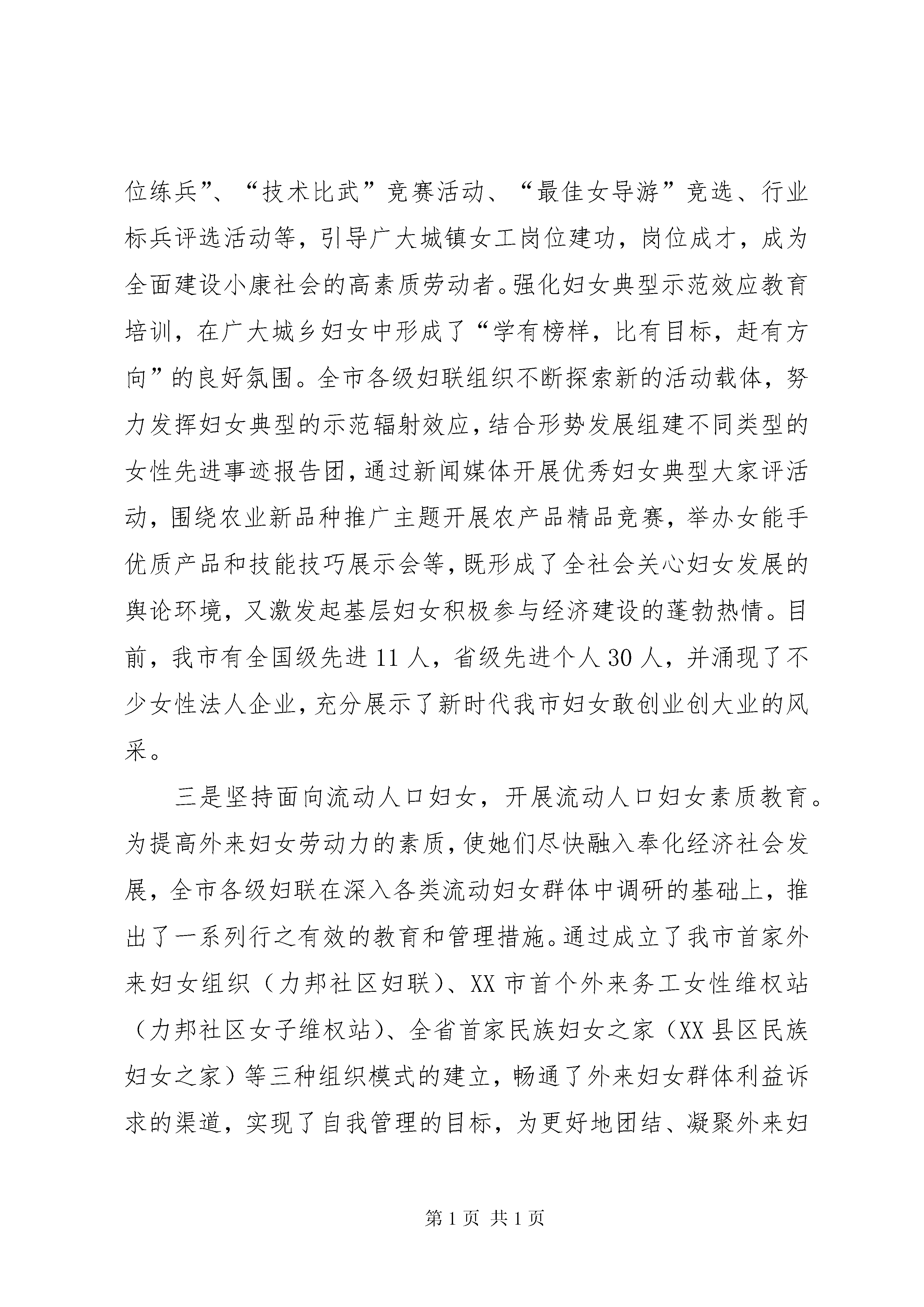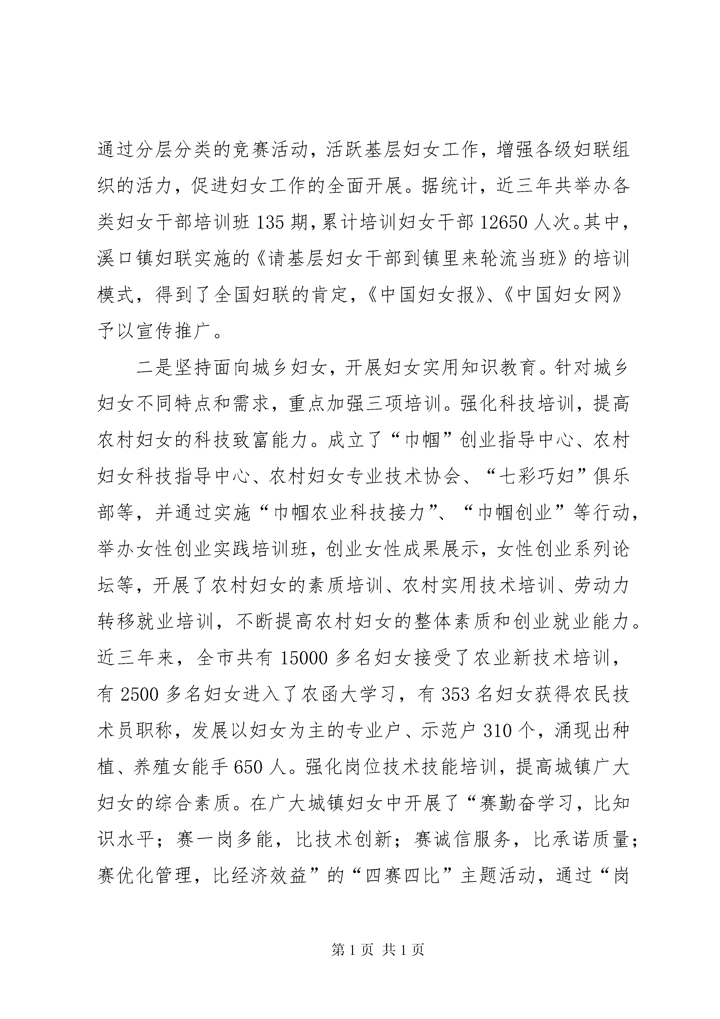 妇女教育与培训工作汇报构建社会主义和谐社会,必须使妇女成为和谐社会的创造者和享受者。而加强妇女教育与培训,可以提高广大妇女的思想道德和科学文化素质,促进全民族妇女的进步和发展,通过妇女的文明进步带动家庭和社会的文明进步。近年来,XX县区妇联以提高妇女参与和谐社会建设能力为根本,着力加强妇女教育培训,统筹城乡妇女发展,在组织带领广大妇女参与和谐社会建设中发挥了较好的作用,取得了一定成效。一、当前我市妇女教育与培训工作情况及初步成效我们把提高妇女素质、激发妇女创造活力,作为参与构建和谐社会的着力点,坚持三个面向,开展三类妇女教育培训工作,成效显著。一是坚持面向基层妇联和妇女干部,开展女干部综合能力教育。在全市女干部中开展了“大培训、大提高、大展示”活动。在市妇联机关,围绕建立学习型组织,深入开展理论学习、岗位读书活动和“创文明机关,做妇女表率”竞赛活动,教育引导妇联干部内强素质、外树形象;在镇、街道妇联中开展以“班子自身建设好,围绕中心服务好,宣传教育效果好,妇儿权益维护好,机制创新管理好”为主要内容的五好镇(街道)妇联竞赛活动;在村(企业)妇代会中开展“五好、五有”示范妇代会建设;在社区妇联中开展“争创巾帼文明社区、争当社区文明女性”活动。通过分层分类的竞赛活动,活跃基层妇女工作,增强各级妇联组织的活力,促进妇女工作的全面开展。据统计,近三年共举办各类妇女干部培训班135期,累计培训妇女干部12650人次。其中,溪口镇妇联实施的《请基层妇女干部到镇里来轮流当班》的培训模式,得到了全国妇联的肯定,《中国妇女报》、《中国妇女网》予以宣传推广。二是坚持面向城乡妇女,开展妇女实用知识教育。针对城乡妇女不同特点和需求,重点加强三项培训。强化科技培训,提高农村妇女的科技致富能力。成立了“巾帼”创业指导中心、农村妇女科技指导中心、农村妇女专业技术协会、“七彩巧妇”俱乐部等,并通过实施“巾帼农业科技接力”、“巾帼创业”等行动,举办女性创业实践培训班,创业女性成果展示,女性创业系列论坛等,开展了农村妇女的素质培训、农村实用技术培训、劳动力转移就业培训,不断提高农村妇女的整体素质和创业就业能力。近三年来,全市共有15000多名妇女接受了农业新技术培训,有2500多名妇女进入了农函大学习,有353名妇女获得农民技术员职称,发展以妇女为主的专业户、示范户310个,涌现出种植、养殖女能手650人。强化岗位技术技能培训,提高城镇广大妇女的综合素质。在广大城镇妇女中开展了“赛勤奋学习,比知识水平;赛一岗多能,比技术创新;赛诚信服务,比承诺质量;赛优化管理,比经济效益”的“四赛四比”主题活动,通过“岗位练兵”、“技术比武”竞赛活动、“最佳女导游”竞选、行业标兵评选活动等,引导广大城镇女工岗位建功,岗位成才,成为全面建设小康社会的高素质劳动者。强化妇女典型示范效应教育培训,在广大城乡妇女中形成了“学有榜样,比有目标,赶有方向”的良好氛围。全市各级妇联组织不断探索新的活动载体,努力发挥妇女典型的示范辐射效应,结合形势发展组建不同类型的女性先进事迹报告团,通过新闻媒体开展优秀妇女典型大家评活动,围绕农业新品种推广主题开展农产品精品竞赛,举办女能手优质产品和技能技巧展示会等,既形成了全社会关心妇女发展的舆论环境,又激发起基层妇女积极参与经济建设的蓬勃热情。目前,我市有全国级先进11人,省级先进个人30人,并涌现了不少女性法人企业,充分展示了新时代我市妇女敢创业创大业的风采。三是坚持面向流动人口妇女,开展流动人口妇女素质教育。为提高外来妇女劳动力的素质,使她们尽快融入奉化经济社会发展,全市各级妇联在深入各类流动妇女群体中调研的基础上,推出了一系列行之有效的教育和管理措施。通过成立了我市首家外来妇女组织(力邦社区妇联)、XX市首个外来务工女性维权站(力邦社区女子维权站)、全省首家民族妇女之家(XX县区民族妇女之家)等三种组织模式的建立,畅通了外来妇女群体利益诉求的渠道,实现了自我管理的目标,为更好地团结、凝聚外来妇女共同打造平安奉化,构建和谐社会奠定了良好的组织保障。同时,我们还在外来妇女中开展了“唱响时代主旋律、展示巾帼新市民风采”巾帼服务月活动,推出了“巾帼新市民”学习行动、文明行动、维权行动和展示行动。通过举行“融入宁波大文化,做好巾帼新市民”知识讲座和模特知识培训班;组织巾帼先锋队开展“法律服务、健康服务”社区行活动;开设“流动法制课堂”,开展“巾帼十佳新市民”、“十佳新女性”等评选表彰活动等,先后为罗蒙集团、力邦社区、波导公司等单位的近万名外来妇女提供法律、健康等知识培训,提高外来妇女的整体素质。三、当前我市妇女教育与培训工作存在的问题与不足在取得成效的同时,我们也看到,现阶段我市妇女的素质和能力与建设人力资源强国的新战略还不相适应,妇