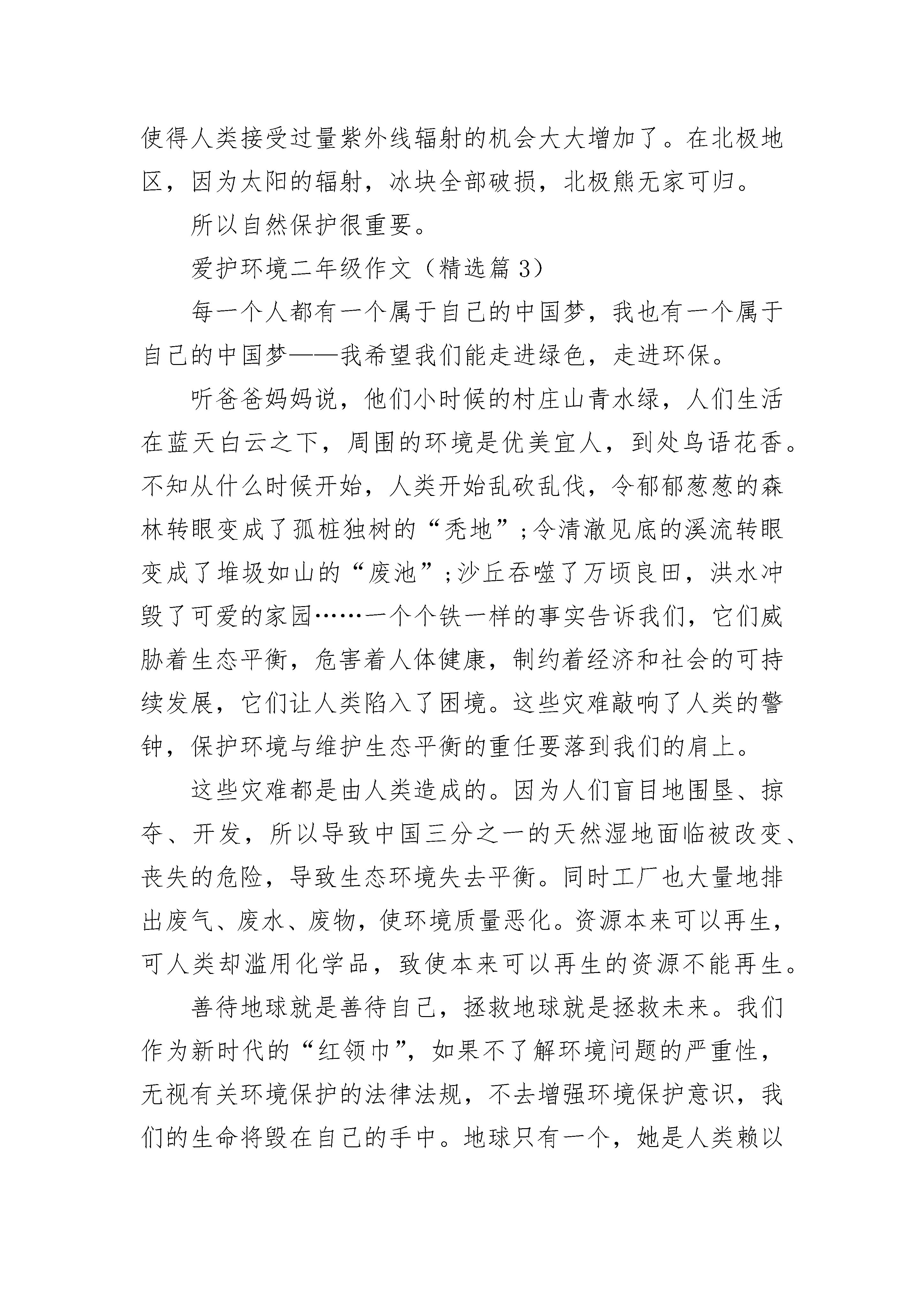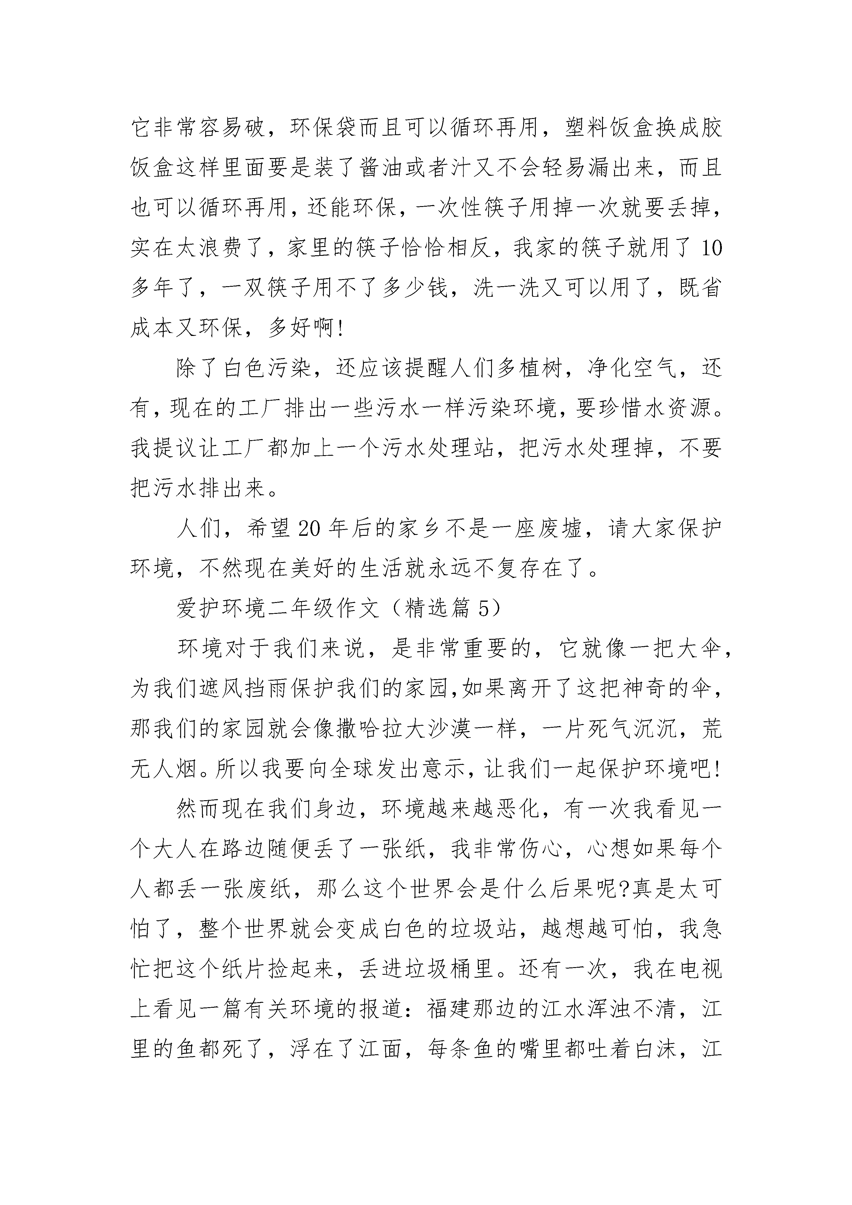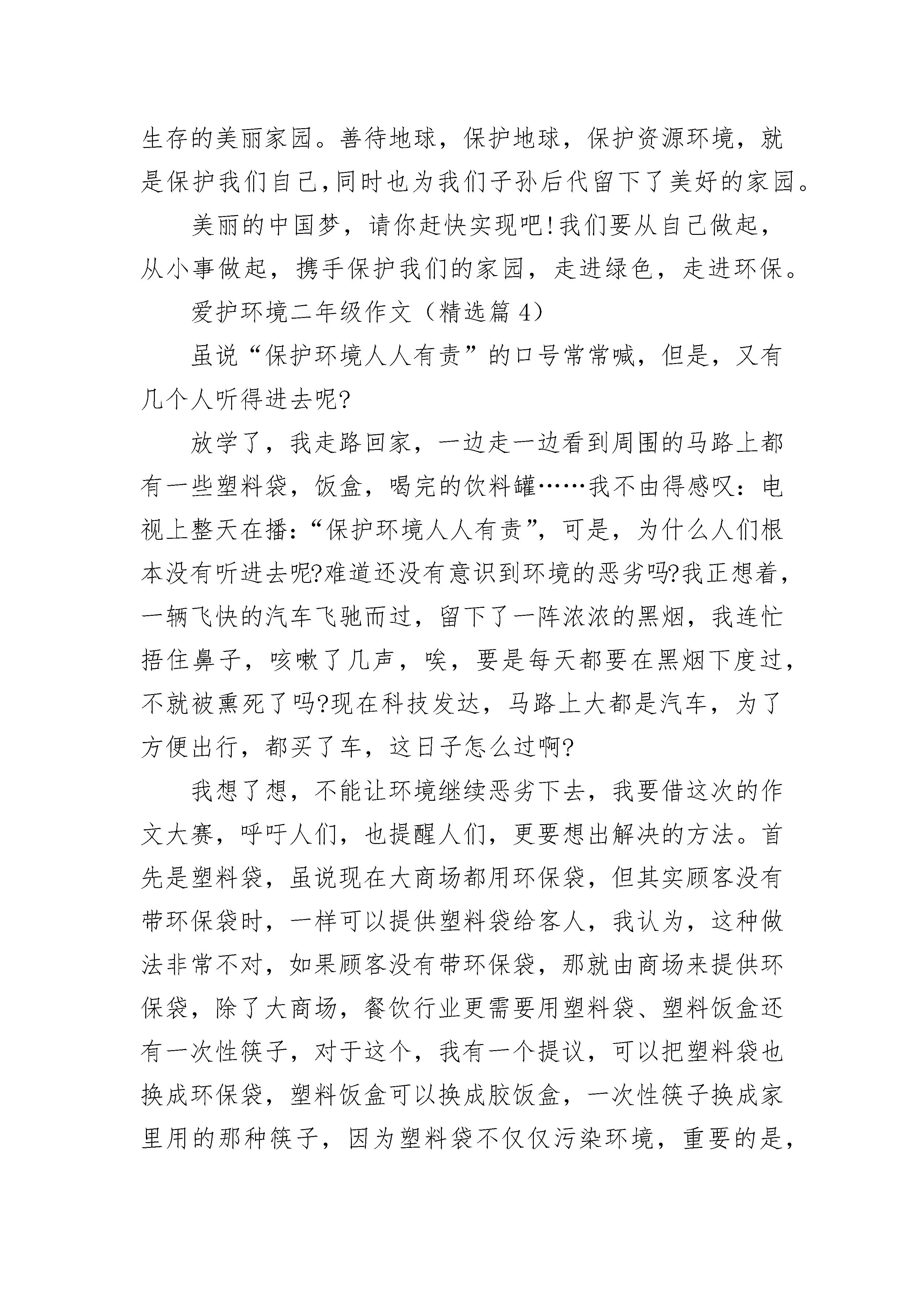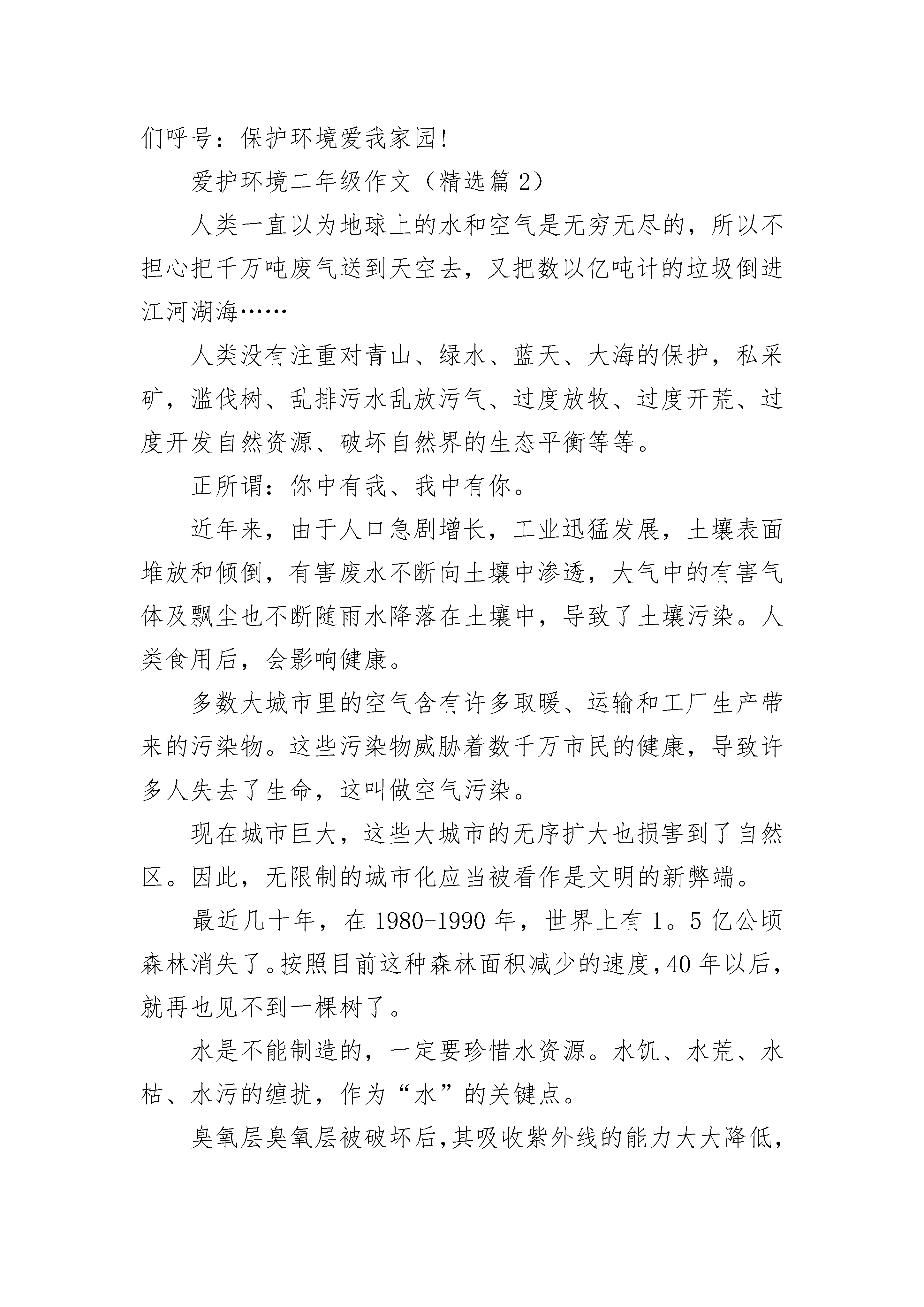 爱护环境二年级作文(精选5篇)爱护环境二年级作文(精选篇1)地球是我们共同的家园,没有了地球我们将无法生存,所以我们要保护我们的家园。环境的逐渐恶化,使人类面临了生存的威胁。只有全世界人民一起保护环境爱我家园,才能拥有一个美好的世界。地球像一位无私的母亲,用自己的血液——石油来为人们提供资源。她将自己所有的器官都交给了人类!地球越来越千疮百孔,她的“肺”——森林、湿地受伤了,她的“肌肤”——大地干裂了。看到这些,我不禁头涔涔而泪潸潸了。让我们一起呼号:保护环境爱我家园!有一次,我去旧街玩耍,看到一幅令人大吃一惊的画面。到处都是堆积成山的垃圾。时不时还要小心“地雷”,蚊蝇大军在上空盯着这些“美食”。路过的人都说臭死了臭死了,几乎没有人不说臭。这样的环境真是令我愤愤不平,仔细一看,竟然是污水的“天下”,到处都有污水。我不仅想起了课外书上的知识,因为污水排放量的增加,人们为了身体健康只能饮用纯净水。虽然纯净水有种种弊端,但时下“饮用水”正成为了一种潮流!看到这一切,我们清晰地认识到污水带给人们的痛苦、恐怖和灾难!为了保护环境我们要留住大自然的绿色、保护母亲河、植树造林、打造节水型社会、减少垃圾污染。为了我们美好的家园,大家一起保护环境吧!最后让我们呼号:保护环境爱我家园!爱护环境二年级作文(精选篇2)人类一直以为地球上的水和空气是无穷无尽的,所以不担心把千万吨废气送到天空去,又把数以亿吨计的垃圾倒进江河湖海……人类没有注重对青山、绿水、蓝天、大海的保护,私采矿,滥伐树、乱排污水乱放污气、过度放牧、过度开荒、过度开发自然资源、破坏自然界的生态平衡等等。正所谓:你中有我、我中有你。近年来,由于人口急剧增长,工业迅猛发展,土壤表面堆放和倾倒,有害废水不断向土壤中渗透,大气中的有害气体及飘尘也不断随雨水降落在土壤中,导致了土壤污染。人类食用后,会影响健康。多数大城市里的空气含有许多取暖、运输和工厂生产带来的污染物。这些污染物威胁着数千万市民的健康,导致许多人失去了生命,这叫做空气污染。现在城市巨大,这些大城市的无序扩大也损害到了自然区。因此,无限制的城市化应当被看作是文明的新弊端。最近几十年,在1980-1990年,世界上有1。5亿公顷森林消失了。按照目前这种森林面积减少的速度,40年以后,就再也见不到一棵树了。水是不能制造的,一定要珍惜水资源。水饥、水荒、水枯、水污的缠扰,作为“水”的关键点。臭氧层臭氧层被破坏后,其吸收紫外线的能力大大降低,使得人类接受过量紫外线辐射的机会大大增加了。在北极地区,因为太阳的辐射,冰块全部破损,北极熊无家可归。所以自然保护很重要。爱护环境二年级作文(精选篇3)每一个人都有一个属于自己的中国梦,我也有一个属于自己的中国梦——我希望我们能走进绿色,走进环保。听爸爸妈妈说,他们小时候的村庄山青水绿,人们生活在蓝天白云之下,周围的环境是优美宜人,到处鸟语花香。不知从什么时候开始,人类开始乱砍乱伐,令郁郁葱葱的森林转眼变成了孤桩独树的“秃地”;令清澈见底的溪流转眼变成了堆圾如山的“废池”;沙丘吞噬了万顷良田,洪水冲毁了可爱的家园……一个个铁一样的事实告诉我们,它们威胁着生态平衡,危害着人体健康,制约着经济和社会的可持续发展,它们让人类陷入了困境。这些灾难敲响了人类的警钟,保护环境与维护生态平衡的重任要落到我们的肩上。这些灾难都是由人类造成的。因为人们盲目地围垦、掠夺、开发,所以导致中国三分之一的天然湿地面临被改变、丧失的危险,导致生态环境失去平衡。同时工厂也大量地排出废气、废水、废物,使环境质量恶化。资源本来可以再生,可人类却滥用化学品,致使本来可以再生的资源不能再生。善待地球就是善待自己,拯救地球就是拯救未来。我们作为新时代的“红领巾”,如果不了解环境问题的严重性,无视有关环境保护的法律法规,不去增强环境保护意识,我们的生命将毁在自己的手中。地球只有一个,她是人类赖以生存的美丽家园。善待地球,保护地球,保护资源环境,就是保护我们自己,同时也为我们子孙后代留下了美好的家园。美丽的中国梦,请你赶快实现吧!我们要从自己做起,从小事做起,携手保护我们的家园,走进绿色,走进环保。爱护环境二年级作文(精选篇4)虽说“保护环境人人有责”的口号常常喊,但是,又有几个人听得进去呢?放学了,我走路回家,一边走一边看到周围的马路上都有一些塑料袋,饭盒,喝完的饮料罐……我不由得感叹:电视上整天在播:“保护环境人人有责”,可是,为什么人们根本没有听进去呢?难道还没有意识到环境的恶劣吗?我正想着,一辆飞快的汽车飞驰而过,留下了一阵浓浓的黑烟,我连忙捂住鼻子,咳嗽了几声,唉,要是每天都要在黑烟下度过,不就被熏死了吗?现在科技发达,马路上大都是汽车,为了方便出行,都买了车,这日子怎么过啊?我想了想,不能让环境继续恶劣下去,我要借这次的作文大赛