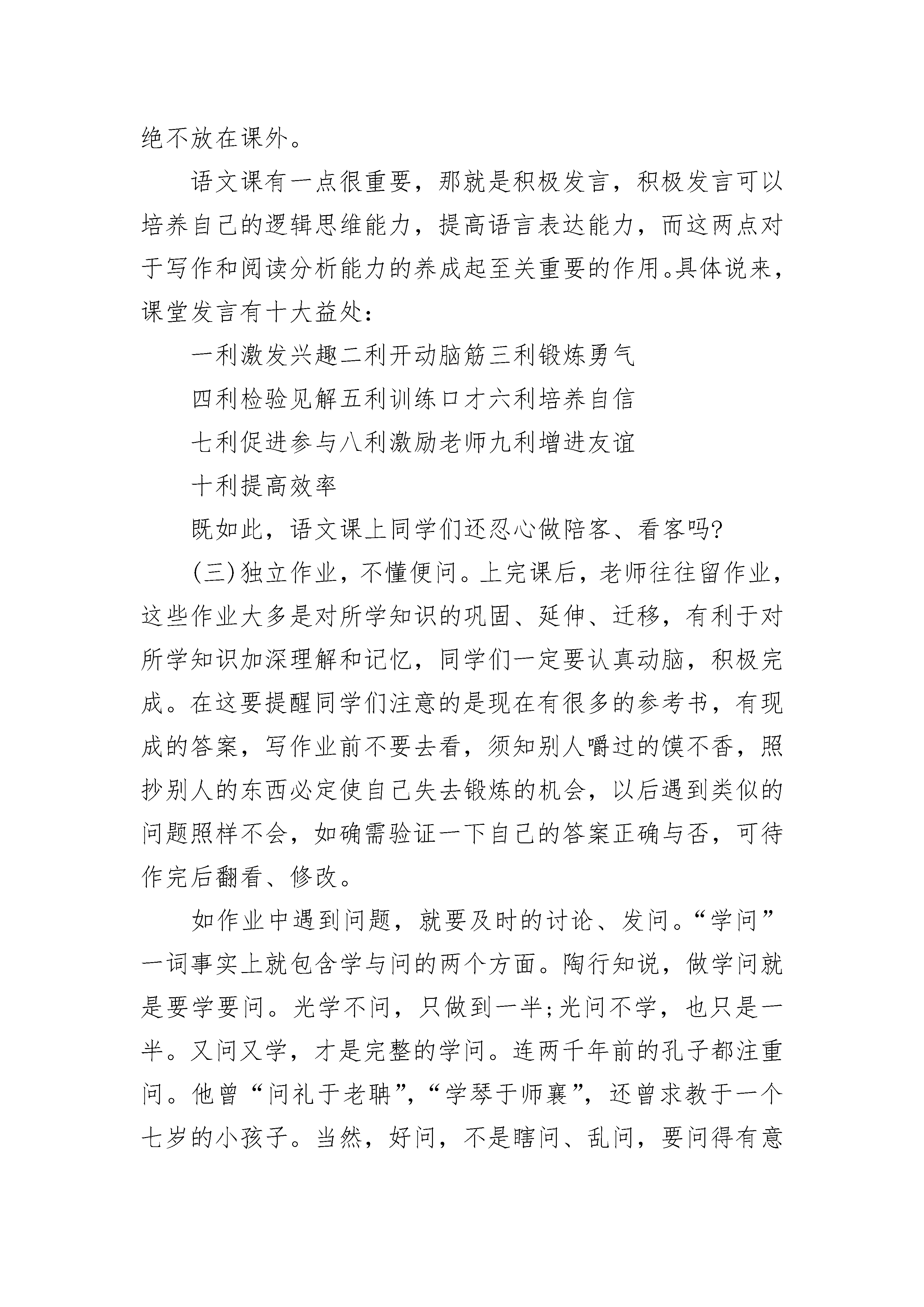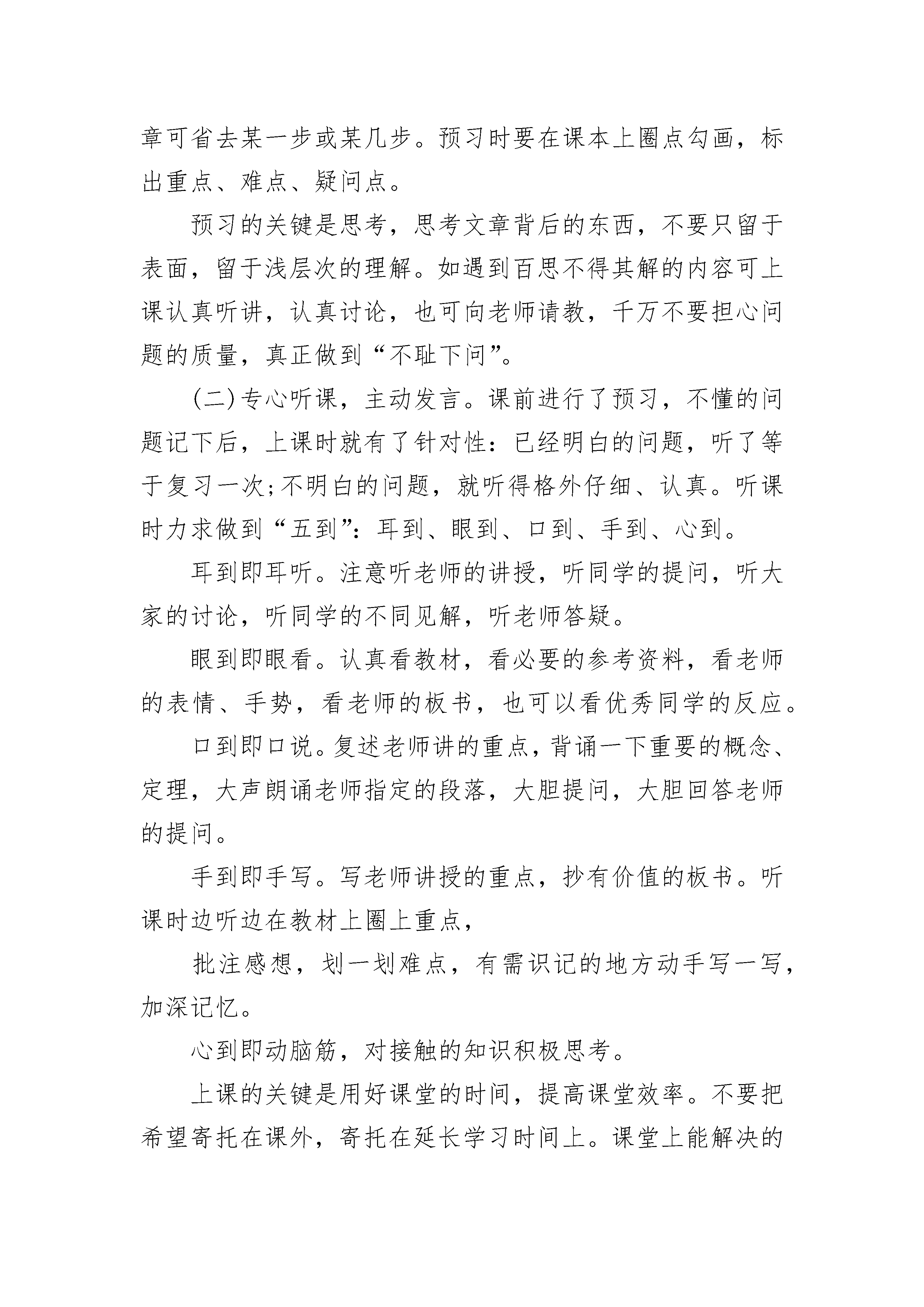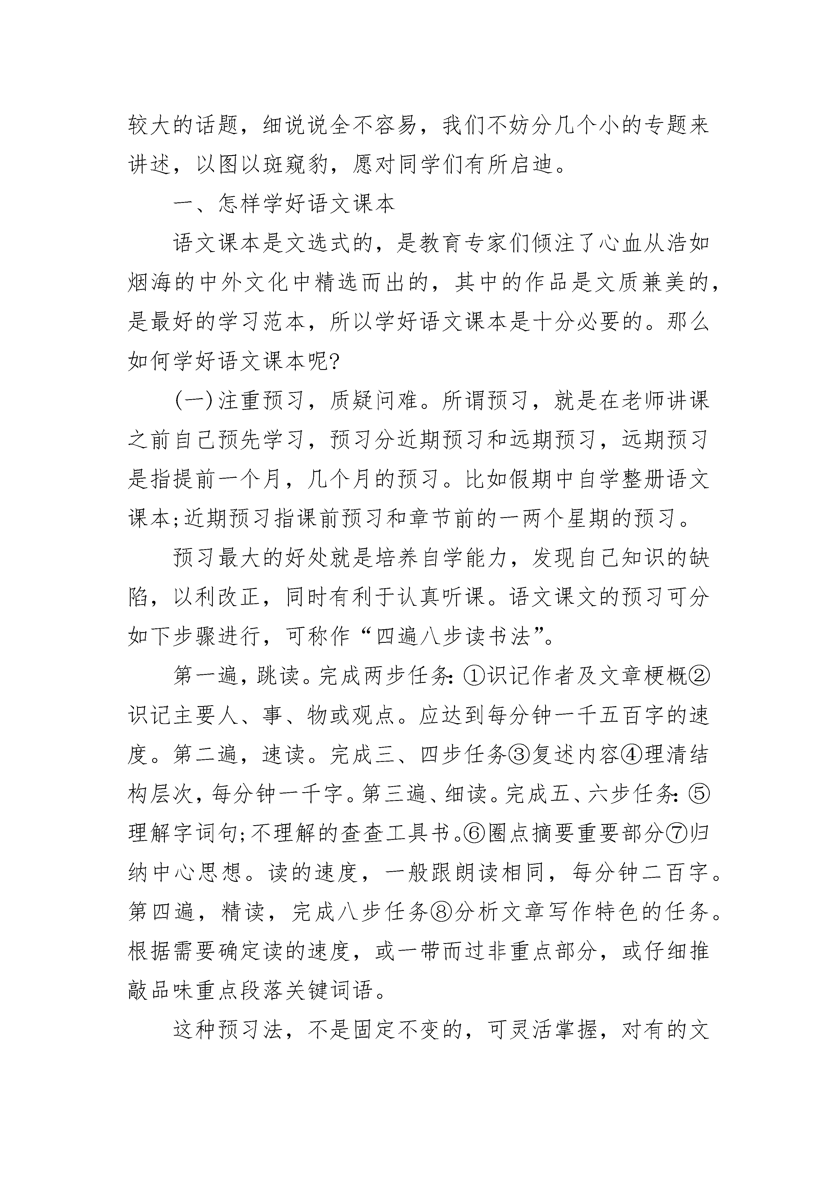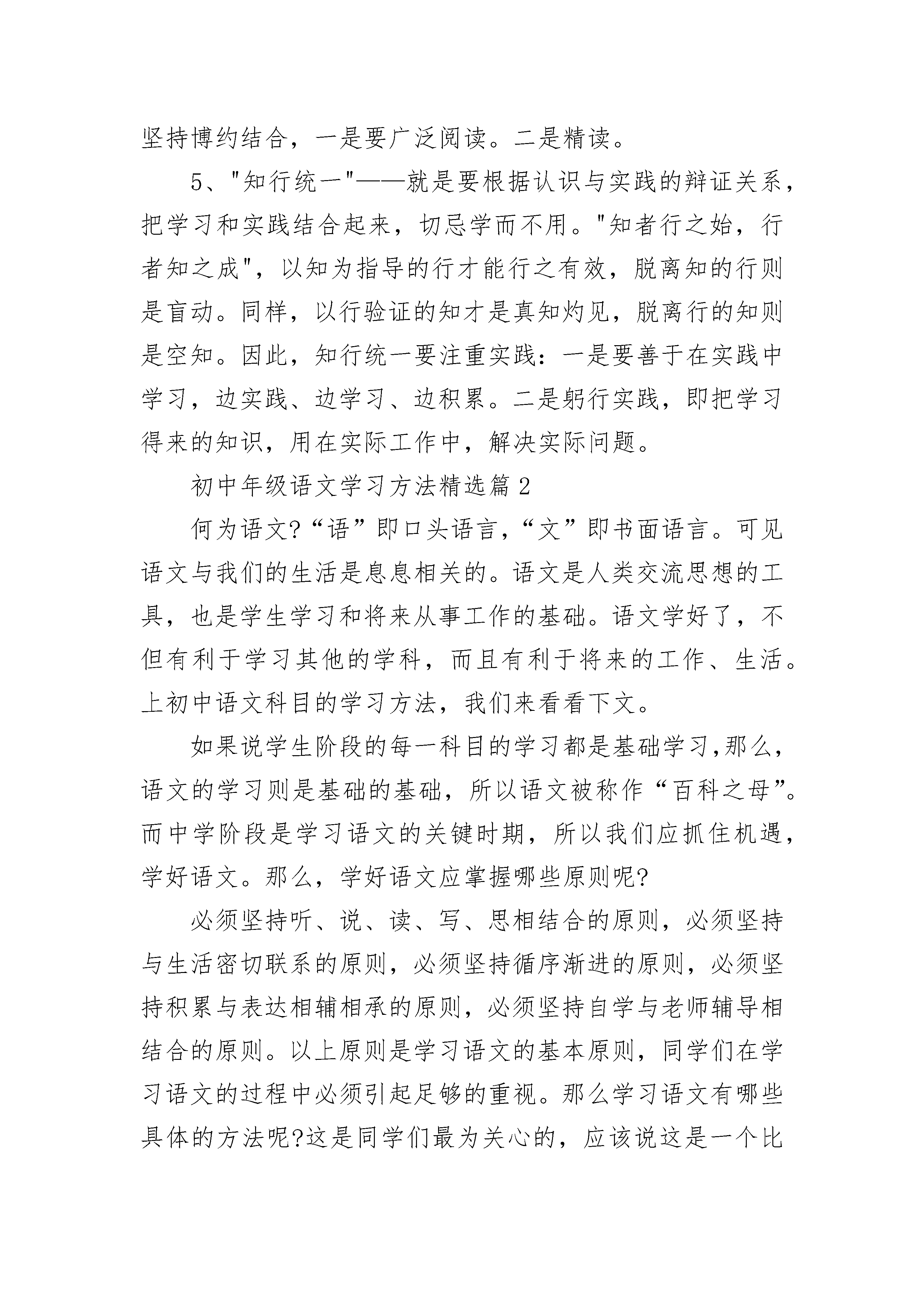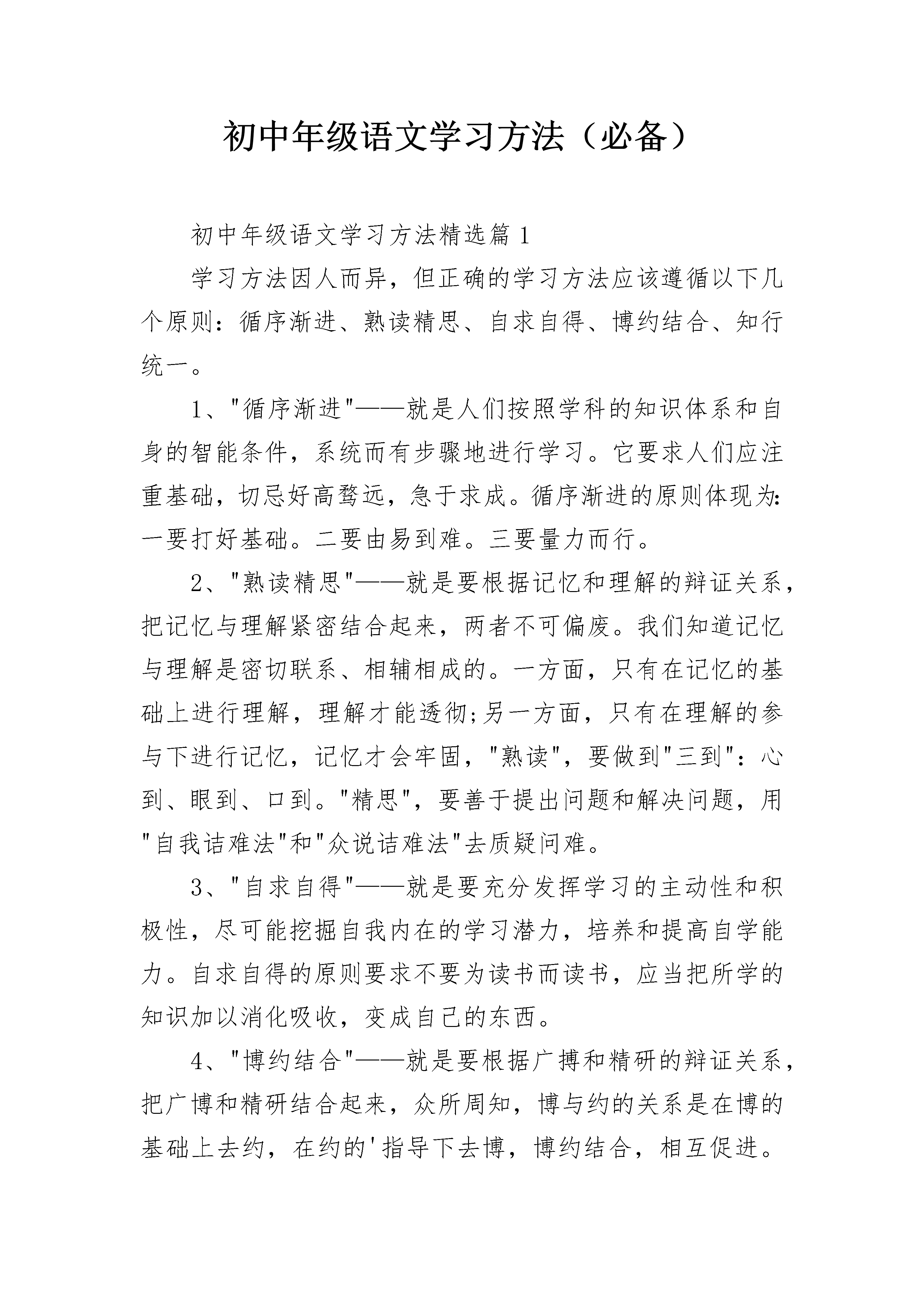 初中年级语文学习方法(必备)初中年级语文学习方法精选篇1学习方法因人而异,但正确的学习方法应该遵循以下几个原则:循序渐进、熟读精思、自求自得、博约结合、知行统一。1、"循序渐进"——就是人们按照学科的知识体系和自身的智能条件,系统而有步骤地进行学习。它要求人们应注重基础,切忌好高骛远,急于求成。循序渐进的原则体现为:一要打好基础。二要由易到难。三要量力而行。2、"熟读精思"——就是要根据记忆和理解的辩证关系,把记忆与理解紧密结合起来,两者不可偏废。我们知道记忆与理解是密切联系、相辅相成的。一方面,只有在记忆的基础上进行理解,理解才能透彻;另一方面,只有在理解的参与下进行记忆,记忆才会牢固,"熟读",要做到"三到":心到、眼到、口到。"精思",要善于提出问题和解决问题,用"自我诘难法"和"众说诘难法"去质疑问难。3、"自求自得"——就是要充分发挥学习的主动性和积极性,尽可能挖掘自我内在的学习潜力,培养和提高自学能力。自求自得的原则要求不要为读书而读书,应当把所学的知识加以消化吸收,变成自己的东西。4、"博约结合"——就是要根据广搏和精研的辩证关系,把广博和精研结合起来,众所周知,博与约的关系是在博的基础上去约,在约的'指导下去博,博约结合,相互促进。坚持博约结合,一是要广泛阅读。二是精读。5、"知行统一"——就是要根据认识与实践的辩证关系,把学习和实践结合起来,切忌学而不用。"知者行之始,行者知之成",以知为指导的行才能行之有效,脱离知的行则是盲动。同样,以行验证的知才是真知灼见,脱离行的知则是空知。因此,知行统一要注重实践:一是要善于在实践中学习,边实践、边学习、边积累。二是躬行实践,即把学习得来的知识,用在实际工作中,解决实际问题。初中年级语文学习方法精选篇2何为语文?“语”即口头语言,“文”即书面语言。可见语文与我们的生活是息息相关的。语文是人类交流思想的工具,也是学生学习和将来从事工作的基础。语文学好了,不但有利于学习其他的学科,而且有利于将来的工作、生活。上初中语文科目的学习方法,我们来看看下文。如果说学生阶段的每一科目的学习都是基础学习,那么,语文的学习则是基础的基础,所以语文被称作“百科之母”。而中学阶段是学习语文的关键时期,所以我们应抓住机遇,学好语文。那么,学好语文应掌握哪些原则呢?必须坚持听、说、读、写、思相结合的原则,必须坚持与生活密切联系的原则,必须坚持循序渐进的原则,必须坚持积累与表达相辅相承的原则,必须坚持自学与老师辅导相结合的原则。以上原则是学习语文的基本原则,同学们在学习语文的过程中必须引起足够的重视。那么学习语文有哪些具体的方法呢?这是同学们最为关心的,应该说这是一个比较大的话题,细说说全不容易,我们不妨分几个小的专题来讲述,以图以斑窥豹,愿对同学们有所启迪。一、怎样学好语文课本语文课本是文选式的,是教育专家们倾注了心血从浩如烟海的中外文化中精选而出的,其中的作品是文质兼美的,是最好的学习范本,所以学好语文课本是十分必要的。那么如何学好语文课本呢?(一)注重预习,质疑问难。所谓预习,就是在老师讲课之前自己预先学习,预习分近期预习和远期预习,远期预习是指提前一个月,几个月的预习。比如假期中自学整册语文课本;近期预习指课前预习和章节前的一两个星期的预习。预习最大的好处就是培养自学能力,发现自己知识的缺陷,以利改正,同时有利于认真听课。语文课文的预习可分如下步骤进行,可称作“四遍八步读书法”。第一遍,跳读。完成两步任务:①识记作者及文章梗概②识记主要人、事、物或观点。应达到每分钟一千五百字的速度。第二遍,速读。完成三、四步任务③复述内容④理清结构层次,每分钟一千字。第三遍、细读。完成五、六步任务:⑤理解字词句;不理解的查查工具书。⑥圈点摘要重要部分⑦归纳中心思想。读的速度,一般跟朗读相同,每分钟二百字。第四遍,精读,完成八步任务⑧分析文章写作特色的任务。根据需要确定读的速度,或一带而过非重点部分,或仔细推敲品味重点段落关键词语。这种预习法,不是固定不变的,可灵活掌握,对有的文章可省去某一步或某几步。预习时要在课本上圈点勾画,标出重点、难点、疑问点。预习的关键是思考,思考文章背后的东西,不要只留于表面,留于浅层次的理解。如遇到百思不得其解的内容可上课认真听讲,认真讨论,也可向老师请教,千万不要担心问题的质量,真正做到“不耻下问”。(二)专心听课,主动发言。课前进行了预习,不懂的问题记下后,上课时就有了针对性:已经明白的问题,听了等于复习一次;不明白的问题,就听得格外仔细、认真。听课时力求做到“五到”:耳到、眼到、口到、手到、心到。耳到即耳听。注意听老师的讲授,听同学的提问,听大家的讨论,听同学的不同见解,听老师答疑。眼到即眼看。认真看教材,看必要的参考资料,看老师的表情、手势,看老师的板书,也可以看