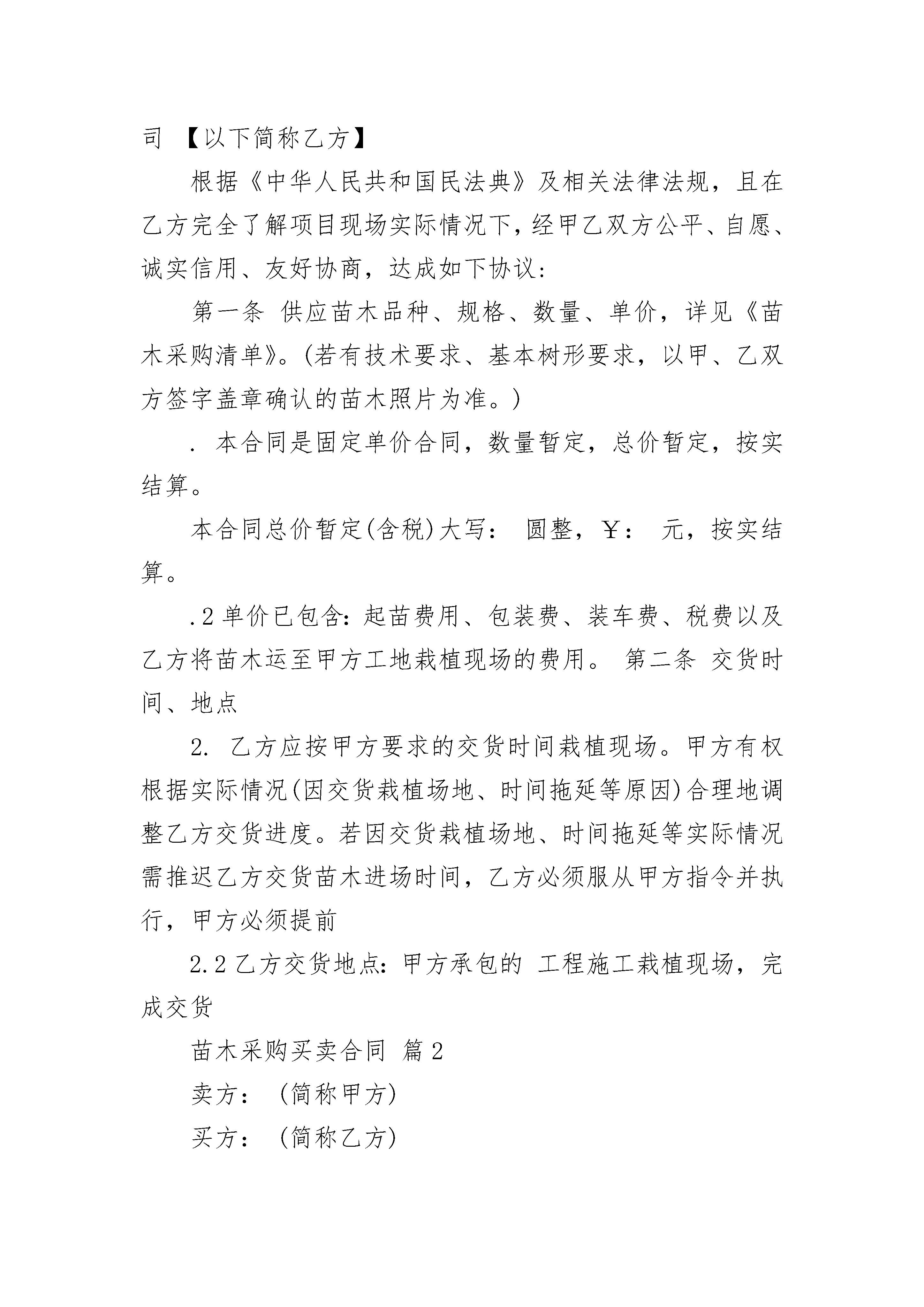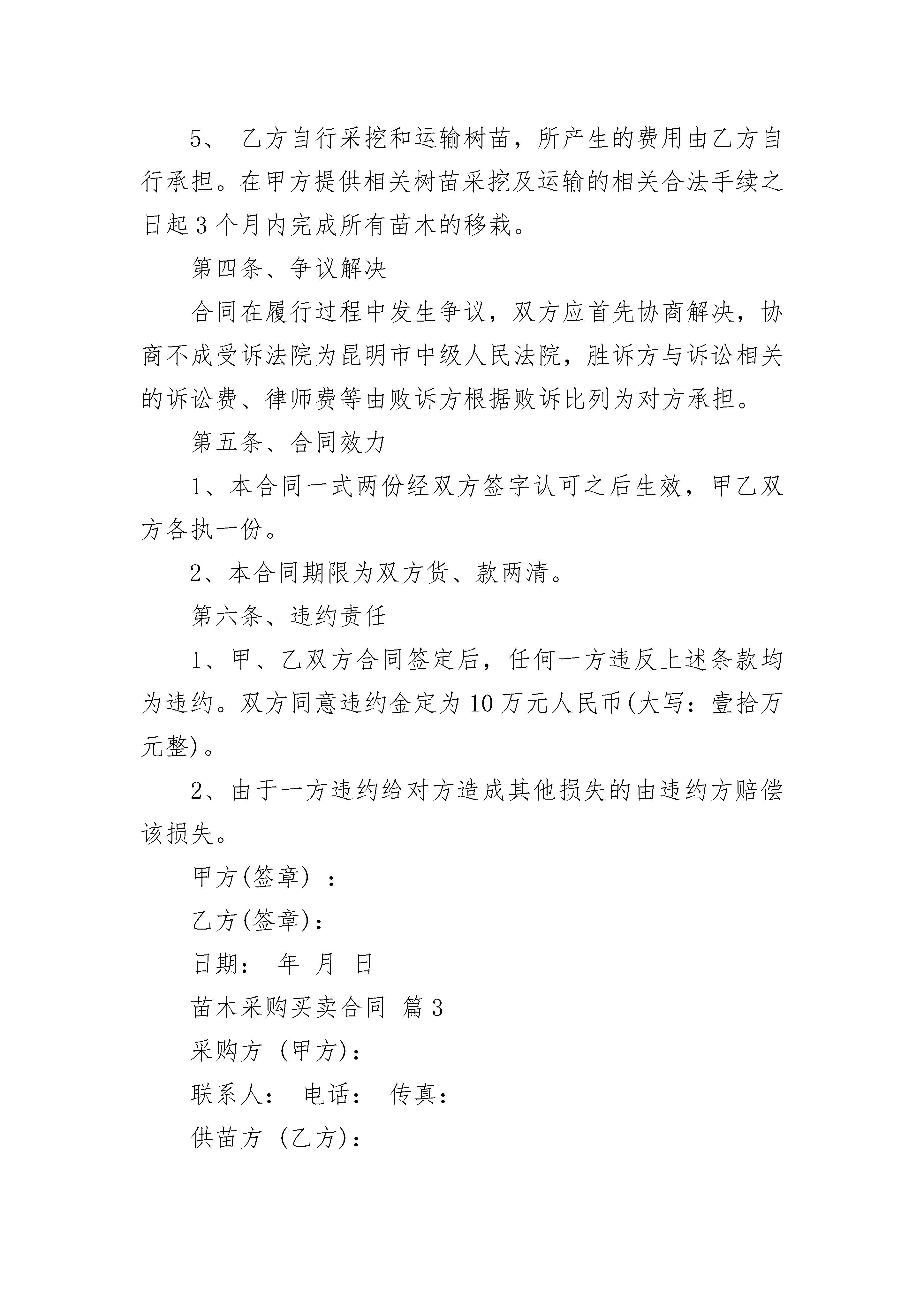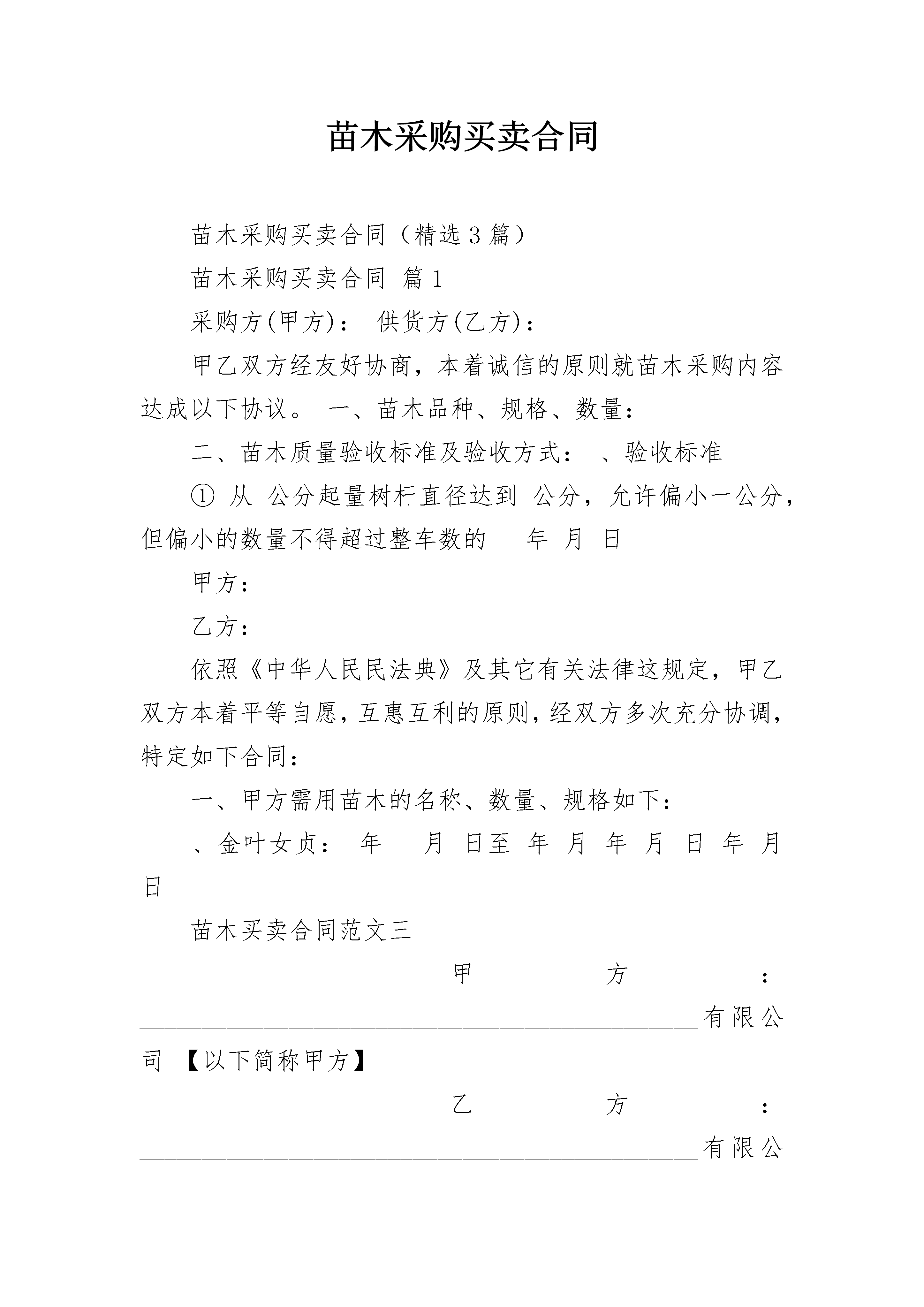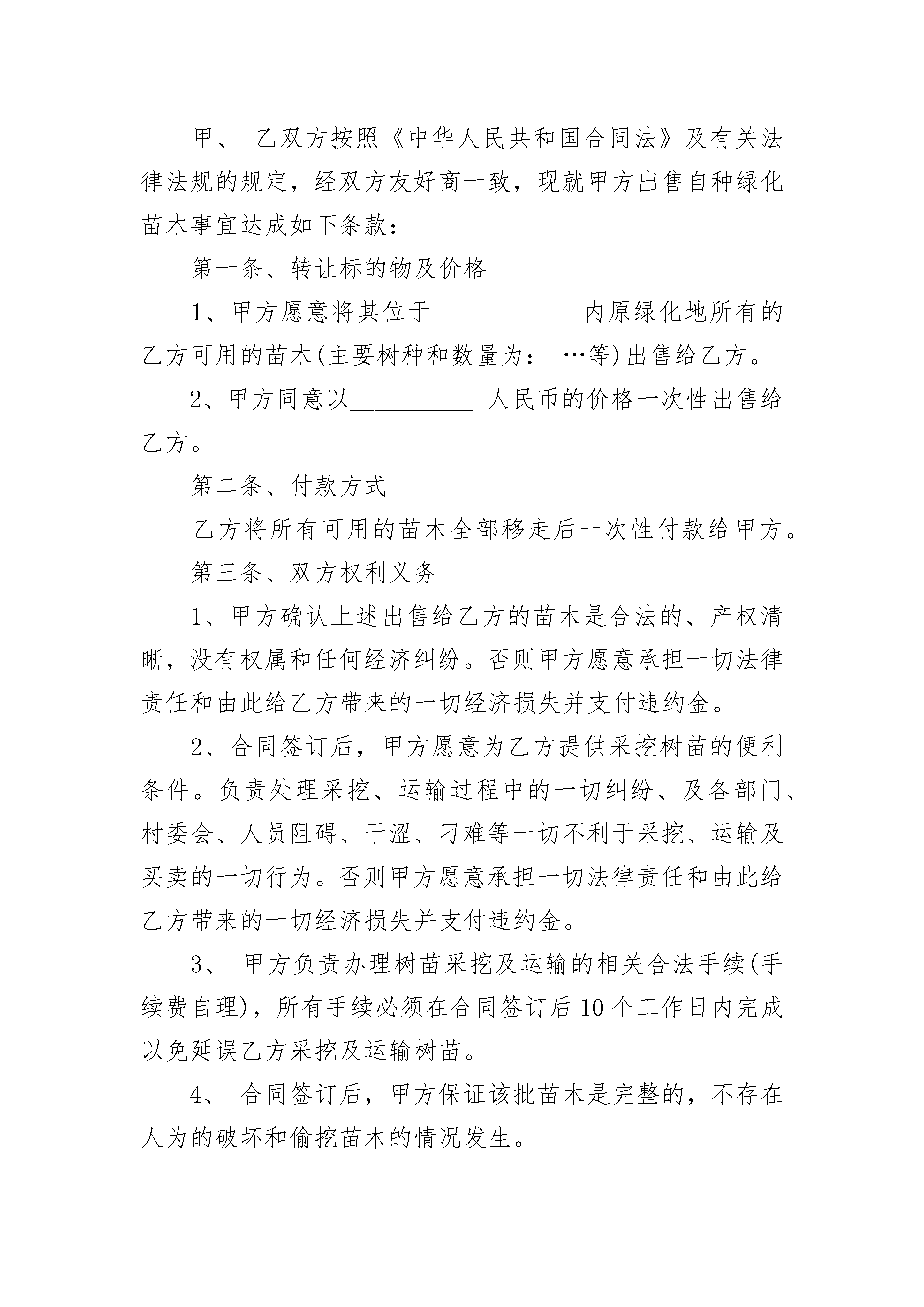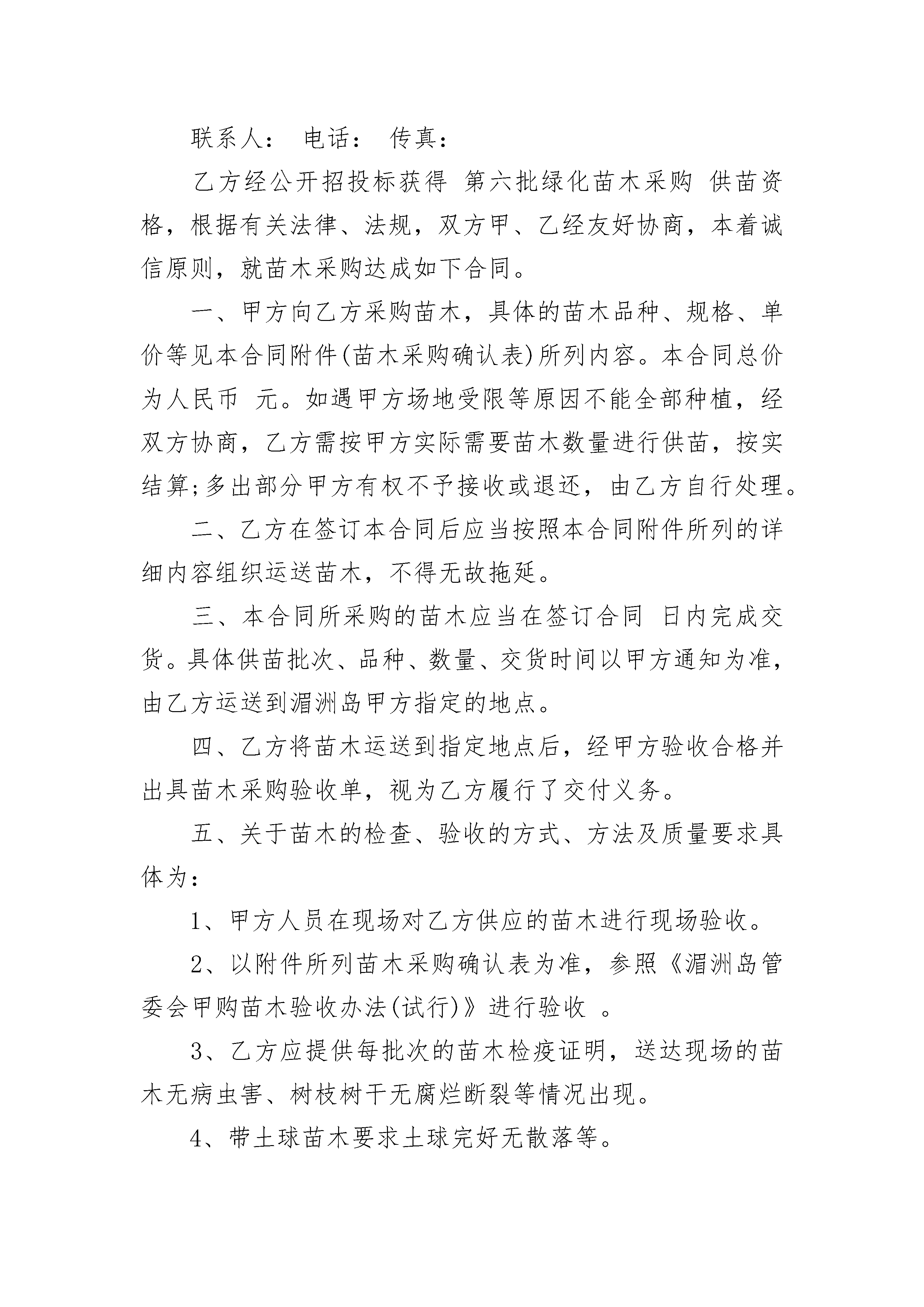 苗木采购买卖合同苗木采购买卖合同(精选3篇)苗木采购买卖合同篇1采购方(甲方):供货方(乙方):甲乙双方经友好协商,本着诚信的原则就苗木采购内容达成以下协议。一、苗木品种、规格、数量:二、苗木质量验收标准及验收方式:、验收标准①从公分起量树杆直径达到公分,允许偏小一公分,但偏小的数量不得超过整车数的年月日甲方:乙方:依照《中华人民民法典》及其它有关法律这规定,甲乙双方本着平等自愿,互惠互利的原则,经双方多次充分协调,特定如下合同:一、甲方需用苗木的名称、数量、规格如下:、金叶女贞:年月日至年月年月日年月日苗木买卖合同范文三甲方:_____________________________________________有限公司【以下简称甲方】乙方:_____________________________________________有限公司【以下简称乙方】根据《中华人民共和国民法典》及相关法律法规,且在乙方完全了解项目现场实际情况下,经甲乙双方公平、自愿、诚实信用、友好协商,达成如下协议:第一条供应苗木品种、规格、数量、单价,详见《苗木采购清单》。(若有技术要求、基本树形要求,以甲、乙双方签字盖章确认的苗木照片为准。).本合同是固定单价合同,数量暂定,总价暂定,按实结算。本合同总价暂定(含税)大写:圆整,¥:元,按实结算。.2单价已包含:起苗费用、包装费、装车费、税费以及乙方将苗木运至甲方工地栽植现场的费用。第二条交货时间、地点2.乙方应按甲方要求的交货时间栽植现场。甲方有权根据实际情况(因交货栽植场地、时间拖延等原因)合理地调整乙方交货进度。若因交货栽植场地、时间拖延等实际情况需推迟乙方交货苗木进场时间,乙方必须服从甲方指令并执行,甲方必须提前2.2乙方交货地点:甲方承包的工程施工栽植现场,完成交货苗木采购买卖合同篇2卖方:(简称甲方)买方:(简称乙方)甲、乙双方按照《中华人民共和国合同法》及有关法律法规的规定,经双方友好商一致,现就甲方出售自种绿化苗木事宜达成如下条款:第一条、转让标的物及价格1、甲方愿意将其位于____________内原绿化地所有的乙方可用的苗木(主要树种和数量为:…等)出售给乙方。2、甲方同意以__________人民币的价格一次性出售给乙方。第二条、付款方式乙方将所有可用的苗木全部移走后一次性付款给甲方。第三条、双方权利义务1、甲方确认上述出售给乙方的苗木是合法的、产权清晰,没有权属和任何经济纠纷。否则甲方愿意承担一切法律责任和由此给乙方带来的一切经济损失并支付违约金。2、合同签订后,甲方愿意为乙方提供采挖树苗的便利条件。负责处理采挖、运输过程中的一切纠纷、及各部门、村委会、人员阻碍、干涩、刁难等一切不利于采挖、运输及买卖的一切行为。否则甲方愿意承担一切法律责任和由此给乙方带来的一切经济损失并支付违约金。3、甲方负责办理树苗采挖及运输的相关合法手续(手续费自理),所有手续必须在合同签订后10个工作日内完成以免延误乙方采挖及运输树苗。4、合同签订后,甲方保证该批苗木是完整的,不存在人为的破坏和偷挖苗木的情况发生。5、乙方自行采挖和运输树苗,所产生的费用由乙方自行承担。在甲方提供相关树苗采挖及运输的相关合法手续之日起3个月内完成所有苗木的移栽。第四条、争议解决合同在履行过程中发生争议,双方应首先协商解决,协商不成受诉法院为昆明市中级人民法院,胜诉方与诉讼相关的诉讼费、律师费等由败诉方根据败诉比列为对方承担。第五条、合同效力1、本合同一式两份经双方签字认可之后生效,甲乙双方各执一份。2、本合同期限为双方货、款两清。第六条、违约责任1、甲、乙双方合同签定后,任何一方违反上述条款均为违约。双方同意违约金定为10万元人民币(大写:壹拾万元整)。2、由于一方违约给对方造成其他损失的由违约方赔偿该损失。甲方(签章):乙方(签章):日期:年月日苗木采购买卖合同篇3采购方(甲方):联系人:电话:传真:供苗方(乙方):联系人:电话:传真:乙方经公开招投标获得第六批绿化苗木采购供苗资格,根据有关法律、法规,双方甲、乙经友好协商,本着诚信原则,就苗木采购达成如下合同。一、甲方向乙方采购苗木,具体的苗木品种、规格、单价等见本合同附件(苗木采购确认表)所列内容。本合同总价为人民币元。如遇甲方场地受限等原因不能全部种植,经双方协商,乙方需按甲方实际需要苗木数量进行供苗,按实结算;多出部分甲方有权不予接收或退还,由乙方自行处理。二、乙方在签订本合同后应当按照本合同附件所列的详细内容组织运送苗木,不得无故拖延。三、本合同所采购的苗木应当在签订合同日内完成交货。具体供苗批次、品种、数量、交货时间以甲方通知为准,由乙方运送到湄洲岛甲方指定的地点。四、乙方将苗木运送到指定地点后,经甲方验收合格并出具苗木采购验收单,视为乙方履行了交