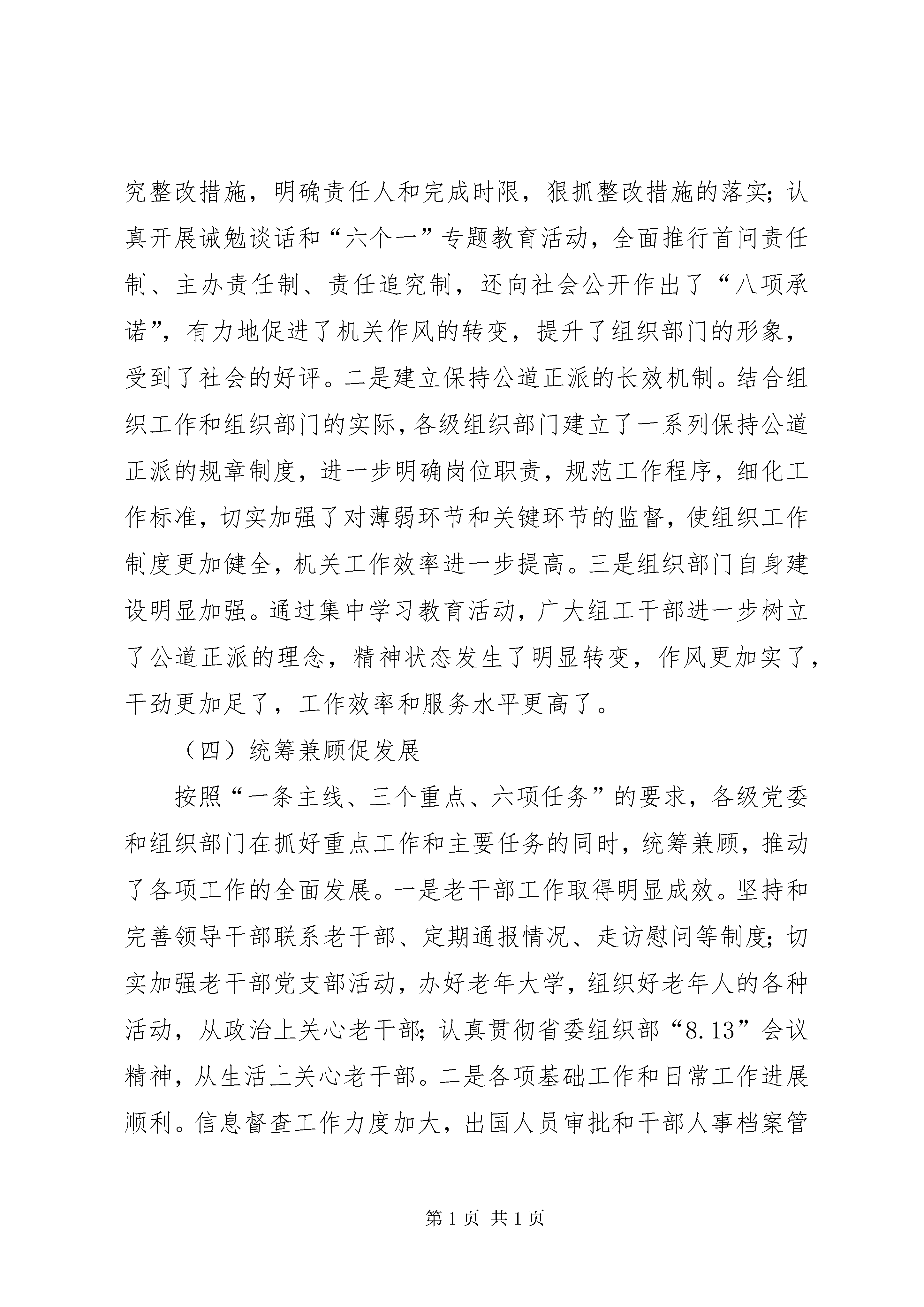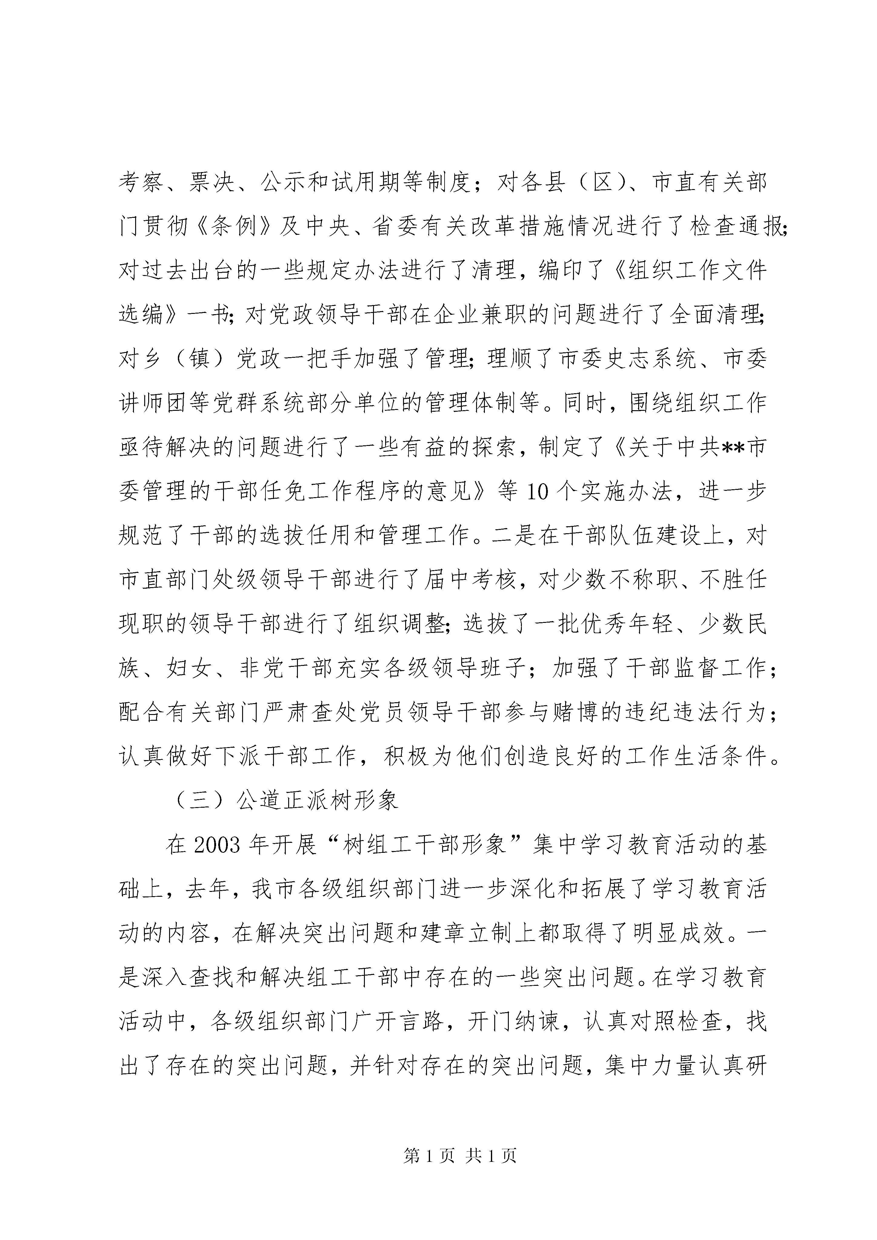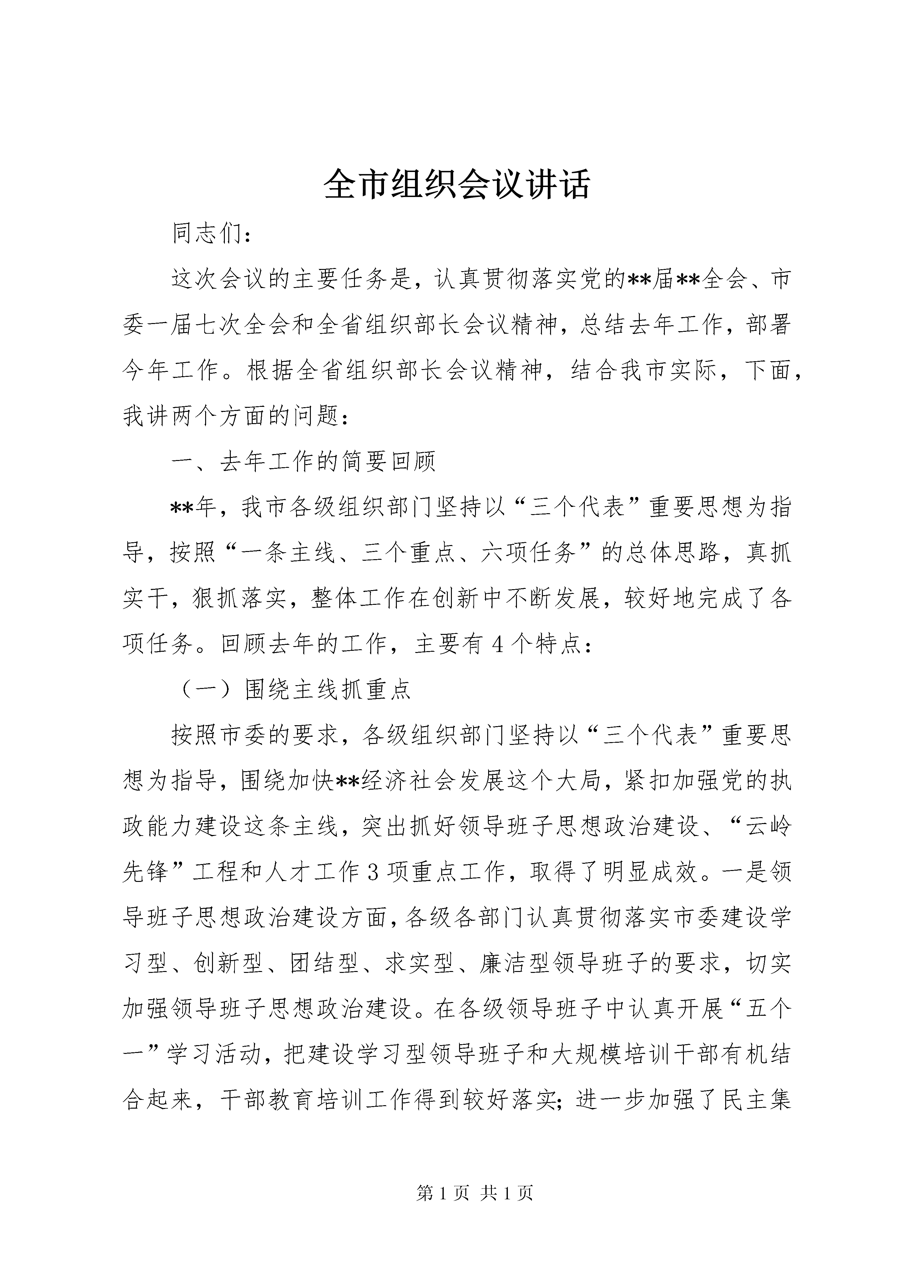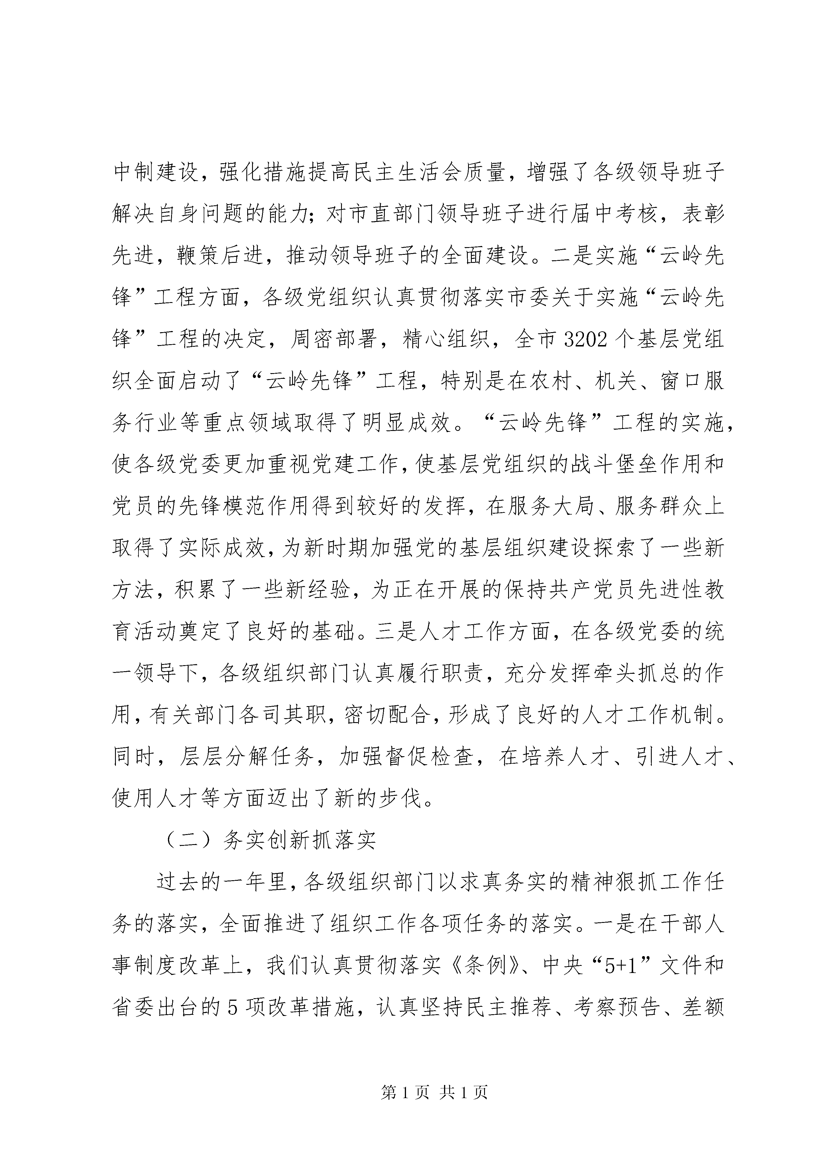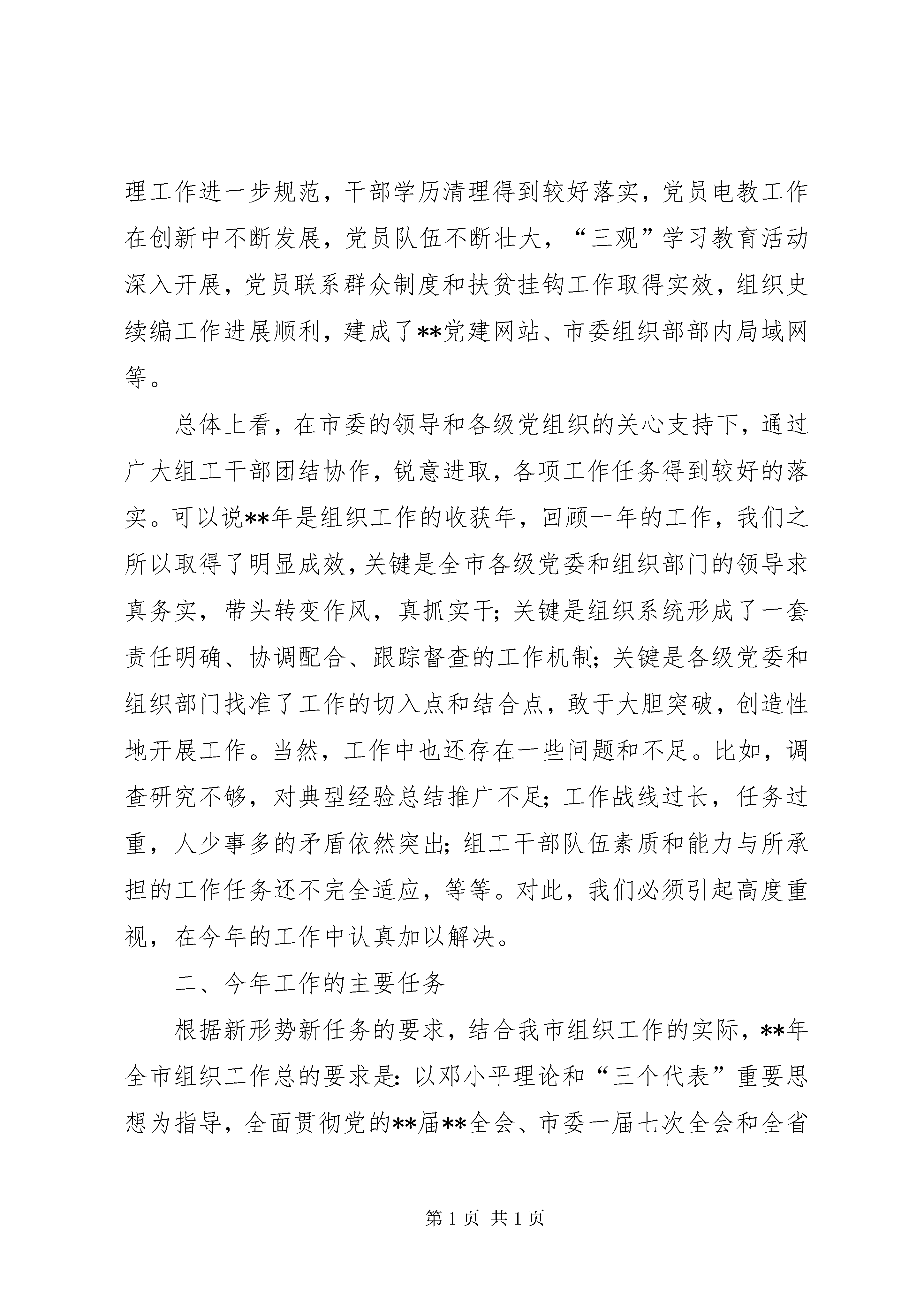全市组织会议讲话同志们:这次会议的主要任务是,认真贯彻落实党的**届**全会、市委一届七次全会和全省组织部长会议精神,总结去年工作,部署今年工作。根据全省组织部长会议精神,结合我市实际,下面,我讲两个方面的问题:一、去年工作的简要回顾**年,我市各级组织部门坚持以“三个代表”重要思想为指导,按照“一条主线、三个重点、六项任务”的总体思路,真抓实干,狠抓落实,整体工作在创新中不断发展,较好地完成了各项任务。回顾去年的工作,主要有4个特点:(一)围绕主线抓重点按照市委的要求,各级组织部门坚持以“三个代表”重要思想为指导,围绕加快**经济社会发展这个大局,紧扣加强党的执政能力建设这条主线,突出抓好领导班子思想政治建设、“云岭先锋”工程和人才工作3项重点工作,取得了明显成效。一是领导班子思想政治建设方面,各级各部门认真贯彻落实市委建设学习型、创新型、团结型、求实型、廉洁型领导班子的要求,切实加强领导班子思想政治建设。在各级领导班子中认真开展“五个一”学习活动,把建设学习型领导班子和大规模培训干部有机结合起来,干部教育培训工作得到较好落实;进一步加强了民主集中制建设,强化措施提高民主生活会质量,增强了各级领导班子解决自身问题的能力;对市直部门领导班子进行届中考核,表彰先进,鞭策后进,推动领导班子的全面建设。二是实施“云岭先锋”工程方面,各级党组织认真贯彻落实市委关于实施“云岭先锋”工程的决定,周密部署,精心组织,全市3202个基层党组织全面启动了“云岭先锋”工程,特别是在农村、机关、窗口服务行业等重点领域取得了明显成效。“云岭先锋”工程的实施,使各级党委更加重视党建工作,使基层党组织的战斗堡垒作用和党员的先锋模范作用得到较好的发挥,在服务大局、服务群众上取得了实际成效,为新时期加强党的基层组织建设探索了一些新方法,积累了一些新经验,为正在开展的保持共产党员先进性教育活动奠定了良好的基础。三是人才工作方面,在各级党委的统一领导下,各级组织部门认真履行职责,充分发挥牵头抓总的作用,有关部门各司其职,密切配合,形成了良好的人才工作机制。同时,层层分解任务,加强督促检查,在培养人才、引进人才、使用人才等方面迈出了新的步伐。(二)务实创新抓落实过去的一年里,各级组织部门以求真务实的精神狠抓工作任务的落实,全面推进了组织工作各项任务的落实。一是在干部人事制度改革上,我们认真贯彻落实《条例》、中央“5+1”文件和省委出台的5项改革措施,认真坚持民主推荐、考察预告、差额考察、票决、公示和试用期等制度;对各县(区)、市直有关部门贯彻《条例》及中央、省委有关改革措施情况进行了检查通报;对过去出台的一些规定办法进行了清理,编印了《组织工作文件选编》一书;对党政领导干部在企业兼职的问题进行了全面清理;对乡(镇)党政一把手加强了管理;理顺了市委史志系统、市委讲师团等党群系统部分单位的管理体制等。同时,围绕组织工作亟待解决的问题进行了一些有益的探索,制定了《关于中共**市委管理的干部任免工作程序的意见》等10个实施办法,进一步规范了干部的选拔任用和管理工作。二是在干部队伍建设上,对市直部门处级领导干部进行了届中考核,对少数不称职、不胜任现职的领导干部进行了组织调整;选拔了一批优秀年轻、少数民族、妇女、非党干部充实各级领导班子;加强了干部监督工作;配合有关部门严肃查处党员领导干部参与赌博的违纪违法行为;认真做好下派干部工作,积极为他们创造良好的工作生活条件。(三)公道正派树形象在2003年开展“树组工干部形象”集中学习教育活动的基础上,去年,我市各级组织部门进一步深化和拓展了学习教育活动的内容,在解决突出问题和建章立制上都取得了明显成效。一是深入查找和解决组工干部中存在的一些突出问题。在学习教育活动中,各级组织部门广开言路,开门纳谏,认真对照检查,找出了存在的突出问题,并针对存在的突出问题,集中力量认真研究整改措施,明确责任人和完成时限,狠抓整改措施的落实;认真开展诫勉谈话和“六个一”专题教育活动,全面推行首问责任制、主办责任制、责任追究制,还向社会公开作出了“八项承诺”,有力地促进了机关作风的转变,提升了组织部门的形象,受到了社会的好评。二是建立保持公道正派的长效机制。结合组织工作和组织部门的实际,各级组织部门建立了一系列保持公道正派的规章制度,进一步明确岗位职责,规范工作程序,细化工作标准,切实加强了对薄弱环节和关键环节的监督,使组织工作制度更加健全,机关工作效率进一步提高。三是组织部门自身建设明显加强。通过集中学习教育活动,广大组工干部进一步树立了公道正派的理念,精神状态发生了明显转变,作风更加实了,干劲更加足了,工作效率和服务水平更高了。(四)统筹兼顾促发展按照“一条主线、三个重点、六项任务”的要求,各级党委和组织部门在抓好重点工作