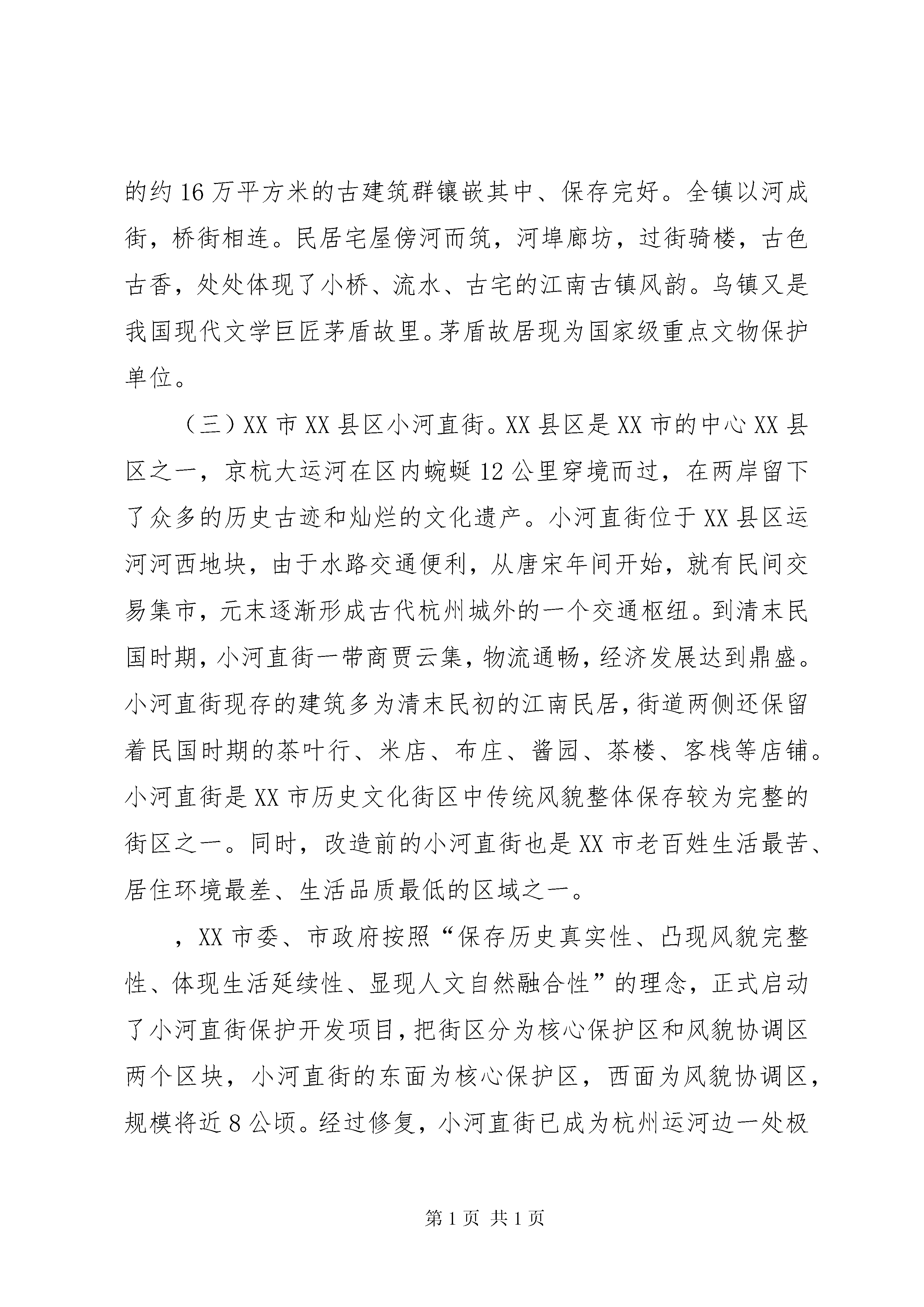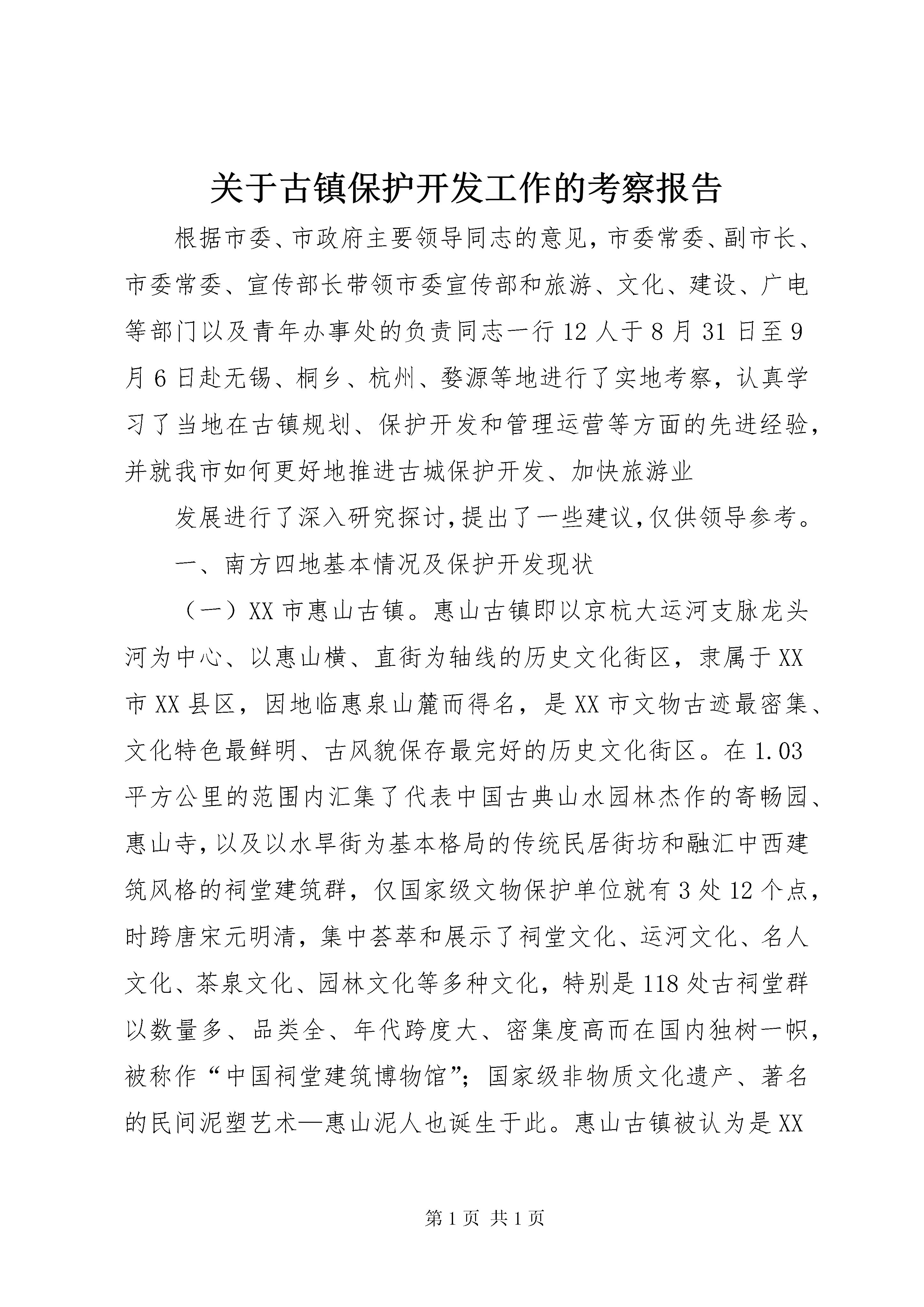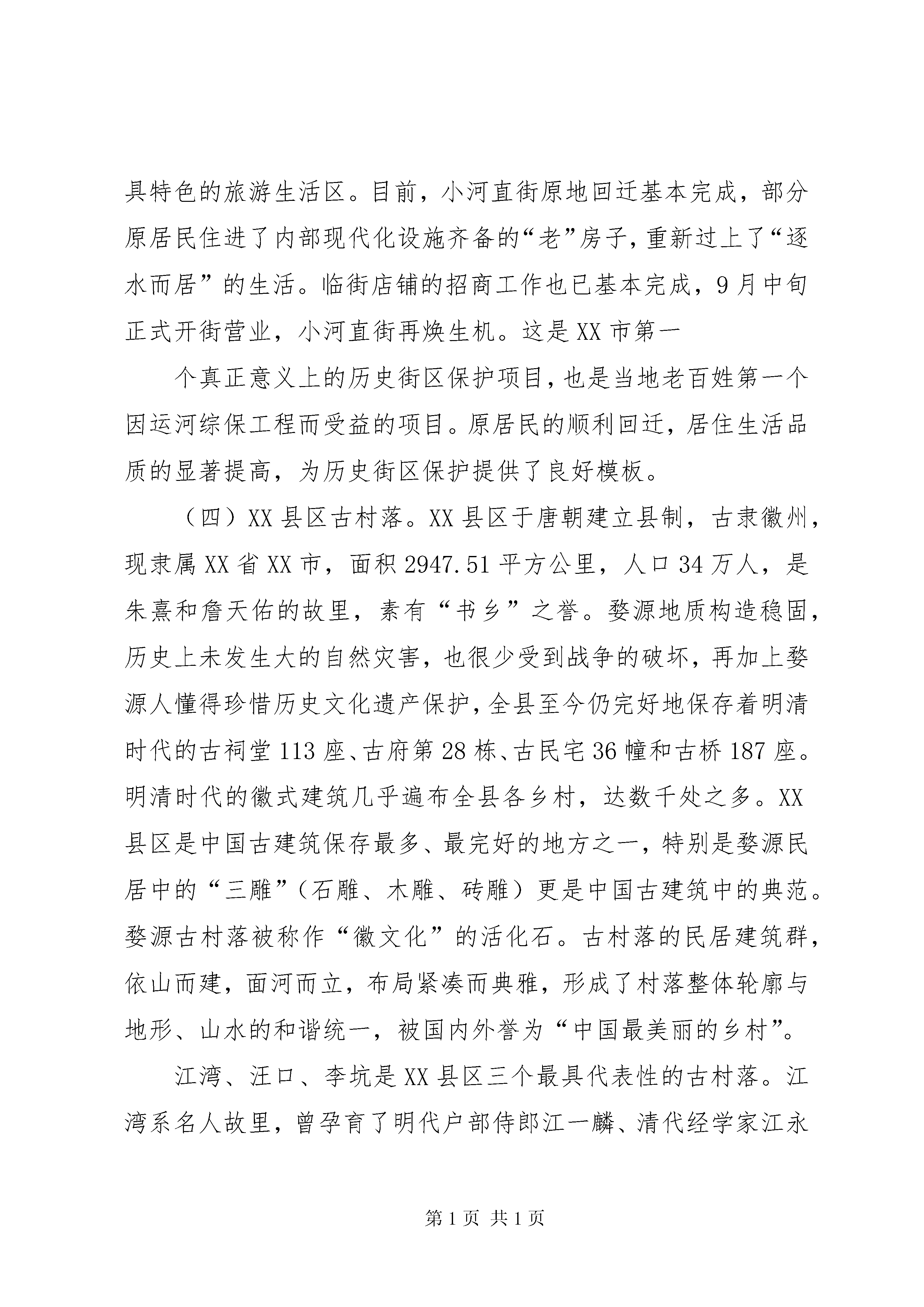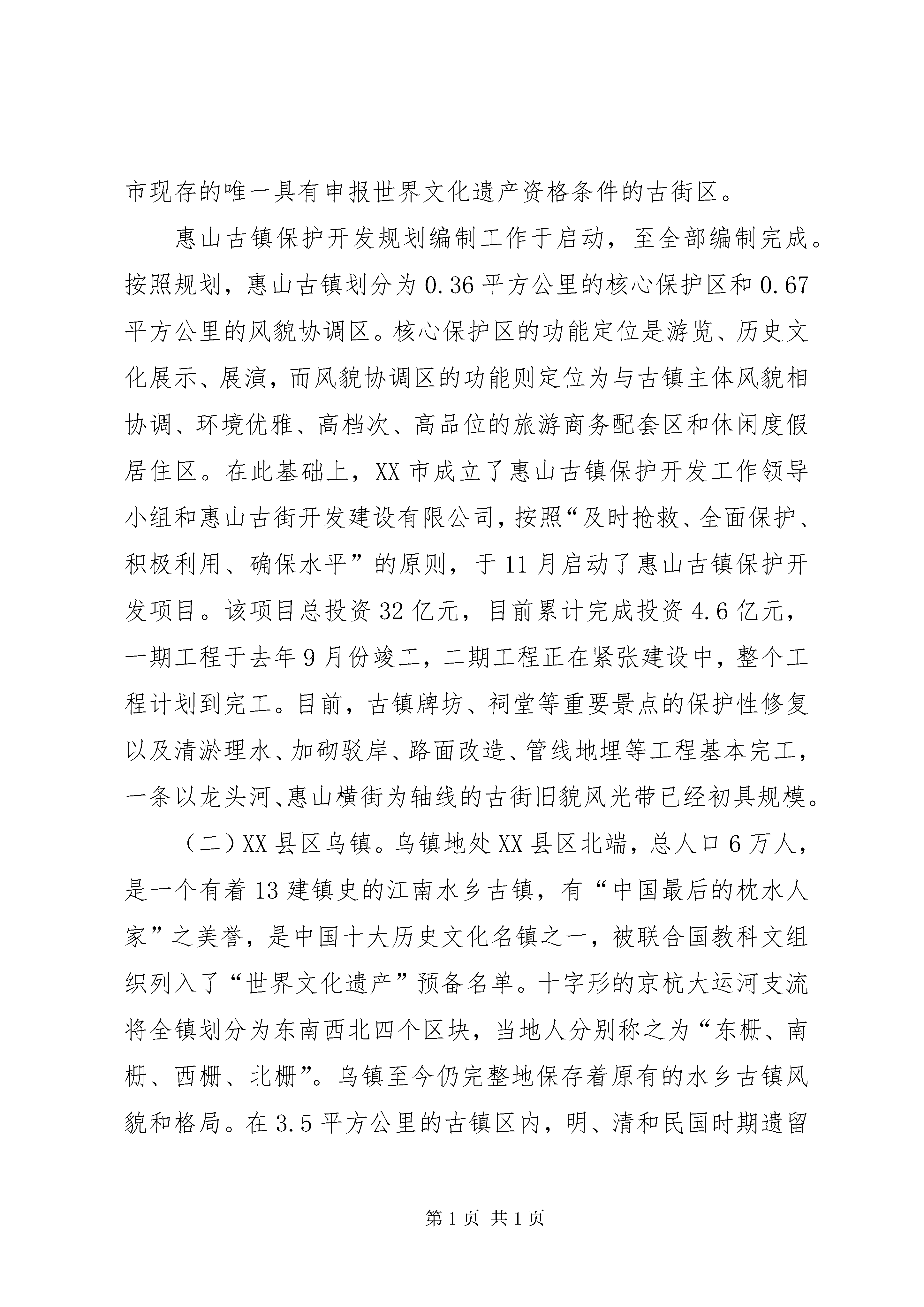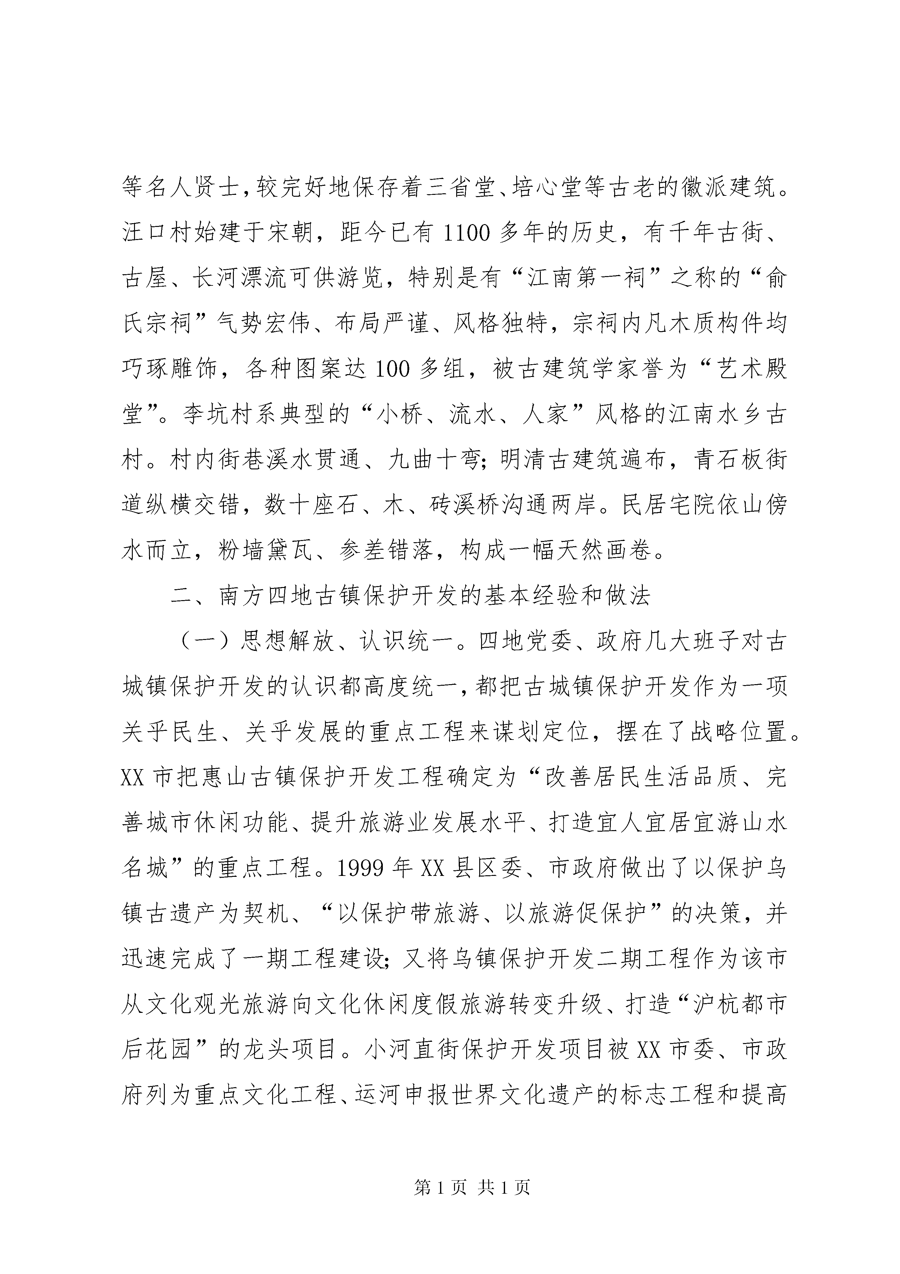 关于古镇保护开发工作的考察报告根据市委、市政府主要领导同志的意见,市委常委、副市长、市委常委、宣传部长带领市委宣传部和旅游、文化、建设、广电等部门以及青年办事处的负责同志一行12人于8月31日至9月6日赴无锡、桐乡、杭州、婺源等地进行了实地考察,认真学习了当地在古镇规划、保护开发和管理运营等方面的先进经验,并就我市如何更好地推进古城保护开发、加快旅游业发展进行了深入研究探讨,提出了一些建议,仅供领导参考。一、南方四地基本情况及保护开发现状(一)XX市惠山古镇。惠山古镇即以京杭大运河支脉龙头河为中心、以惠山横、直街为轴线的历史文化街区,隶属于XX市XX县区,因地临惠泉山麓而得名,是XX市文物古迹最密集、文化特色最鲜明、古风貌保存最完好的历史文化街区。在1.03平方公里的范围内汇集了代表中国古典山水园林杰作的寄畅园、惠山寺,以及以水旱街为基本格局的传统民居街坊和融汇中西建筑风格的祠堂建筑群,仅国家级文物保护单位就有3处12个点,时跨唐宋元明清,集中荟萃和展示了祠堂文化、运河文化、名人文化、茶泉文化、园林文化等多种文化,特别是118处古祠堂群以数量多、品类全、年代跨度大、密集度高而在国内独树一帜,被称作“中国祠堂建筑博物馆”;国家级非物质文化遗产、著名的民间泥塑艺术—惠山泥人也诞生于此。惠山古镇被认为是XX市现存的唯一具有申报世界文化遗产资格条件的古街区。惠山古镇保护开发规划编制工作于启动,至全部编制完成。按照规划,惠山古镇划分为0.36平方公里的核心保护区和0.67平方公里的风貌协调区。核心保护区的功能定位是游览、历史文化展示、展演,而风貌协调区的功能则定位为与古镇主体风貌相协调、环境优雅、高档次、高品位的旅游商务配套区和休闲度假居住区。在此基础上,XX市成立了惠山古镇保护开发工作领导小组和惠山古街开发建设有限公司,按照“及时抢救、全面保护、积极利用、确保水平”的原则,于11月启动了惠山古镇保护开发项目。该项目总投资32亿元,目前累计完成投资4.6亿元,一期工程于去年9月份竣工,二期工程正在紧张建设中,整个工程计划到完工。目前,古镇牌坊、祠堂等重要景点的保护性修复以及清淤理水、加砌驳岸、路面改造、管线地埋等工程基本完工,一条以龙头河、惠山横街为轴线的古街旧貌风光带已经初具规模。(二)XX县区乌镇。乌镇地处XX县区北端,总人口6万人,是一个有着13建镇史的江南水乡古镇,有“中国最后的枕水人家”之美誉,是中国十大历史文化名镇之一,被联合国教科文组织列入了“世界文化遗产”预备名单。十字形的京杭大运河支流将全镇划分为东南西北四个区块,当地人分别称之为“东栅、南栅、西栅、北栅”。乌镇至今仍完整地保存着原有的水乡古镇风貌和格局。在3.5平方公里的古镇区内,明、清和民国时期遗留的约16万平方米的古建筑群镶嵌其中、保存完好。全镇以河成街,桥街相连。民居宅屋傍河而筑,河埠廊坊,过街骑楼,古色古香,处处体现了小桥、流水、古宅的江南古镇风韵。乌镇又是我国现代文学巨匠茅盾故里。茅盾故居现为国家级重点文物保护单位。(三)XX市XX县区小河直街。XX县区是XX市的中心XX县区之一,京杭大运河在区内蜿蜒12公里穿境而过,在两岸留下了众多的历史古迹和灿烂的文化遗产。小河直街位于XX县区运河河西地块,由于水路交通便利,从唐宋年间开始,就有民间交易集市,元末逐渐形成古代杭州城外的一个交通枢纽。到清末民国时期,小河直街一带商贾云集,物流通畅,经济发展达到鼎盛。小河直街现存的建筑多为清末民初的江南民居,街道两侧还保留着民国时期的茶叶行、米店、布庄、酱园、茶楼、客栈等店铺。小河直街是XX市历史文化街区中传统风貌整体保存较为完整的街区之一。同时,改造前的小河直街也是XX市老百姓生活最苦、居住环境最差、生活品质最低的区域之一。,XX市委、市政府按照“保存历史真实性、凸现风貌完整性、体现生活延续性、显现人文自然融合性”的理念,正式启动了小河直街保护开发项目,把街区分为核心保护区和风貌协调区两个区块,小河直街的东面为核心保护区,西面为风貌协调区,规模将近8公顷。经过修复,小河直街已成为杭州运河边一处极具特色的旅游生活区。目前,小河直街原地回迁基本完成,部分原居民住进了内部现代化设施齐备的“老”房子,重新过上了“逐水而居”的生活。临街店铺的招商工作也已基本完成,9月中旬正式开街营业,小河直街再焕生机。这是XX市第一个真正意义上的历史街区保护项目,也是当地老百姓第一个因运河综保工程而受益的项目。原居民的顺利回迁,居住生活品质的显著提高,为历史街区保护提供了良好模板。(四)XX县区古村落。XX县区于唐朝建立县制,古隶徽州,现隶属XX省XX市,面积2947.51平方公里,人口34万人,是朱熹和詹天佑的故里,素有“书乡”之誉。婺源地质构造稳固,历史上未发生大的自然