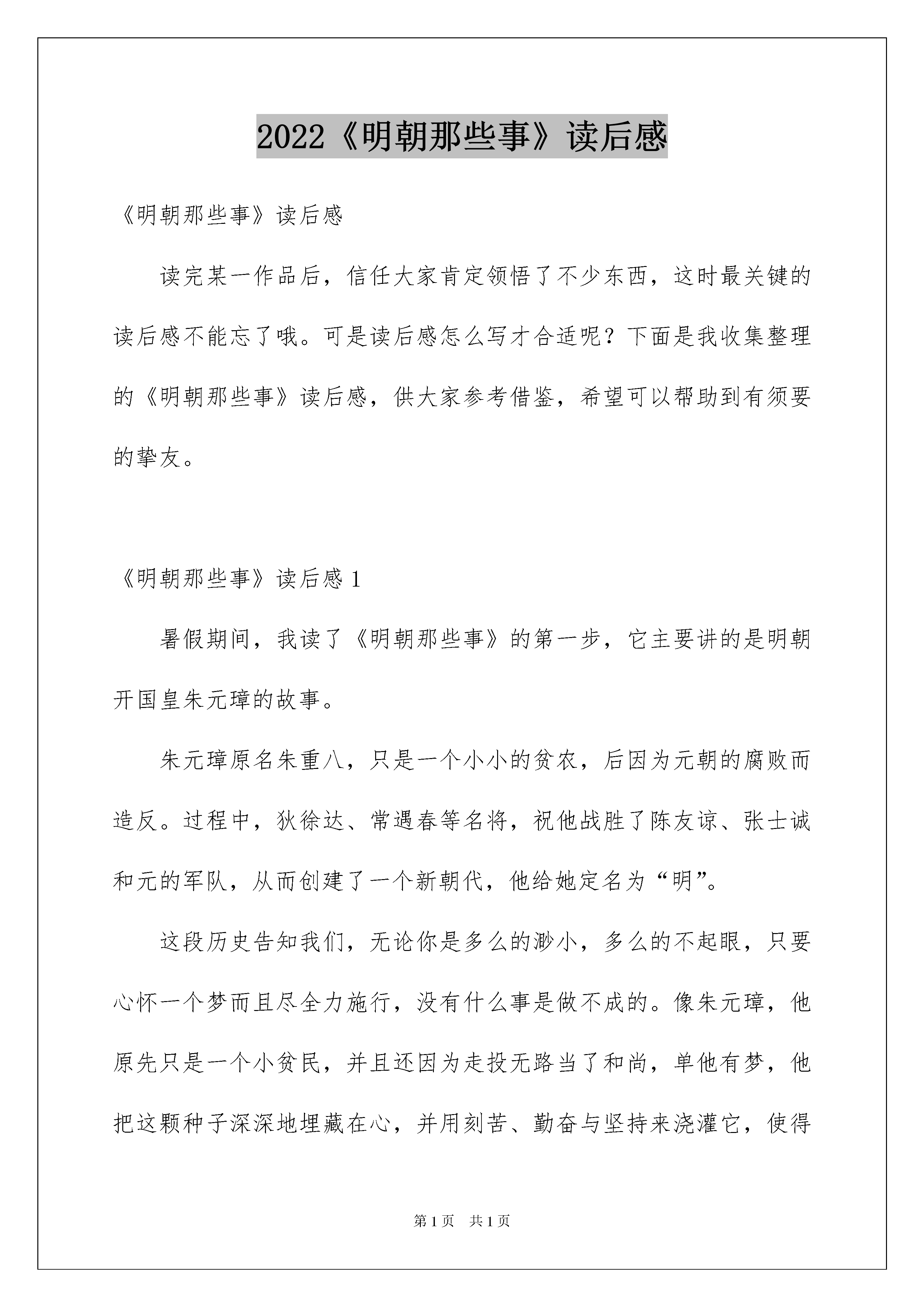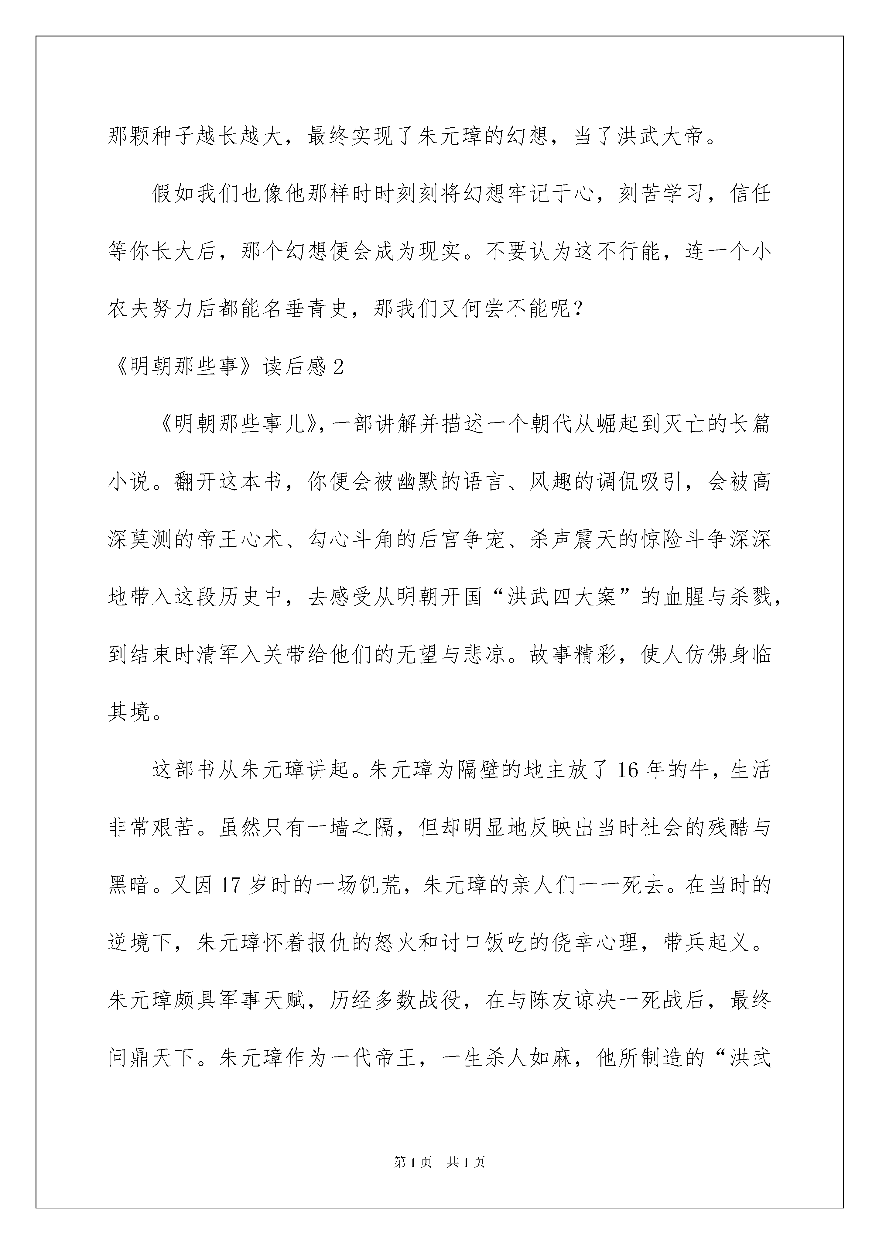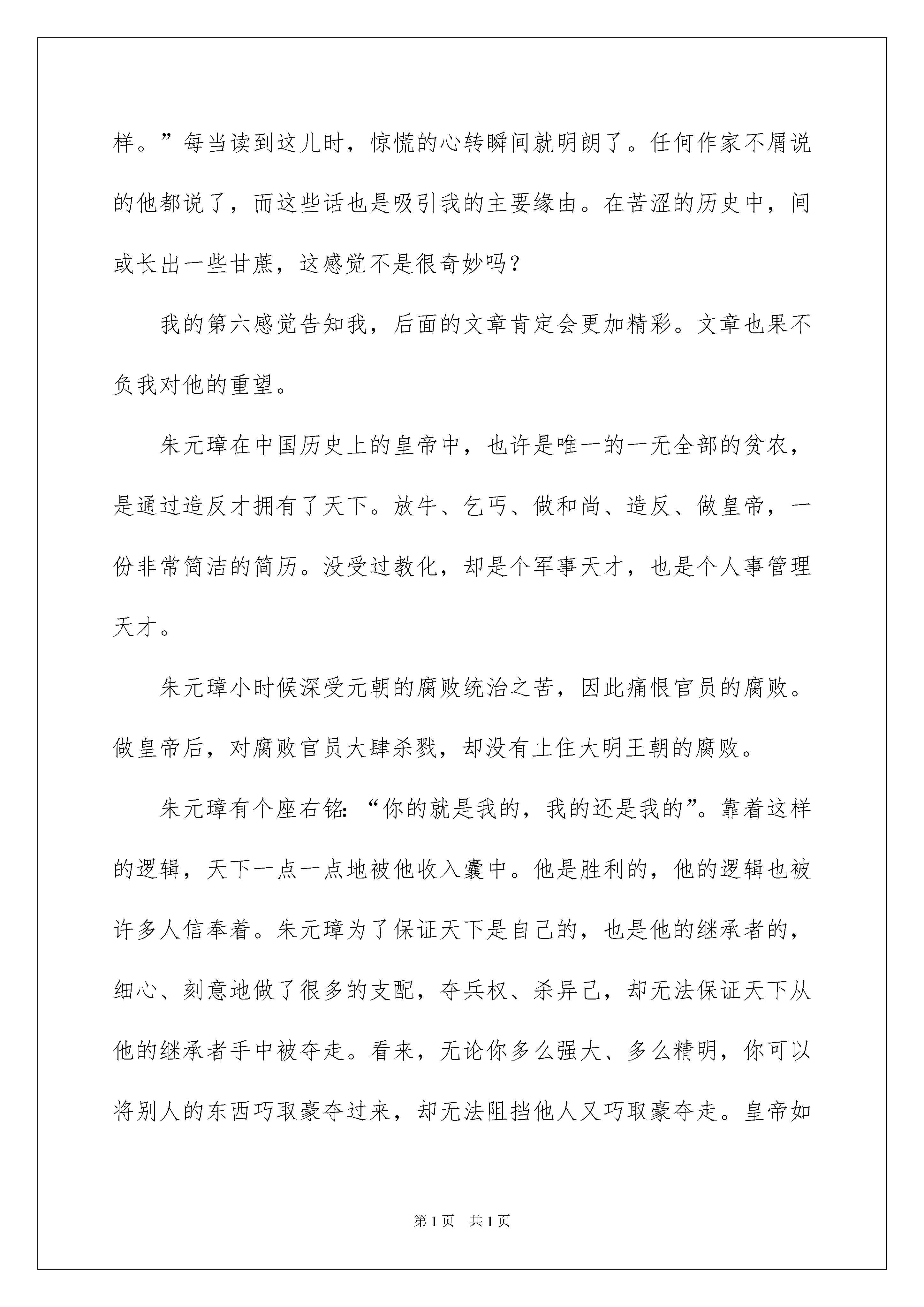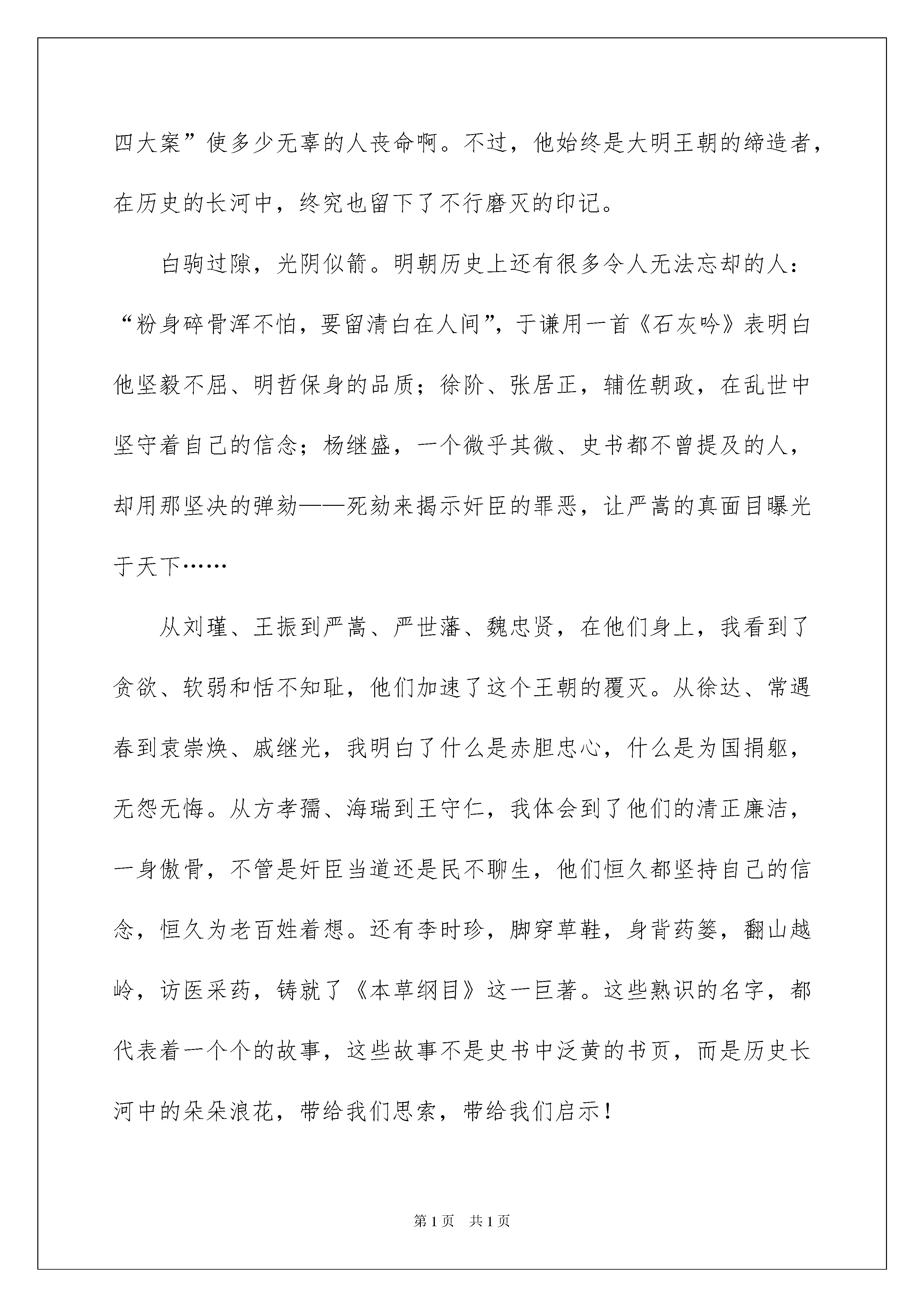2022《明朝那些事》读后感《明朝那些事》读后感读完某一作品后,信任大家肯定领悟了不少东西,这时最关键的读后感不能忘了哦。可是读后感怎么写才合适呢?下面是我收集整理的《明朝那些事》读后感,供大家参考借鉴,希望可以帮助到有须要的挚友。《明朝那些事》读后感1暑假期间,我读了《明朝那些事》的第一步,它主要讲的是明朝开国皇朱元璋的故事。朱元璋原名朱重八,只是一个小小的贫农,后因为元朝的腐败而造反。过程中,狄徐达、常遇春等名将,祝他战胜了陈友谅、张士诚和元的军队,从而创建了一个新朝代,他给她定名为“明”。这段历史告知我们,无论你是多么的渺小,多么的不起眼,只要心怀一个梦而且尽全力施行,没有什么事是做不成的。像朱元璋,他原先只是一个小贫民,并且还因为走投无路当了和尚,单他有梦,他把这颗种子深深地埋藏在心,并用刻苦、勤奋与坚持来浇灌它,使得那颗种子越长越大,最终实现了朱元璋的幻想,当了洪武大帝。假如我们也像他那样时时刻刻将幻想牢记于心,刻苦学习,信任等你长大后,那个幻想便会成为现实。不要认为这不行能,连一个小农夫努力后都能名垂青史,那我们又何尝不能呢?《明朝那些事》读后感2《明朝那些事儿》,一部讲解并描述一个朝代从崛起到灭亡的长篇小说。翻开这本书,你便会被幽默的语言、风趣的调侃吸引,会被高深莫测的帝王心术、勾心斗角的后宫争宠、杀声震天的惊险斗争深深地带入这段历史中,去感受从明朝开国“洪武四大案”的血腥与杀戮,到结束时清军入关带给他们的无望与悲凉。故事精彩,使人仿佛身临其境。这部书从朱元璋讲起。朱元璋为隔壁的地主放了16年的牛,生活非常艰苦。虽然只有一墙之隔,但却明显地反映出当时社会的残酷与黑暗。又因17岁时的一场饥荒,朱元璋的亲人们一一死去。在当时的逆境下,朱元璋怀着报仇的怒火和讨口饭吃的侥幸心理,带兵起义。朱元璋颇具军事天赋,历经多数战役,在与陈友谅决一死战后,最终问鼎天下。朱元璋作为一代帝王,一生杀人如麻,他所制造的“洪武四大案”使多少无辜的人丧命啊。不过,他始终是大明王朝的缔造者,在历史的长河中,终究也留下了不行磨灭的印记。白驹过隙,光阴似箭。明朝历史上还有很多令人无法忘却的人:“粉身碎骨浑不怕,要留清白在人间”,于谦用一首《石灰吟》表明白他坚毅不屈、明哲保身的品质;徐阶、张居正,辅佐朝政,在乱世中坚守着自己的信念;杨继盛,一个微乎其微、史书都不曾提及的人,却用那坚决的弹劾——死劾来揭示奸臣的罪恶,让严嵩的真面目曝光于天下……从刘瑾、王振到严嵩、严世藩、魏忠贤,在他们身上,我看到了贪欲、软弱和恬不知耻,他们加速了这个王朝的覆灭。从徐达、常遇春到袁崇焕、戚继光,我明白了什么是赤胆忠心,什么是为国捐躯,无怨无悔。从方孝孺、海瑞到王守仁,我体会到了他们的清正廉洁,一身傲骨,不管是奸臣当道还是民不聊生,他们恒久都坚持自己的信念,恒久为老百姓着想。还有李时珍,脚穿草鞋,身背药篓,翻山越岭,访医采药,铸就了《本草纲目》这一巨著。这些熟识的名字,都代表着一个个的故事,这些故事不是史书中泛黄的书页,而是历史长河中的朵朵浪花,带给我们思索,带给我们启示!明朝,只是中国历史很短的一个部分,但通过读《明朝那些事儿》这本书,我看到了人性的善恶与永恒的信念,这些点点滴滴,都将恒久镌刻在我的记忆中!《明朝那些事》读后感3读书是一种自我放松,所以我总是自动跳过一些哲学、社会、人文类的书籍,有时连最喜爱的推理小说都懒得翻阅。但是不知为何,我尽然倚在窗前轻轻翻开了这本书——《明朝那些事》。后来我便意识到我义无反顾地爱上了这本书,起先疯狂地啃噬着。不是因为写得好,而是历史真的很精彩。翻开书,第一眼竟不是序,活脱脱地有人说话:“写吧,写吧,就像写你们公司老板,那个胖子,写厂子里那个猴儿精小李……”这一段幽默的开场白,使我产生了与作者当年明月一样的感想:历史不是残台断瓦,古庙荒冢,不是发黄的书本,肯定不是!作者也别出心裁,没有长篇大论起我们听着就想睡的历史,而是介绍朱重八(朱元璋)的家庭档案。“大凡皇帝出世,后来的史书上都会有一些类似怪象记载,比如刮风啊、下暴雨啊、冒香气啊、天上的星星闪啊、到处放红光啊,反正就是要告知你,这个人和别人不一样。”每当读到这儿时,惊慌的心转瞬间就明朗了。任何作家不屑说的他都说了,而这些话也是吸引我的主要缘由。在苦涩的历史中,间或长出一些甘蔗,这感觉不是很奇妙吗?我的第六感觉告知我,后面的文章肯定会更加精彩。文章也果不负我对他的重望。朱元璋在中国历史上的皇帝中,也许是唯一的一无全部的贫农,是通过造反才拥有了天下。放牛、乞丐、做和尚、造反、做皇帝,一份非常简洁的简历。没受过教化,却是个军事天才