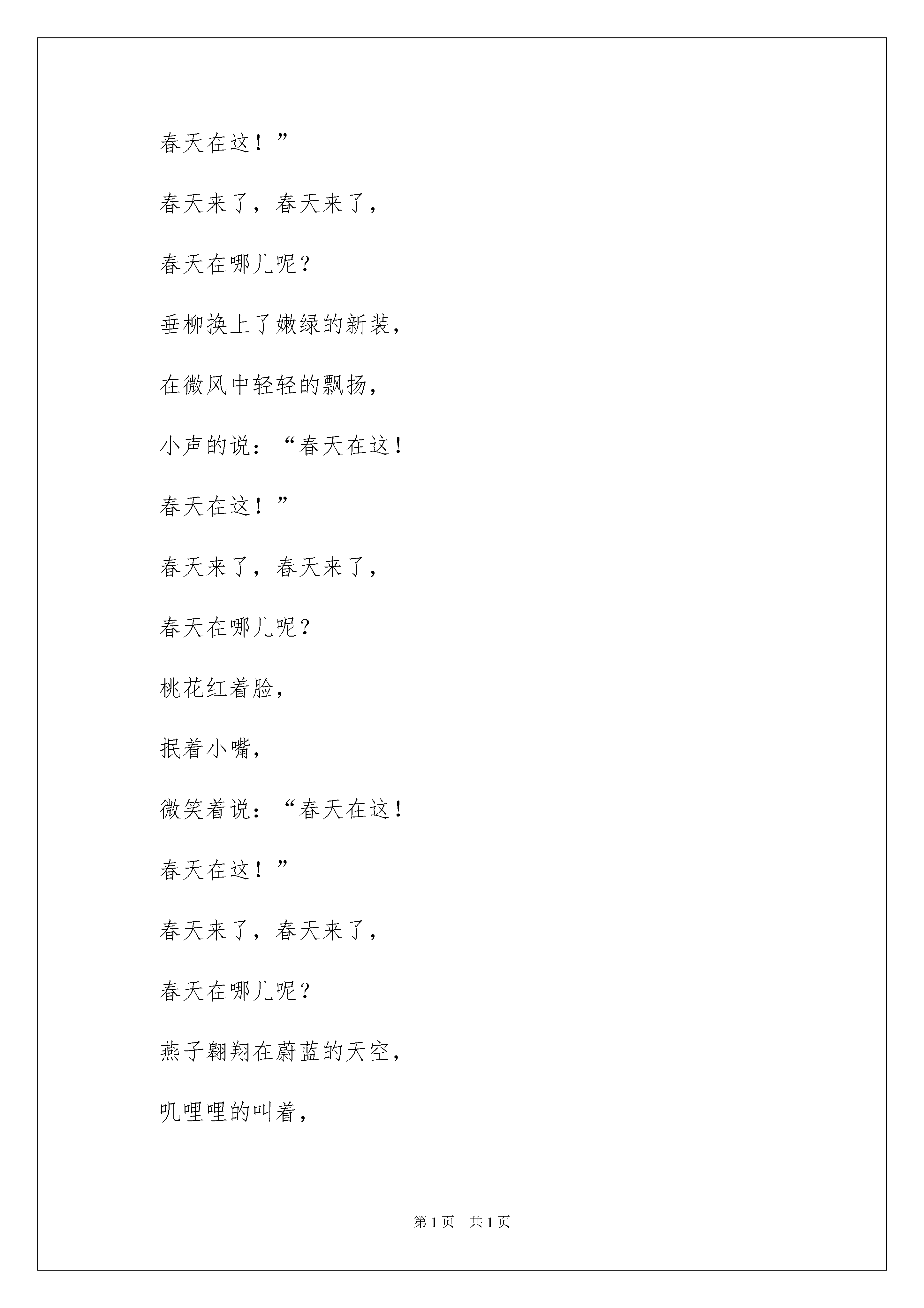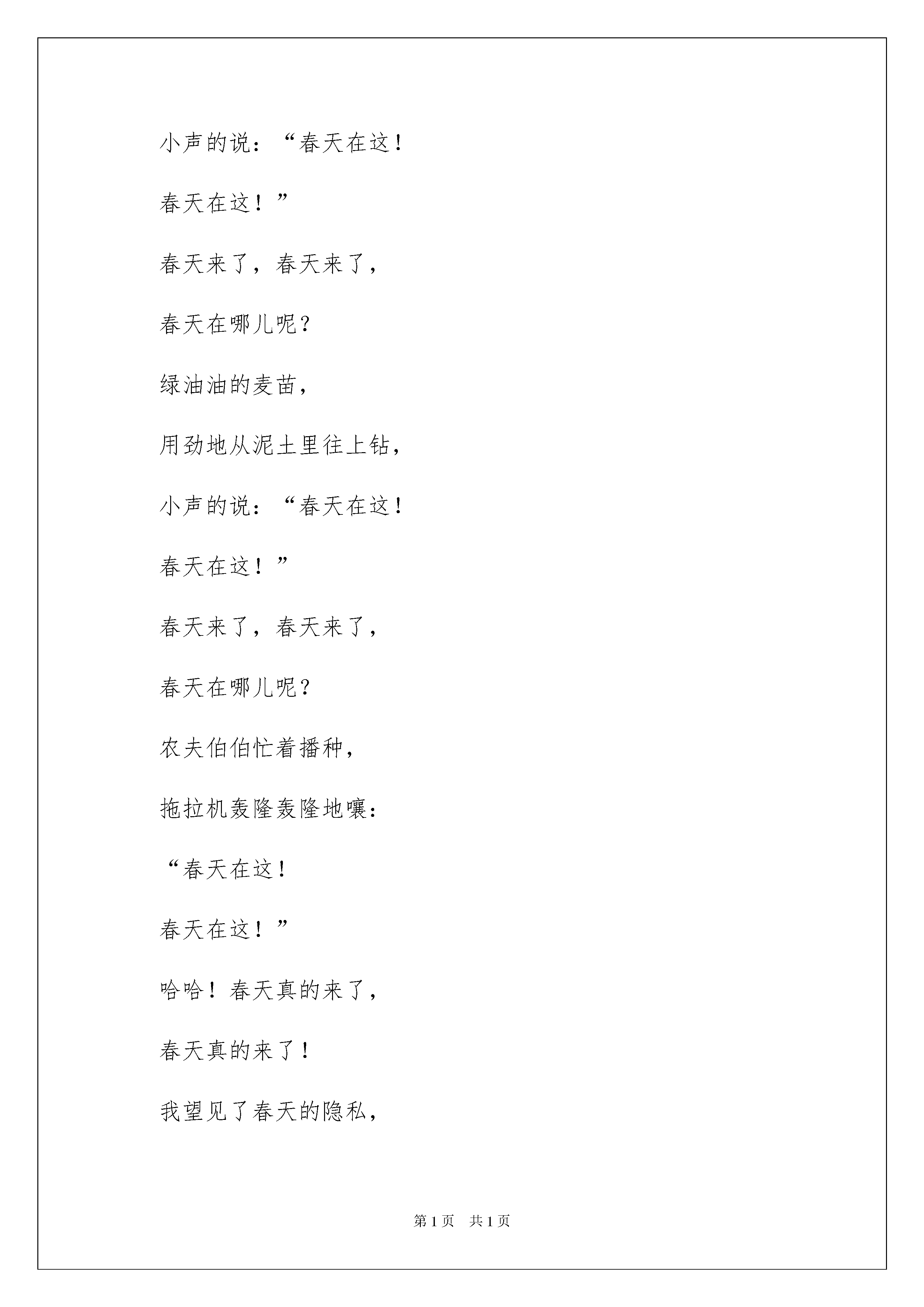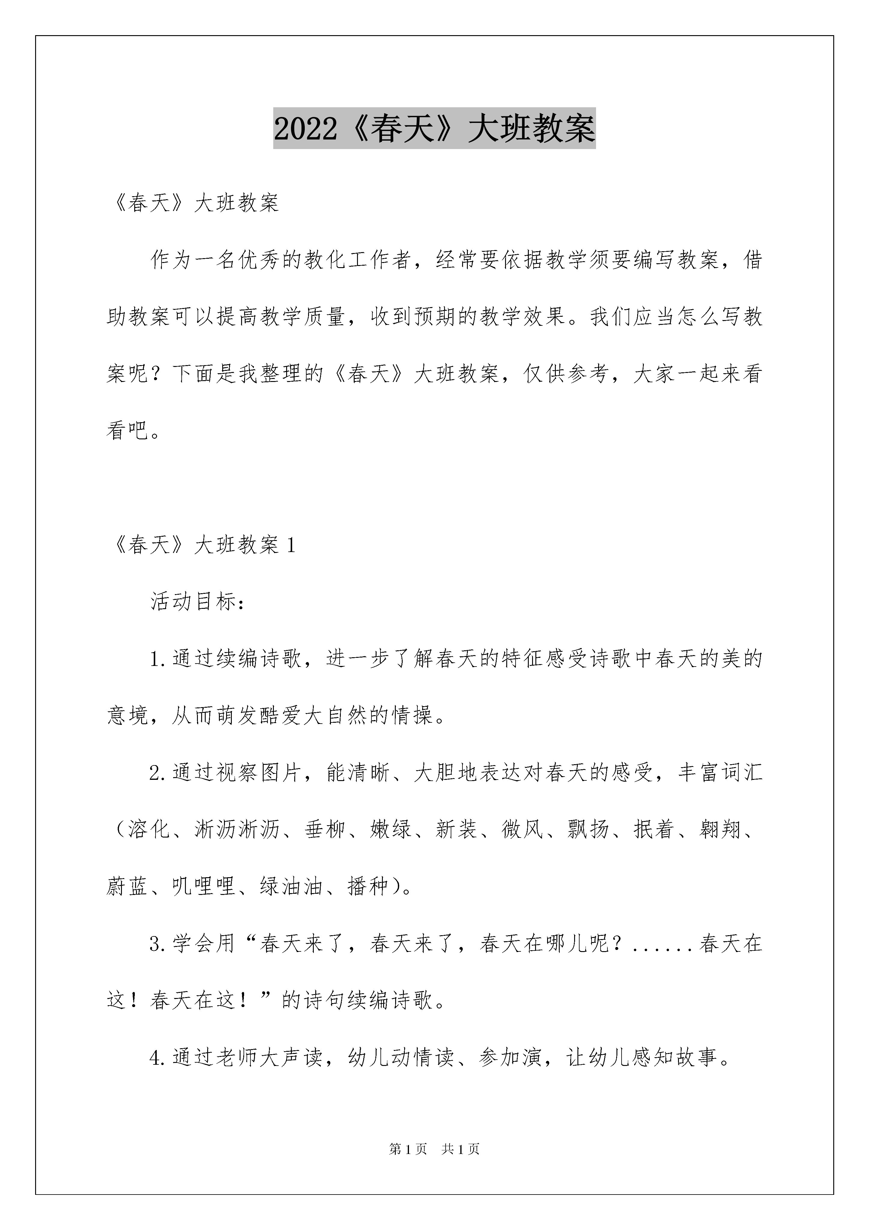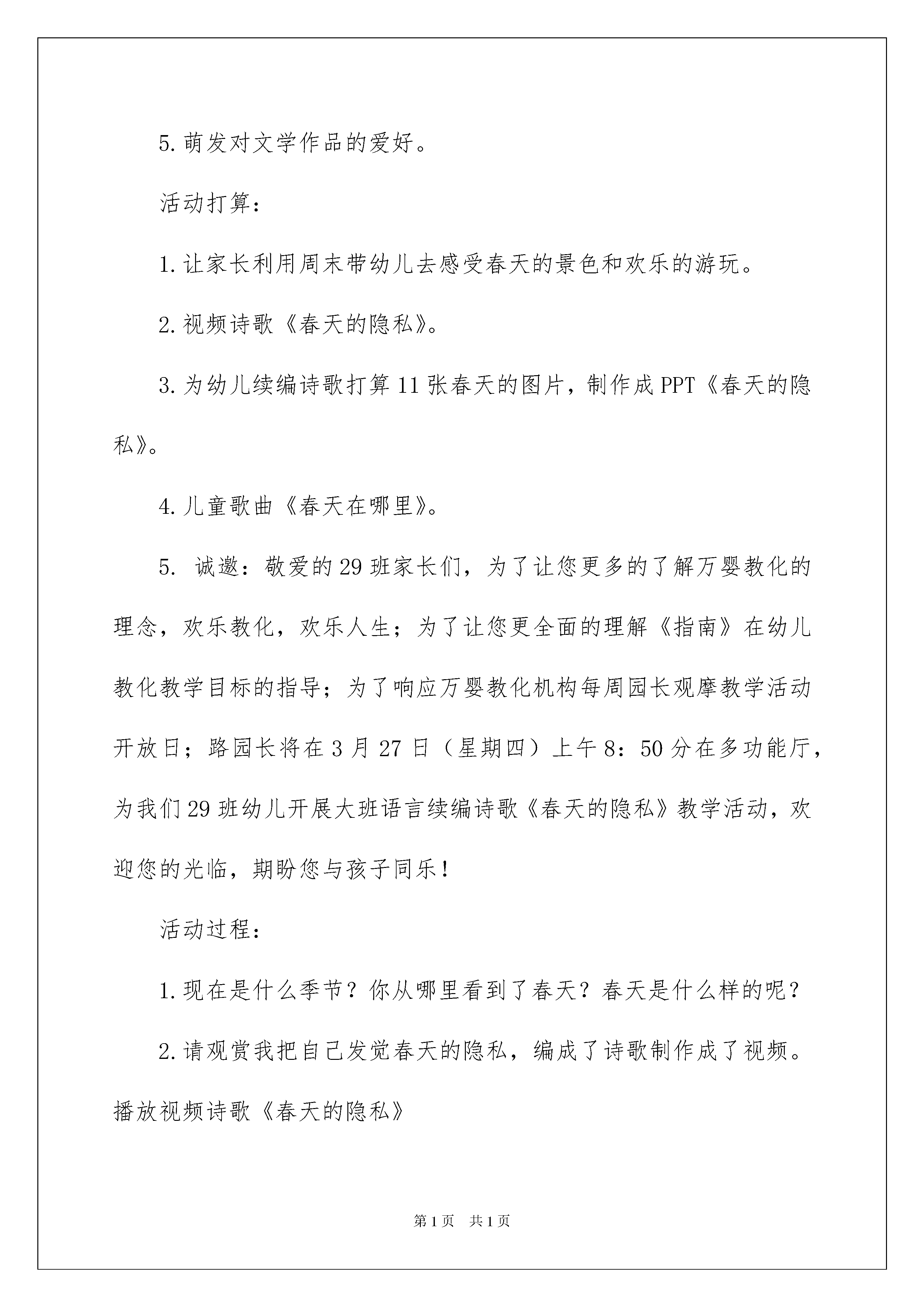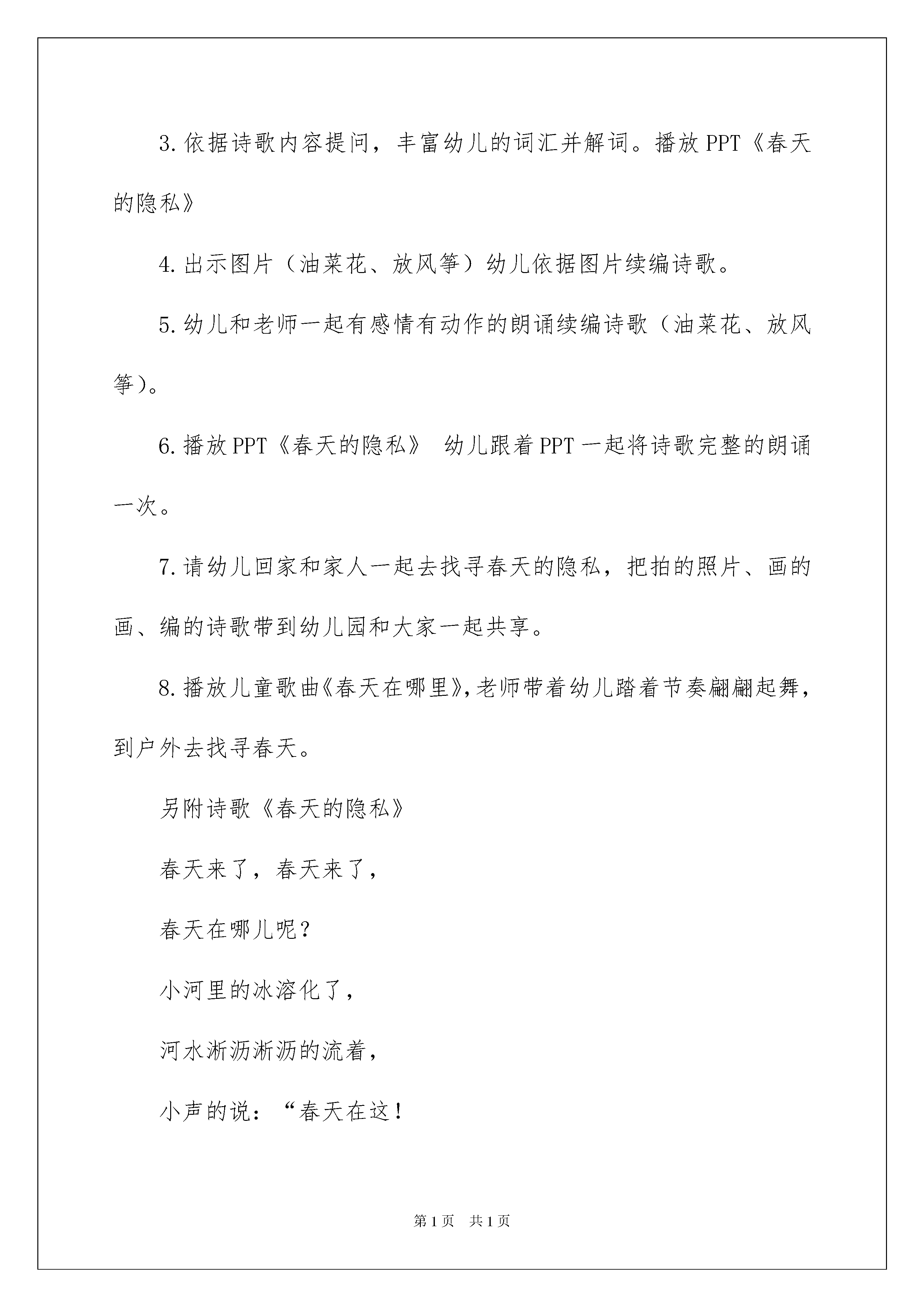 2022《春天》大班教案《春天》大班教案作为一名优秀的教化工作者,经常要依据教学须要编写教案,借助教案可以提高教学质量,收到预期的教学效果。我们应当怎么写教案呢?下面是我整理的《春天》大班教案,仅供参考,大家一起来看看吧。《春天》大班教案1活动目标:1.通过续编诗歌,进一步了解春天的特征感受诗歌中春天的美的意境,从而萌发酷爱大自然的情操。2.通过视察图片,能清晰、大胆地表达对春天的感受,丰富词汇(溶化、淅沥淅沥、垂柳、嫩绿、新装、微风、飘扬、抿着、翱翔、蔚蓝、叽哩哩、绿油油、播种)。3.学会用“春天来了,春天来了,春天在哪儿呢?......春天在这!春天在这!”的诗句续编诗歌。4.通过老师大声读,幼儿动情读、参加演,让幼儿感知故事。5.萌发对文学作品的爱好。活动打算:1.让家长利用周末带幼儿去感受春天的景色和欢乐的游玩。2.视频诗歌《春天的隐私》。3.为幼儿续编诗歌打算11张春天的图片,制作成PPT《春天的隐私》。4.儿童歌曲《春天在哪里》。5.诚邀:敬爱的29班家长们,为了让您更多的了解万婴教化的理念,欢乐教化,欢乐人生;为了让您更全面的理解《指南》在幼儿教化教学目标的指导;为了响应万婴教化机构每周园长观摩教学活动开放日;路园长将在3月27日(星期四)上午8:50分在多功能厅,为我们29班幼儿开展大班语言续编诗歌《春天的隐私》教学活动,欢迎您的光临,期盼您与孩子同乐!活动过程:1.现在是什么季节?你从哪里看到了春天?春天是什么样的呢?2.请观赏我把自己发觉春天的隐私,编成了诗歌制作成了视频。播放视频诗歌《春天的隐私》3.依据诗歌内容提问,丰富幼儿的词汇并解词。播放PPT《春天的隐私》4.出示图片(油菜花、放风筝)幼儿依据图片续编诗歌。5.幼儿和老师一起有感情有动作的朗诵续编诗歌(油菜花、放风筝)。6.播放PPT《春天的隐私》幼儿跟着PPT一起将诗歌完整的朗诵一次。7.请幼儿回家和家人一起去找寻春天的隐私,把拍的照片、画的画、编的诗歌带到幼儿园和大家一起共享。8.播放儿童歌曲《春天在哪里》,老师带着幼儿踏着节奏翩翩起舞,到户外去找寻春天。另附诗歌《春天的隐私》春天来了,春天来了,春天在哪儿呢?小河里的冰溶化了,河水淅沥淅沥的流着,小声的说:“春天在这!春天在这!”春天来了,春天来了,春天在哪儿呢?垂柳换上了嫩绿的新装,在微风中轻轻的飘扬,小声的说:“春天在这!春天在这!”春天来了,春天来了,春天在哪儿呢?桃花红着脸,抿着小嘴,微笑着说:“春天在这!春天在这!”春天来了,春天来了,春天在哪儿呢?燕子翱翔在蔚蓝的天空,叽哩哩的叫着,小声的说:“春天在这!春天在这!”春天来了,春天来了,春天在哪儿呢?绿油油的麦苗,用劲地从泥土里往上钻,小声的说:“春天在这!春天在这!”春天来了,春天来了,春天在哪儿呢?农夫伯伯忙着播种,拖拉机轰隆轰隆地嚷:“春天在这!春天在这!”哈哈!春天真的来了,春天真的来了!我望见了春天的隐私,我要把它牢牢记在心里。教学反思:春天来了,万物都有了性的改变,河里的冰溶化了,柳树的叶子绿了,桃花儿红了,春天还是一个播种的季节,农夫伯伯起先播种了。这些都吸引了幼儿的目光。结合当前春天的季节,我开展了本节活动《春天的隐私》。活动目标要求幼儿感受春天的漂亮,激发幼儿酷爱春天的情感。能了解诗歌的内容,从而运用自己的已有阅历来续编诗歌,学习用连贯的语言大胆讲解并描述自己发觉的春天的隐私。活动前的打算工作做得很充分,老师有目的、有意识地拍了很多相关的照片,并在网上下载了大量的图片绘制图片供幼儿在教学过程中观赏,帮助他们理解诗歌的内容。老师将诗歌内容的图片一课件的形式一张一张呈现给幼儿观赏,让幼儿更快的理解了诗歌的内容,还为续编诗歌的环节做了铺垫。通过老师的充分打算,幼儿对春天的景象特别感爱好,所以能大胆地对自己知道学问进行描述。整个活动过程中,孩子们的爱好特别高,主动参加活动的主动性也很高。只是活动的时间把控不够好,但幼儿在最终的续编环节,表现得特别投入,师生间的互动效果特别好。《春天》大班教案2活动目标:1、增加幼儿对春天的相识。2、培育幼儿的语言表达实力和动手操作实力。活动打算:课件、燕子、迎春花、青蛙头饰;青蛙的全家福;图片、展板、活动过程:1、听音乐《郊游》进入活动室。2、途中奇遇小燕子、小青蛙,谈话:(1)小燕子,冬天怎么没望见你呀?(2)你手里的迎春花先长叶还是先开花?(3)青蛙妈妈,你知道藏在洞里的动物还有谁吗?3、视察青蛙妈妈的全家福,说出青蛙的生长过程。4、老师诗画春天(柳树、小草、小花、大山、河水)(1)小草中有什么?(2)春天还有什么花?(看课件,说