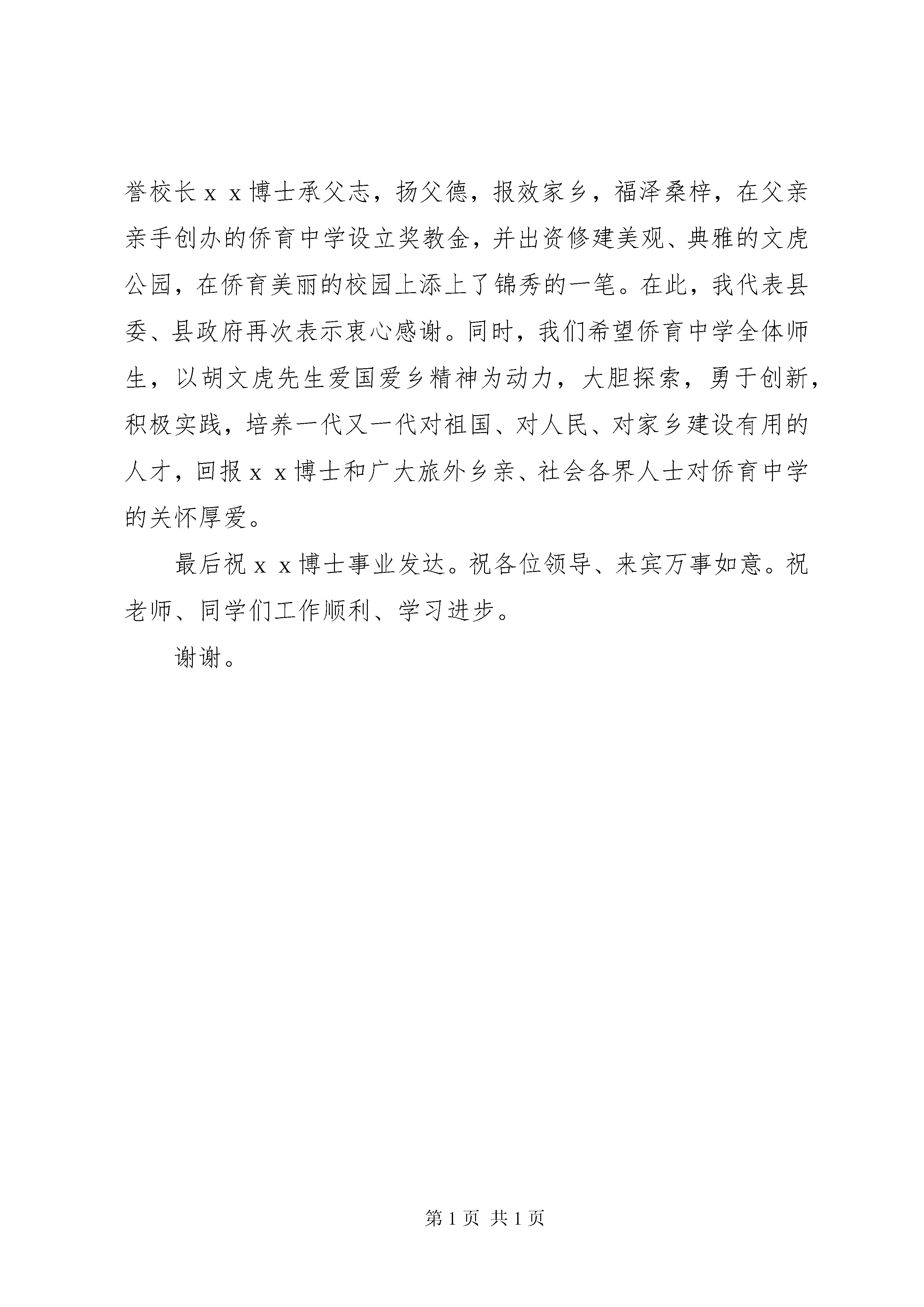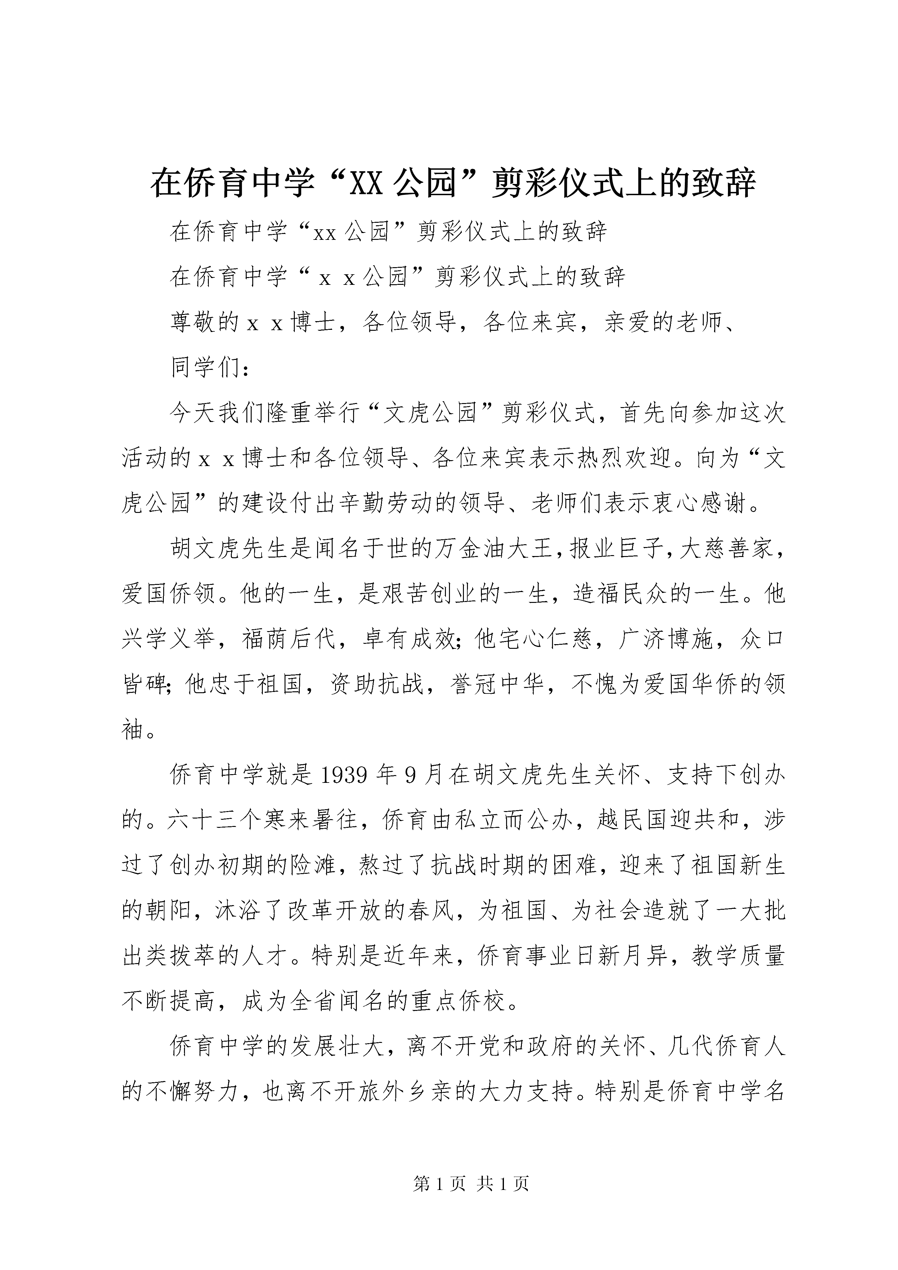 在侨育中学“XX公园”剪彩仪式上的致辞在侨育中学“xx公园”剪彩仪式上的致辞在侨育中学“xx公园”剪彩仪式上的致辞尊敬的xx博士,各位领导,各位来宾,亲爱的老师、同学们:今天我们隆重举行“文虎公园”剪彩仪式,首先向参加这次活动的xx博士和各位领导、各位来宾表示热烈欢迎。向为“文虎公园”的建设付出辛勤劳动的领导、老师们表示衷心感谢。胡文虎先生是闻名于世的万金油大王,报业巨子,大慈善家,爱国侨领。他的一生,是艰苦创业的一生,造福民众的一生。他兴学义举,福荫后代,卓有成效;他宅心仁慈,广济博施,众口皆碑;他忠于祖国,资助抗战,誉冠中华,不愧为爱国华侨的领袖。侨育中学就是1939年9月在胡文虎先生关怀、支持下创办的。六十三个寒来暑往,侨育由私立而公办,越民国迎共和,涉过了创办初期的险滩,熬过了抗战时期的困难,迎来了祖国新生的朝阳,沐浴了改革开放的春风,为祖国、为社会造就了一大批出类拨萃的人才。特别是近年来,侨育事业日新月异,教学质量不断提高,成为全省闻名的重点侨校。侨育中学的发展壮大,离不开党和政府的关怀、几代侨育人的不懈努力,也离不开旅外乡亲的大力支持。特别是侨育中学名誉校长xx博士承父志,扬父德,报效家乡,福泽桑梓,在父亲亲手创办的侨育中学设立奖教金,并出资修建美观、典雅的文虎公园,在侨育美丽的校园上添上了锦秀的一笔。在此,我代表县委、县政府再次表示衷心感谢。同时,我们希望侨育中学全体师生,以胡文虎先生爱国爱乡精神为动力,大胆探索,勇于创新,积极实践,培养一代又一代对祖国、对人民、对家乡建设有用的人才,回报xx博士和广大旅外乡亲、社会各界人士对侨育中学的关怀厚爱。最后祝xx博士事业发达。祝各位领导、来宾万事如意。祝老师、同学们工作顺利、学习进步。谢谢。