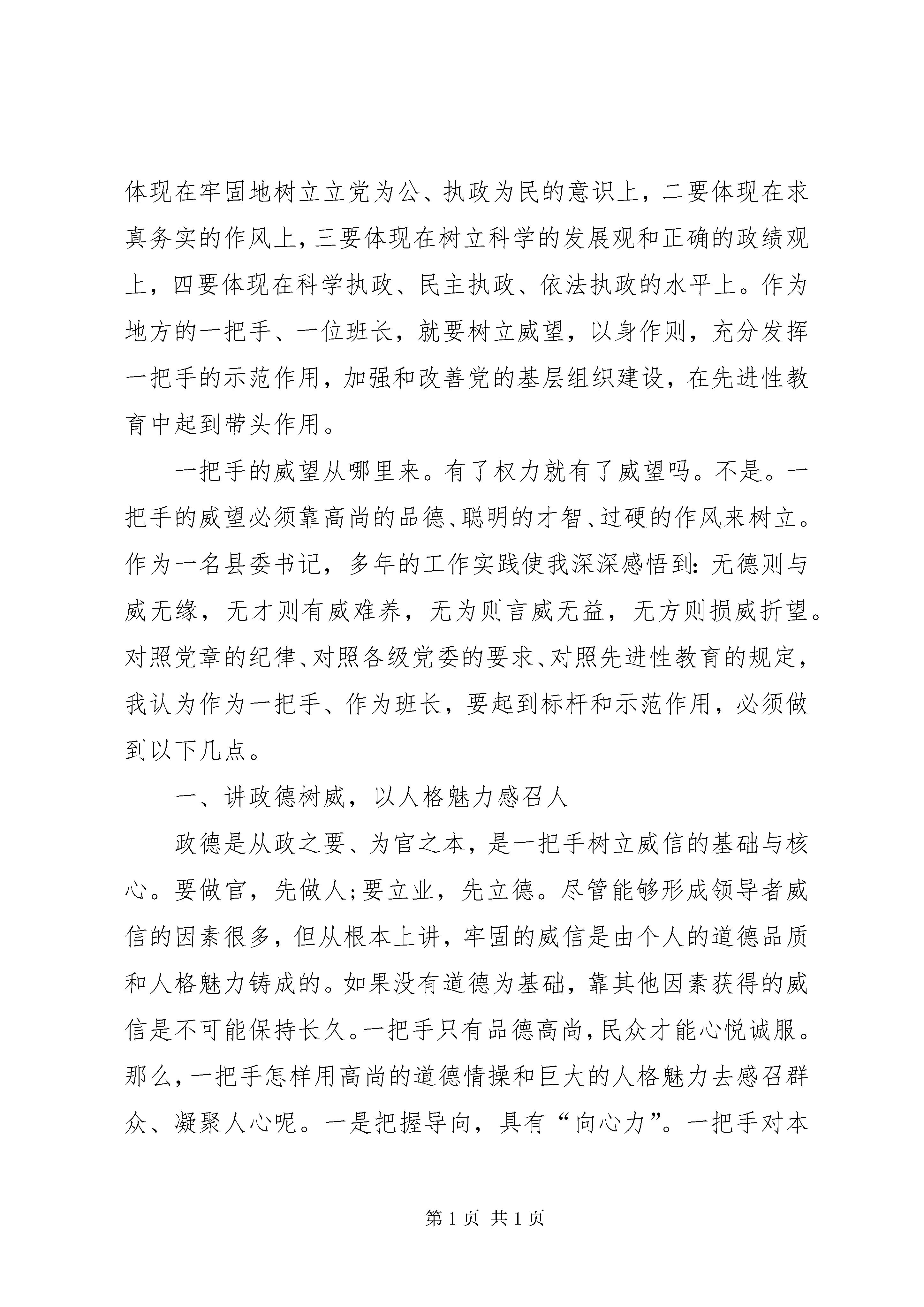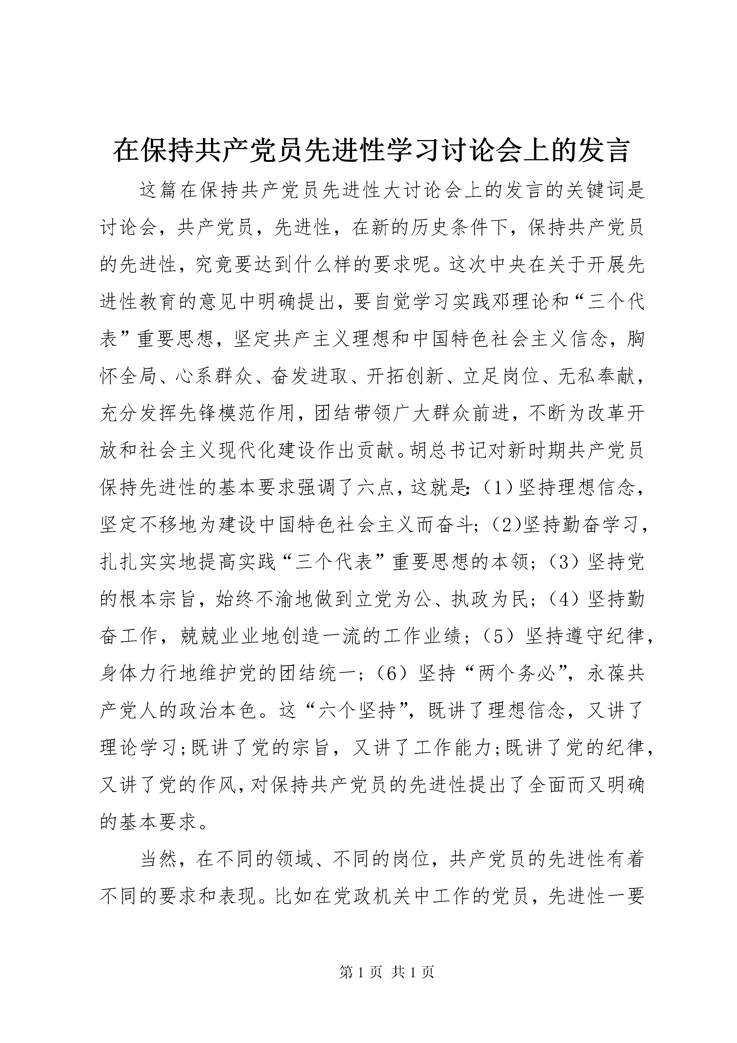 在保持共产党员先进性学习讨论会上的发言这篇在保持共产党员先进性大讨论会上的发言的关键词是讨论会,共产党员,先进性,在新的历史条件下,保持共产党员的先进性,究竟要达到什么样的要求呢。这次中央在关于开展先进性教育的意见中明确提出,要自觉学习实践邓理论和“三个代表”重要思想,坚定共产主义理想和中国特色社会主义信念,胸怀全局、心系群众、奋发进取、开拓创新、立足岗位、无私奉献,充分发挥先锋模范作用,团结带领广大群众前进,不断为改革开放和社会主义现代化建设作出贡献。胡总书记对新时期共产党员保持先进性的基本要求强调了六点,这就是:(1)坚持理想信念,坚定不移地为建设中国特色社会主义而奋斗;(2)坚持勤奋学习,扎扎实实地提高实践“三个代表”重要思想的本领;(3)坚持党的根本宗旨,始终不渝地做到立党为公、执政为民;(4)坚持勤奋工作,兢兢业业地创造一流的工作业绩;(5)坚持遵守纪律,身体力行地维护党的团结统一;(6)坚持“两个务必”,永葆共产党人的政治本色。这“六个坚持”,既讲了理想信念,又讲了理论学习;既讲了党的宗旨,又讲了工作能力;既讲了党的纪律,又讲了党的作风,对保持共产党员的先进性提出了全面而又明确的基本要求。当然,在不同的领域、不同的岗位,共产党员的先进性有着不同的要求和表现。比如在党政机关中工作的党员,先进性一要体现在牢固地树立立党为公、执政为民的意识上,二要体现在求真务实的作风上,三要体现在树立科学的发展观和正确的政绩观上,四要体现在科学执政、民主执政、依法执政的水平上。作为地方的一把手、一位班长,就要树立威望,以身作则,充分发挥一把手的示范作用,加强和改善党的基层组织建设,在先进性教育中起到带头作用。一把手的威望从哪里来。有了权力就有了威望吗。不是。一把手的威望必须靠高尚的品德、聪明的才智、过硬的作风来树立。作为一名县委书记,多年的工作实践使我深深感悟到:无德则与威无缘,无才则有威难养,无为则言威无益,无方则损威折望。对照党章的纪律、对照各级党委的要求、对照先进性教育的规定,我认为作为一把手、作为班长,要起到标杆和示范作用,必须做到以下几点。一、讲政德树威,以人格魅力感召人政德是从政之要、为官之本,是一把手树立威信的基础与核心。要做官,先做人;要立业,先立德。尽管能够形成领导者威信的因素很多,但从根本上讲,牢固的威信是由个人的道德品质和人格魅力铸成的。如果没有道德为基础,靠其他因素获得的威信是不可能保持长久。一把手只有品德高尚,民众才能心悦诚服。那么,一把手怎样用高尚的道德情操和巨大的人格魅力去感召群众、凝聚人心呢。一是把握导向,具有“向心力”。一把手对本地区、本部门负有全面责任,首要的是负有政治责任,团结和带领广大干部群众坚定不移地贯彻党的路线、方针、政策,是一把手必须具备的政治品德,一名称职的一把手要在政治原则问题上当好“主心骨”,始终站在党和人民的立场上,从人民的根本利益和长远利益出发,明辨是非、认准方向,不随波逐流、左右摇摆,不跟着感觉走”。尤其是在政治风浪考验中,要处变不惊、把握导向,以良好的政治品德,把干部群众引导到贯彻党的路线、方针、政策的实践中来。