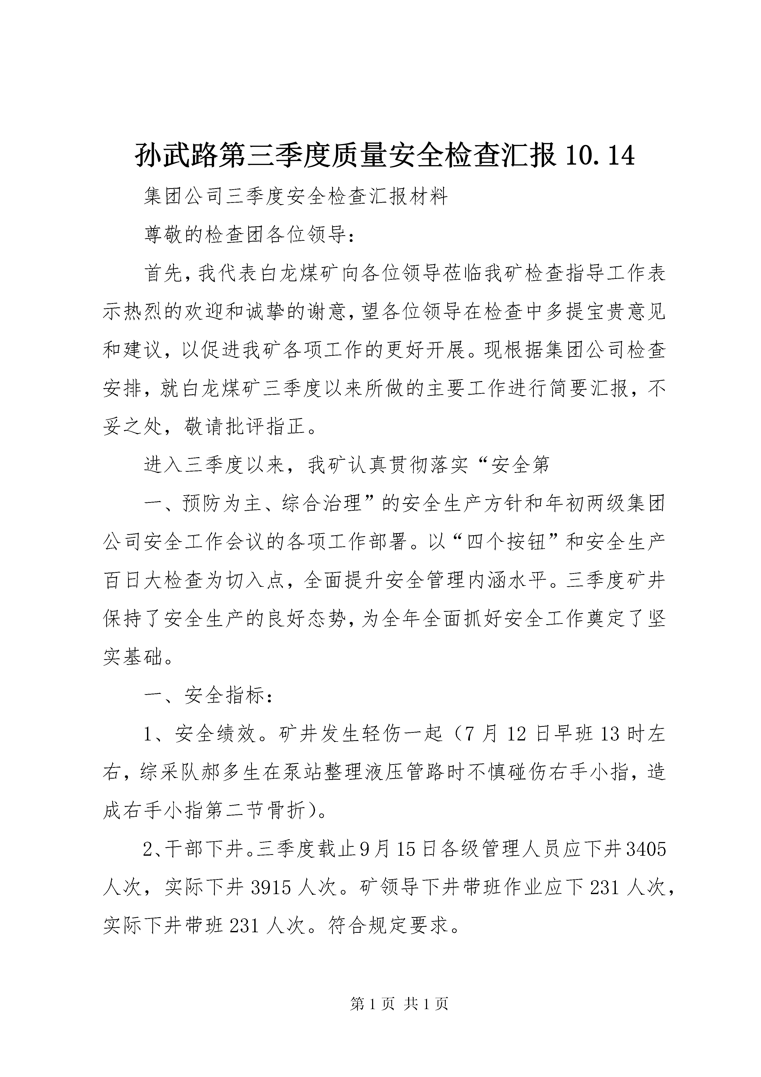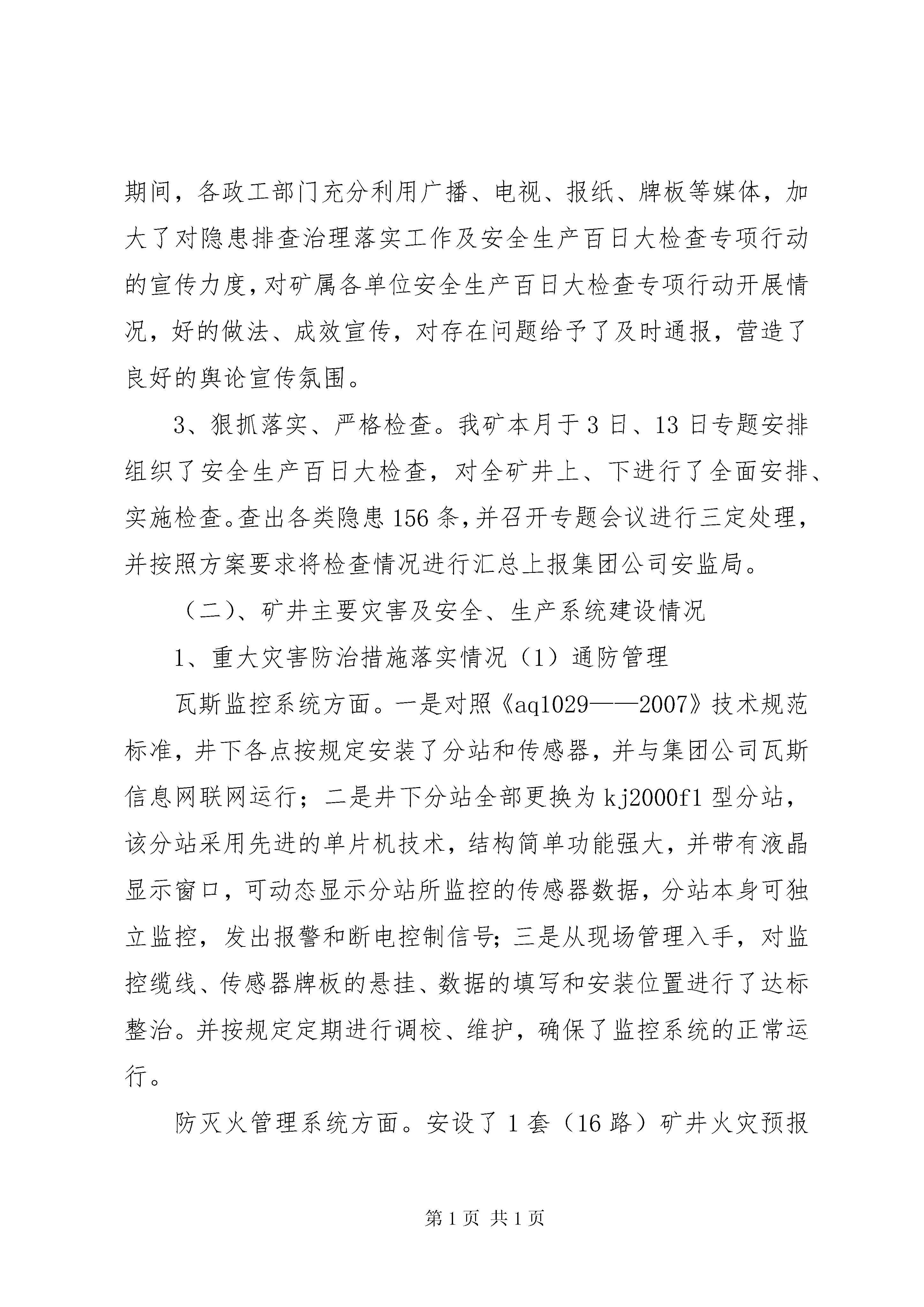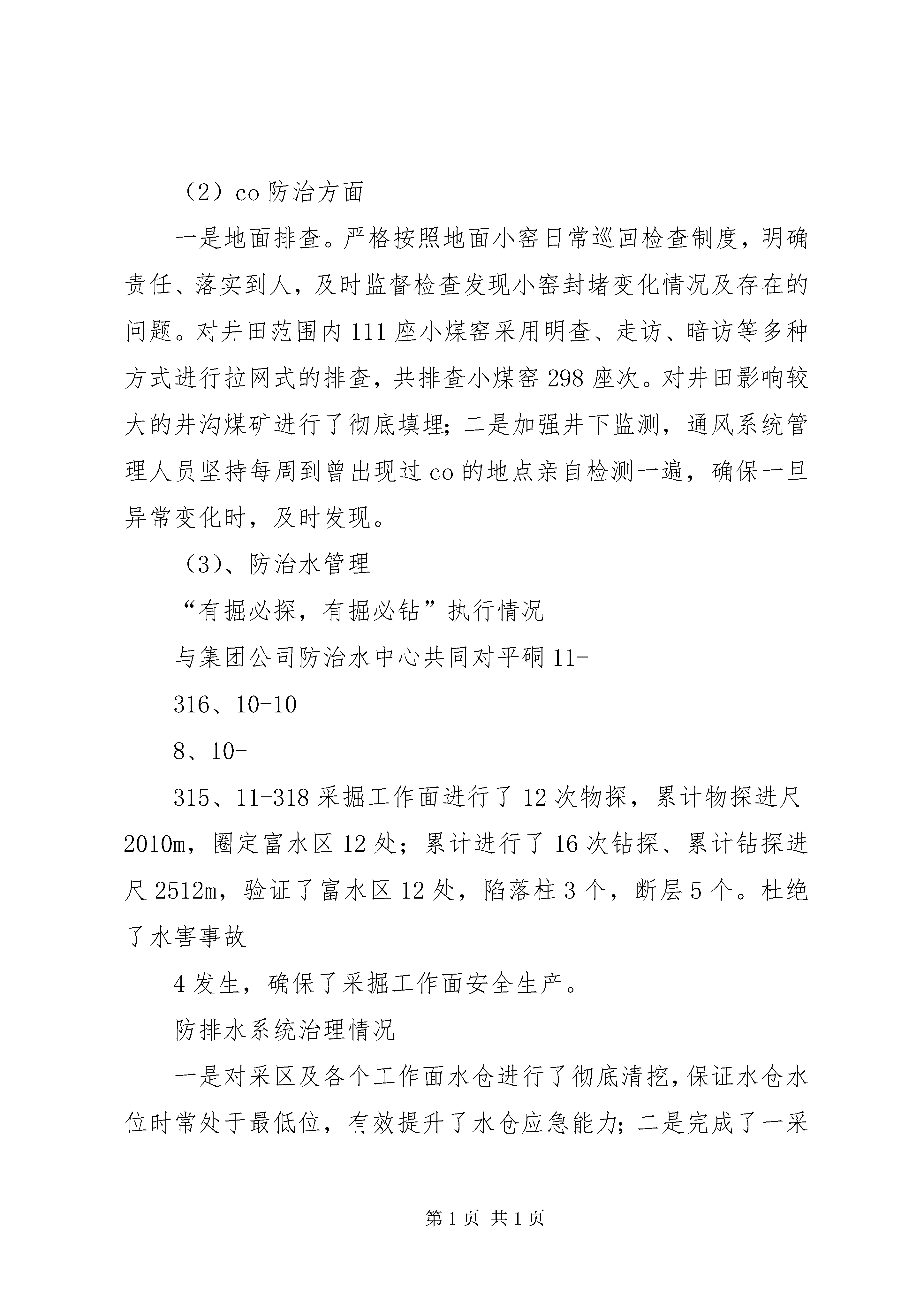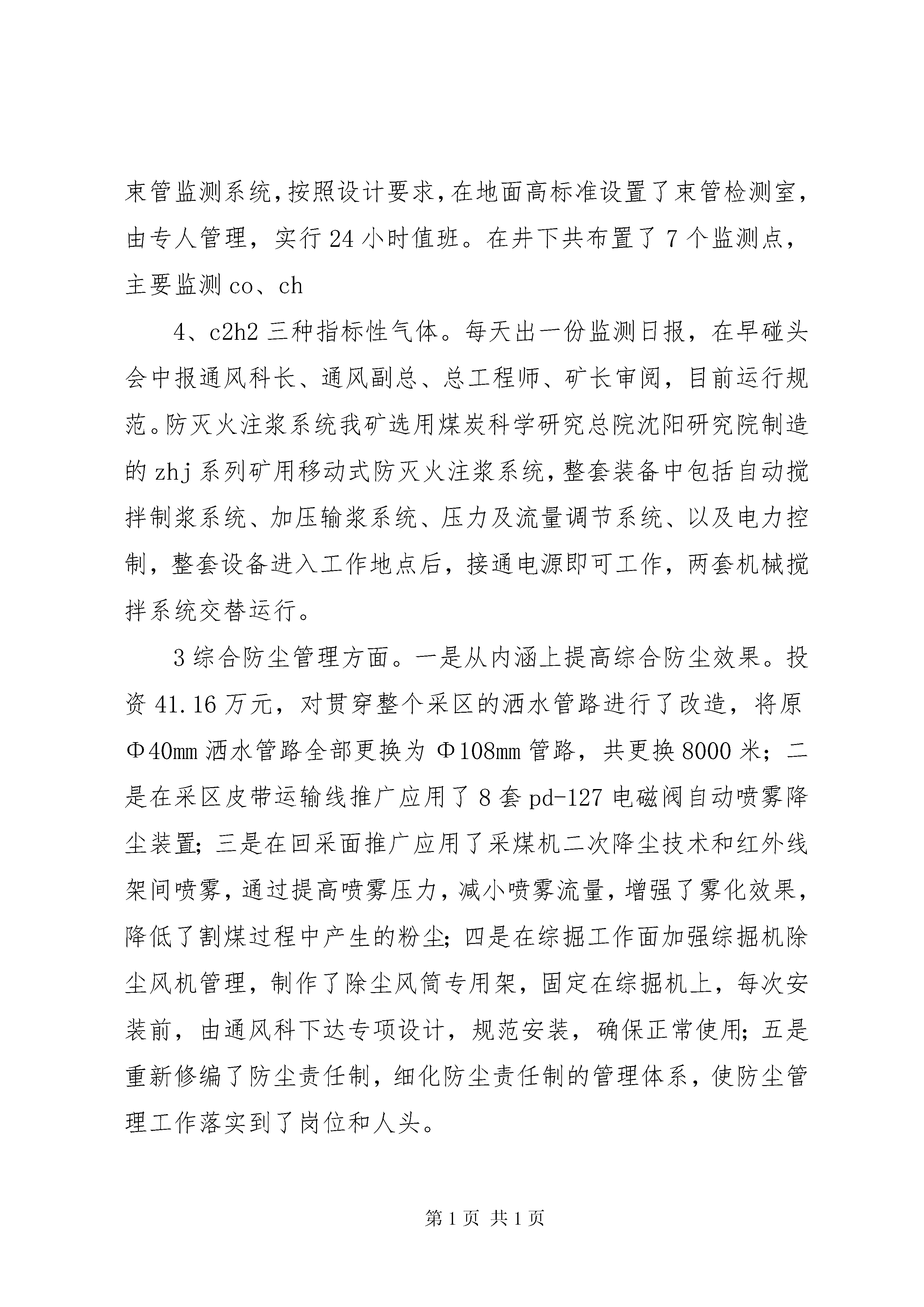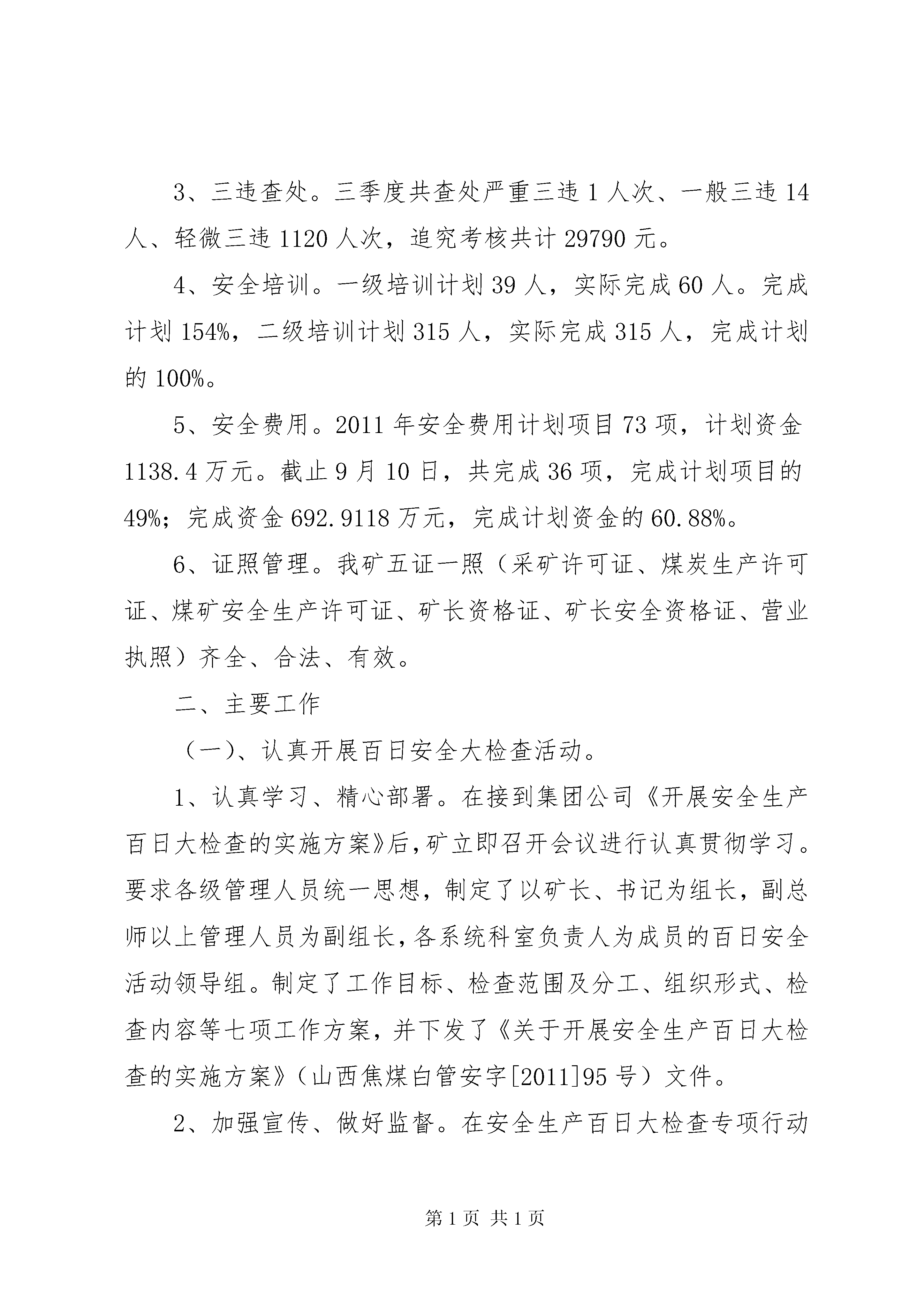 孙武路第三季度质量安全检查汇报10.14集团公司三季度安全检查汇报材料尊敬的检查团各位领导:首先,我代表白龙煤矿向各位领导莅临我矿检查指导工作表示热烈的欢迎和诚挚的谢意,望各位领导在检查中多提宝贵意见和建议,以促进我矿各项工作的更好开展。现根据集团公司检查安排,就白龙煤矿三季度以来所做的主要工作进行简要汇报,不妥之处,敬请批评指正。进入三季度以来,我矿认真贯彻落实“安全第一、预防为主、综合治理”的安全生产方针和年初两级集团公司安全工作会议的各项工作部署。以“四个按钮”和安全生产百日大检查为切入点,全面提升安全管理内涵水平。三季度矿井保持了安全生产的良好态势,为全年全面抓好安全工作奠定了坚实基础。一、安全指标:1、安全绩效。矿井发生轻伤一起(7月12日早班13时左右,综采队郝多生在泵站整理液压管路时不慎碰伤右手小指,造成右手小指第二节骨折)。2、干部下井。三季度载止9月15日各级管理人员应下井3405人次,实际下井3915人次。矿领导下井带班作业应下231人次,实际下井带班231人次。符合规定要求。3、三违查处。三季度共查处严重三违1人次、一般三违14人、轻微三违1120人次,追究考核共计29790元。4、安全培训。一级培训计划39人,实际完成60人。完成计划154%,二级培训计划315人,实际完成315人,完成计划的100%。5、安全费用。2011年安全费用计划项目73项,计划资金1138.4万元。截止9月10日,共完成36项,完成计划项目的49%;完成资金692.9118万元,完成计划资金的60.88%。6、证照管理。我矿五证一照(采矿许可证、煤炭生产许可证、煤矿安全生产许可证、矿长资格证、矿长安全资格证、营业执照)齐全、合法、有效。二、主要工作(一)、认真开展百日安全大检查活动。1、认真学习、精心部署。在接到集团公司《开展安全生产百日大检查的实施方案》后,矿立即召开会议进行认真贯彻学习。要求各级管理人员统一思想,制定了以矿长、书记为组长,副总师以上管理人员为副组长,各系统科室负责人为成员的百日安全活动领导组。制定了工作目标、检查范围及分工、组织形式、检查内容等七项工作方案,并下发了《关于开展安全生产百日大检查的实施方案》(山西焦煤白管安字[2011]95号)文件。2、加强宣传、做好监督。在安全生产百日大检查专项行动期间,各政工部门充分利用广播、电视、报纸、牌板等媒体,加大了对隐患排查治理落实工作及安全生产百日大检查专项行动的宣传力度,对矿属各单位安全生产百日大检查专项行动开展情况,好的做法、成效宣传,对存在问题给予了及时通报,营造了良好的舆论宣传氛围。3、狠抓落实、严格检查。我矿本月于3日、13日专题安排组织了安全生产百日大检查,对全矿井上、下进行了全面安排、实施检查。查出各类隐患156条,并召开专题会议进行三定处理,并按照方案要求将检查情况进行汇总上报集团公司安监局。(二)、矿井主要灾害及安全、生产系统建设情况1、重大灾害防治措施落实情况(1)通防管理瓦斯监控系统方面。一是对照《aq1029——2007》技术规范标准,井下各点按规定安装了分站和传感器,并与集团公司瓦斯信息网联网运行;二是井下分站全部更换为kj2000f1型分站,该分站采用先进的单片机技术,结构简单功能强大,并带有液晶显示窗口,可动态显示分站所监控的传感器数据,分站本身可独立监控,发出报警和断电控制信号;三是从现场管理入手,对监控缆线、传感器牌板的悬挂、数据的填写和安装位置进行了达标整治。并按规定定期进行调校、维护,确保了监控系统的正常运行。防灭火管理系统方面。安设了1套(16路)矿井火灾预报束管监测系统,按照设计要求,在地面高标准设置了束管检测室,由专人管理,实行24小时值班。在井下共布置了7个监测点,主要监测co、ch4、c2h2三种指标性气体。每天出一份监测日报,在早碰头会中报通风科长、通风副总、总工程师、矿长审阅,目前运行规范。防灭火注浆系统我矿选用煤炭科学研究总院沈阳研究院制造的zhj系列矿用移动式防灭火注浆系统,整套装备中包括自动搅拌制浆系统、加压输浆系统、压力及流量调节系统、以及电力控制,整套设备进入工作地点后,接通电源即可工作,两套机械搅拌系统交替运行。3综合防尘管理方面。一是从内涵上提高综合防尘效果。投资41.16万元,对贯穿整个采区的洒水管路进行了改造,将原Φ40mm洒水管路全部更换为Φ108mm管路,共更换8000米;二是在采区皮带运输线推广应用了8套pd-127电磁阀自动喷雾降尘装置;三是在回采面推广应用了采煤机二次降尘技术和红外线架间喷雾,通过提高喷雾压力,减小喷雾流量,增强了雾化效果,降低了割煤过程中产生的粉尘;四是在综掘工作面加强综掘机除尘风机管理,制作了除尘风筒专用架,固定在综掘机上,每次安装前,由