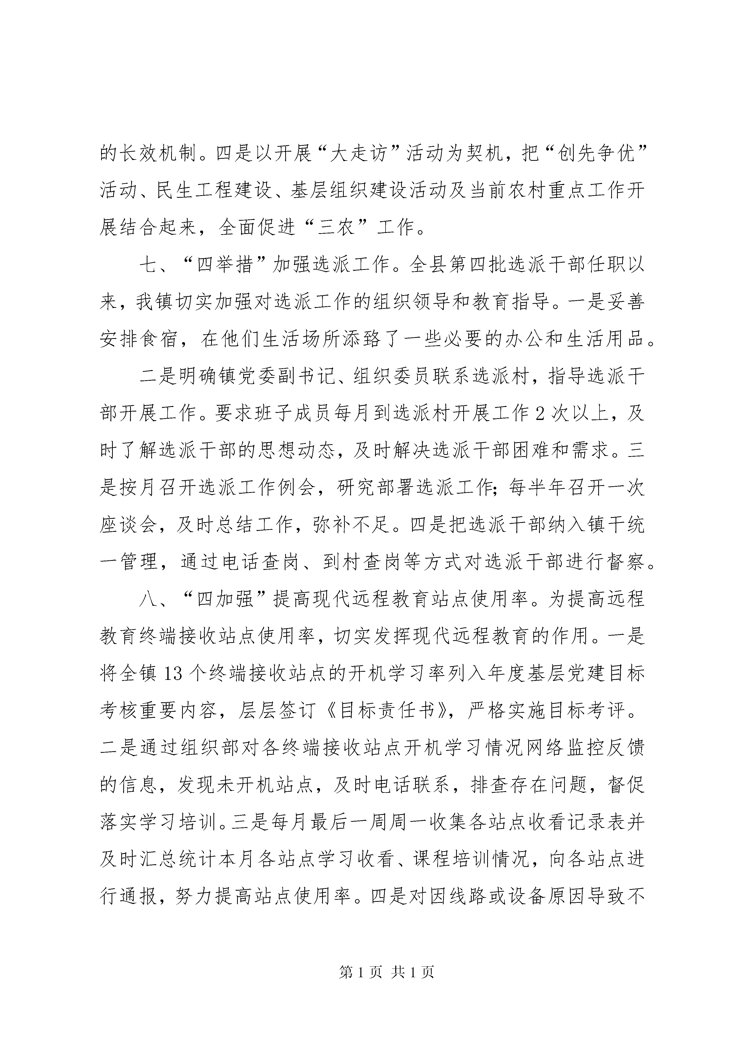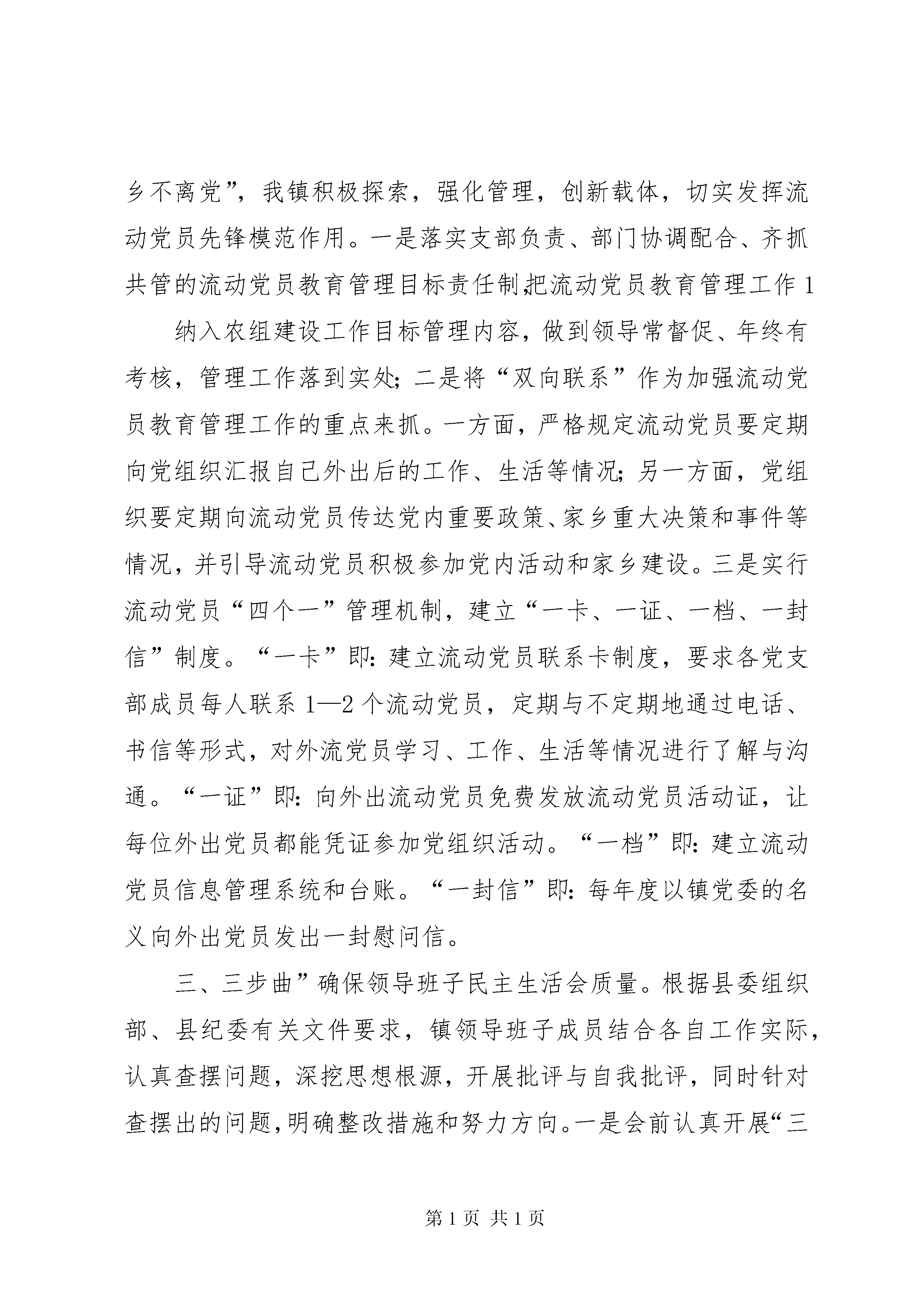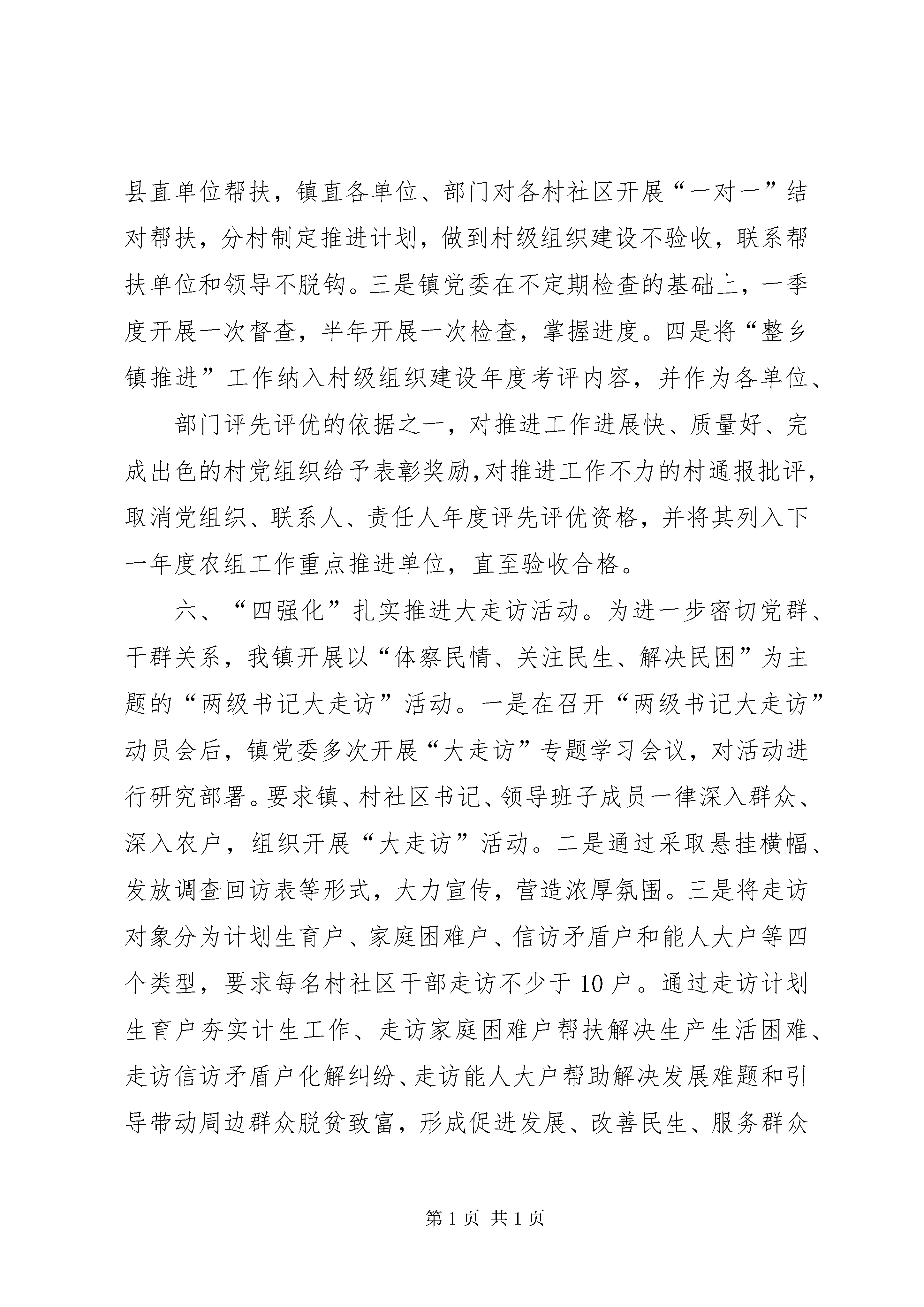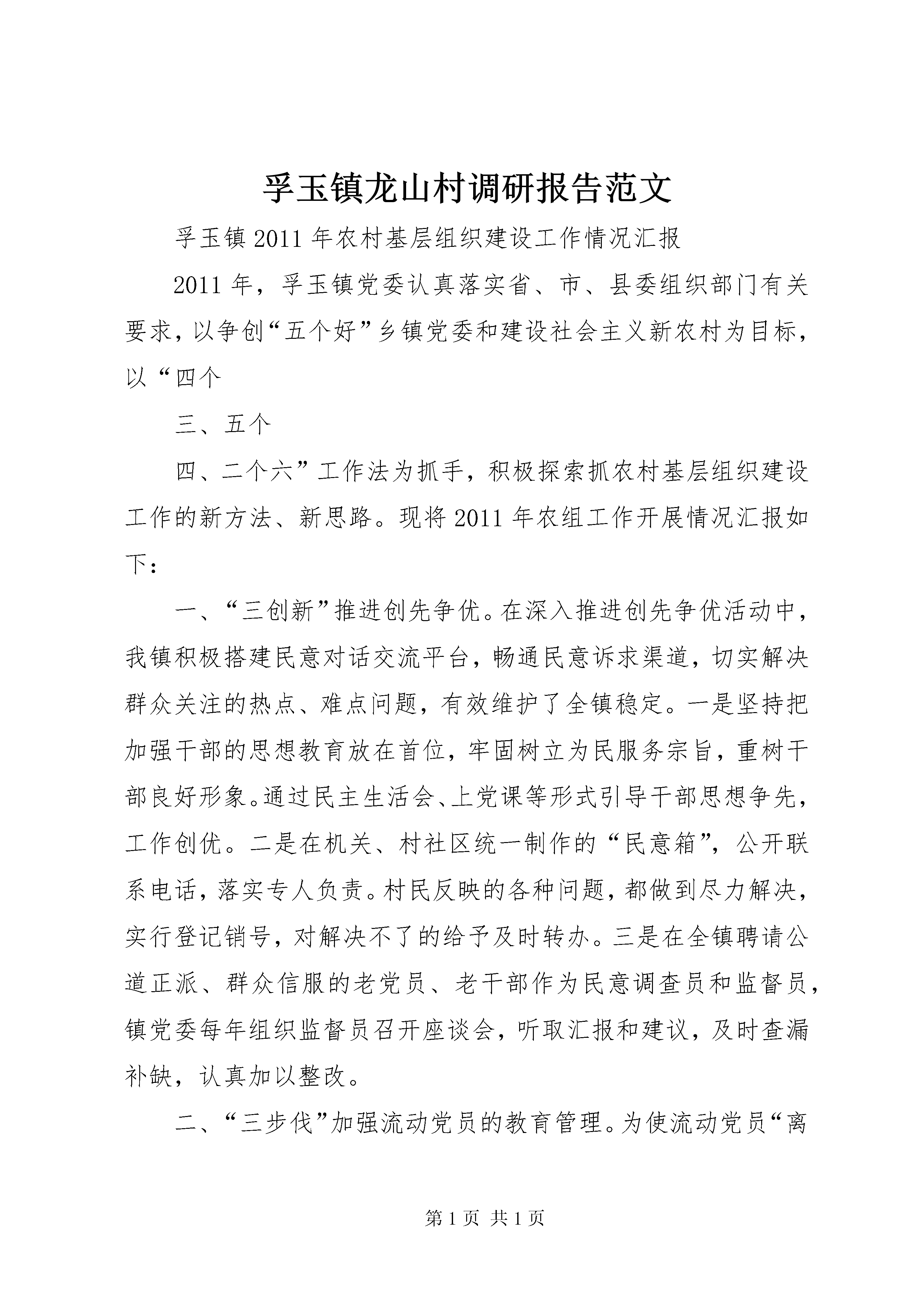 孚玉镇龙山村调研报告范文孚玉镇2011年农村基层组织建设工作情况汇报2011年,孚玉镇党委认真落实省、市、县委组织部门有关要求,以争创“五个好”乡镇党委和建设社会主义新农村为目标,以“四个三、五个四、二个六”工作法为抓手,积极探索抓农村基层组织建设工作的新方法、新思路。现将2011年农组工作开展情况汇报如下:一、“三创新”推进创先争优。在深入推进创先争优活动中,我镇积极搭建民意对话交流平台,畅通民意诉求渠道,切实解决群众关注的热点、难点问题,有效维护了全镇稳定。一是坚持把加强干部的思想教育放在首位,牢固树立为民服务宗旨,重树干部良好形象。通过民主生活会、上党课等形式引导干部思想争先,工作创优。二是在机关、村社区统一制作的“民意箱”,公开联系电话,落实专人负责。村民反映的各种问题,都做到尽力解决,实行登记销号,对解决不了的给予及时转办。三是在全镇聘请公道正派、群众信服的老党员、老干部作为民意调查员和监督员,镇党委每年组织监督员召开座谈会,听取汇报和建议,及时查漏补缺,认真加以整改。二、“三步伐”加强流动党员的教育管理。为使流动党员“离乡不离党”,我镇积极探索,强化管理,创新载体,切实发挥流动党员先锋模范作用。一是落实支部负责、部门协调配合、齐抓共管的流动党员教育管理目标责任制,把流动党员教育管理工作1纳入农组建设工作目标管理内容,做到领导常督促、年终有考核,管理工作落到实处;二是将“双向联系”作为加强流动党员教育管理工作的重点来抓。一方面,严格规定流动党员要定期向党组织汇报自己外出后的工作、生活等情况;另一方面,党组织要定期向流动党员传达党内重要政策、家乡重大决策和事件等情况,并引导流动党员积极参加党内活动和家乡建设。三是实行流动党员“四个一”管理机制,建立“一卡、一证、一档、一封信”制度。“一卡”即:建立流动党员联系卡制度,要求各党支部成员每人联系1—2个流动党员,定期与不定期地通过电话、书信等形式,对外流党员学习、工作、生活等情况进行了解与沟通。“一证”即:向外出流动党员免费发放流动党员活动证,让每位外出党员都能凭证参加党组织活动。“一档”即:建立流动党员信息管理系统和台账。“一封信”即:每年度以镇党委的名义向外出党员发出一封慰问信。三、三步曲”确保领导班子民主生活会质量。根据县委组织部、县纪委有关文件要求,镇领导班子成员结合各自工作实际,认真查摆问题,深挖思想根源,开展批评与自我批评,同时针对查摆出的问题,明确整改措施和努力方向。一是会前认真开展“三个一”活动,即一次剖析自己找、一次座谈群众提、一次谈心当面问。二是民主生活会上,大家都少讲成绩,多讲问题,少讲客观理由,多讲主观原因,都能站在大局的高度,直言不讳,坦诚相见。三是针对查找出来的突出问题,镇党委认真制定了整改措施,明确了整改重点和努力方向,落实了整改责任,同时在镇党务公开栏进行了公开,接受党员群众监督。四、“三着力”深入推进城乡基层党组织结对共建工作。在农村党员干部主题教育活动中,深入推进城乡基层党组织结对共建工作,促进了城乡党建的有机融合。一是结合“万名干部下基层”、“三级书记大走访”、组工干部“三走进三服务”等活动,共建单位间采取交心谈心、共过组织生活、开展联谊活动等方式,加强彼此间的沟通交流。二是共建单位结合村情民意,为村社区的发展理思路、找出路、定项目、增收入,帮助结对村社区制定完善新农村建设规划。三是共建单位紧紧围绕“加快农村发展、促进农民致富”目标,充分发挥项目、人才、信息、技术等优势,结合结对村社区实际,因地制宜创办带动力强、群众致富快的产业项目,努力实现“一村一品”。五、“四要求”实施“整乡镇推进”示范工程。为全面推进我镇农村基层组织建设工作迈上新台阶,镇党委积极开展“整乡镇推进”工作。一是把“整乡镇推进”工作纳入重要议事日程,建立领导班子成员联系包保制度,确保领导力量到位。二是结合县直单位帮扶,镇直各单位、部门对各村社区开展“一对一”结对帮扶,分村制定推进计划,做到村级组织建设不验收,联系帮扶单位和领导不脱钩。三是镇党委在不定期检查的基础上,一季度开展一次督查,半年开展一次检查,掌握进度。四是将“整乡镇推进”工作纳入村级组织建设年度考评内容,并作为各单位、部门评先评优的依据之一,对推进工作进展快、质量好、完成出色的村党组织给予表彰奖励,对推进工作不力的村通报批评,取消党组织、联系人、责任人年度评先评优资格,并将其列入下一年度农组工作重点推进单位,直至验收合格。六、“四强化”扎实推进大走访活动。为进一步密切党群、干群关系,我镇开展以“体察民情、关注民生、解决民困”为主题的“两级书记大走访”活动。一是在召开“两级书记大走访”动员会后,镇党委多次开展“大走访”专题学习会议,对活动进行研究部署。要求镇、村社区书记、领导班子成员一