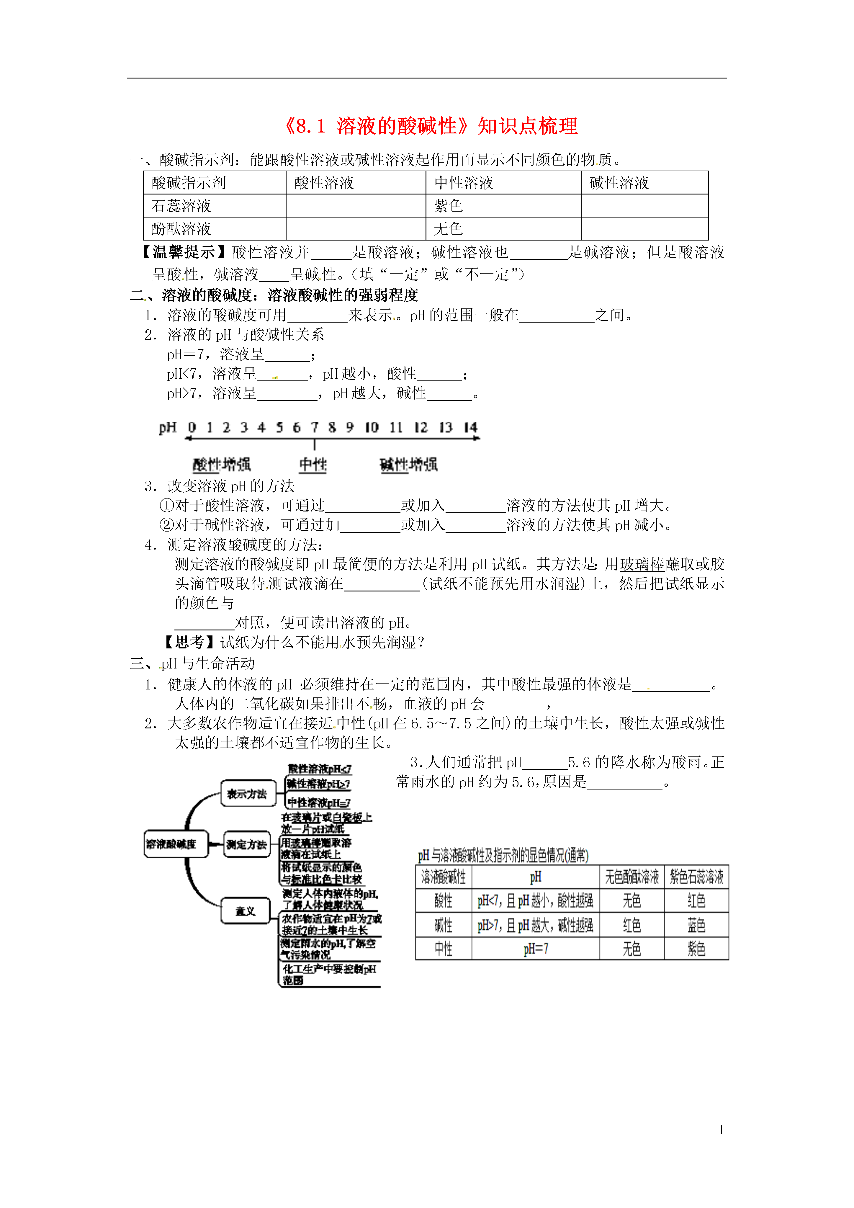 1《8.1溶液的酸碱性》知识点梳理一、酸碱指示剂:能跟酸性溶液或碱性溶液起作用而显示不同颜色的物质。酸碱指示剂酸性溶液中性溶液碱性溶液石蕊溶液紫色酚酞溶液无色【温馨提示】酸性溶液并是酸溶液;碱性溶液也是碱溶液;但是酸溶液呈酸性,碱溶液呈碱性。(填“一定”或“不一定”)二、溶液的酸碱度:溶液酸碱性的强弱程度1.溶液的酸碱度可用来表示。pH的范围一般在之间。2.溶液的pH与酸碱性关系pH=7,溶液呈;pH<7,溶液呈,pH越小,酸性;pH>7,溶液呈,pH越大,碱性。3.改变溶液pH的方法①对于酸性溶液,可通过或加入溶液的方法使其pH增大。②对于碱性溶液,可通过加或加入溶液的方法使其pH减小。4.测定溶液酸碱度的方法:测定溶液的酸碱度即pH最简便的方法是利用pH试纸。其方法是:用玻璃棒蘸取或胶头滴管吸取待测试液滴在(试纸不能预先用水润湿)上,然后把试纸显示的颜色与对照,便可读出溶液的pH。【思考】试纸为什么不能用水预先润湿?三、pH与生命活动1.健康人的体液的pH必须维持在一定的范围内,其中酸性最强的体液是。人体内的二氧化碳如果排出不畅,血液的pH会,2.大多数农作物适宜在接近中性(pH在6.5~7.5之间)的土壤中生长,酸性太强或碱性太强的土壤都不适宜作物的生长。3.人们通常把pH5.6的降水称为酸雨。正常雨水的pH约为5.6,原因是。