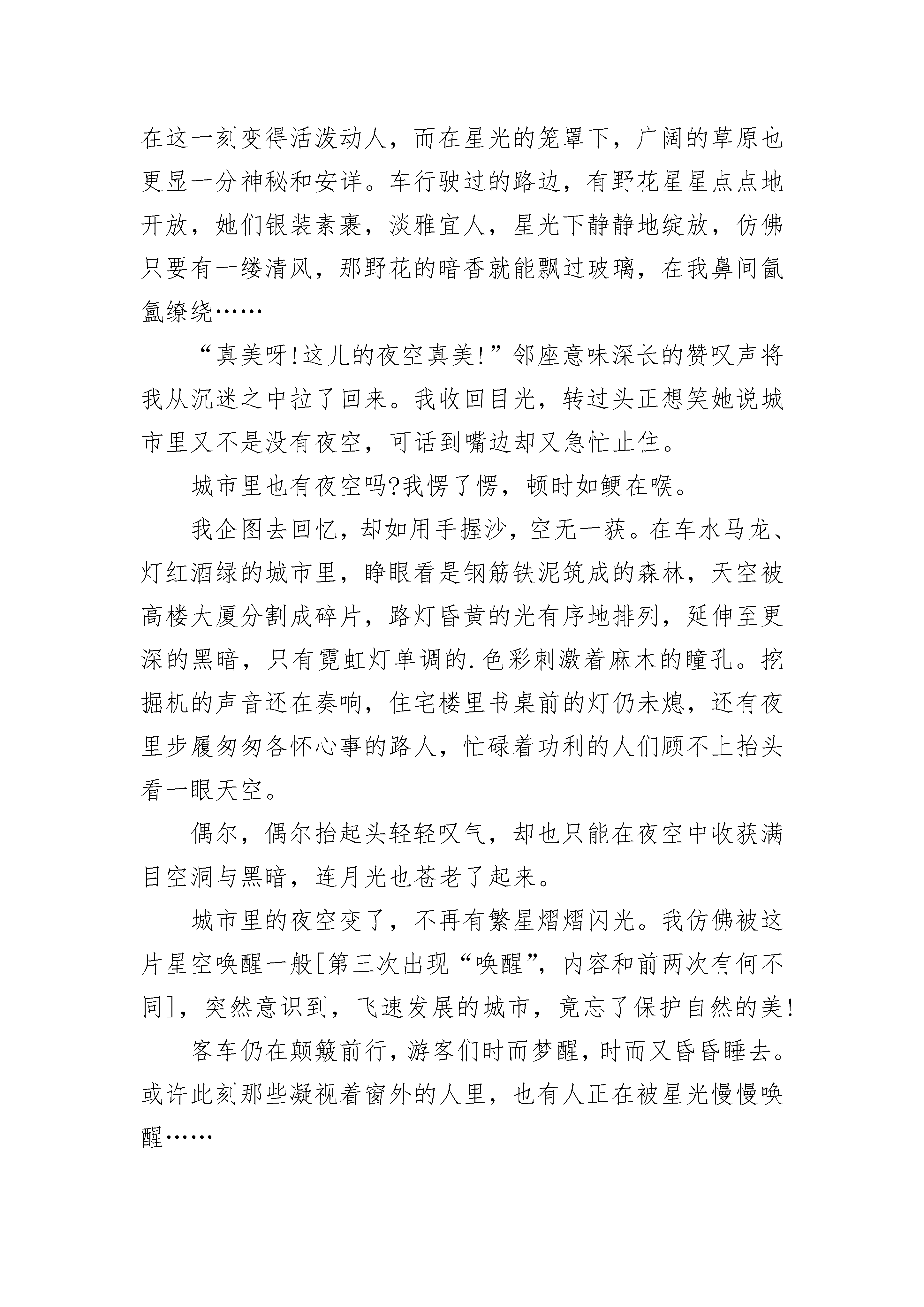 高一作文800字唤醒自己五篇在每年的高考考生中,有一个特殊群体——美术高考生。在非艺术生的眼里,大多数人认为考美术很容易,觉得我们只需动动手就可轻轻松松上大学。那是因为他们不知道那每一幅画背后的艰辛。如果只是追求表面的好看,那并不困难,但如果要进一个层次,把自己对物体的正确认识和自己的思想在画中表现出来,那将是一个非常痛苦的过程。承受着痛苦的时候,我们是要放弃,还是要坚持?这是,我们需要唤醒自己,给我们坚持走下去的力量。虽然我接受专业美术的教育只是零散的用了两年的时间,但是我却有将近13年的画龄,可以说从小就打算一直朝着这条路走下去,但遇到挫折时,我总有要放弃的念头。小学毕业时美术没有考出理想的成绩,我第一次有了放弃的念头。因为我没有及时唤醒自己,初一初二两年我没有继续美术的学习。初三时因为朋友的劝说,我再一次进入画室学习,因为当时文化成绩比美术的要好,在中考之前,我已不止一次想半途而废。但这时的我已经学会唤醒自己,每一次当我想要放弃时,我会告诉自己,唤醒自己我的理想是什么。就这样,一次次的唤醒,最终我以美术考生的身份参加中考。但是中考的失败,让我看不清前面的路。高一的时候,我很坚定地说高考不要考美术了。高二时,我选了历史专业。但是,那却是一个历史生和艺术生混合的班。心底对艺术的那种热情再也无法抑制了。再一次进入画室学习,让我认识到什么才是真正的好作品,理所当然,再有了这一认识后的美术学习让我觉得更加痛苦。为了不让自己放弃,我不时的唤醒自己,不仅用自己的理想,还用那些我喜欢的作品以及一些成功人士的经验。通过学习美术,我学到的不仅是一门技术,还学到了一些人生的智慧。我相信萨拉斯特的那句话“每个人都是自己命运的建筑师。”我们只有不断的唤醒自己,才不会让自己迷失在命运设计的圈套里,迷失在自己设计的圈套里,才能使自己的生命攀上高峰。高一作文800字唤醒自己2客车在盘山公路上颠簸前行。夜深了,游客们在碧水接天、郁郁苍苍的梦里浅浅睡眠,等待着清晨的一缕阳光将自己唤醒……司机突然一个急转弯,把我从睡梦中拉了出来。揉了揉眼睛,脑袋却还是迷迷糊糊的。同样被惊醒的邻座也半梦半醒,无意识地朝窗口望去。突然间,她的眼睛变得雪亮,兴奋地拍着我的肩大声说:“快看天!”我懒懒地扭过头,漫不经心地一瞥——这一瞥,却擦亮了我的眼。漆黑如墨的天空中,遍布了漫天的繁星,仿佛黑鹅绒的巨大幕布上,镶嵌着一颗颗精雕细琢、晶莹剔透的水钻。小小的星散发微弱却璀璨的光,让我不禁联想起童话中睡美人脸上的珍贵泪水和微波荡漾、粼粼闪烁的湖面。肃穆的黑夜在这一刻变得活泼动人,而在星光的笼罩下,广阔的草原也更显一分神秘和安详。车行驶过的路边,有野花星星点点地开放,她们银装素裹,淡雅宜人,星光下静静地绽放,仿佛只要有一缕清风,那野花的暗香就能飘过玻璃,在我鼻间氤氲缭绕……“真美呀!这儿的夜空真美!”邻座意味深长的赞叹声将我从沉迷之中拉了回来。我收回目光,转过头正想笑她说城市里又不是没有夜空,可话到嘴边却又急忙止住。城市里也有夜空吗?我愣了愣,顿时如鲠在喉。我企图去回忆,却如用手握沙,空无一获。在车水马龙、灯红酒绿的城市里,睁眼看是钢筋铁泥筑成的森林,天空被高楼大厦分割成碎片,路灯昏黄的光有序地排列,延伸至更深的黑暗,只有霓虹灯单调的.色彩刺激着麻木的瞳孔。挖掘机的声音还在奏响,住宅楼里书桌前的灯仍未熄,还有夜里步履匆匆各怀心事的路人,忙碌着功利的人们顾不上抬头看一眼天空。偶尔,偶尔抬起头轻轻叹气,却也只能在夜空中收获满目空洞与黑暗,连月光也苍老了起来。城市里的夜空变了,不再有繁星熠熠闪光。我仿佛被这片星空唤醒一般[第三次出现“唤醒”,内容和前两次有何不同],突然意识到,飞速发展的城市,竟忘了保护自然的美!客车仍在颠簸前行,游客们时而梦醒,时而又昏昏睡去。或许此刻那些凝视着窗外的人里,也有人正在被星光慢慢唤醒……高一作文800字唤醒自己3漫漫人生,离离远道。悠悠历史中只有清醒的灵魂才能寻得生命完美的归宿。然而,路边的野花散发着迷人的毒香,生活的诱惑让人们常常迷失了方向。走在人生道上,一个人不得不唤醒自己。唤醒自己,弃利求义。为人者,最重要的是清醒地守护着自己的.信与义。国难当头,有人看不见民族危亡,生灵涂炭,看到的却是有利可图。一代奸臣秦桧,本是大宋朝的状元,不乏才干,却在国家危亡之际利令智昏,党同伐异,策划投降。为了自己的利益,他反对抗敌,害死了精忠报国的将领岳飞。终于,待到东窗事发,落得个身首两异的下场。“青山有幸埋忠骨,白铁无辜铸佞臣”。感怀历史,人们在咒骂秦桧的同时,应时刻牢记,一个人,不能被利益蒙蔽了双眼,弃信背义,追名逐利。面对利益的诱惑,为人者要及时唤醒自己。唤醒自己,舍暴取仁。为君者,最重要的是清醒地贯彻“仁义”和“王道”。昔时秦王穷兵黩武,威慑天下,收天下之兵,愚天下