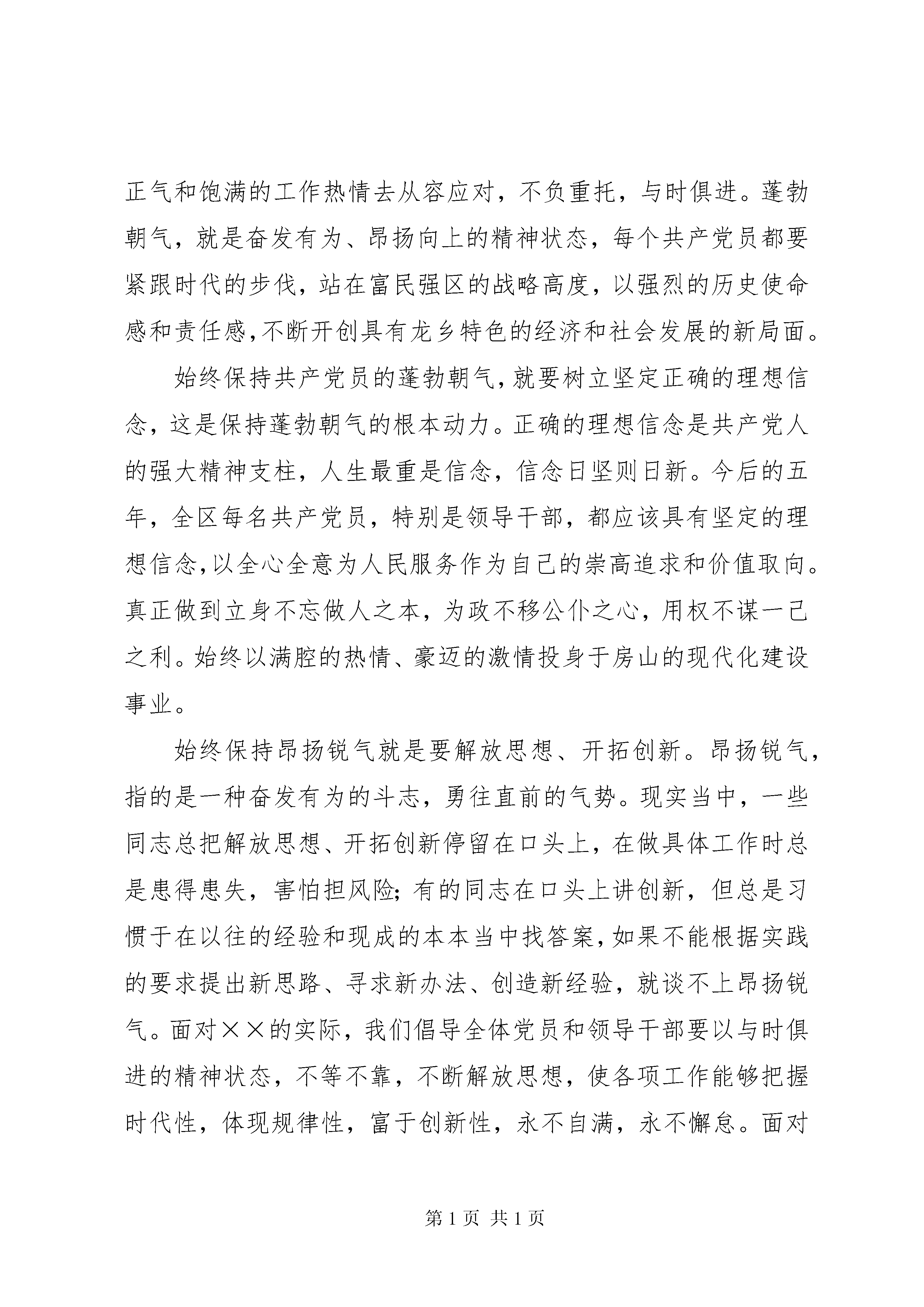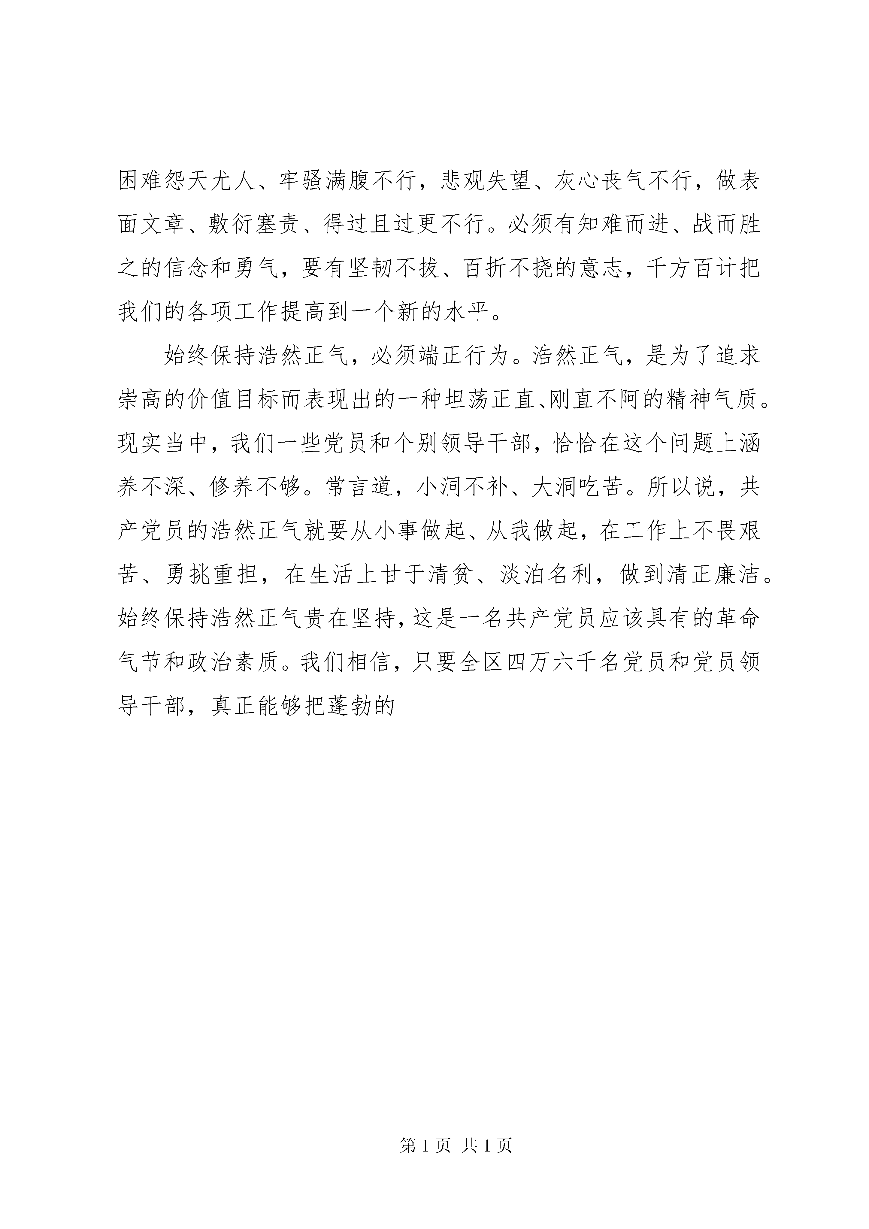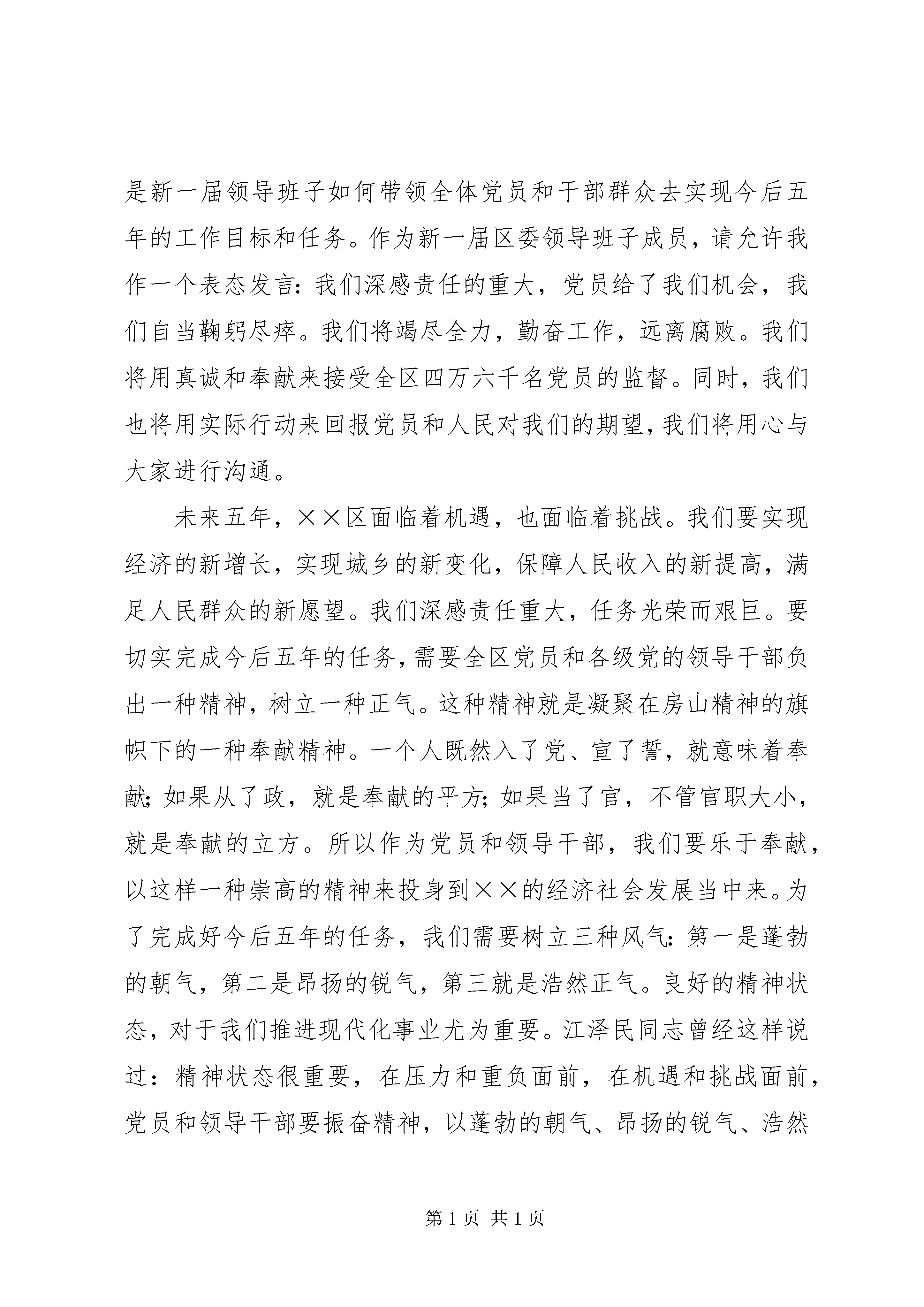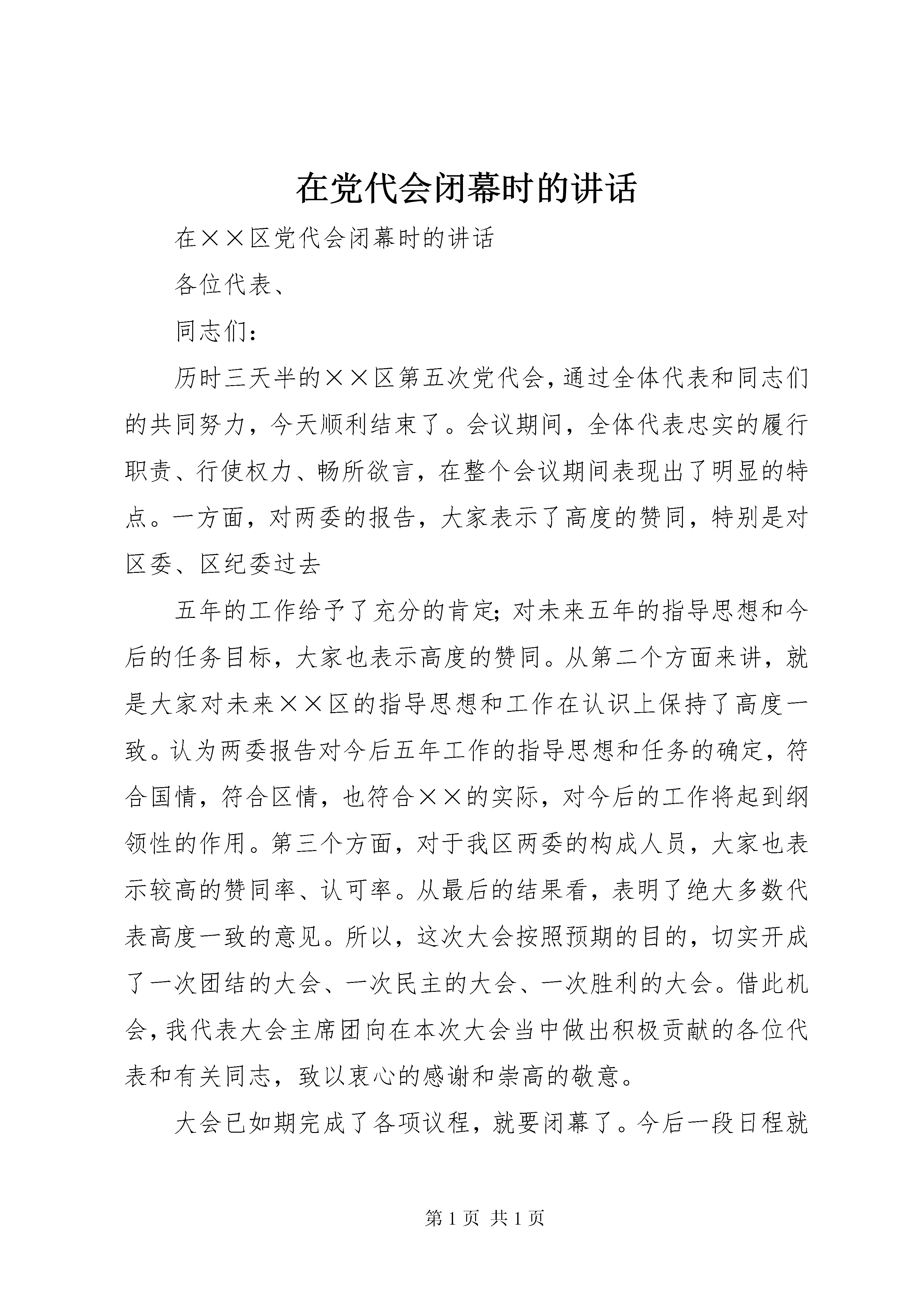 在党代会闭幕时的讲话在××区党代会闭幕时的讲话各位代表、同志们:历时三天半的××区第五次党代会,通过全体代表和同志们的共同努力,今天顺利结束了。会议期间,全体代表忠实的履行职责、行使权力、畅所欲言,在整个会议期间表现出了明显的特点。一方面,对两委的报告,大家表示了高度的赞同,特别是对区委、区纪委过去五年的工作给予了充分的肯定;对未来五年的指导思想和今后的任务目标,大家也表示高度的赞同。从第二个方面来讲,就是大家对未来××区的指导思想和工作在认识上保持了高度一致。认为两委报告对今后五年工作的指导思想和任务的确定,符合国情,符合区情,也符合××的实际,对今后的工作将起到纲领性的作用。第三个方面,对于我区两委的构成人员,大家也表示较高的赞同率、认可率。从最后的结果看,表明了绝大多数代表高度一致的意见。所以,这次大会按照预期的目的,切实开成了一次团结的大会、一次民主的大会、一次胜利的大会。借此机会,我代表大会主席团向在本次大会当中做出积极贡献的各位代表和有关同志,致以衷心的感谢和崇高的敬意。大会已如期完成了各项议程,就要闭幕了。今后一段日程就是新一届领导班子如何带领全体党员和干部群众去实现今后五年的工作目标和任务。作为新一届区委领导班子成员,请允许我作一个表态发言:我们深感责任的重大,党员给了我们机会,我们自当鞠躬尽瘁。我们将竭尽全力,勤奋工作,远离腐败。我们将用真诚和奉献来接受全区四万六千名党员的监督。同时,我们也将用实际行动来回报党员和人民对我们的期望,我们将用心与大家进行沟通。未来五年,××区面临着机遇,也面临着挑战。我们要实现经济的新增长,实现城乡的新变化,保障人民收入的新提高,满足人民群众的新愿望。我们深感责任重大,任务光荣而艰巨。要切实完成今后五年的任务,需要全区党员和各级党的领导干部负出一种精神,树立一种正气。这种精神就是凝聚在房山精神的旗帜下的一种奉献精神。一个人既然入了党、宣了誓,就意味着奉献;如果从了政,就是奉献的平方;如果当了官,不管官职大小,就是奉献的立方。所以作为党员和领导干部,我们要乐于奉献,以这样一种崇高的精神来投身到××的经济社会发展当中来。为了完成好今后五年的任务,我们需要树立三种风气:第一是蓬勃的朝气,第二是昂扬的锐气,第三就是浩然正气。良好的精神状态,对于我们推进现代化事业尤为重要。江泽民同志曾经这样说过:精神状态很重要,在压力和重负面前,在机遇和挑战面前,党员和领导干部要振奋精神,以蓬勃的朝气、昂扬的锐气、浩然正气和饱满的工作热情去从容应对,不负重托,与时俱进。蓬勃朝气,就是奋发有为、昂扬向上的精神状态,每个共产党员都要紧跟时代的步伐,站在富民强区的战略高度,以强烈的历史使命感和责任感,不断开创具有龙乡特色的经济和社会发展的新局面。始终保持共产党员的蓬勃朝气,就要树立坚定正确的理想信念,这是保持蓬勃朝气的根本动力。正确的理想信念是共产党人的强大精神支柱,人生最重是信念,信念日坚则日新。今后的五年,全区每名共产党员,特别是领导干部,都应该具有坚定的理想信念,以全心全意为人民服务作为自己的崇高追求和价值取向。真正做到立身不忘做人之本,为政不移公仆之心,用权不谋一己之利。始终以满腔的热情、豪迈的激情投身于房山的现代化建设事业。始终保持昂扬锐气就是要解放思想、开拓创新。昂扬锐气,指的是一种奋发有为的斗志,勇往直前的气势。现实当中,一些同志总把解放思想、开拓创新停留在口头上,在做具体工作时总是患得患失,害怕担风险;有的同志在口头上讲创新,但总是习惯于在以往的经验和现成的本本当中找答案,如果不能根据实践的要求提出新思路、寻求新办法、创造新经验,就谈不上昂扬锐气。面对××的实际,我们倡导全体党员和领导干部要以与时俱进的精神状态,不等不靠,不断解放思想,使各项工作能够把握时代性,体现规律性,富于创新性,永不自满,永不懈怠。面对困难怨天尤人、牢骚满腹不行,悲观失望、灰心丧气不行,做表面文章、敷衍塞责、得过且过更不行。必须有知难而进、战而胜之的信念和勇气,要有坚韧不拔、百折不挠的意志,千方百计把我们的各项工作提高到一个新的水平。始终保持浩然正气,必须端正行为。浩然正气,是为了追求崇高的价值目标而表现出的一种坦荡正直、刚直不阿的精神气质。现实当中,我们一些党员和个别领导干部,恰恰在这个问题上涵养不深、修养不够。常言道,小洞不补、大洞吃苦。所以说,共产党员的浩然正气就要从小事做起、从我做起,在工作上不畏艰苦、勇挑重担,在生活上甘于清贫、淡泊名利,做到清正廉洁。始终保持浩然正气贵在坚持,这是一名共产党员应该具有的革命气节和政治素质。我们相信,只要全区四万六千名党员和党员领导干部,真正能够把蓬勃的