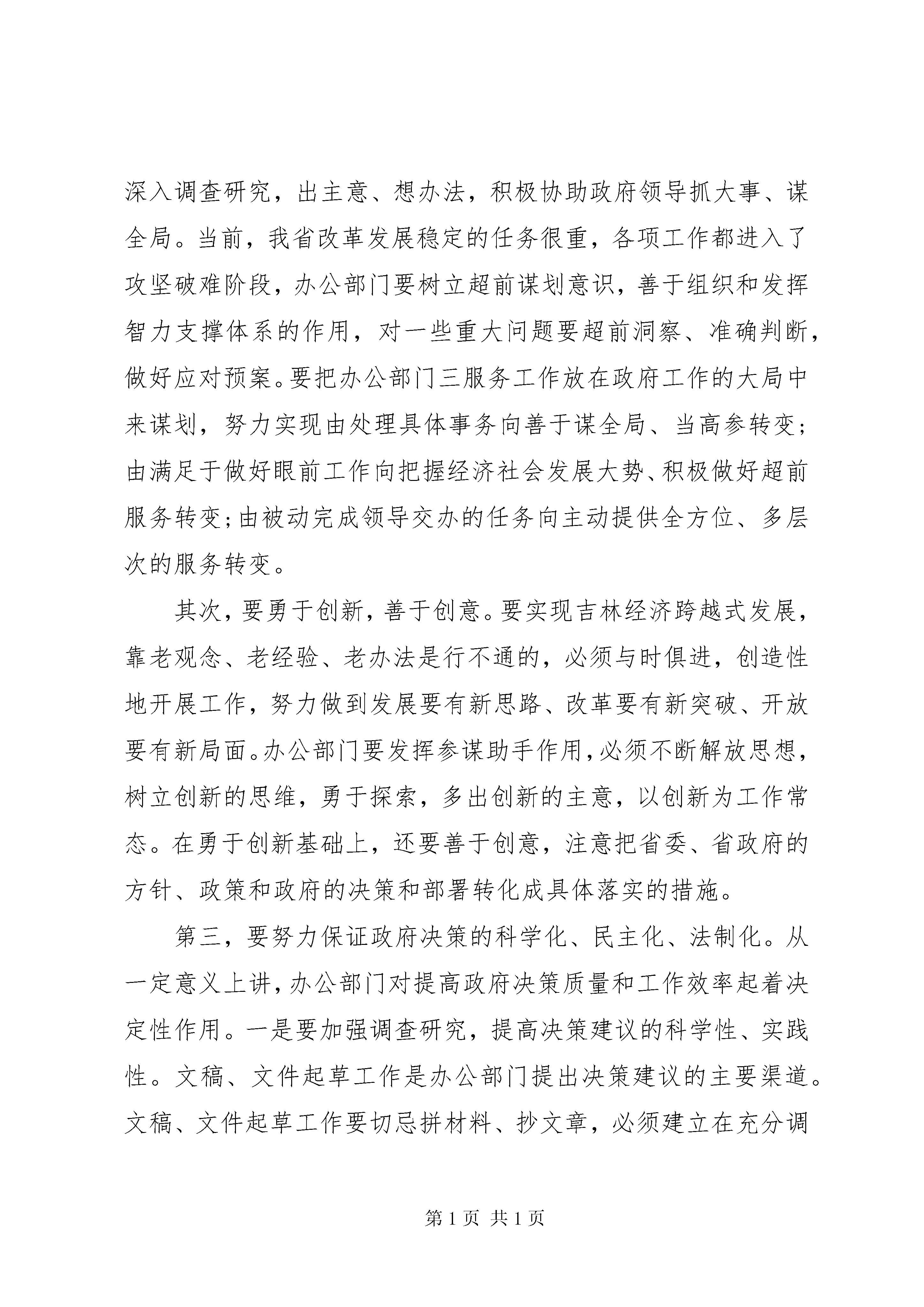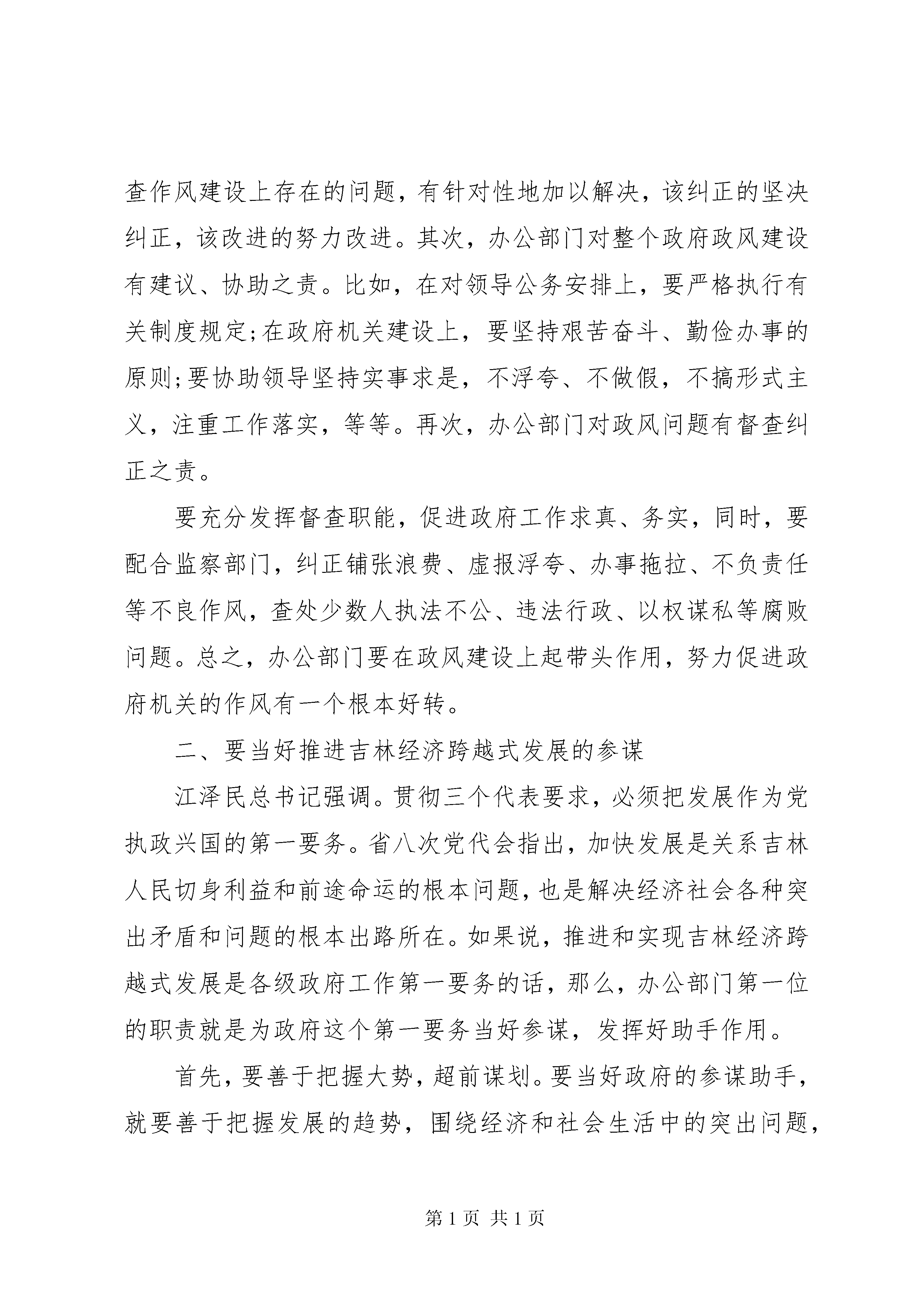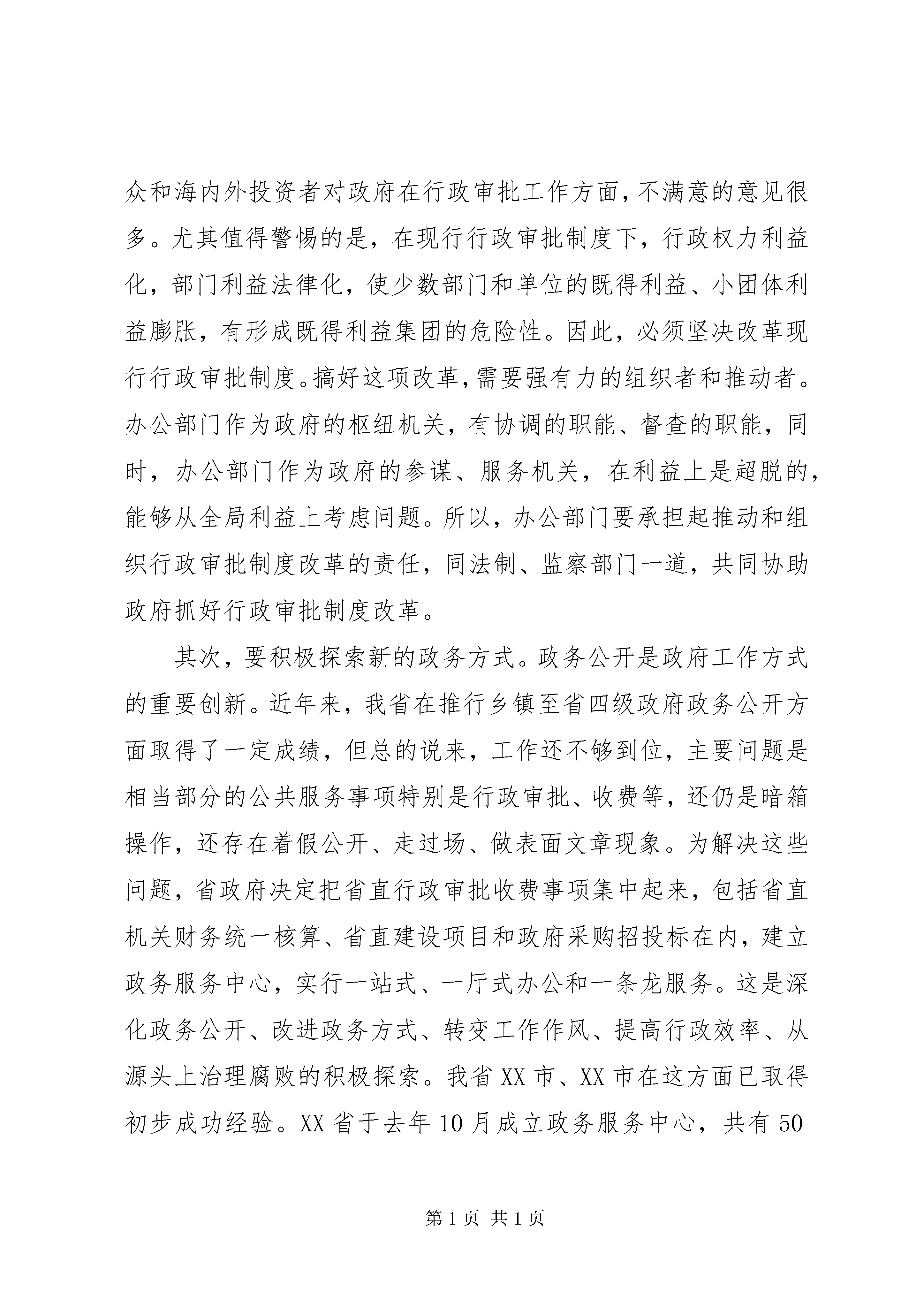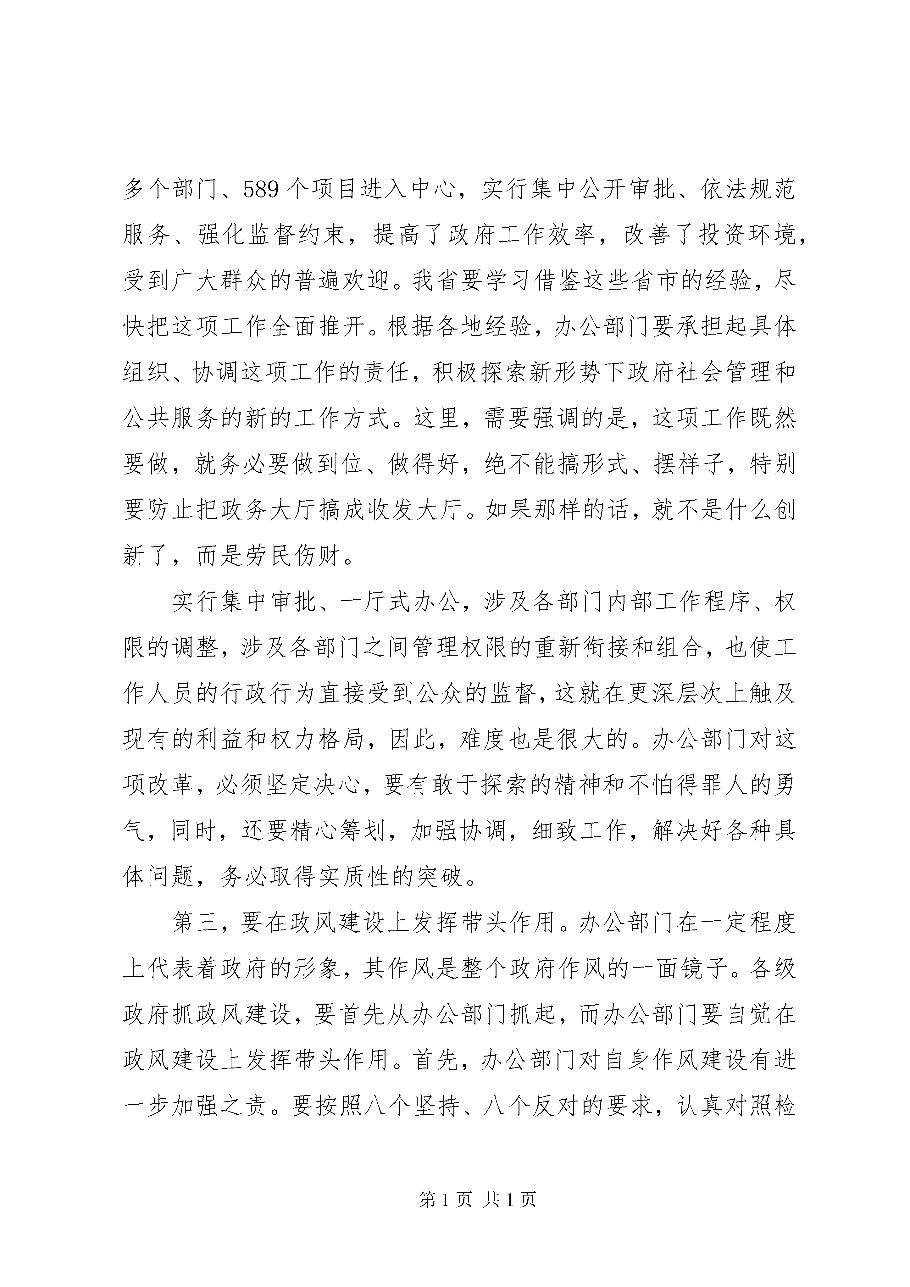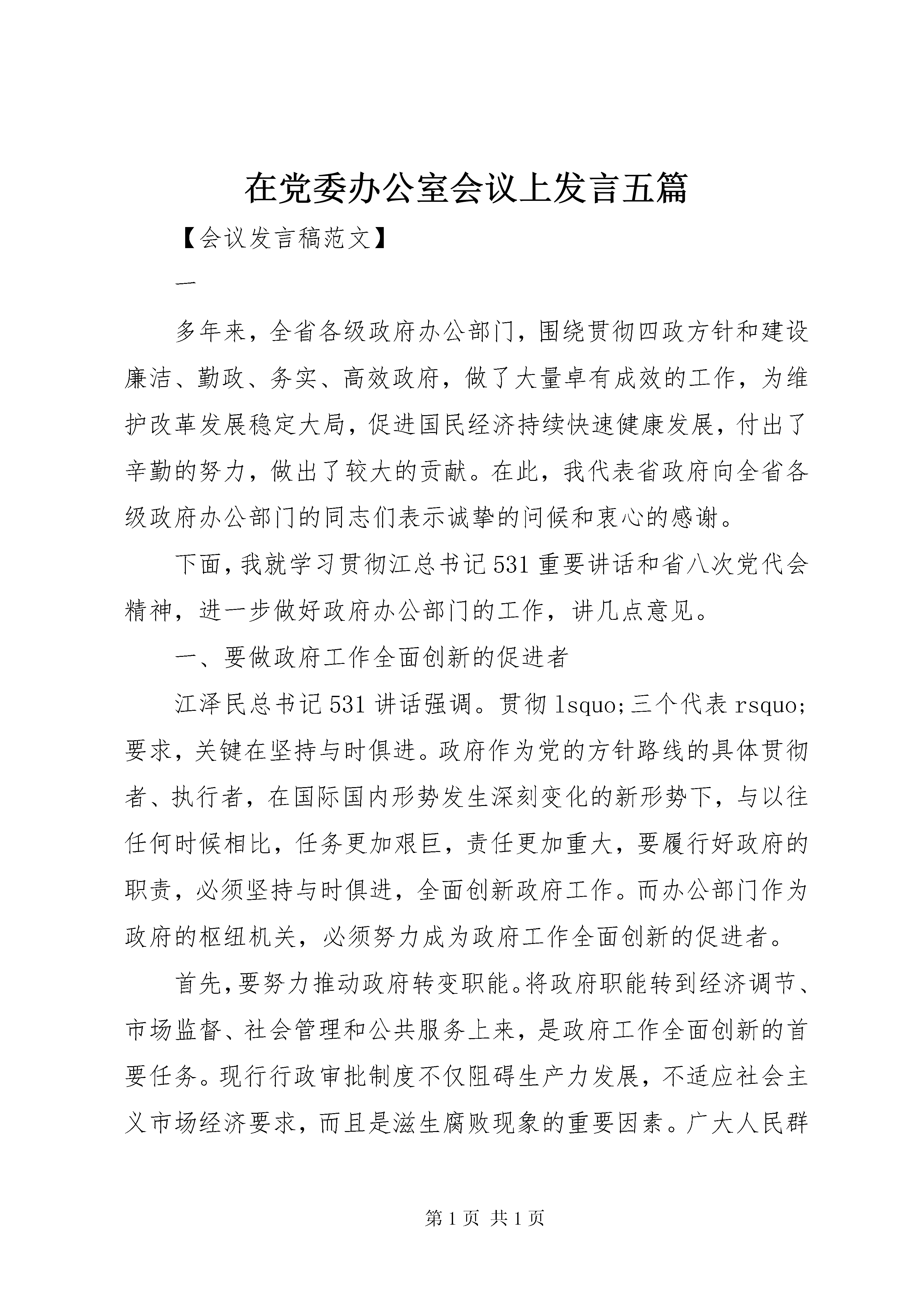 在党委办公室会议上发言五篇【会议发言稿范文】一多年来,全省各级政府办公部门,围绕贯彻四政方针和建设廉洁、勤政、务实、高效政府,做了大量卓有成效的工作,为维护改革发展稳定大局,促进国民经济持续快速健康发展,付出了辛勤的努力,做出了较大的贡献。在此,我代表省政府向全省各级政府办公部门的同志们表示诚挚的问候和衷心的感谢。下面,我就学习贯彻江总书记531重要讲话和省八次党代会精神,进一步做好政府办公部门的工作,讲几点意见。一、要做政府工作全面创新的促进者江泽民总书记531讲话强调。贯彻lsquo;三个代表rsquo;要求,关键在坚持与时俱进。政府作为党的方针路线的具体贯彻者、执行者,在国际国内形势发生深刻变化的新形势下,与以往任何时候相比,任务更加艰巨,责任更加重大,要履行好政府的职责,必须坚持与时俱进,全面创新政府工作。而办公部门作为政府的枢纽机关,必须努力成为政府工作全面创新的促进者。首先,要努力推动政府转变职能。将政府职能转到经济调节、市场监督、社会管理和公共服务上来,是政府工作全面创新的首要任务。现行行政审批制度不仅阻碍生产力发展,不适应社会主义市场经济要求,而且是滋生腐败现象的重要因素。广大人民群众和海内外投资者对政府在行政审批工作方面,不满意的意见很多。尤其值得警惕的是,在现行行政审批制度下,行政权力利益化,部门利益法律化,使少数部门和单位的既得利益、小团体利益膨胀,有形成既得利益集团的危险性。因此,必须坚决改革现行行政审批制度。搞好这项改革,需要强有力的组织者和推动者。办公部门作为政府的枢纽机关,有协调的职能、督查的职能,同时,办公部门作为政府的参谋、服务机关,在利益上是超脱的,能够从全局利益上考虑问题。所以,办公部门要承担起推动和组织行政审批制度改革的责任,同法制、监察部门一道,共同协助政府抓好行政审批制度改革。其次,要积极探索新的政务方式。政务公开是政府工作方式的重要创新。近年来,我省在推行乡镇至省四级政府政务公开方面取得了一定成绩,但总的说来,工作还不够到位,主要问题是相当部分的公共服务事项特别是行政审批、收费等,还仍是暗箱操作,还存在着假公开、走过场、做表面文章现象。为解决这些问题,省政府决定把省直行政审批收费事项集中起来,包括省直机关财务统一核算、省直建设项目和政府采购招投标在内,建立政务服务中心,实行一站式、一厅式办公和一条龙服务。这是深化政务公开、改进政务方式、转变工作作风、提高行政效率、从源头上治理腐败的积极探索。我省XX市、XX市在这方面已取得初步成功经验。XX省于去年10月成立政务服务中心,共有50多个部门、589个项目进入中心,实行集中公开审批、依法规范服务、强化监督约束,提高了政府工作效率,改善了投资环境,受到广大群众的普遍欢迎。我省要学习借鉴这些省市的经验,尽快把这项工作全面推开。根据各地经验,办公部门要承担起具体组织、协调这项工作的责任,积极探索新形势下政府社会管理和公共服务的新的工作方式。这里,需要强调的是,这项工作既然要做,就务必要做到位、做得好,绝不能搞形式、摆样子,特别要防止把政务大厅搞成收发大厅。如果那样的话,就不是什么创新了,而是劳民伤财。实行集中审批、一厅式办公,涉及各部门内部工作程序、权限的调整,涉及各部门之间管理权限的重新衔接和组合,也使工作人员的行政行为直接受到公众的监督,这就在更深层次上触及现有的利益和权力格局,因此,难度也是很大的。办公部门对这项改革,必须坚定决心,要有敢于探索的精神和不怕得罪人的勇气,同时,还要精心筹划,加强协调,细致工作,解决好各种具体问题,务必取得实质性的突破。第三,要在政风建设上发挥带头作用。办公部门在一定程度上代表着政府的形象,其作风是整个政府作风的一面镜子。各级政府抓政风建设,要首先从办公部门抓起,而办公部门要自觉在政风建设上发挥带头作用。首先,办公部门对自身作风建设有进一步加强之责。要按照八个坚持、八个反对的要求,认真对照检查作风建设上存在的问题,有针对性地加以解决,该纠正的坚决纠正,该改进的努力改进。其次,办公部门对整个政府政风建设有建议、协助之责。比如,在对领导公务安排上,要严格执行有关制度规定;在政府机关建设上,要坚持艰苦奋斗、勤俭办事的原则;要协助领导坚持实事求是,不浮夸、不做假,不搞形式主义,注重工作落实,等等。再次,办公部门对政风问题有督查纠正之责。要充分发挥督查职能,促进政府工作求真、务实,同时,要配合监察部门,纠正铺张浪费、虚报浮夸、办事拖拉、不负责任等不良作风,查处少数人执法不公、违法行政、以权谋私等腐败问题。总之,办公部门要在政风建设上起带头作用,努力促进政府机关的作风有一个根本好转。二、要当好推进吉林经济跨越式发展的参谋江泽民总书记强调。贯彻三个代表要求,必须把发展作为党执政兴国的第一要务。省