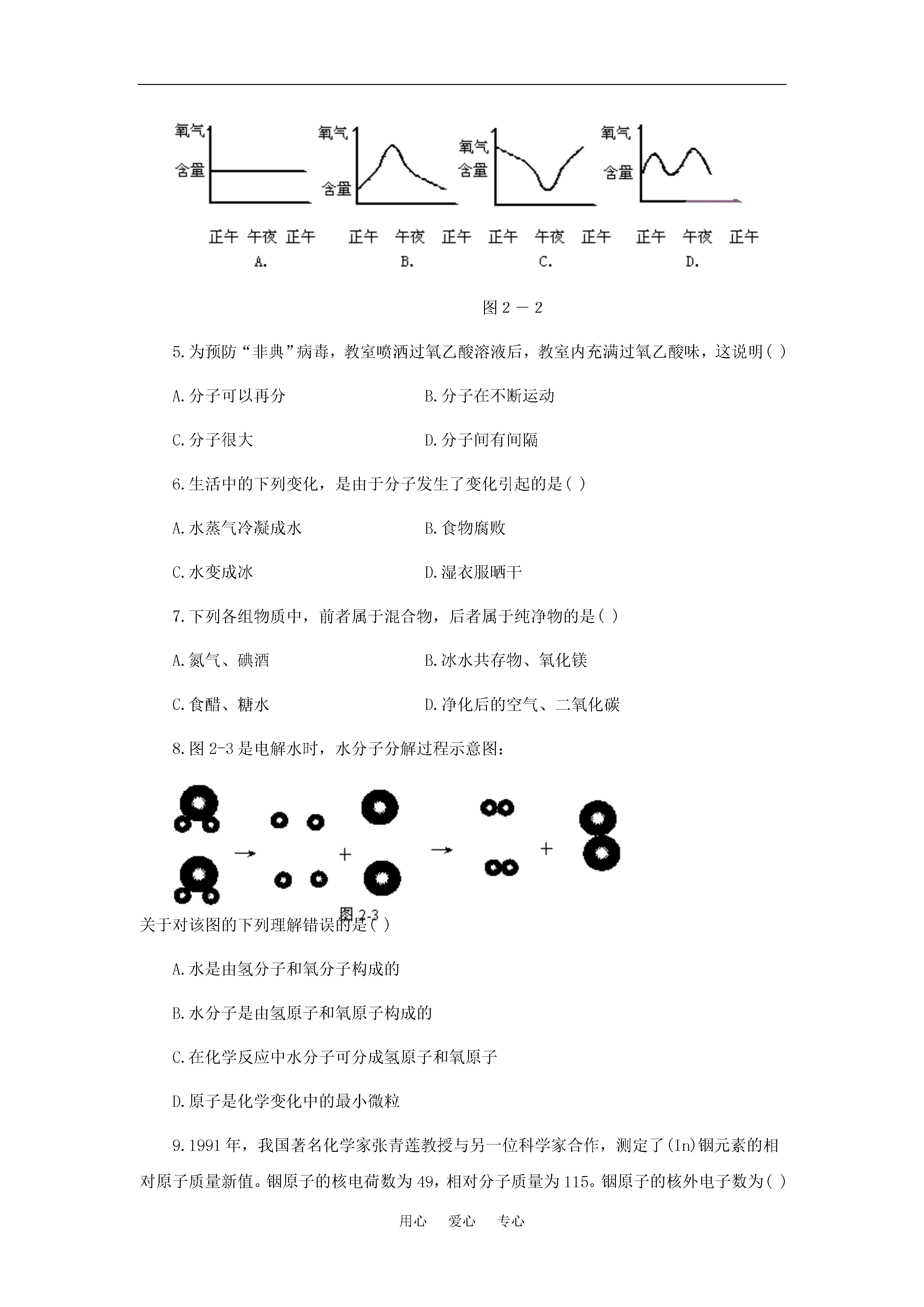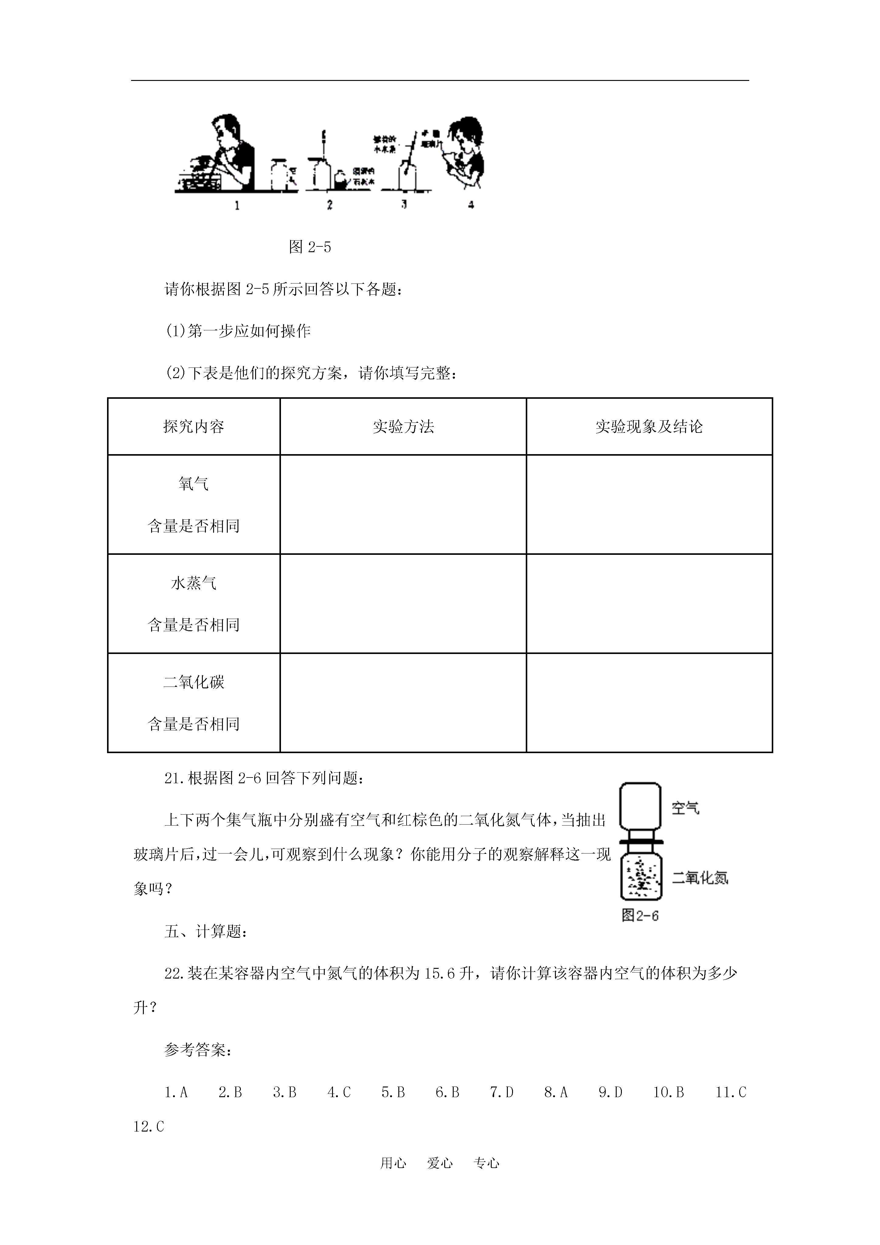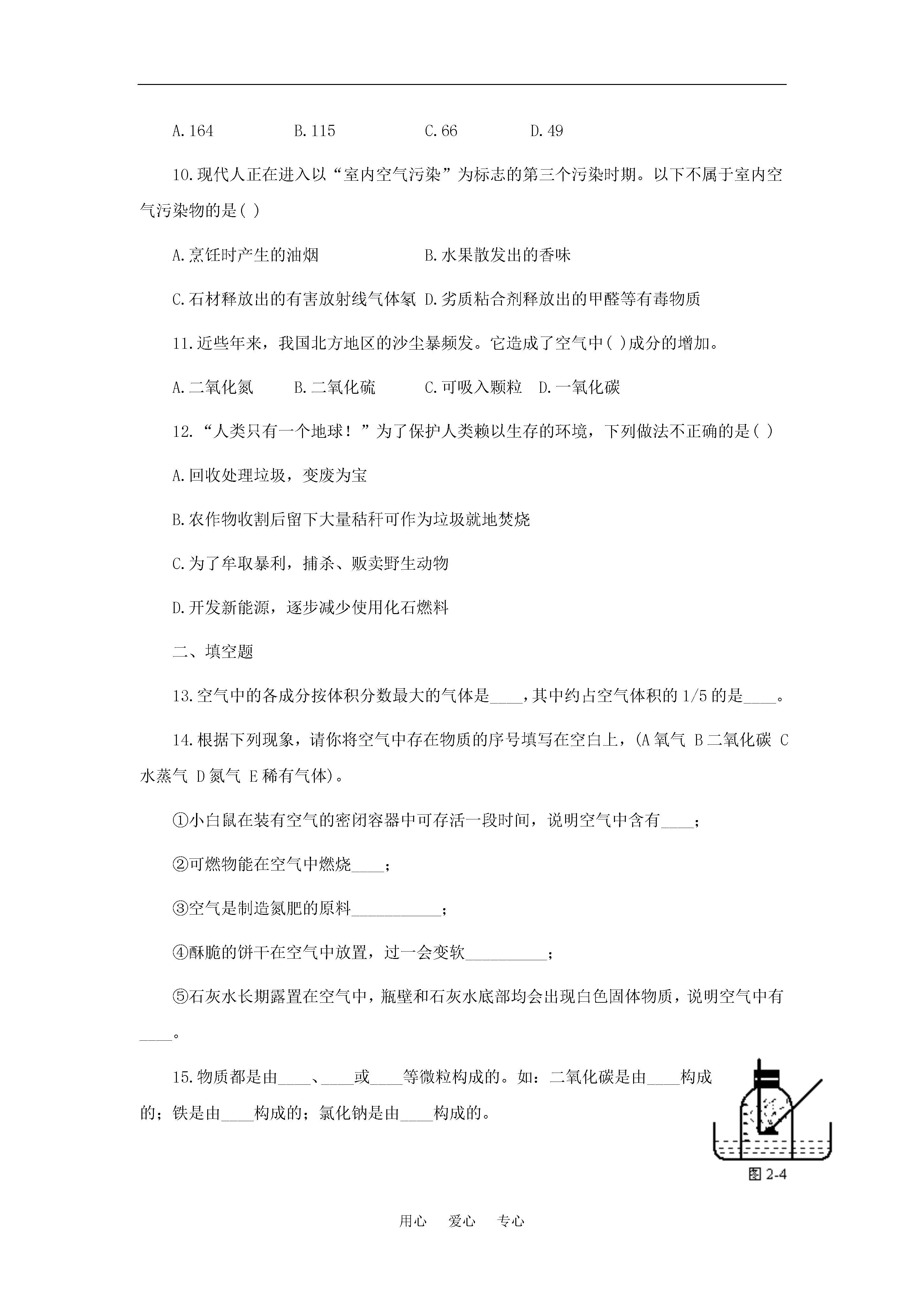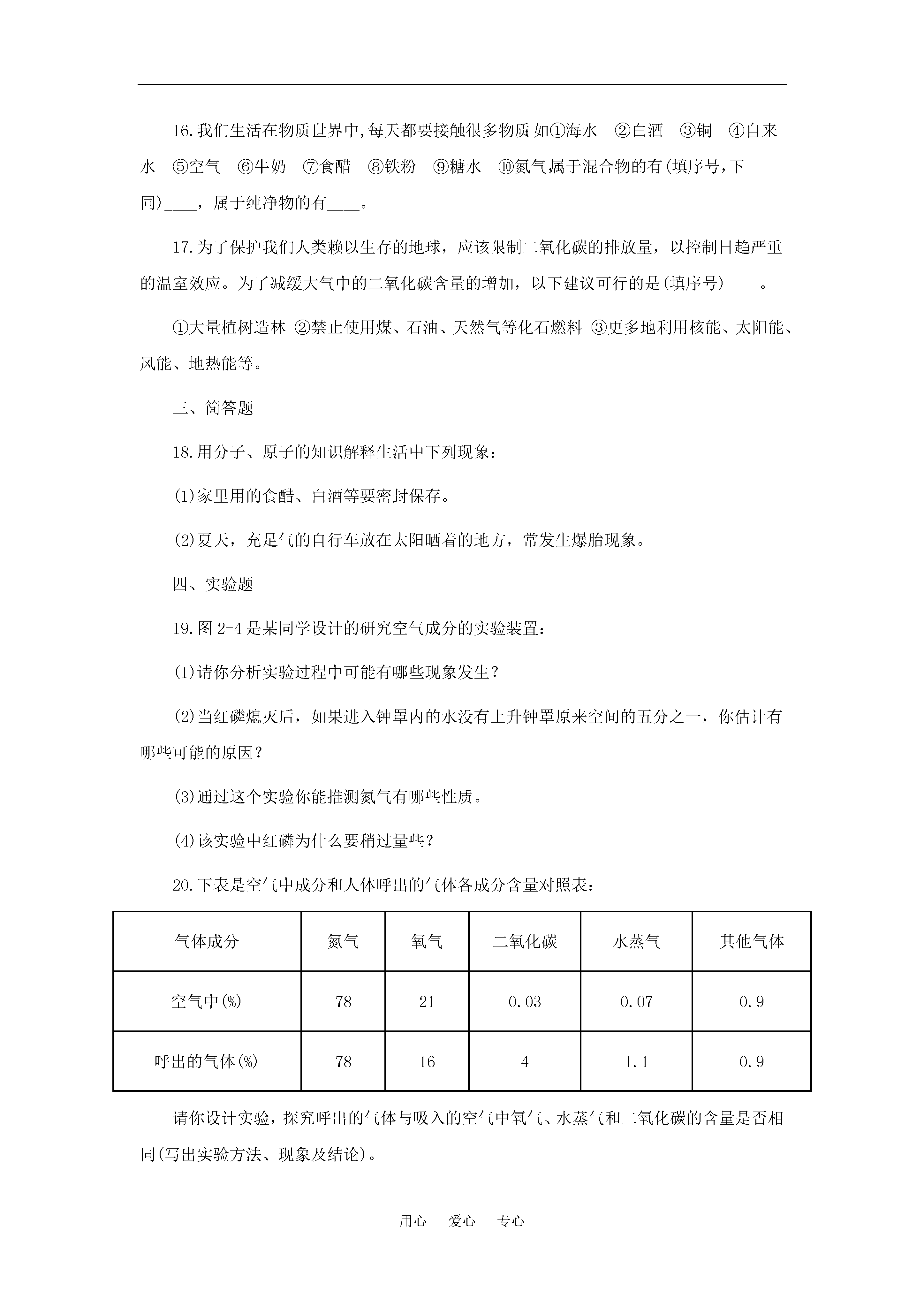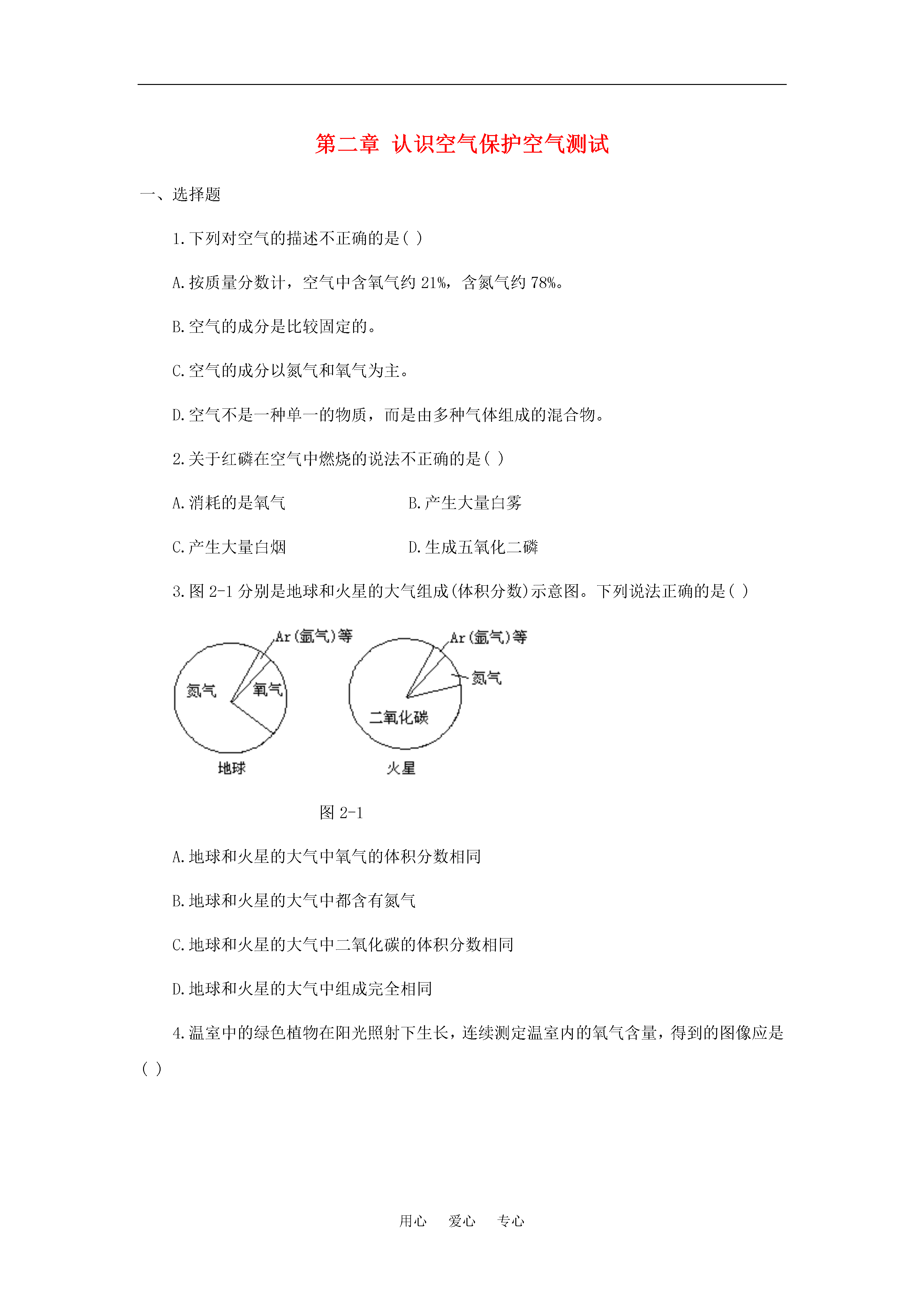 用心爱心专心第二章认识空气保护空气测试一、选择题1.下列对空气的描述不正确的是()A.按质量分数计,空气中含氧气约21%,含氮气约78%。B.空气的成分是比较固定的。C.空气的成分以氮气和氧气为主。D.空气不是一种单一的物质,而是由多种气体组成的混合物。2.关于红磷在空气中燃烧的说法不正确的是()A.消耗的是氧气B.产生大量白雾C.产生大量白烟D.生成五氧化二磷3.图2-1分别是地球和火星的大气组成(体积分数)示意图。下列说法正确的是()图2-1A.地球和火星的大气中氧气的体积分数相同B.地球和火星的大气中都含有氮气C.地球和火星的大气中二氧化碳的体积分数相同D.地球和火星的大气中组成完全相同4.温室中的绿色植物在阳光照射下生长,连续测定温室内的氧气含量,得到的图像应是()图2-25.为预防“非典”病毒,教室喷洒过氧乙酸溶液后,教室内充满过氧乙酸味,这说明()A.分子可以再分B.分子在不断运动C.分子很大D.分子间有间隔6.生活中的下列变化,是由于分子发生了变化引起的是()A.水蒸气冷凝成水B.食物腐败C.水变成冰D.湿衣服晒干7.下列各组物质中,前者属于混合物,后者属于纯净物的是()A.氮气、碘酒B.冰水共存物、氧化镁C.食醋、糖水D.净化后的空气、二氧化碳8.图2-3是电解水时,水分子分解过程示意图:关于对该图的下列理解错误的是()A.水是由氢分子和氧分子构成的B.水分子是由氢原子和氧原子构成的C.在化学反应中水分子可分成氢原子和氧原子D.原子是化学变化中的最小微粒9.1991年,我国著名化学家张青莲教授与另一位科学家合作,测定了(In)铟元素的相对原子质量新值。铟原子的核电荷数为49,相对分子质量为115。铟原子的核外电子数为()A.164B.115C.66D.4910.现代人正在进入以“室内空气污染”为标志的第三个污染时期。以下不属于室内空气污染物的是()A.烹饪时产生的油烟B.水果散发出的香味C.石材释放出的有害放射线气体氡D.劣质粘合剂释放出的甲醛等有毒物质11.近些年来,我国北方地区的沙尘暴频发。它造成了空气中()成分的增加。A.二氧化氮B.二氧化硫C.可吸入颗粒D.一氧化碳12.“人类只有一个地球!”为了保护人类赖以生存的环境,下列做法不正确的是()A.回收处理垃圾,变废为宝B.农作物收割后留下大量秸秆可作为垃圾就地焚烧C.为了牟取暴利,捕杀、贩卖野生动物D.开发新能源,逐步减少使用化石燃料二、填空题13.空气中的各成分按体积分数最大的气体是____,其中约占空气体积的1/5的是____。14.根据下列现象,请你将空气中存在物质的序号填写在空白上,(A氧气B二氧化碳C水蒸气D氮气E稀有气体)。①小白鼠在装有空气的密闭容器中可存活一段时间,说明空气中含有____;②可燃物能在空气中燃烧____;③空气是制造氮肥的原料___________;④酥脆的饼干在空气中放置,过一会变软__________;⑤石灰水长期露置在空气中,瓶壁和石灰水底部均会出现白色固体物质,说明空气中有____。15.物质都是由____、____或____等微粒构成的。如:二氧化碳是由____构成的;铁是由____构成的;氯化钠是由____构成的。16.我们生活在物质世界中,每天都要接触很多物质:如①海水②白酒③铜④自来水⑤空气⑥牛奶⑦食醋⑧铁粉⑨糖水⑩氮气,属于混合物的有(填序号,下同)____,属于纯净物的有____。17.为了保护我们人类赖以生存的地球,应该限制二氧化碳的排放量,以控制日趋严重的温室效应。为了减缓大气中的二氧化碳含量的增加,以下建议可行的是(填序号)____。①大量植树造林②禁止使用煤、石油、天然气等化石燃料③更多地利用核能、太阳能、风能、地热能等。三、简答题18.用分子、原子的知识解释生活中下列现象:(1)家里用的食醋、白酒等要密封保存。(2)夏天,充足气的自行车放在太阳晒着的地方,常发生爆胎现象。四、实验题19.图2-4是某同学设计的研究空气成分的实验装置:(1)请你分析实验过程中可能有哪些现象发生?(2)当红磷熄灭后,如果进入钟罩内的水没有上升钟罩原来空间的五分之一,你估计有哪些可能的原因?(3)通过这个实验你能推测氮气有哪些性质。(4)该实验中红磷为什么要稍过量些?20.下表是空气中成分和人体呼出的气体各成分含量对照表:气体成分氮气氧气二氧化碳水蒸气其他气体空气中(%)78210.030.070.9呼出的气体(%)781641.10.9请你设计实验,探究呼出的气体与吸入的空气中氧气、水蒸气和二氧化碳的含量是否相同(写出实验方法、现象及结论)。图2-5请
